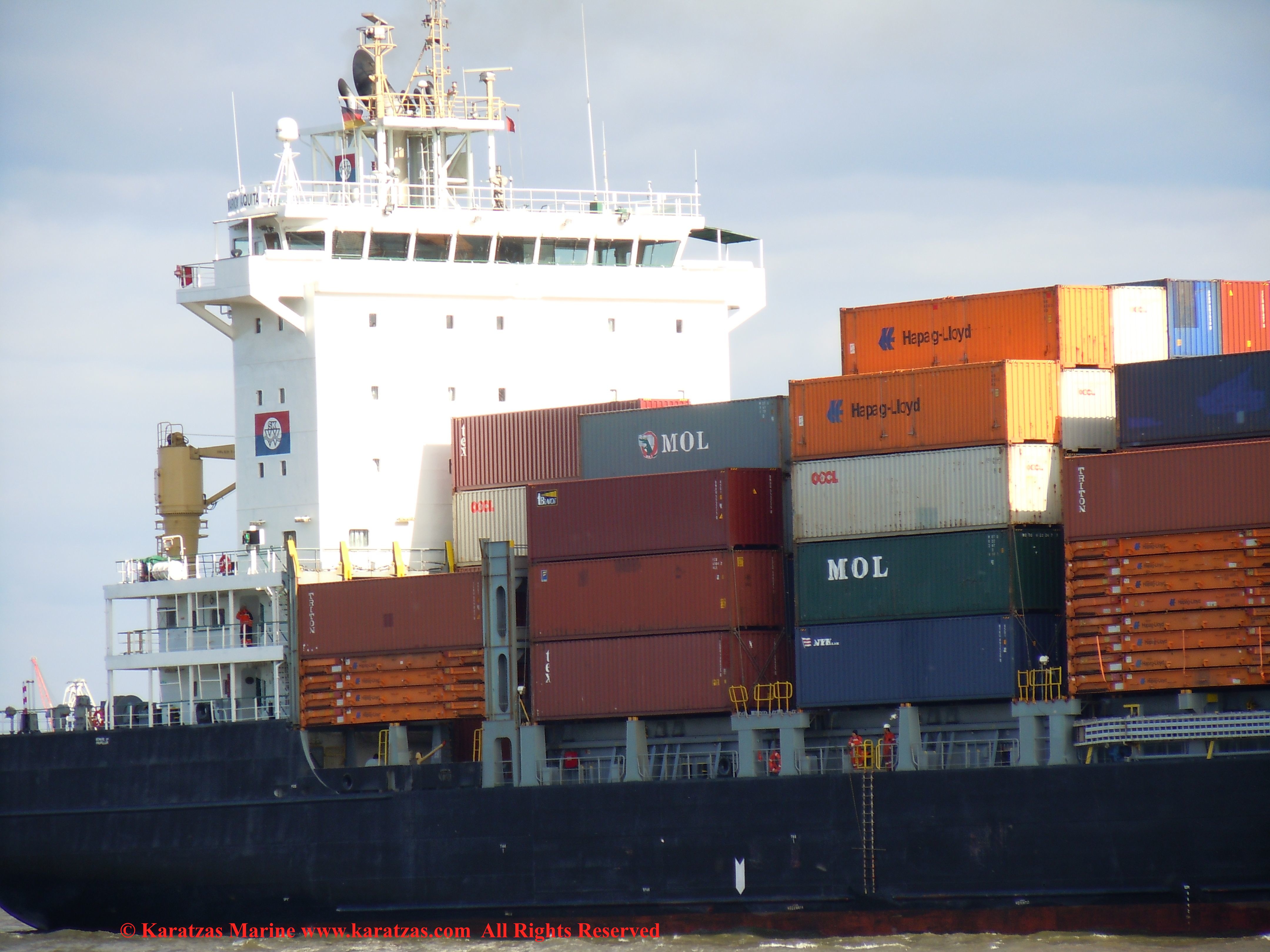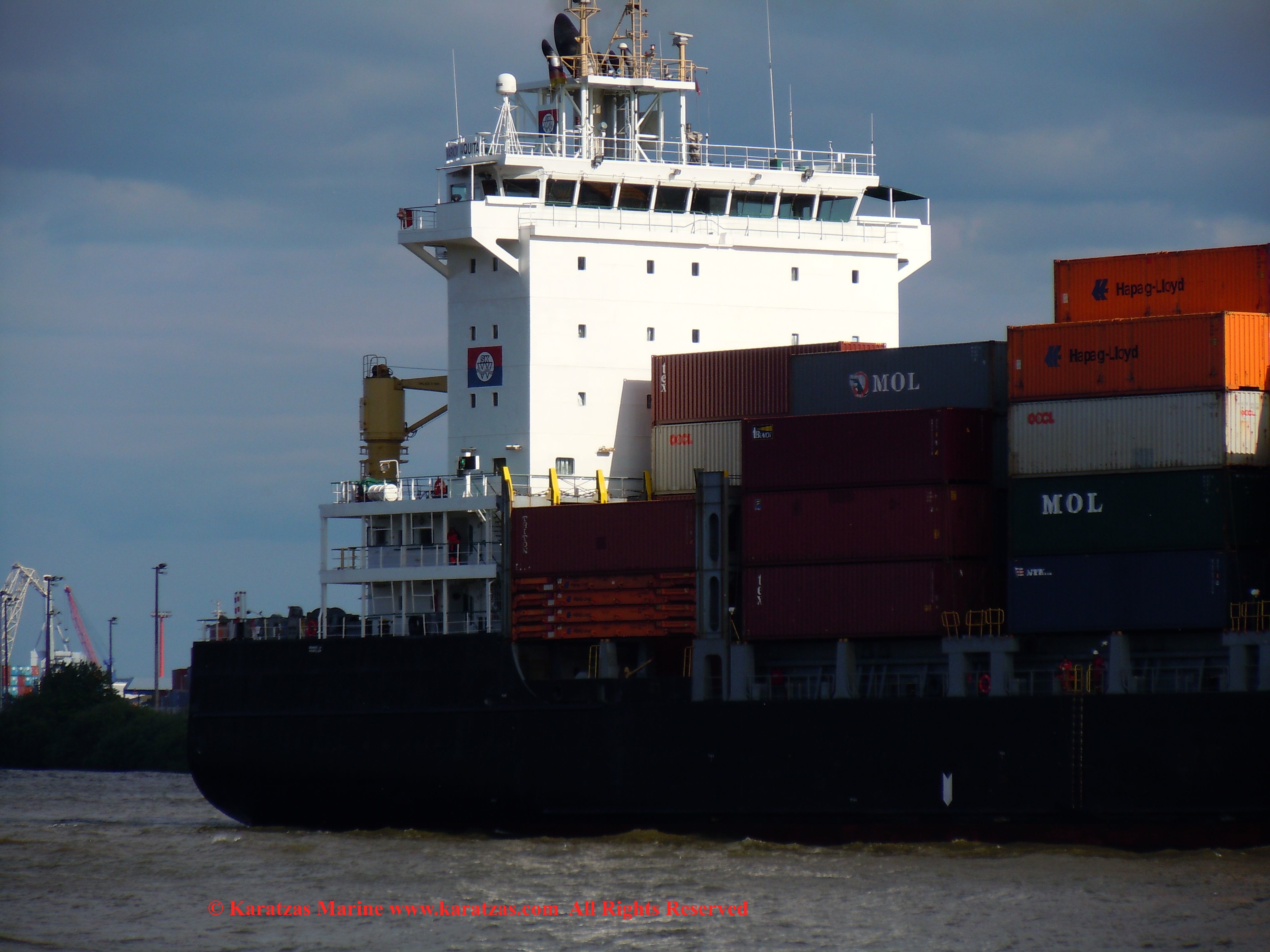 IDENTIFICATION: Handy Containership, Call Sign V2DW9, IMO Number 9437191. Built at Zhejiang Ouhua, Antigua & Barbuda Flagged, GL Classed, Ice Strengthened E Class, Length Overall of 166.15 m., Length Between Perpendiculars of 155.08 m., Draught of 9.50 m., Beam of 25.00 m., Gross Tonnage of 15,375, Moulded Depth of 14.20 m., Tonnage of 5,983 International Net. ENGINE DETAILS: Engine Description 4 S.A. 8-cyl., Engine Model 8L58/64CD, MAN Engine, Speed of 19.60 kts at 45.00 tonnes per day, Horsepower of 15,228 at 428. 1 Bow Thruster(s)