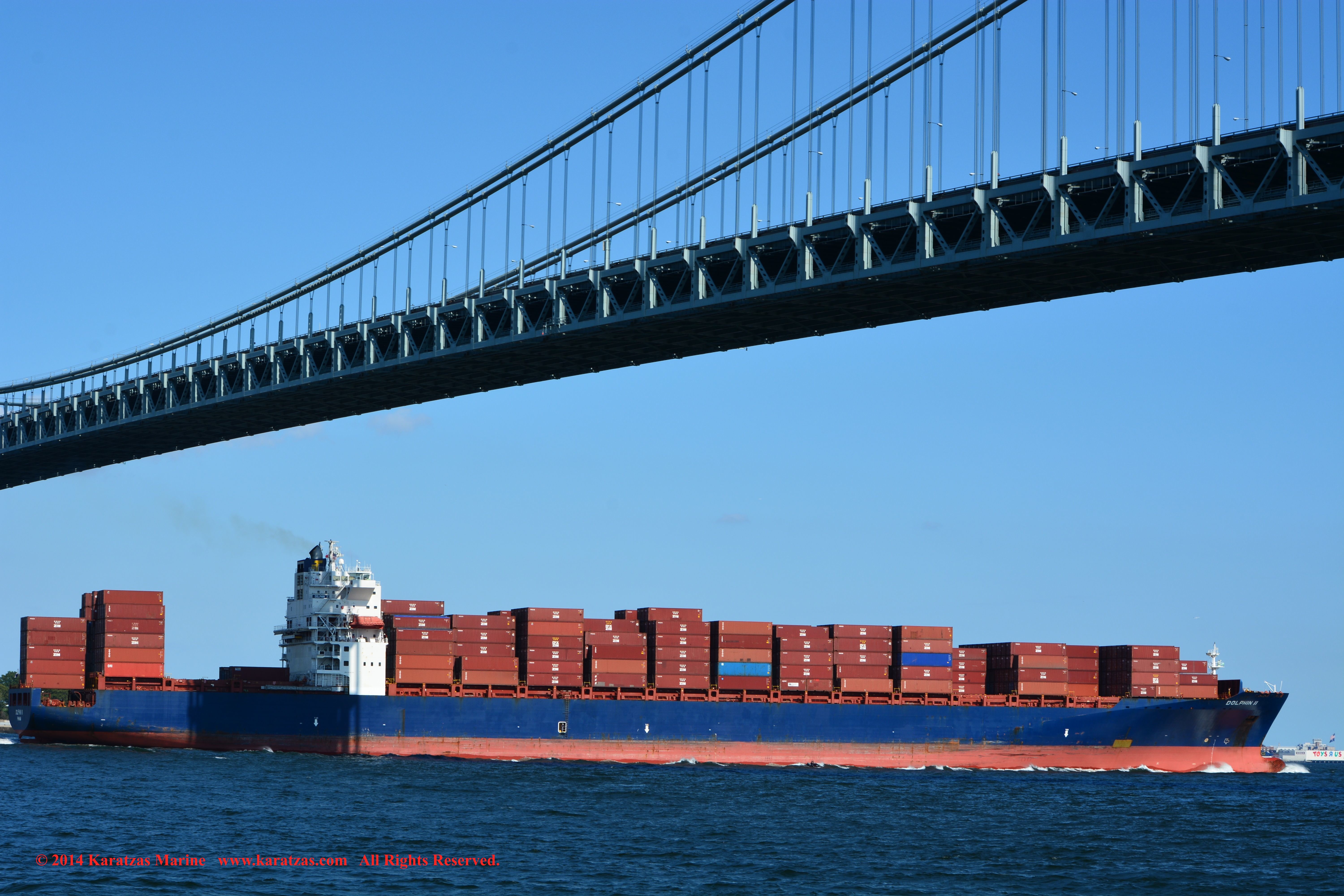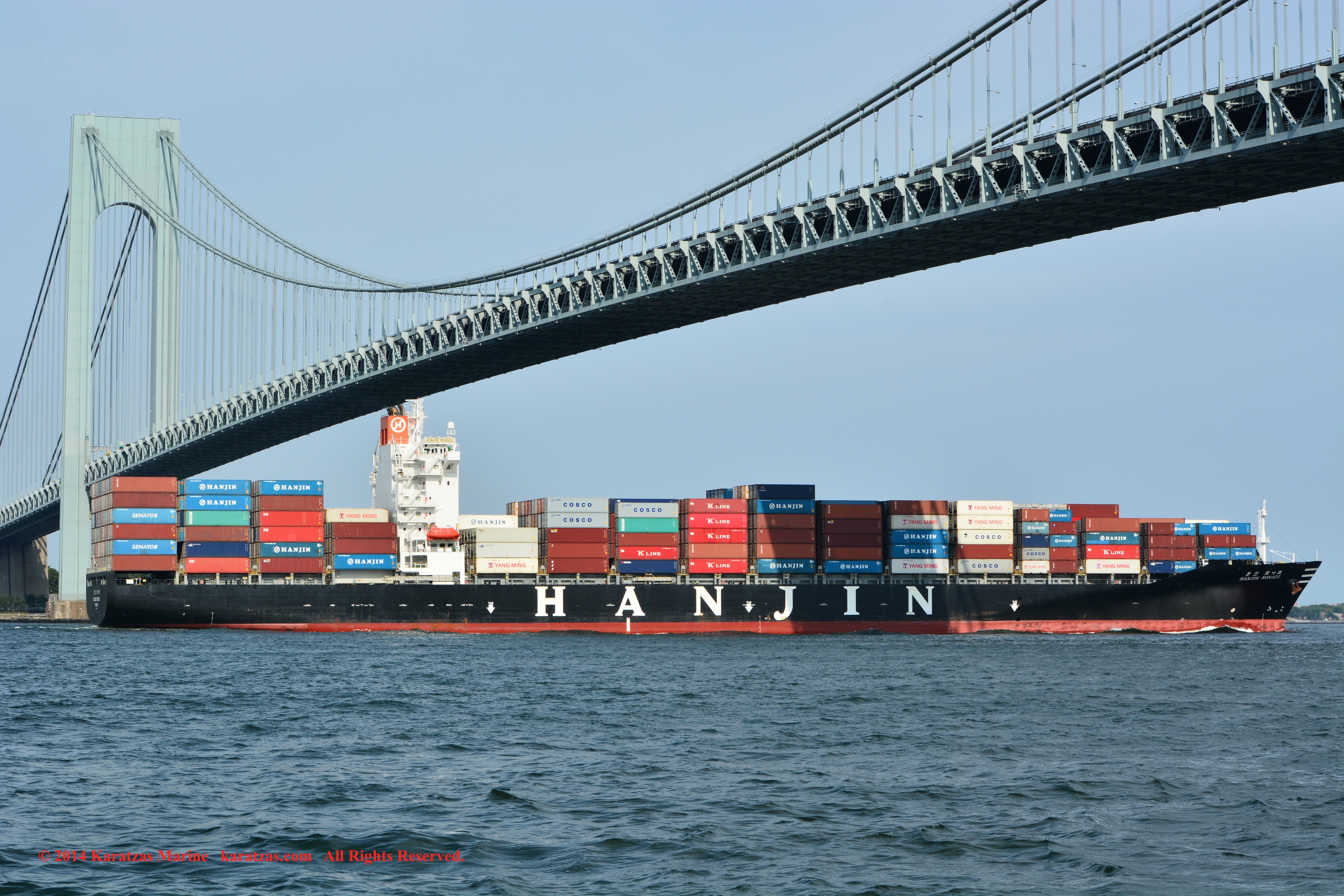 Panamax containership MV ‘Hanjin Monaco’ (4,300 TEU, built in 2009 at Samsung Heavy) departing New York Harbor. Passing under Verrazano-Narrows Bridge. karatzas.com