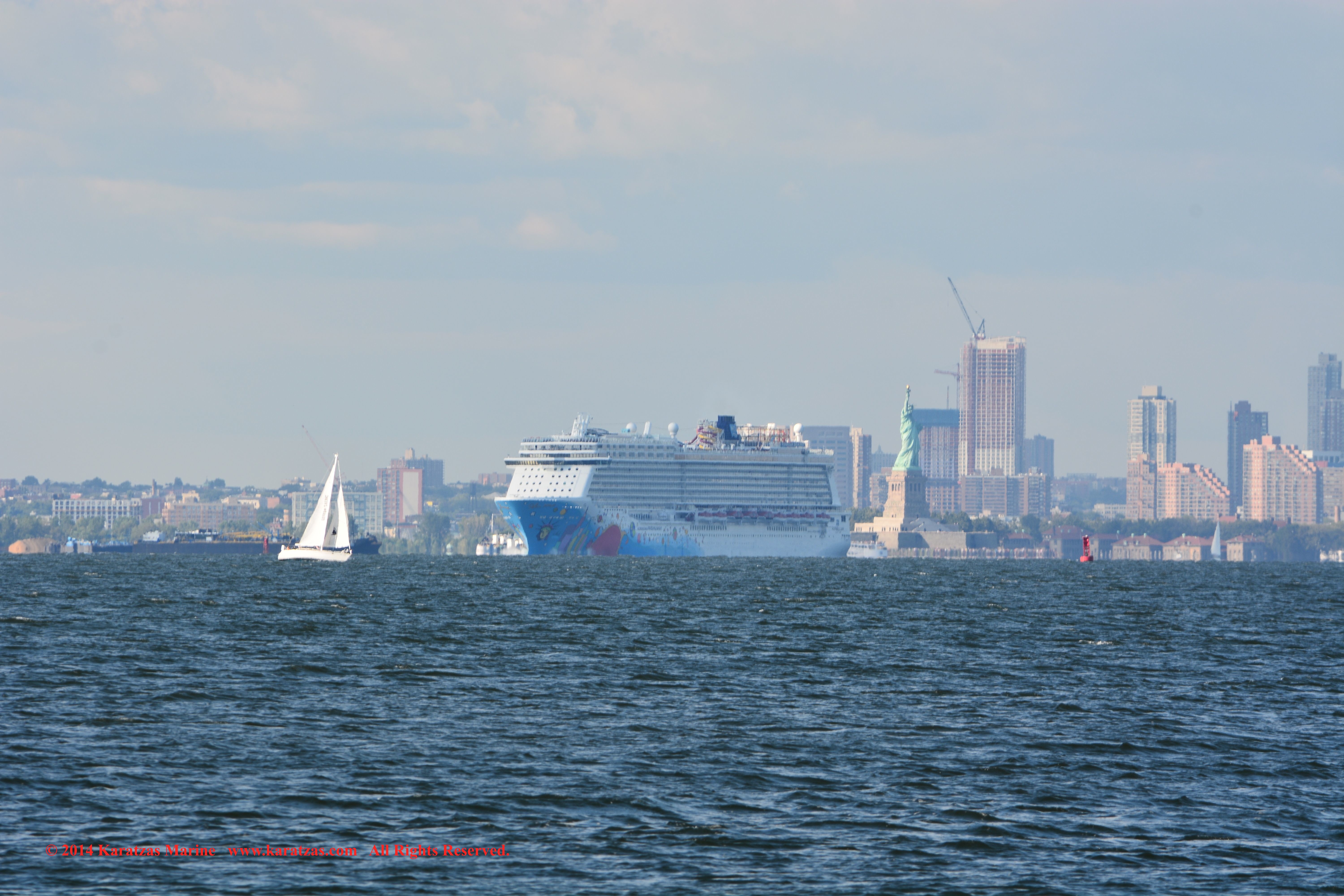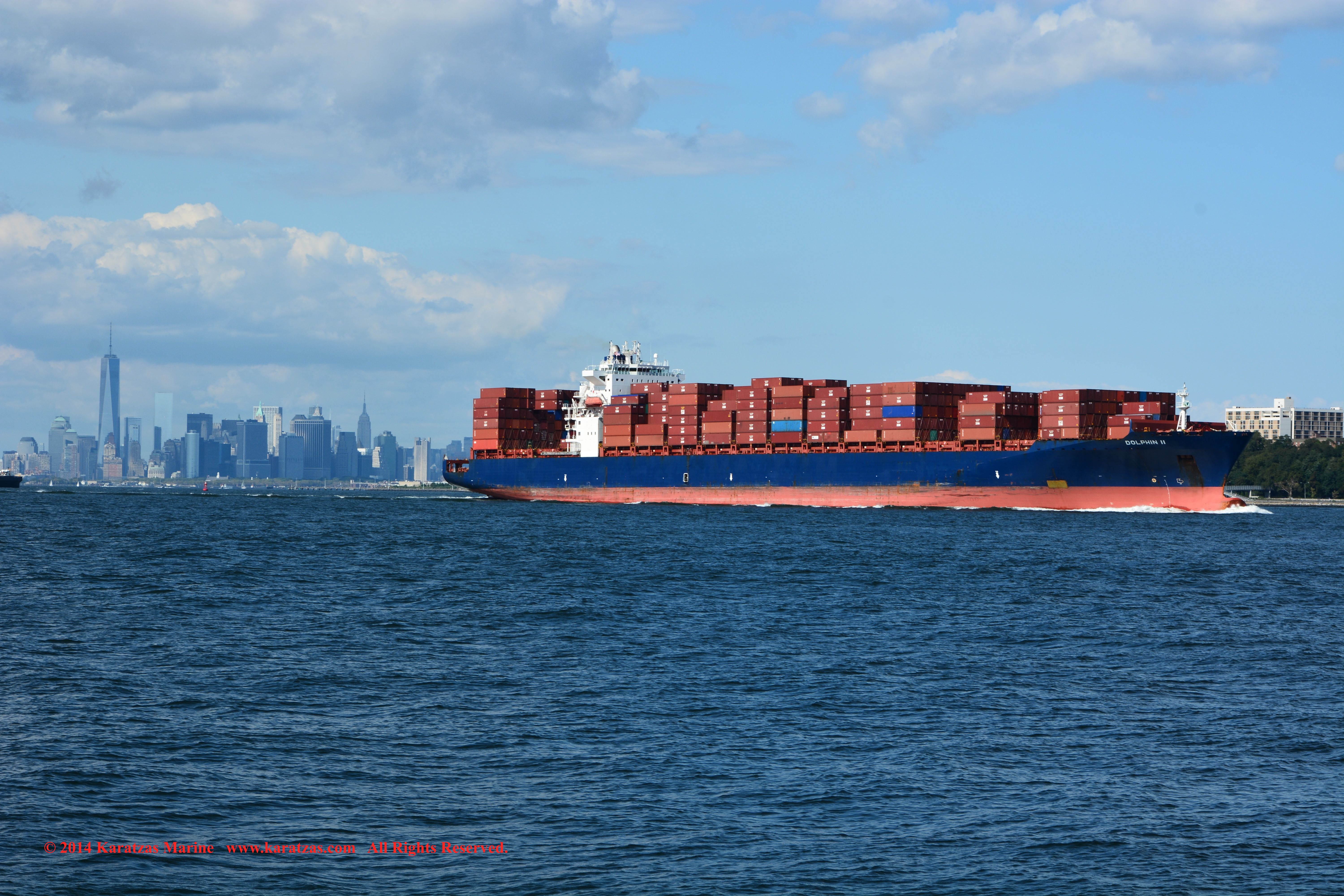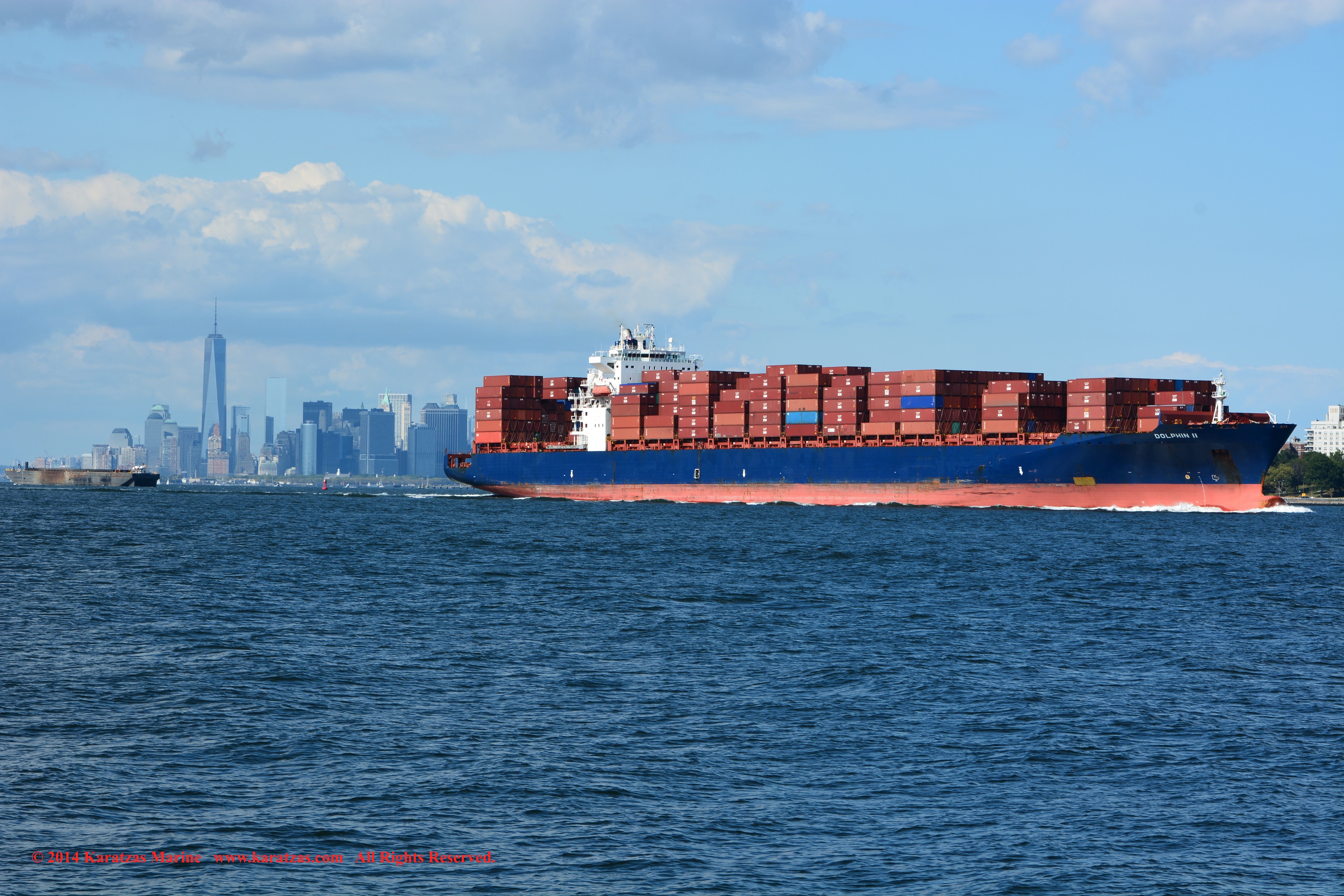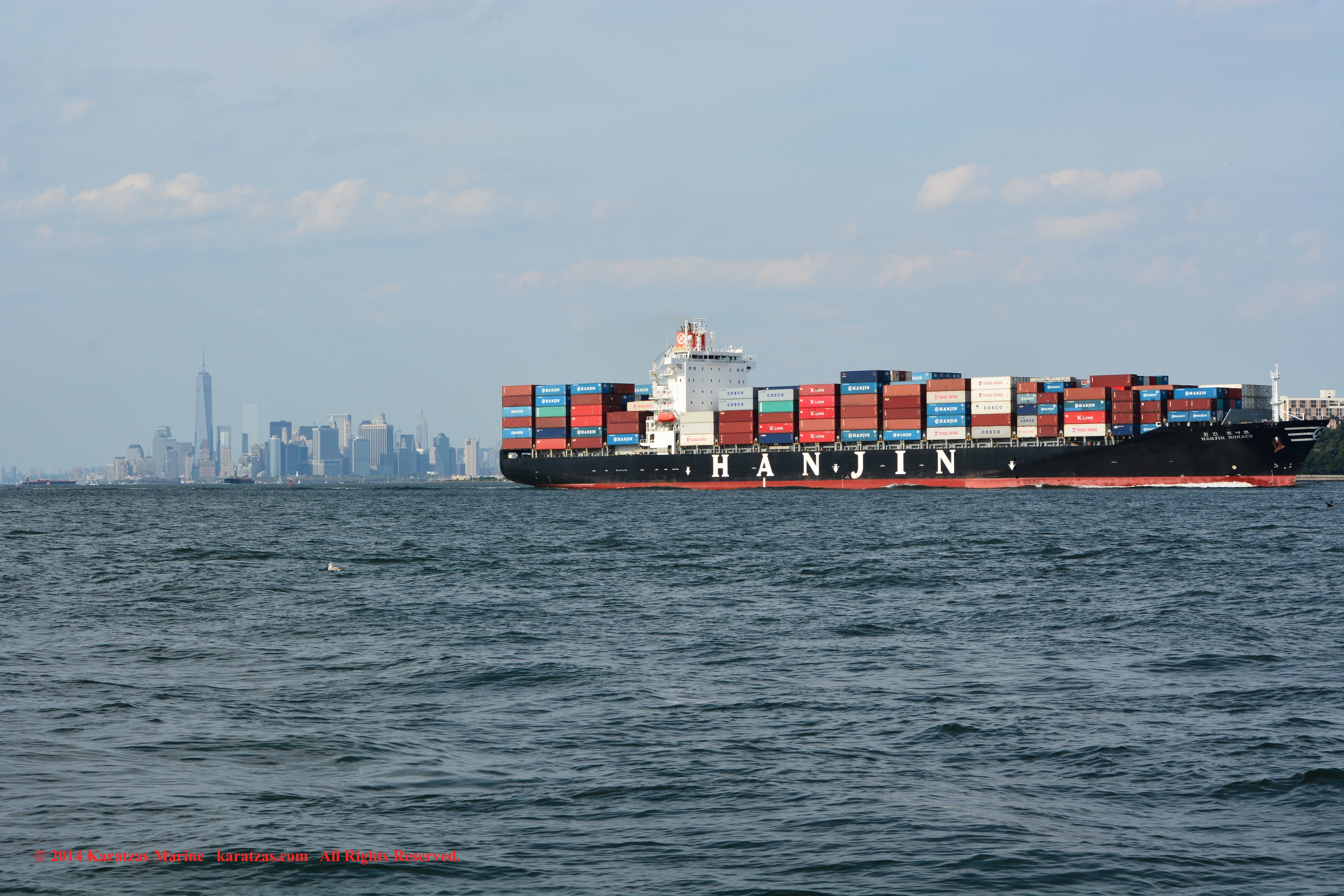 Panamax containership MV ‘Hanjin Monaco’ (4,300 TEU, built in 2009 at Samsung Heavy) departing New York Harbor. Manhattan skyline in the background. karatzas.com