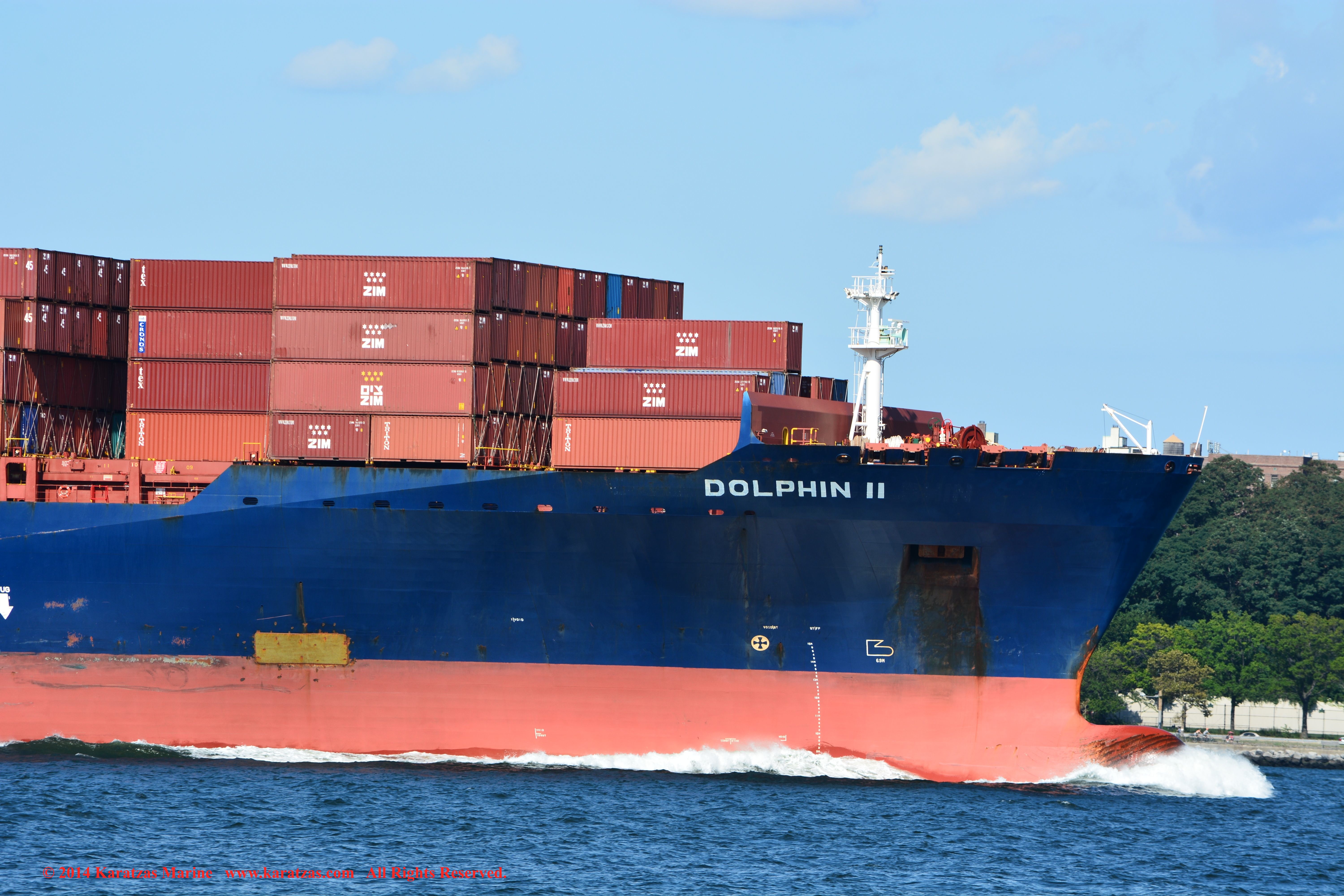 Panamax containership MV ‘Hanjin Monaco’ (4,300 TEU, built in 2009 at Samsung Heavy) departing New York Harbor. Starboard bow view detail. karatzas.com