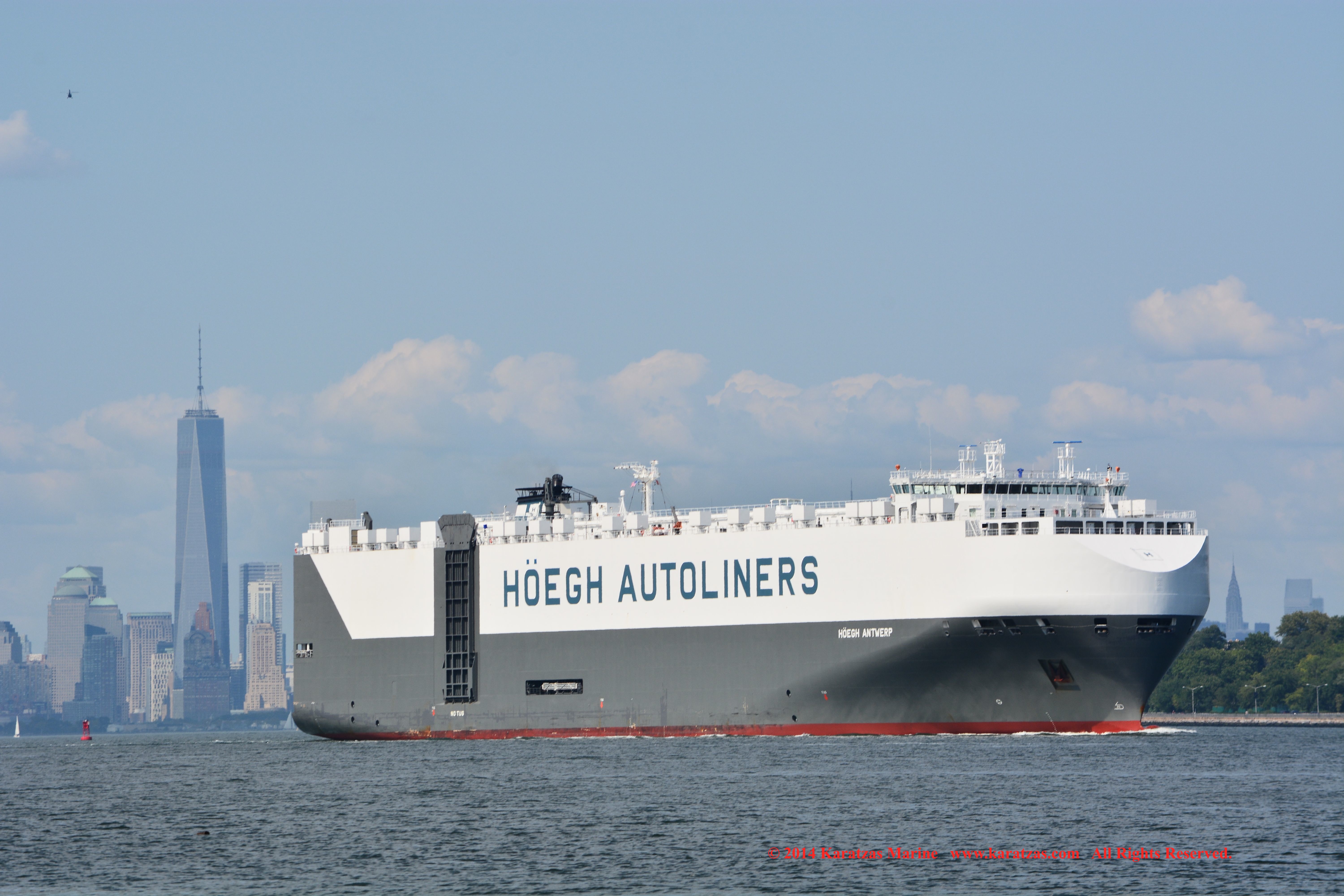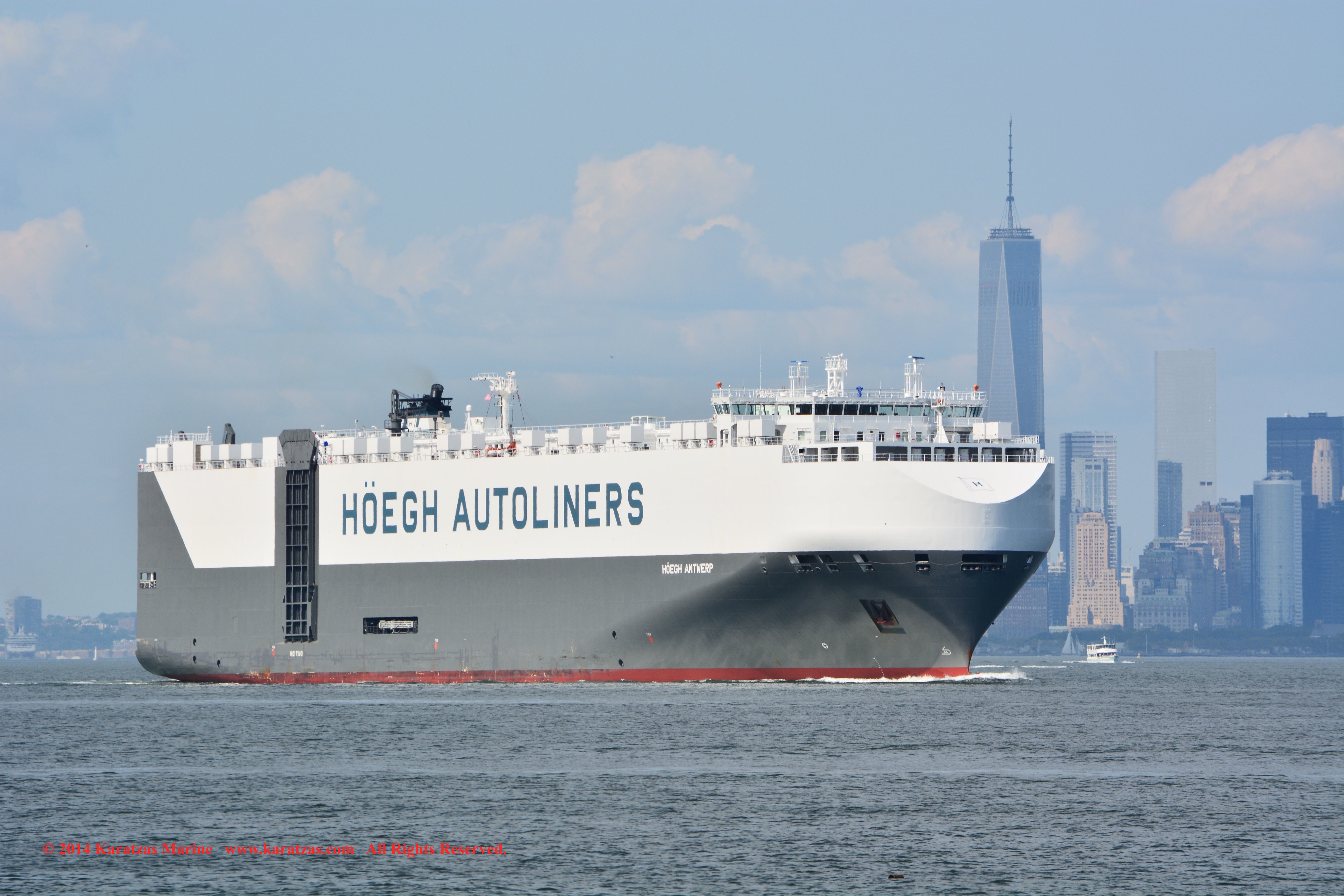 Car Carrier MV ‘HÖEGH ANTWERP’ (6,500-ceu, built in 2013 at Hyundai Mipo); vessel on lease / long-term charter to Hoegh Autoliners Downtown Manhattan skyline and World Trade Center in the background. karatzas.com