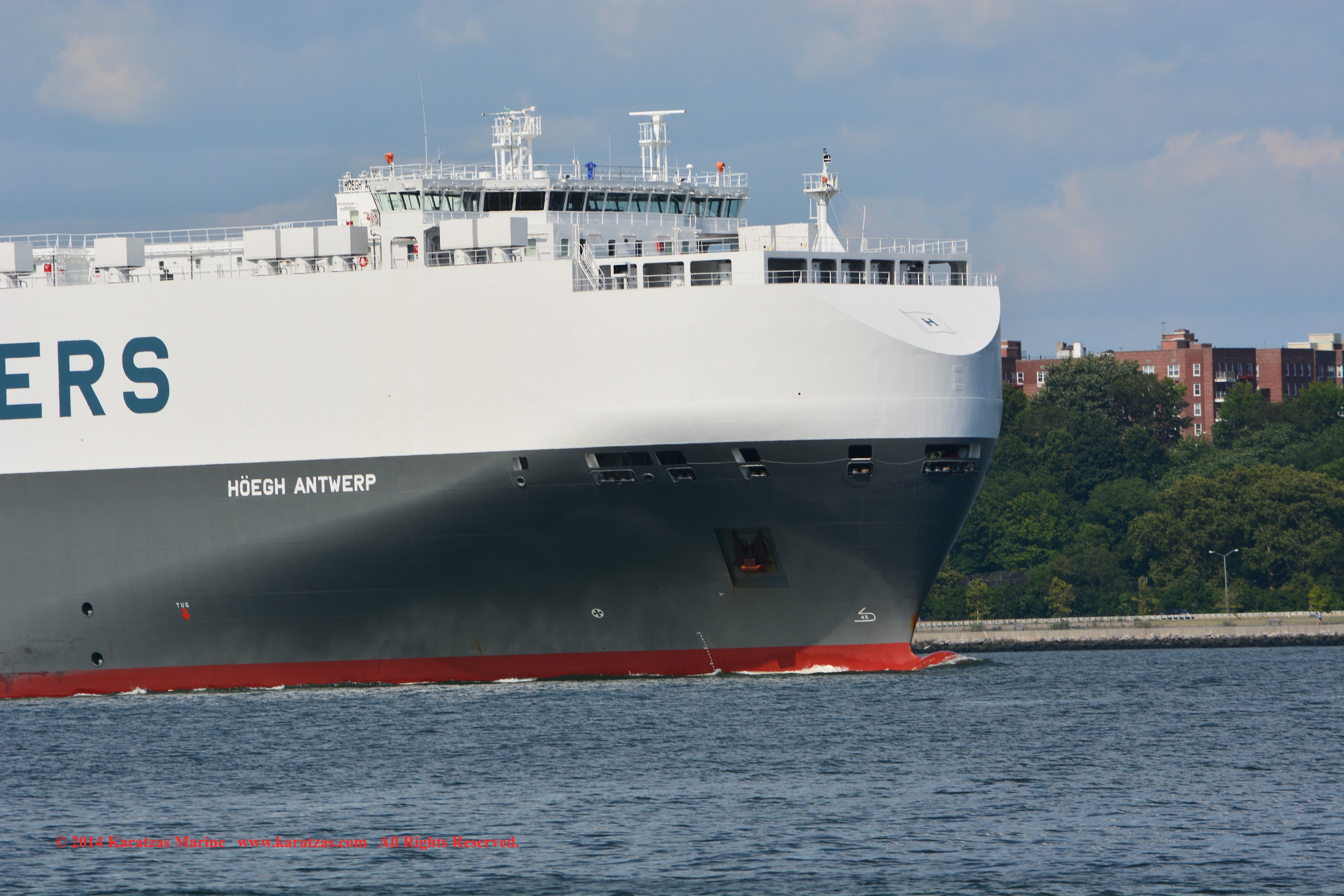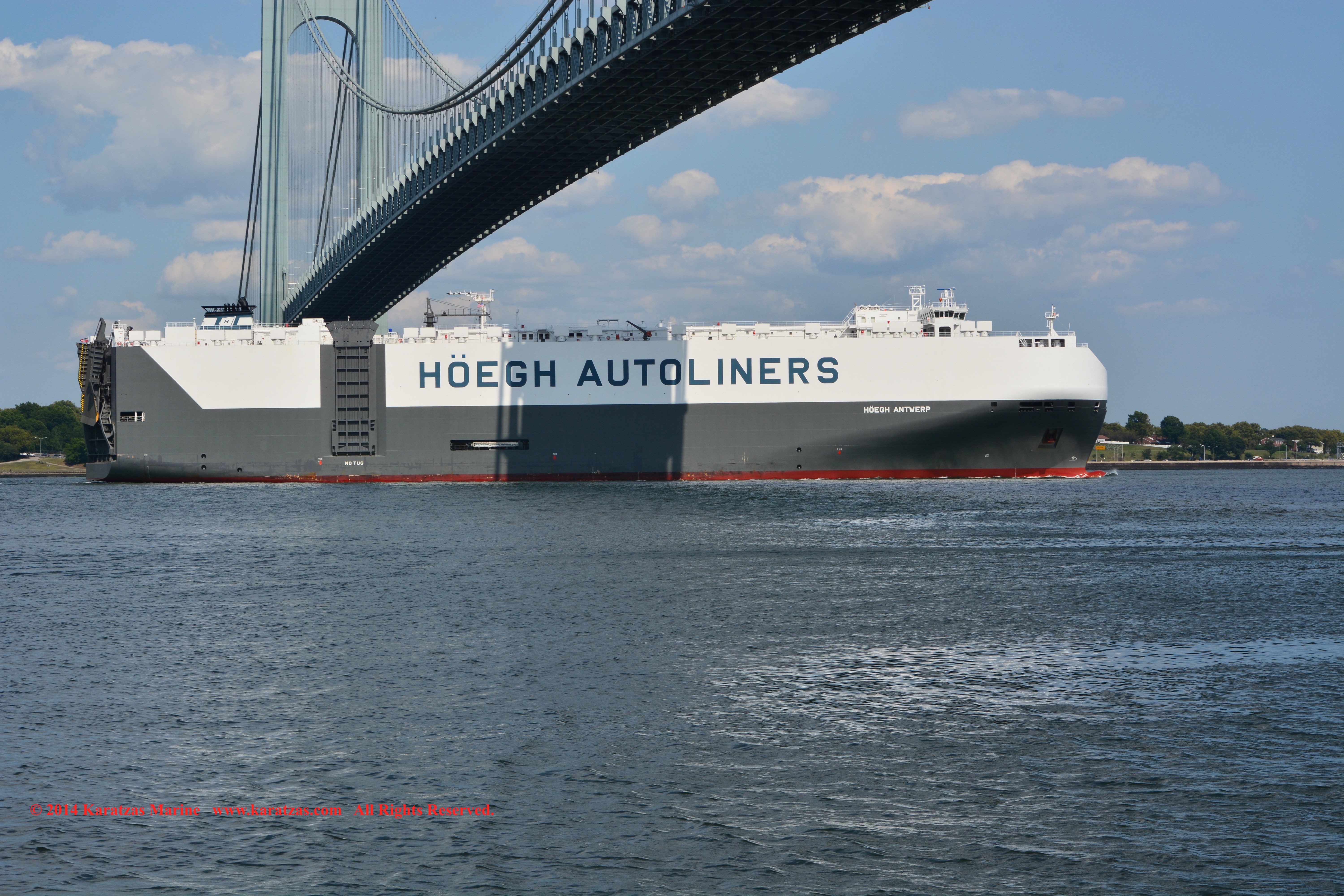 Car Carrier MV ‘HÖEGH ANTWERP’ (6,500-ceu, built in 2013 at Hyundai Mipo); vessel on lease / long-term charter to Hoegh Autoliners. Vessel passing under Verrazano-Narrows Bridge. karatzas.com