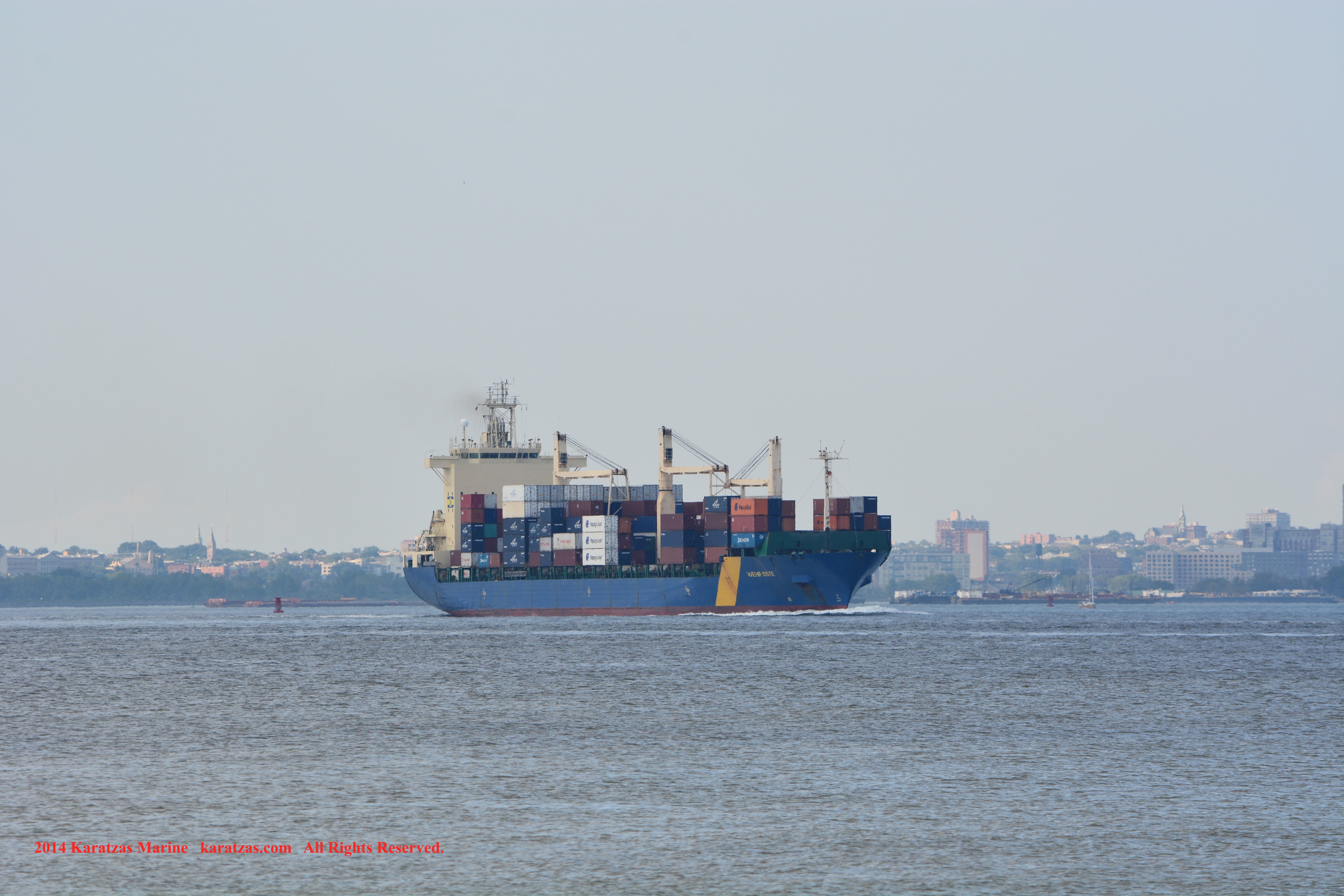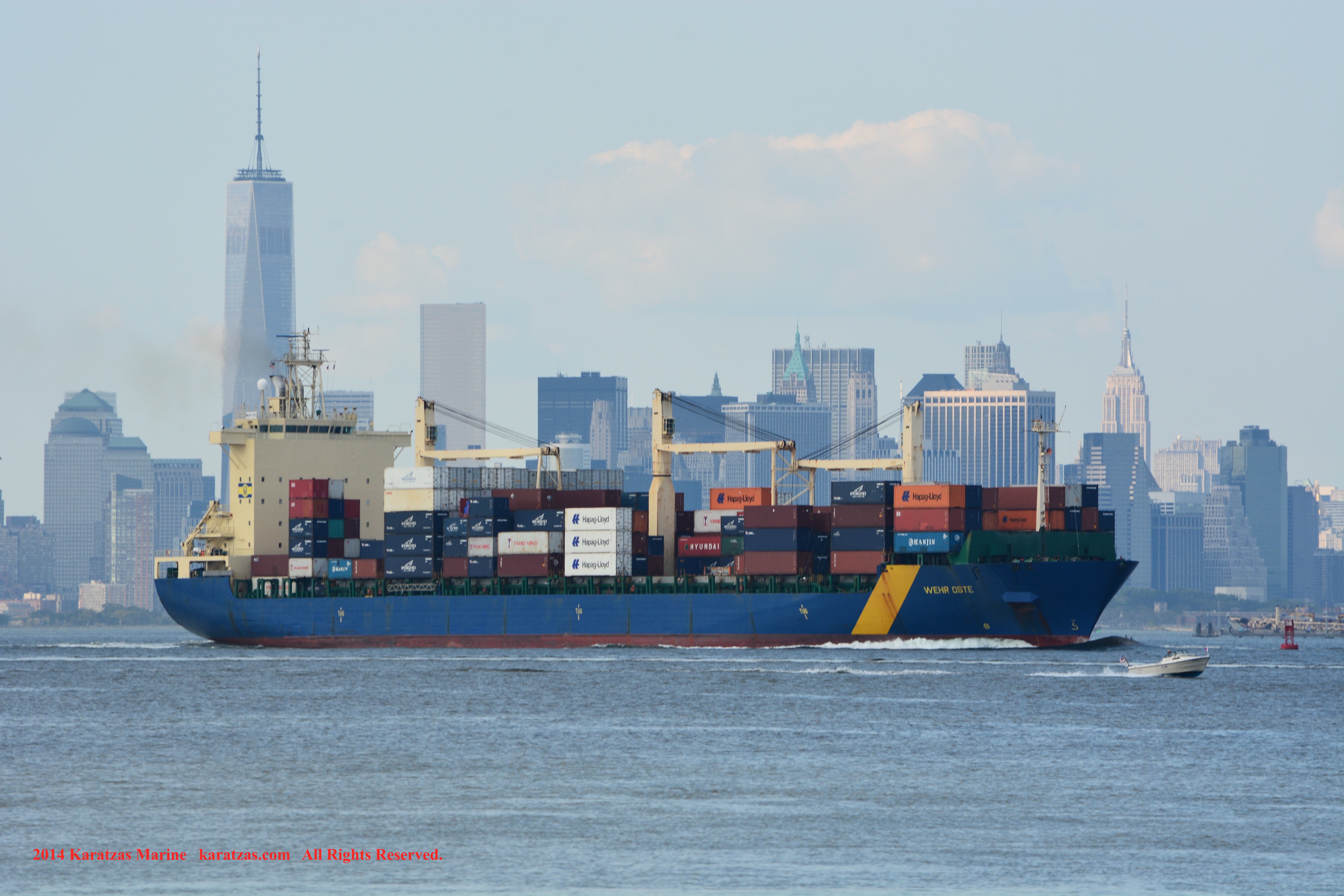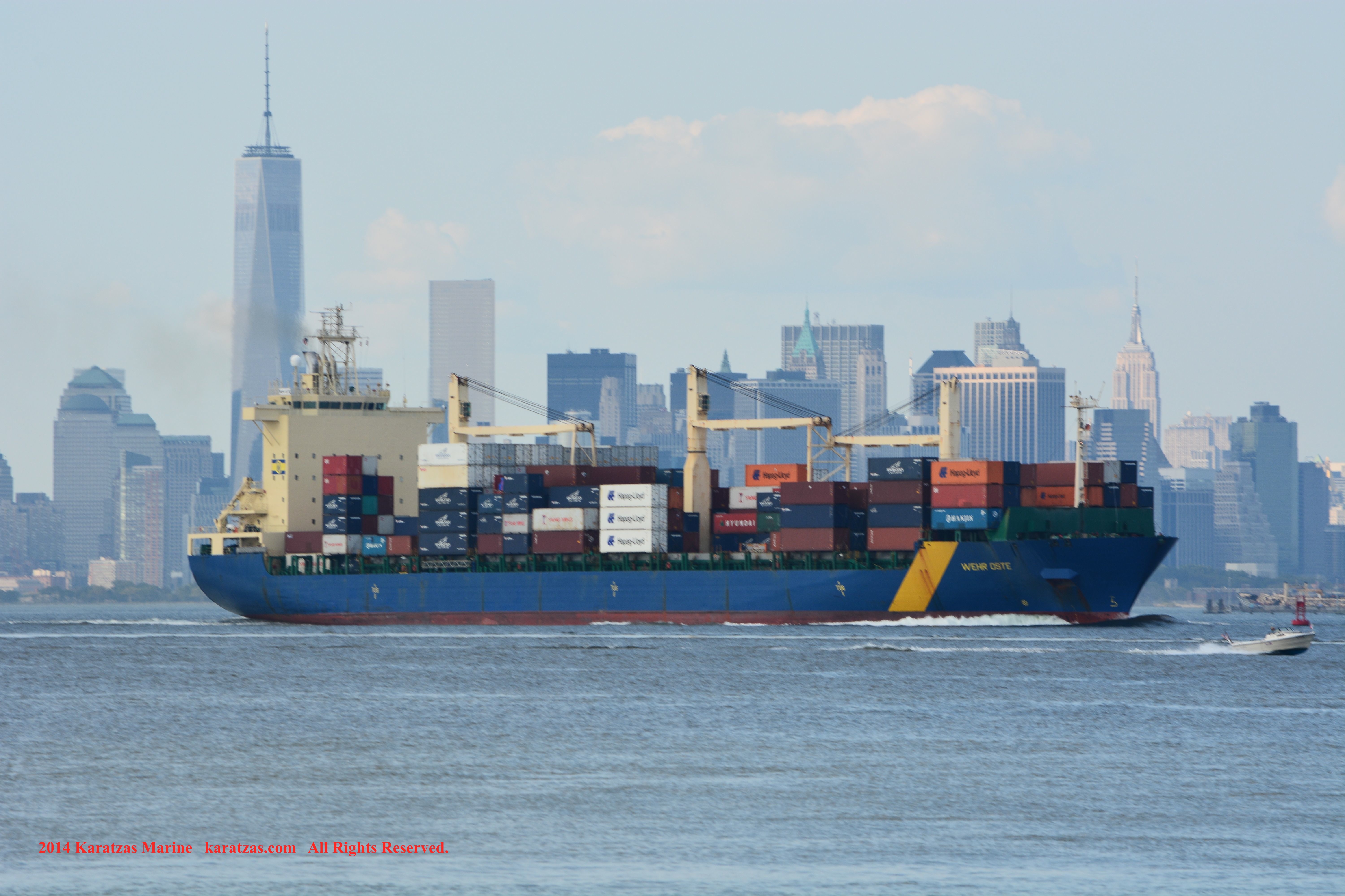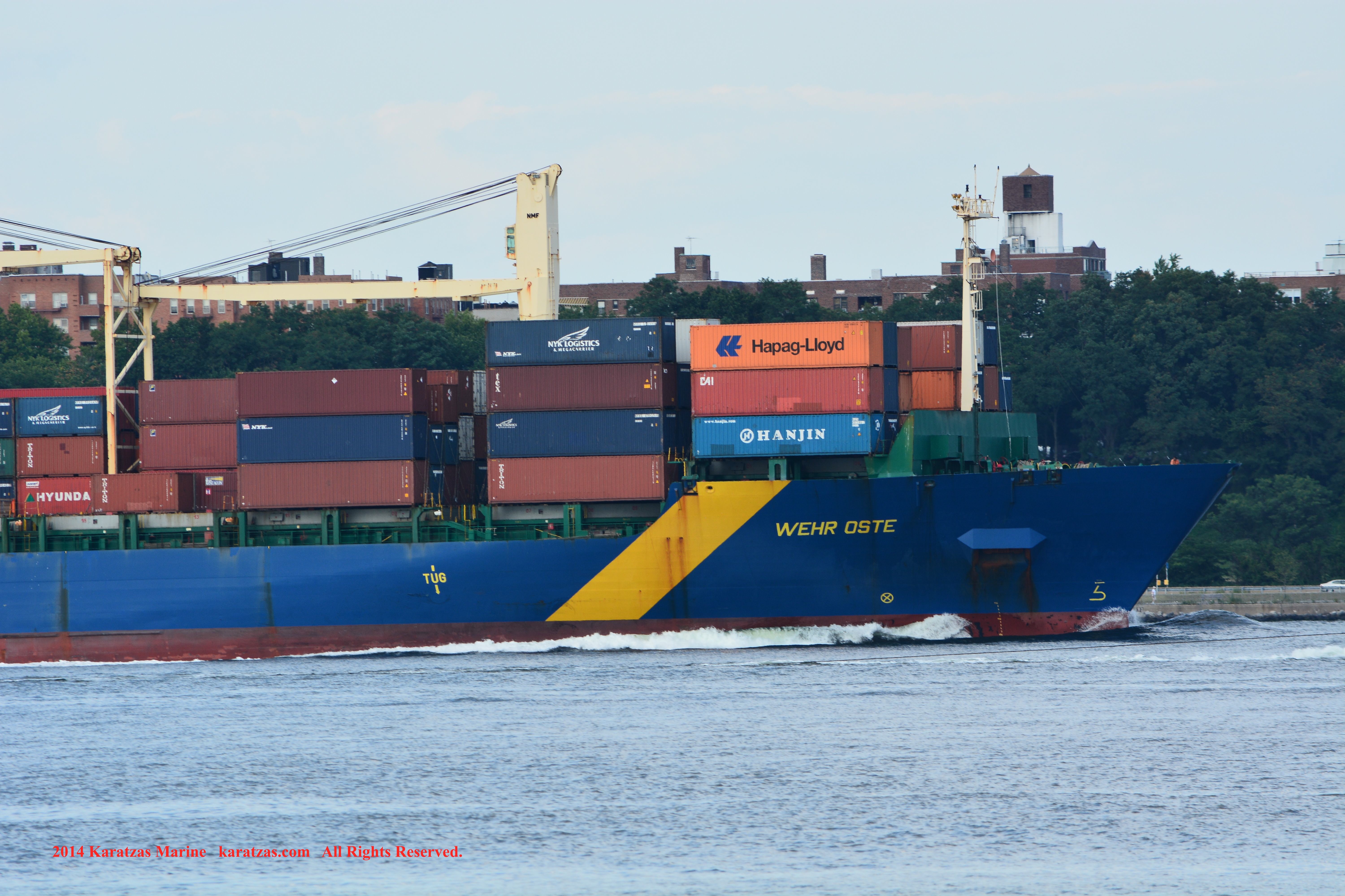 Geared containership MV ‘WEHR OSTE’ (2,500-teu, built in 2002 at Kv. Warnowwerft) departing New York Harbor. karatzas.com