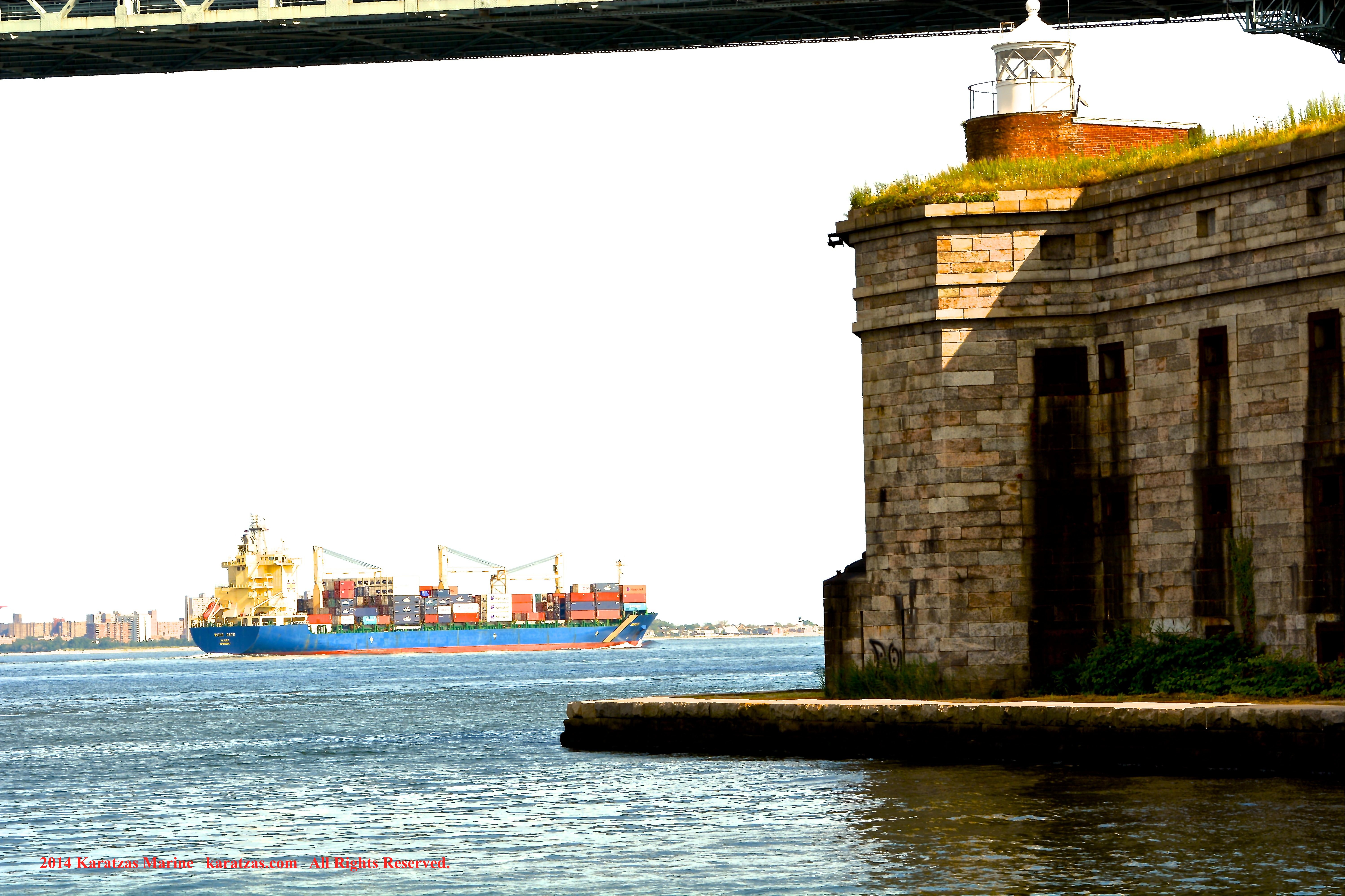 Geared containership MV ‘WEHR OSTE’ (2,500-teu, built in 2002 at Kv. Warnowwerft) departing New York Harbor. Carrying the world! Never bored of Manhattan skyline! karatzas.com