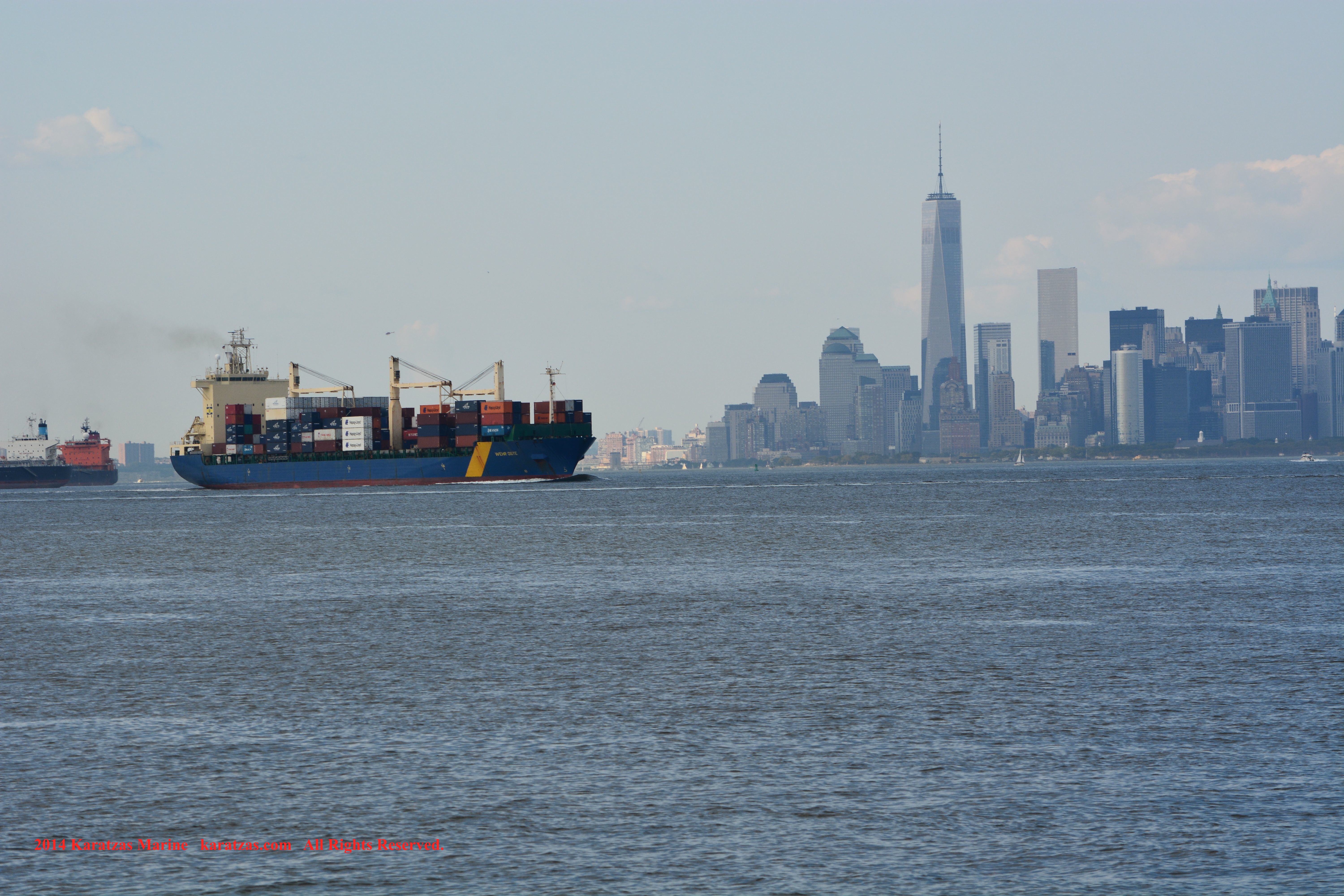 Geared containership MV ‘WEHR OSTE’ (2,500-teu, built in 2002 at Kv. Warnowwerft) departing New York Harbor. Manhattan skyscraper skyline in the background, including World Trade Center and Empire State Building. karatzas.com