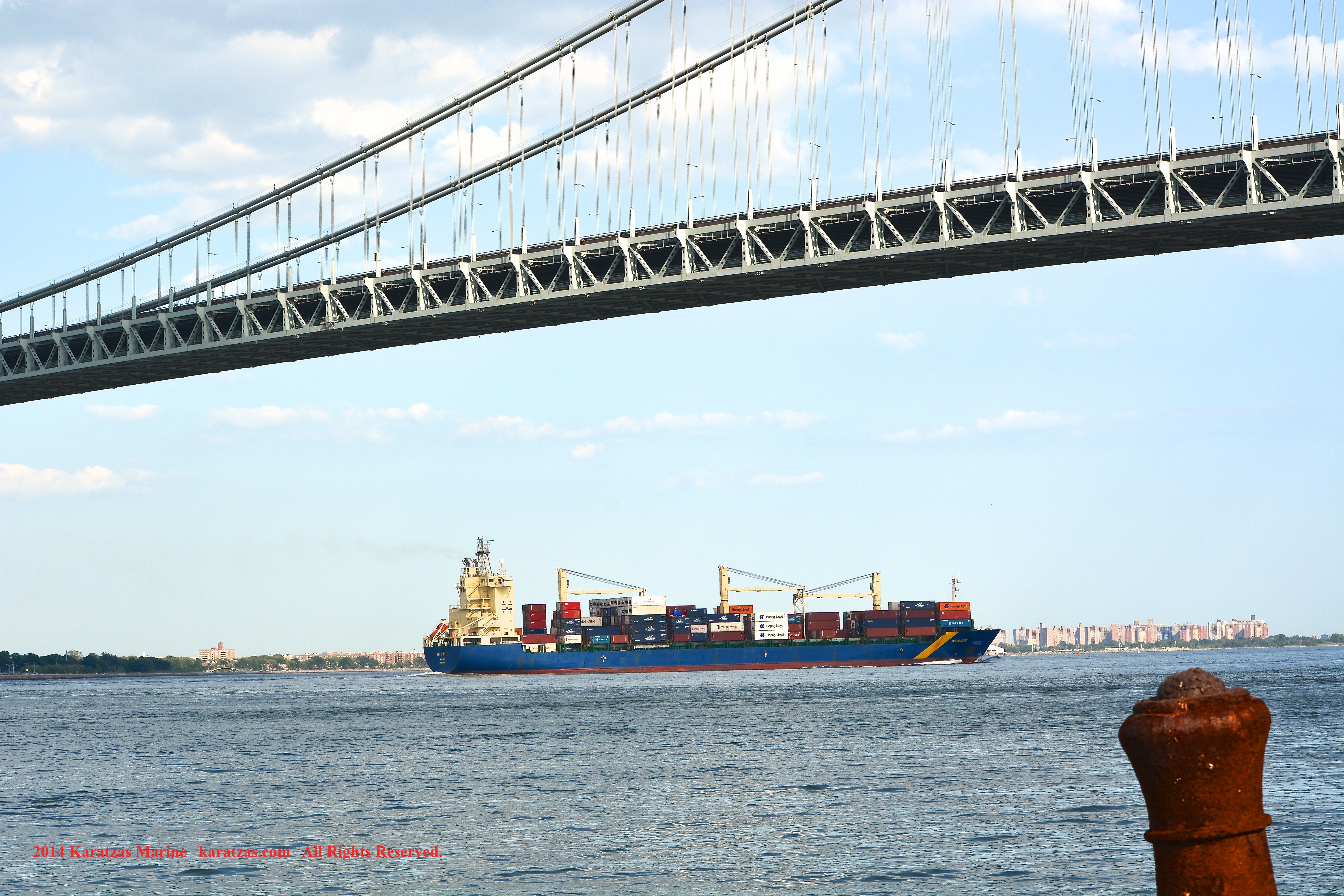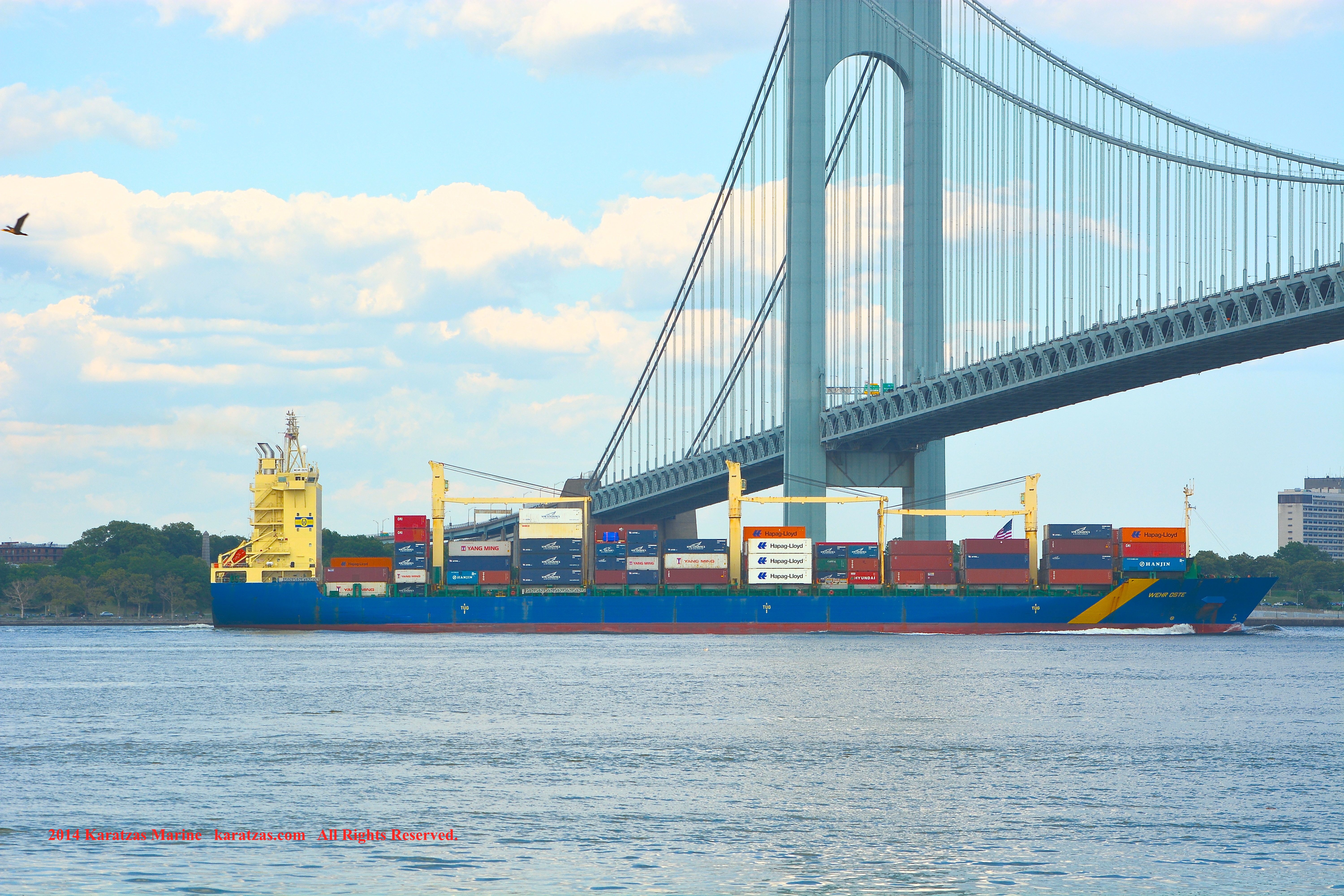 Geared containership MV ‘WEHR OSTE’ (2,500-teu, built in 2002 at Kv. Warnowwerft) departing New York Harbor. Under the Verrazano-Narrows Bridge. karatzas.com