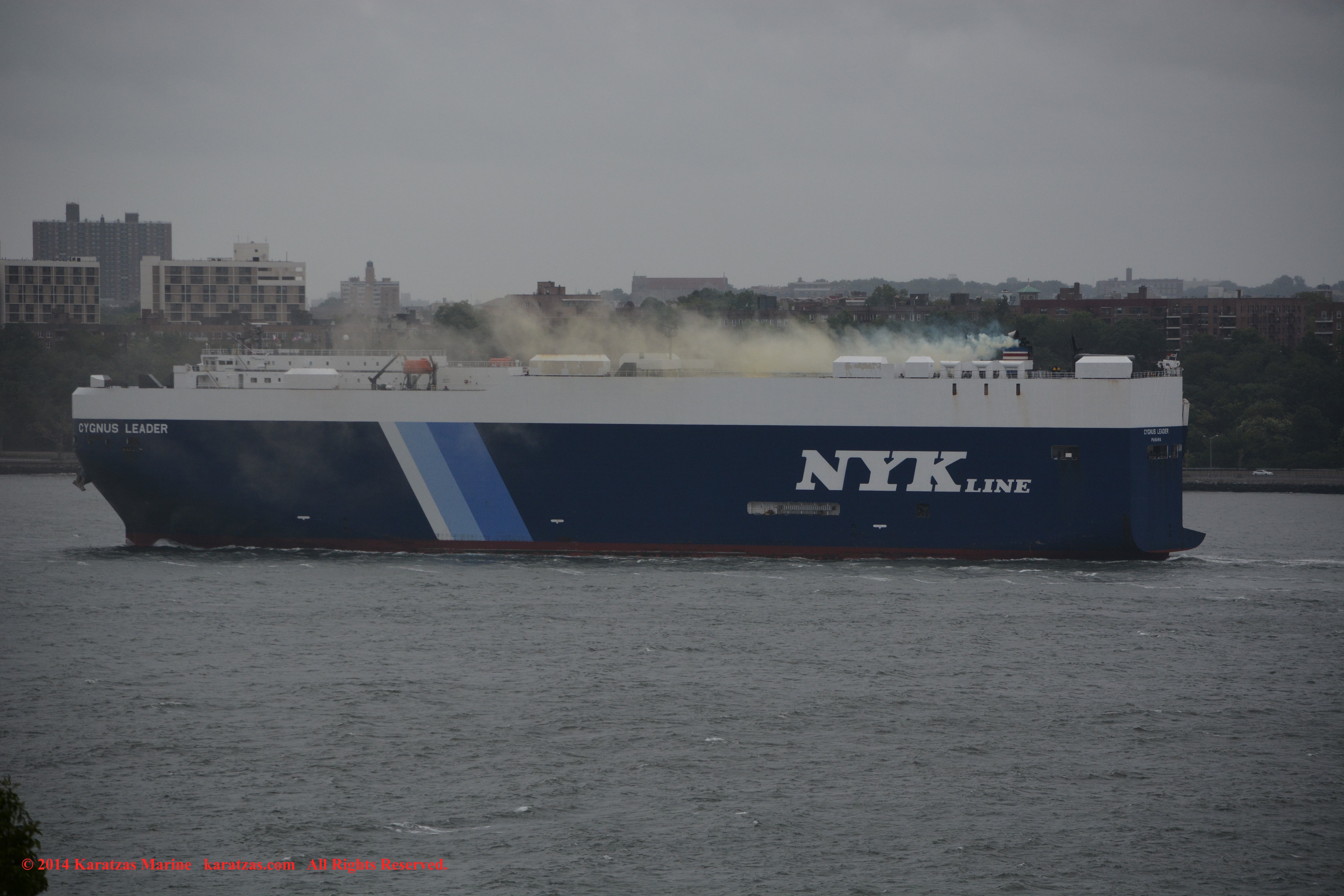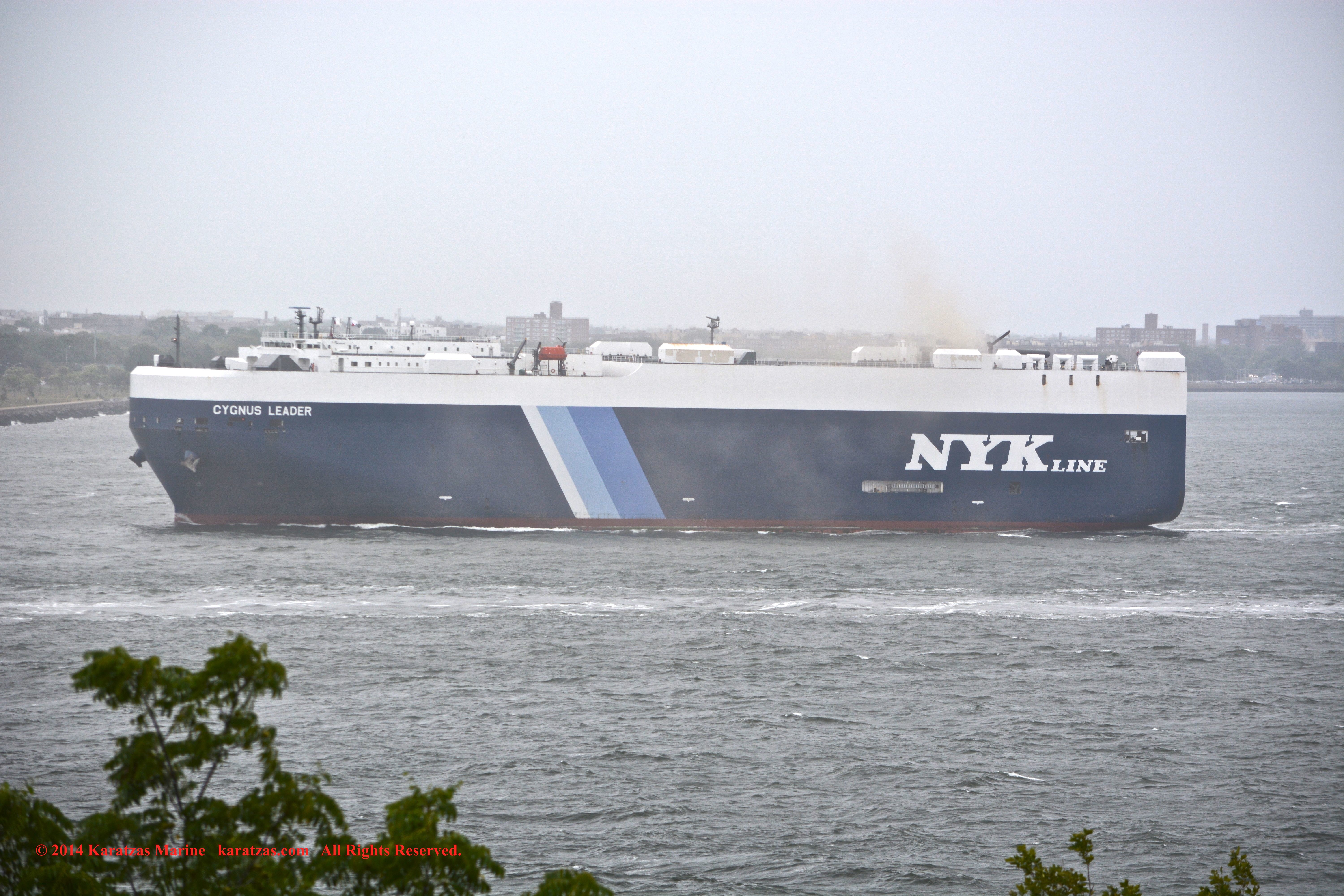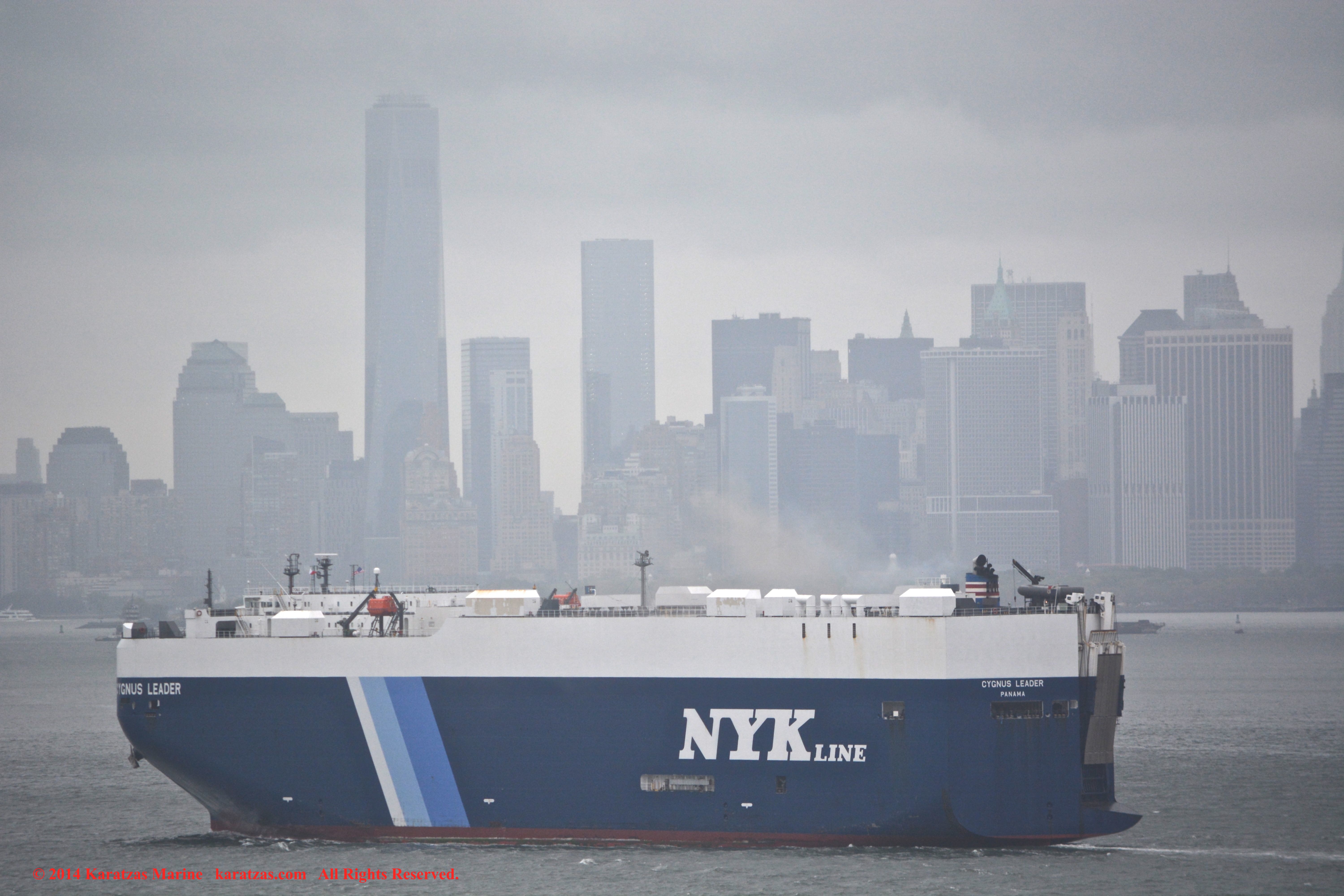 Car Carrier MV ‘Cygnus Leader’ arriving at New York Harbor on rainy summer afternoon. karatzas.com