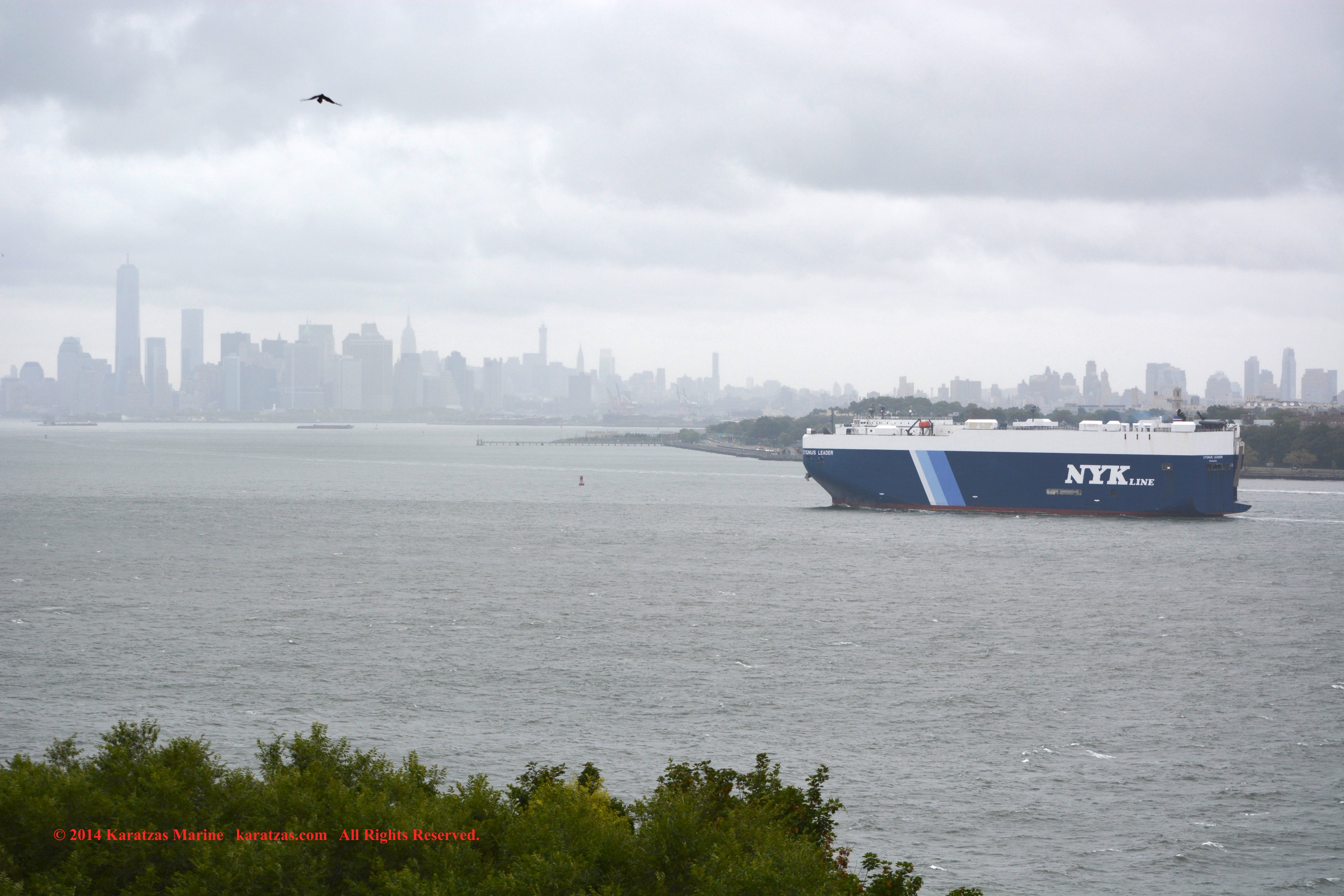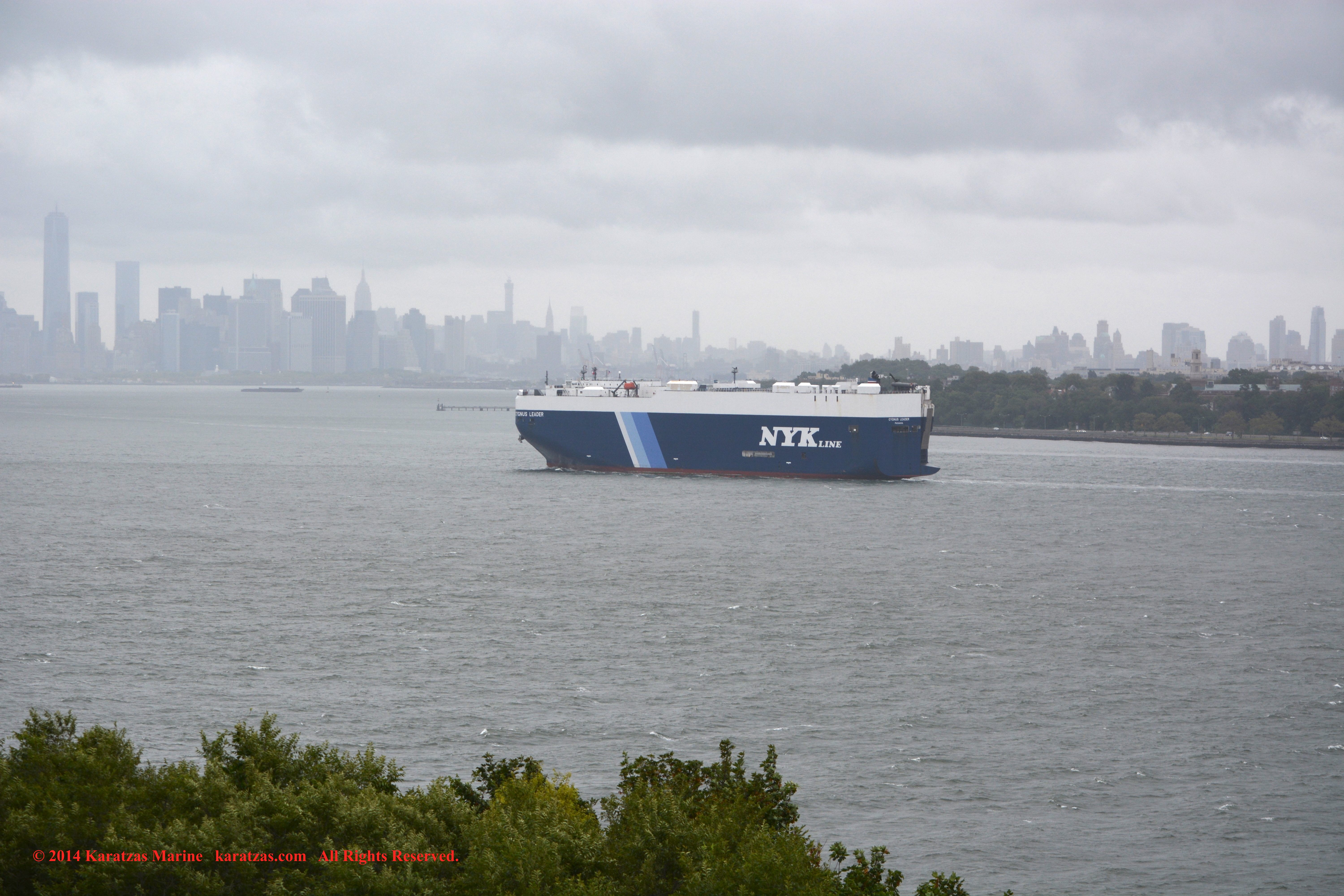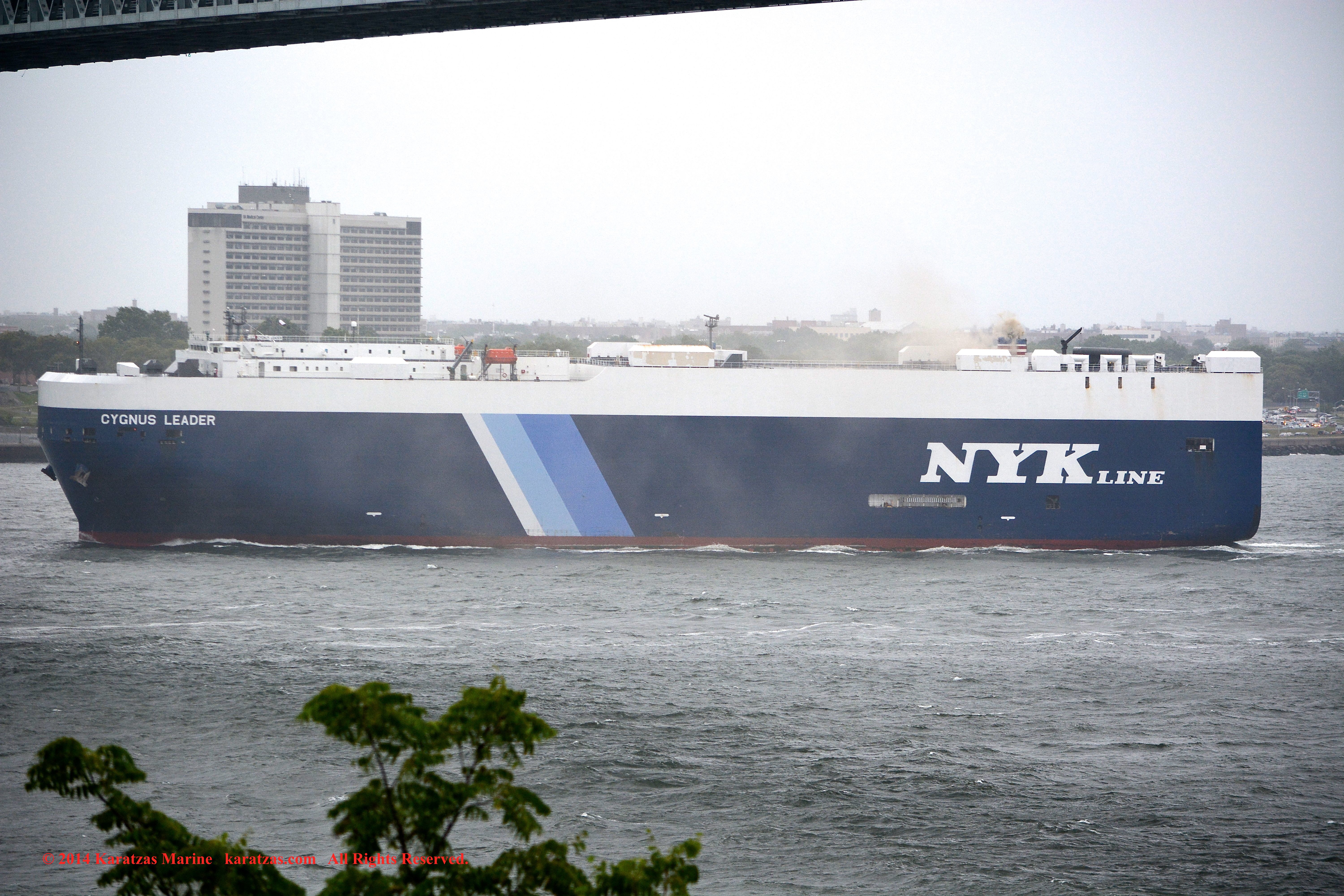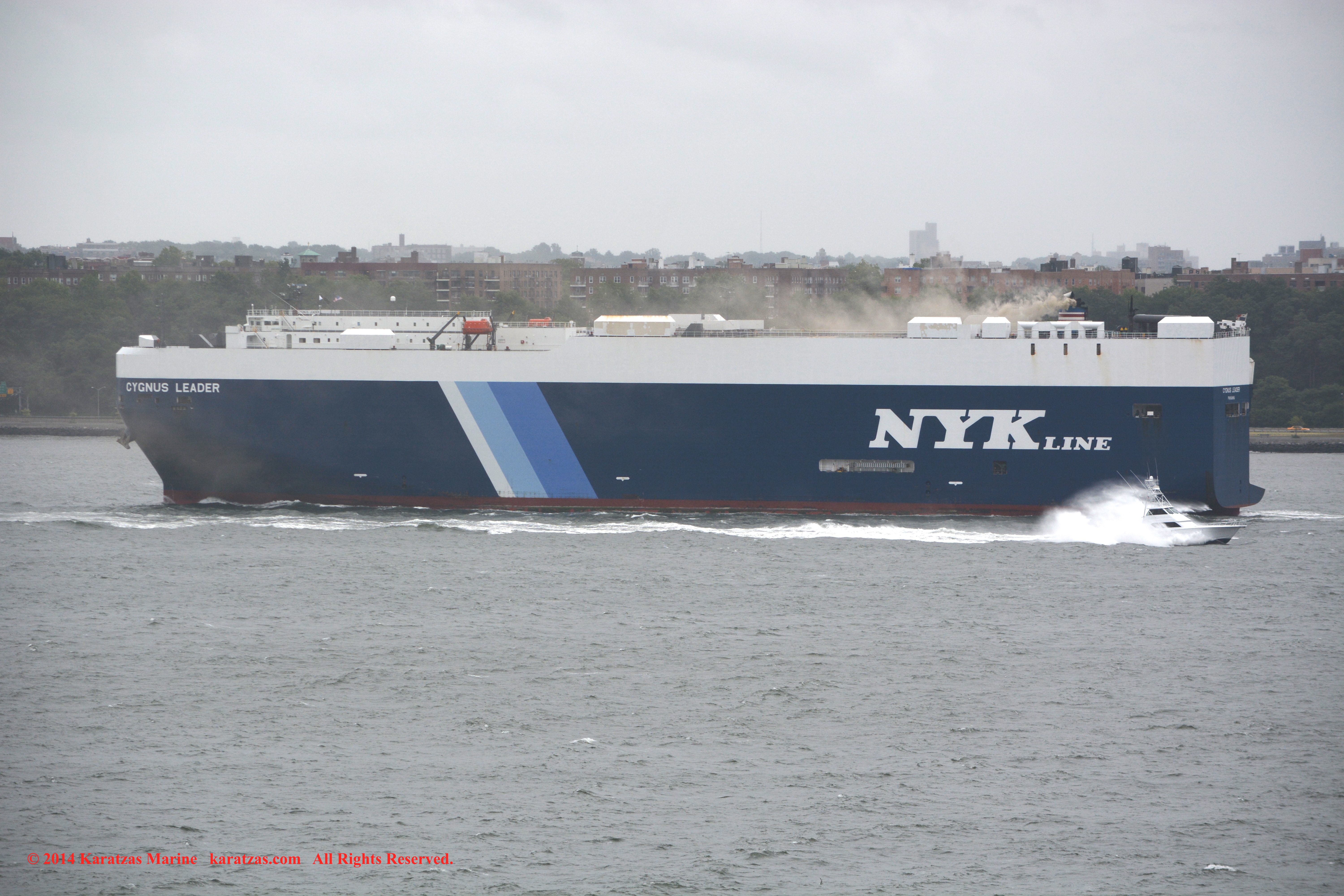 Car Carrier MV ‘Cygnus Leader’ arriving at New York Harbor on rainy summer afternoon. karatzas.com