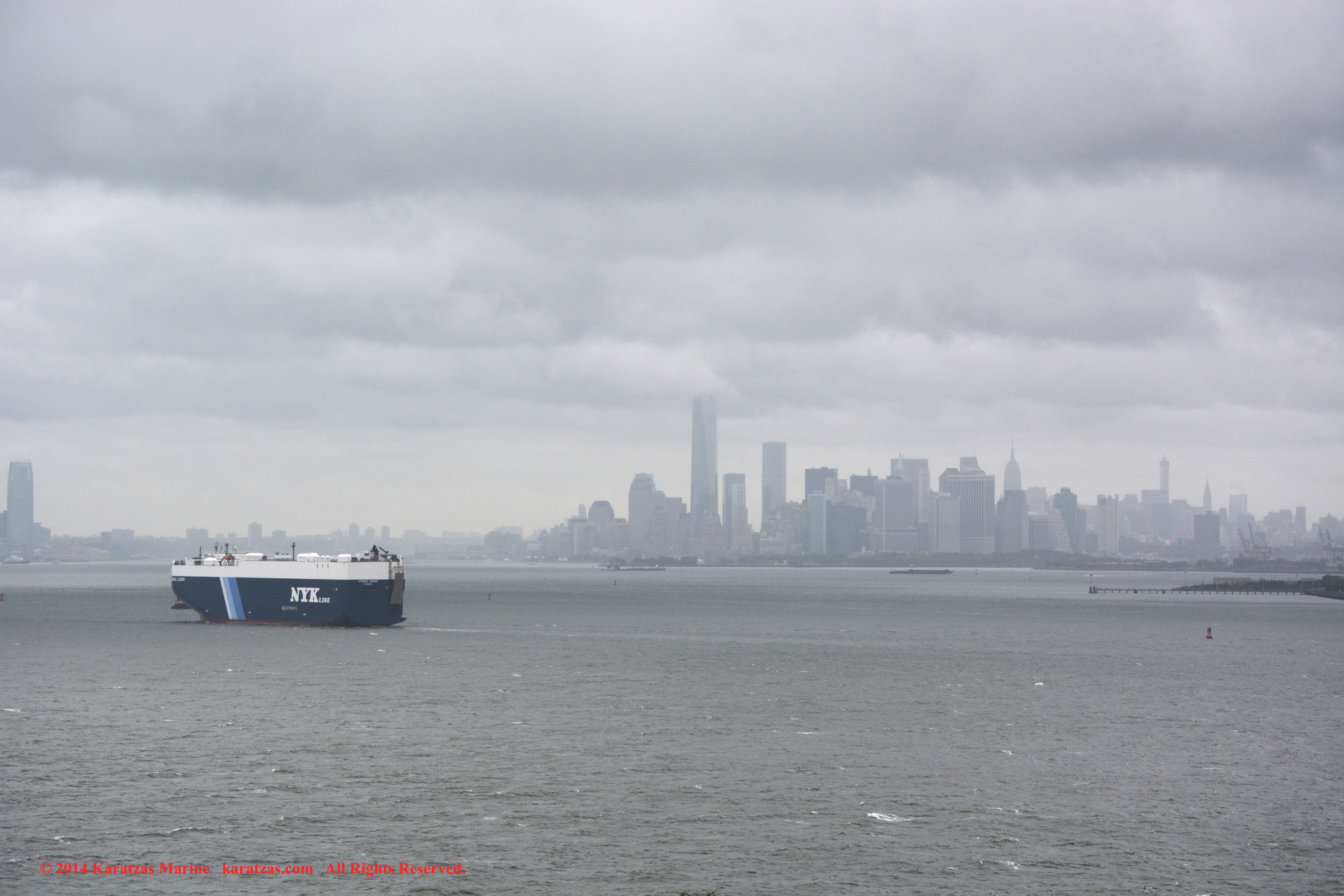 Car Carrier MV ‘Cygnus Leader’ arriving at New York Harbor on rainy summer afternoon. Manhattan skyline in the background. karatzas.com