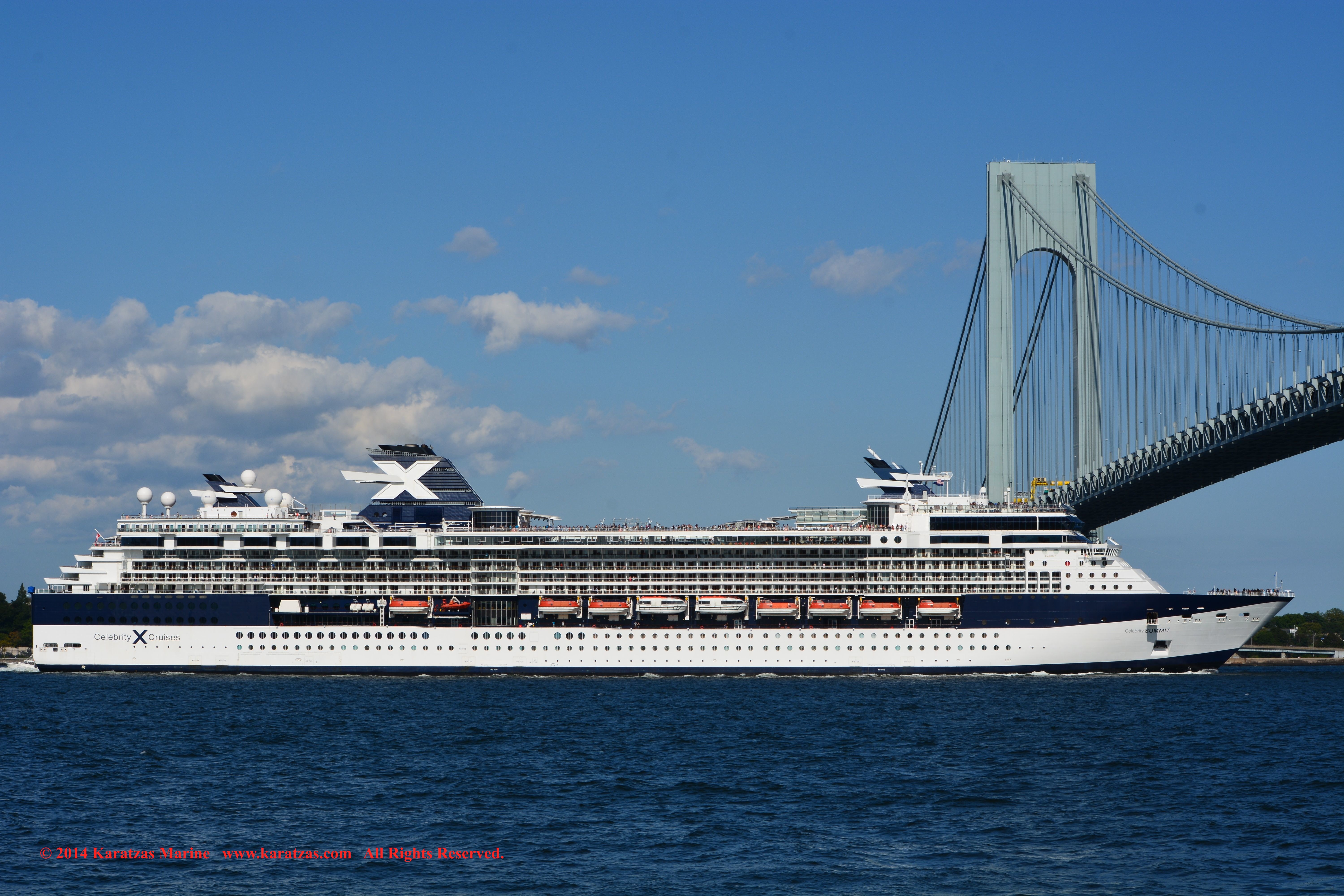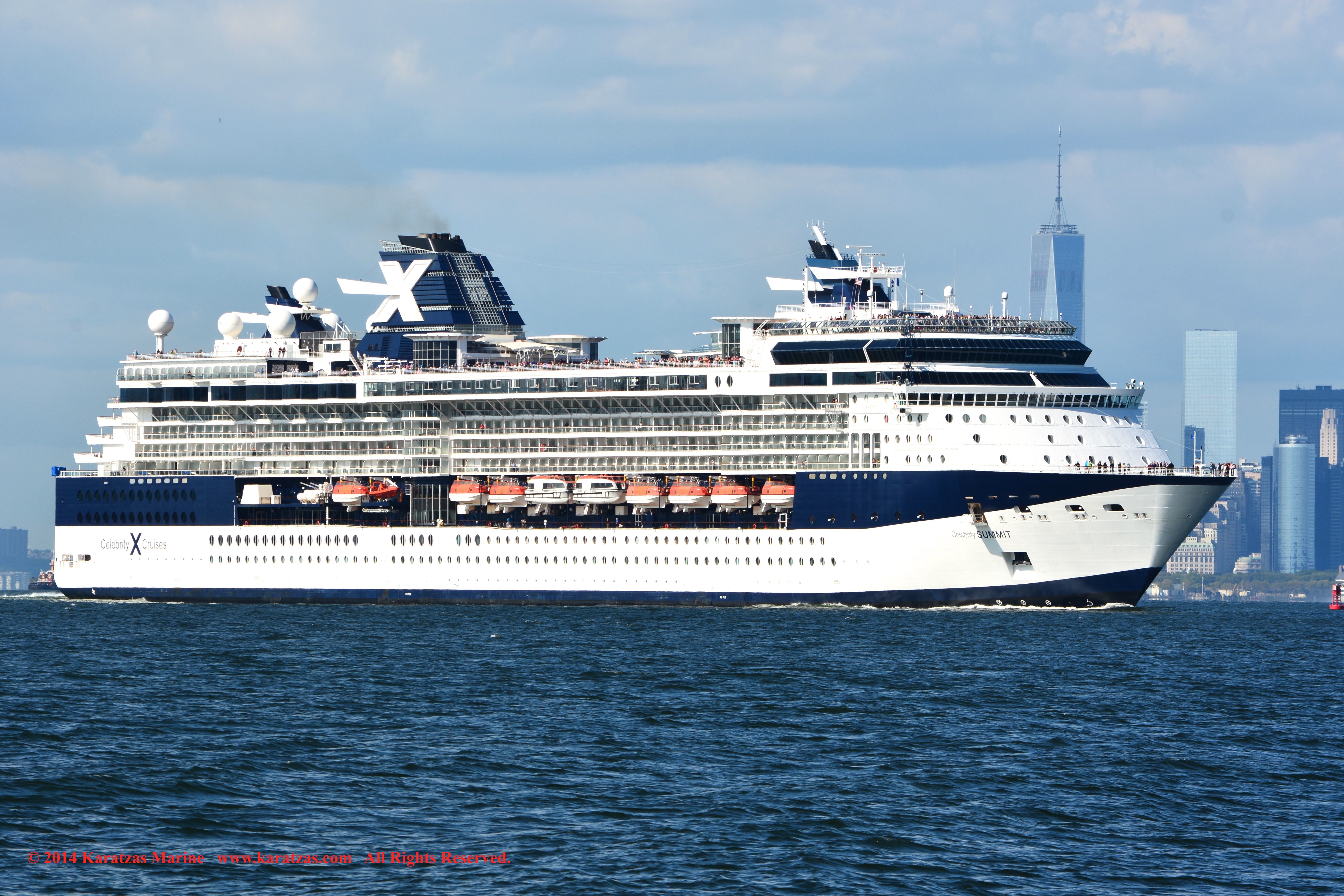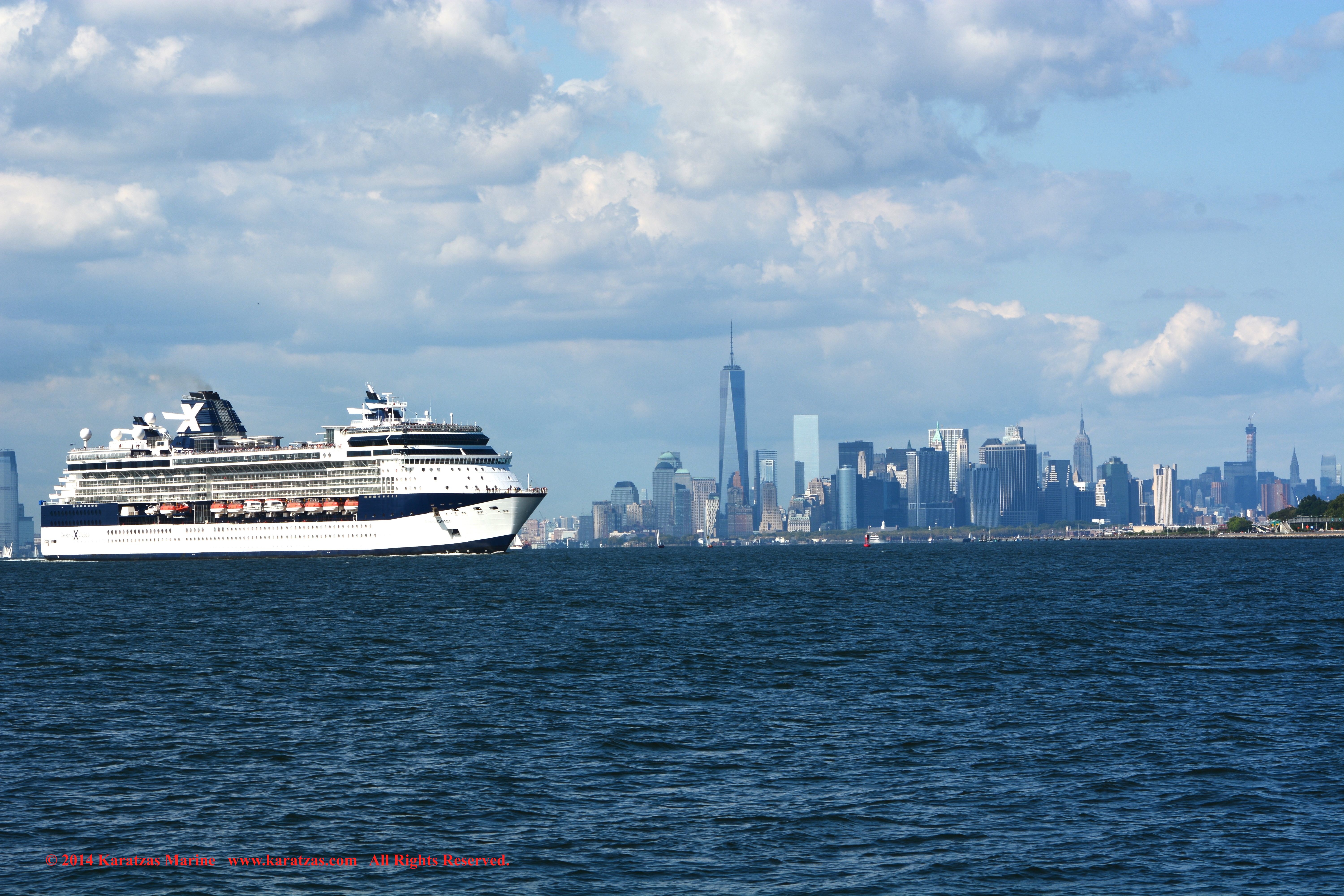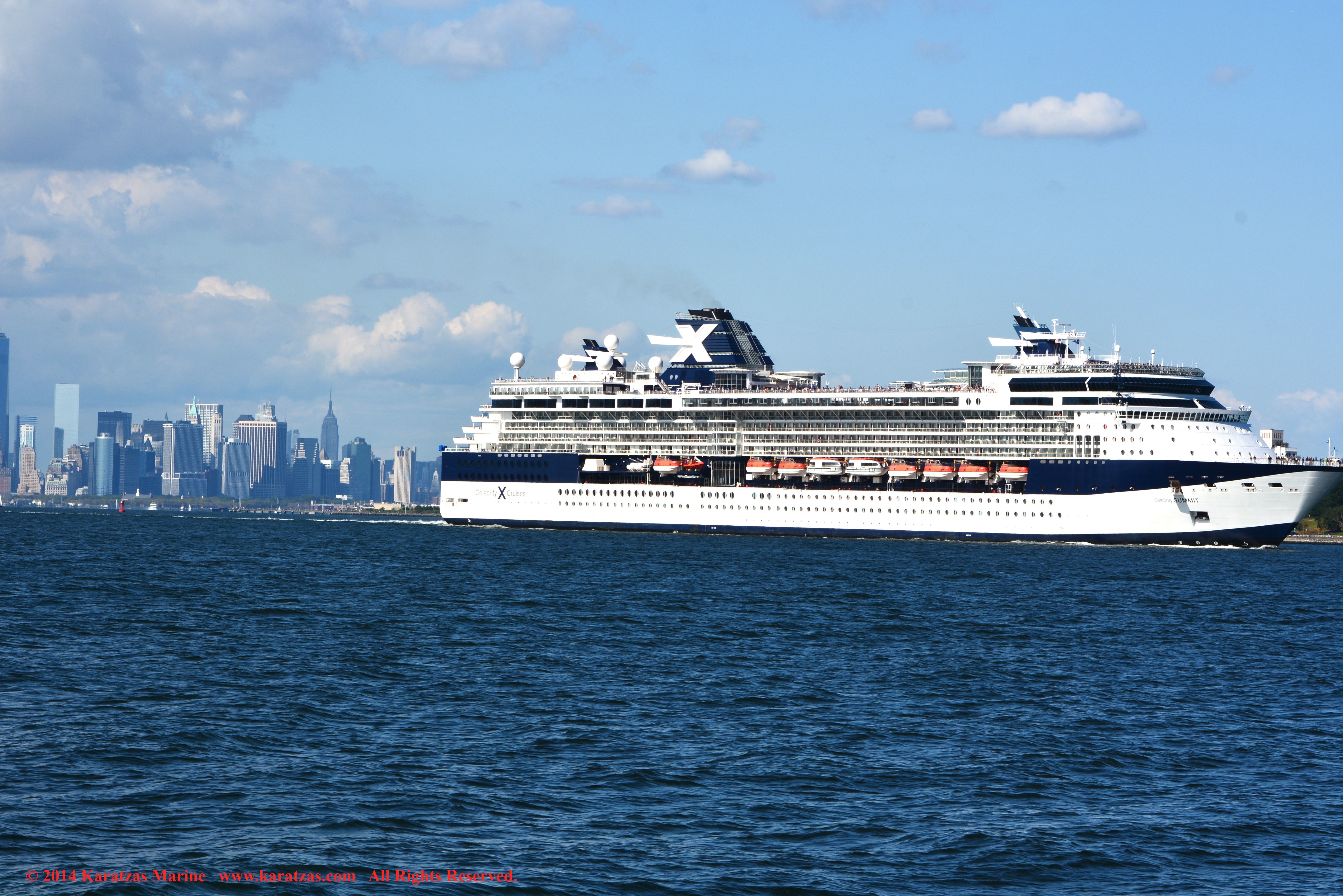 U.S. Flag Containership MV ‘Sea-land Eagle’ (4,000 TEU, built at I.H.I. in 1997) arriving at New York Harbor on summer afternoon. Cruiseship MV ‘Celebrity Summit’ outbound. karatzas.com