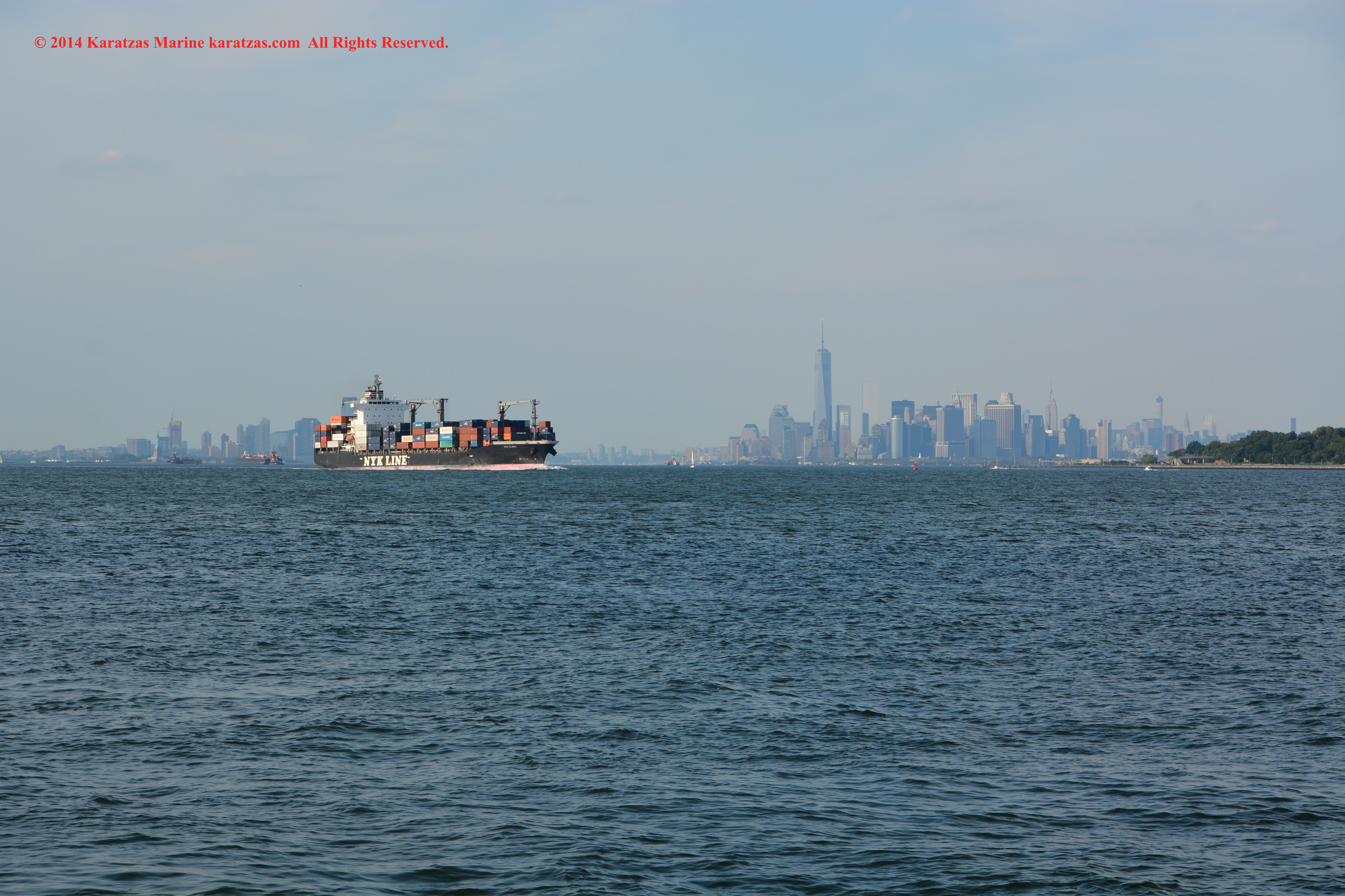 U.S. Flag Containership MV ‘Sea-land Eagle’ (4,000 TEU, built at I.H.I. in 1997) arriving at New York Harbor on summer afternoon. Manhattan skyline background. karatzas.com