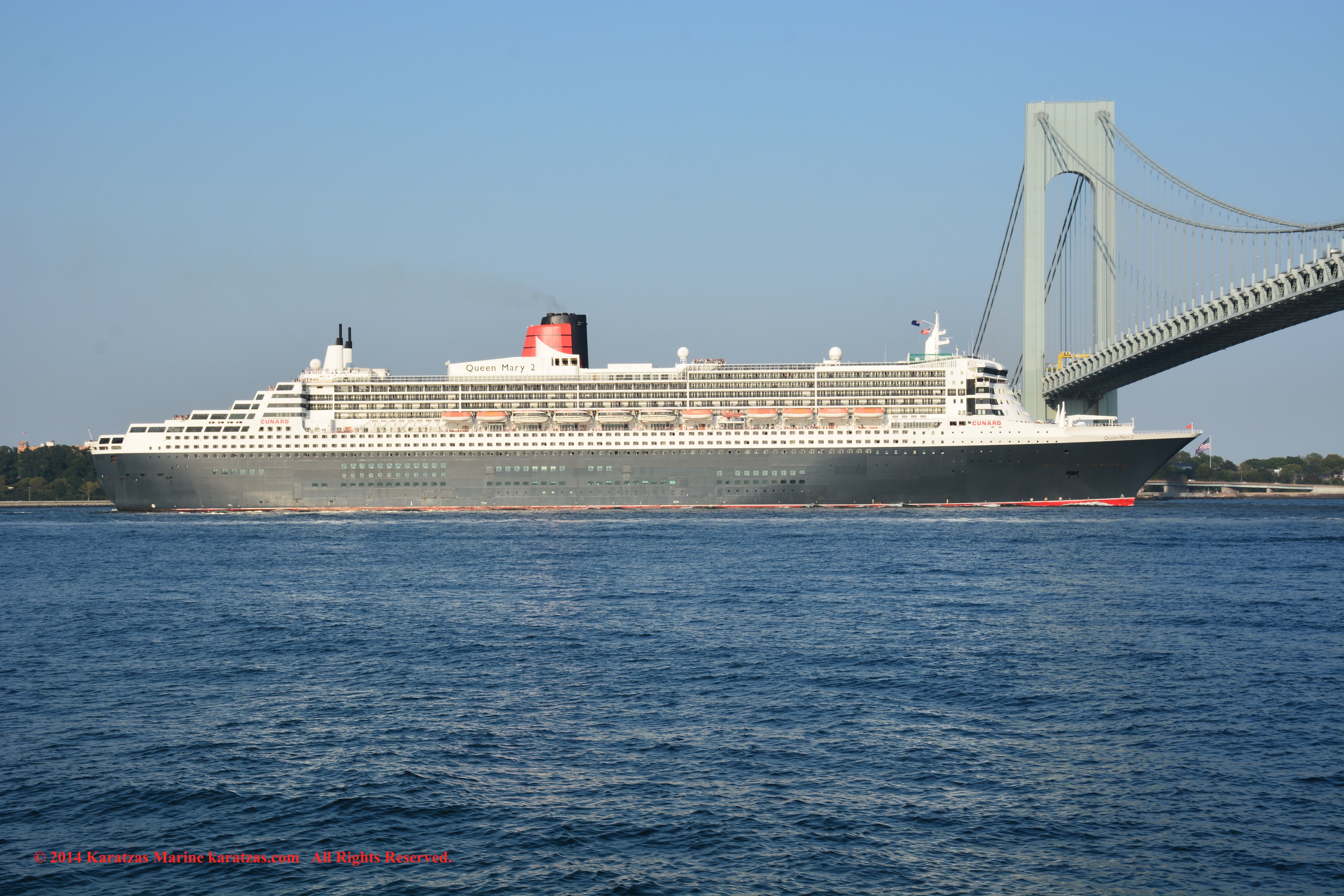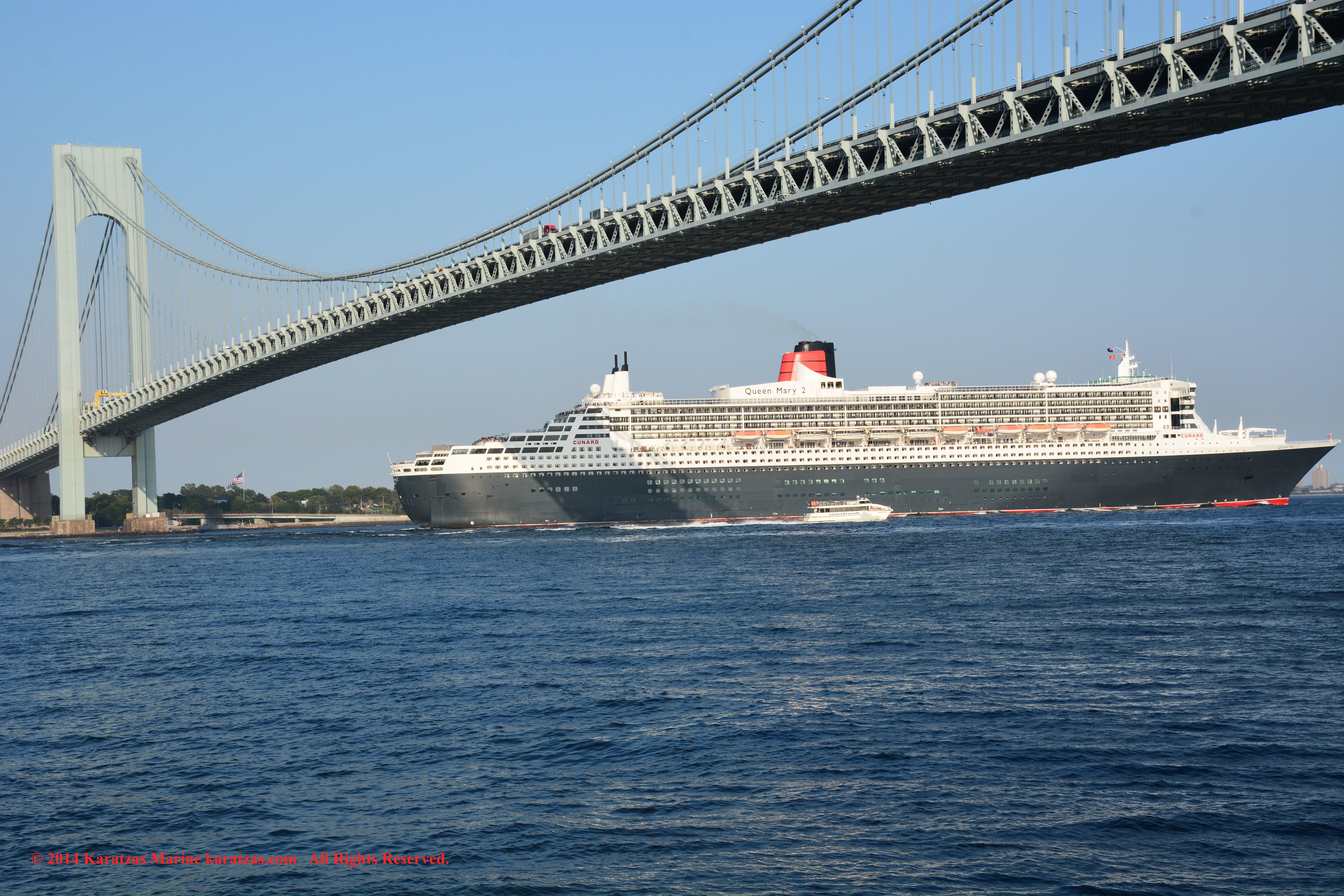 Cunard’s flagship ‘Queen Mary 2’ (QM2), built at Chantiers de l’Atlantique in 2003, departing New York. Passing under the Verrazano-Narrows Bridge. http://www.karatzas.com