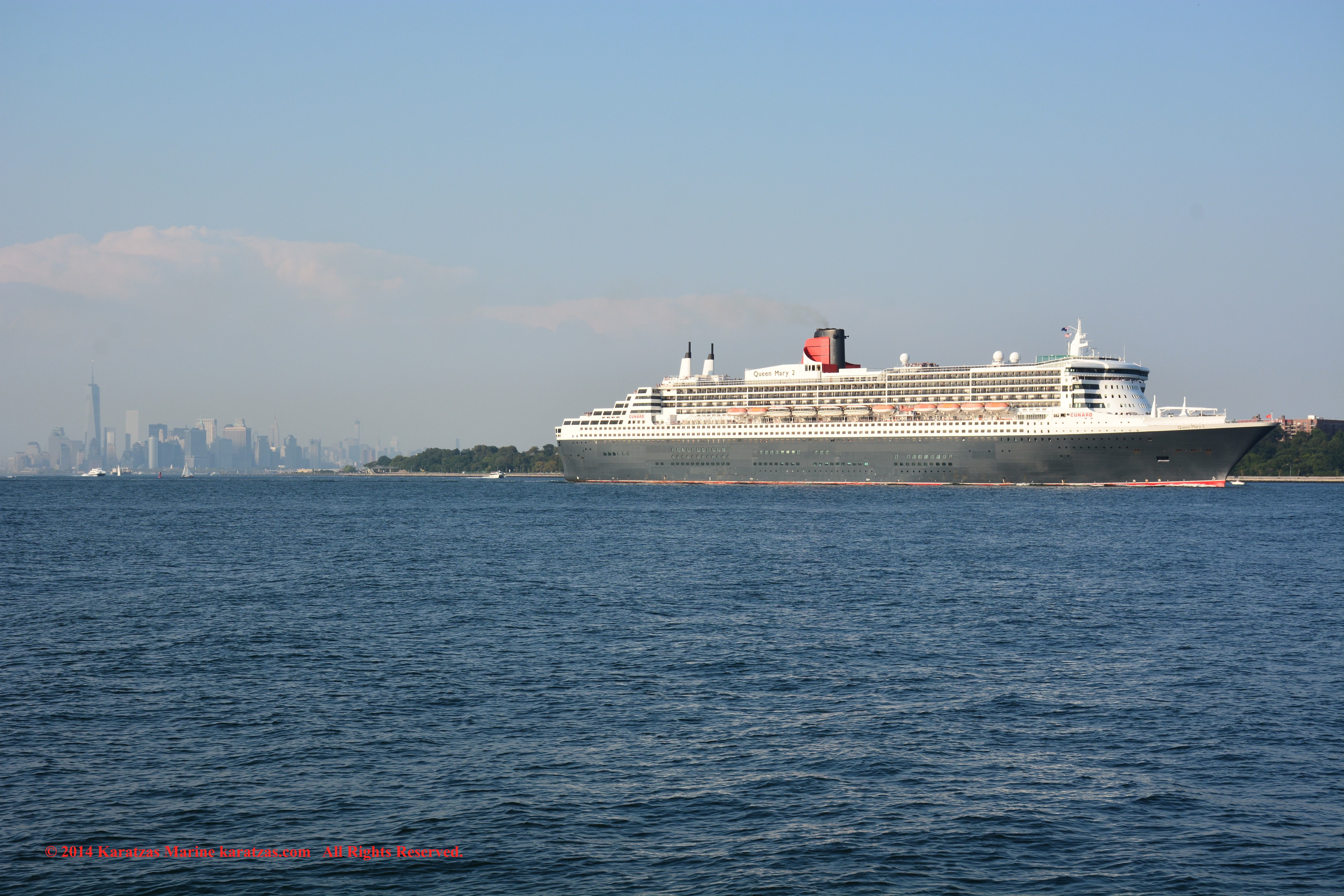 Cunard’s flagship ‘Queen Mary 2’ (QM2), built at Chantiers de l’Atlantique in 2003, leaving behind New York. http://www.karatzas.com