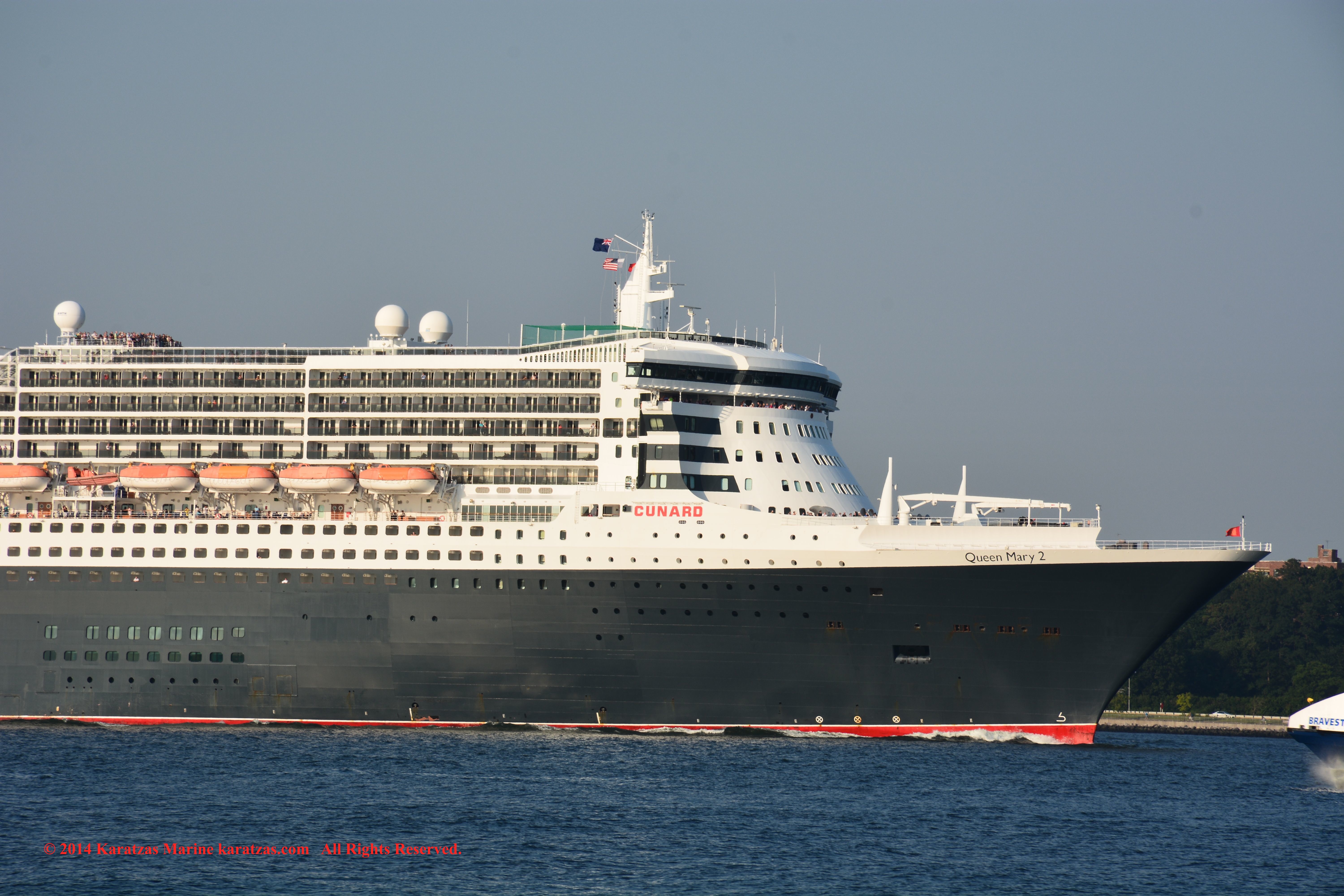 Cunard’s flagship ‘Queen Mary 2’ (QM2), built at Chantiers de l’Atlantique in 2003, departing New York. http://www.karatzas.com