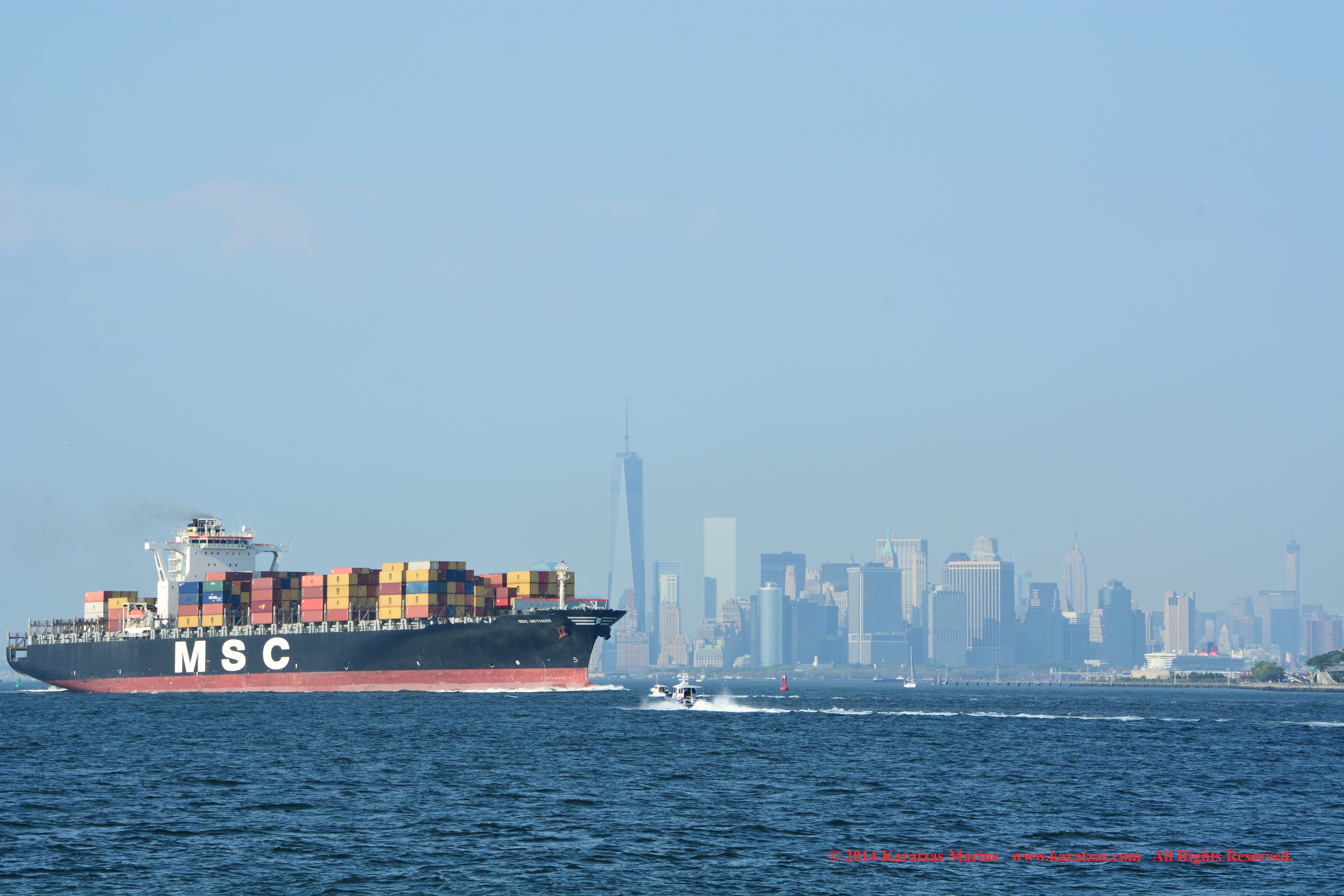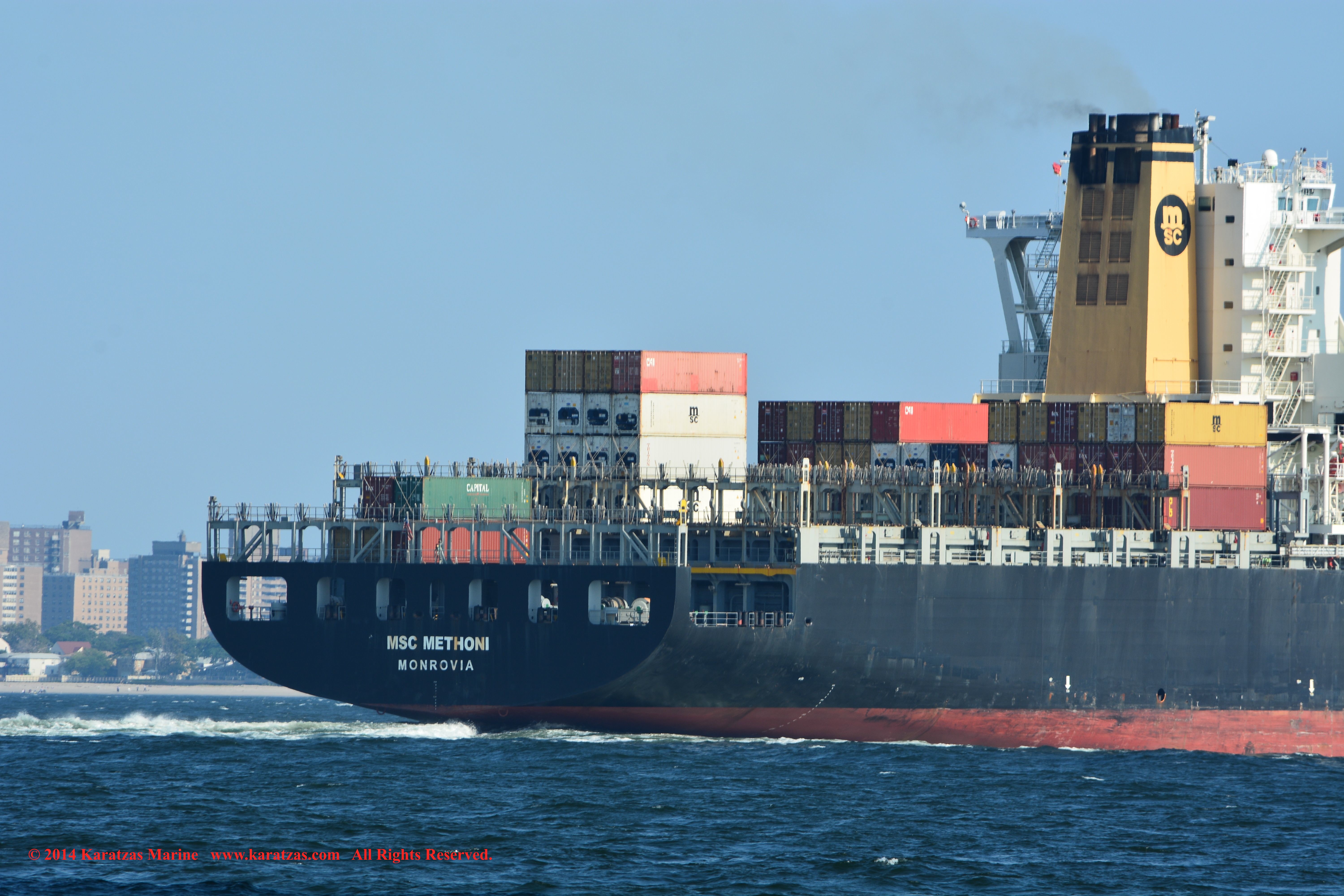 Post-panamax containership ‘MSC Methoni’ (built in Korea and flying Marshall Islands flag) owned by Costamare in Greece and on charter to MSC in Switzerland and headquartered in France departing New York Harbor. http://www.karatzas.com