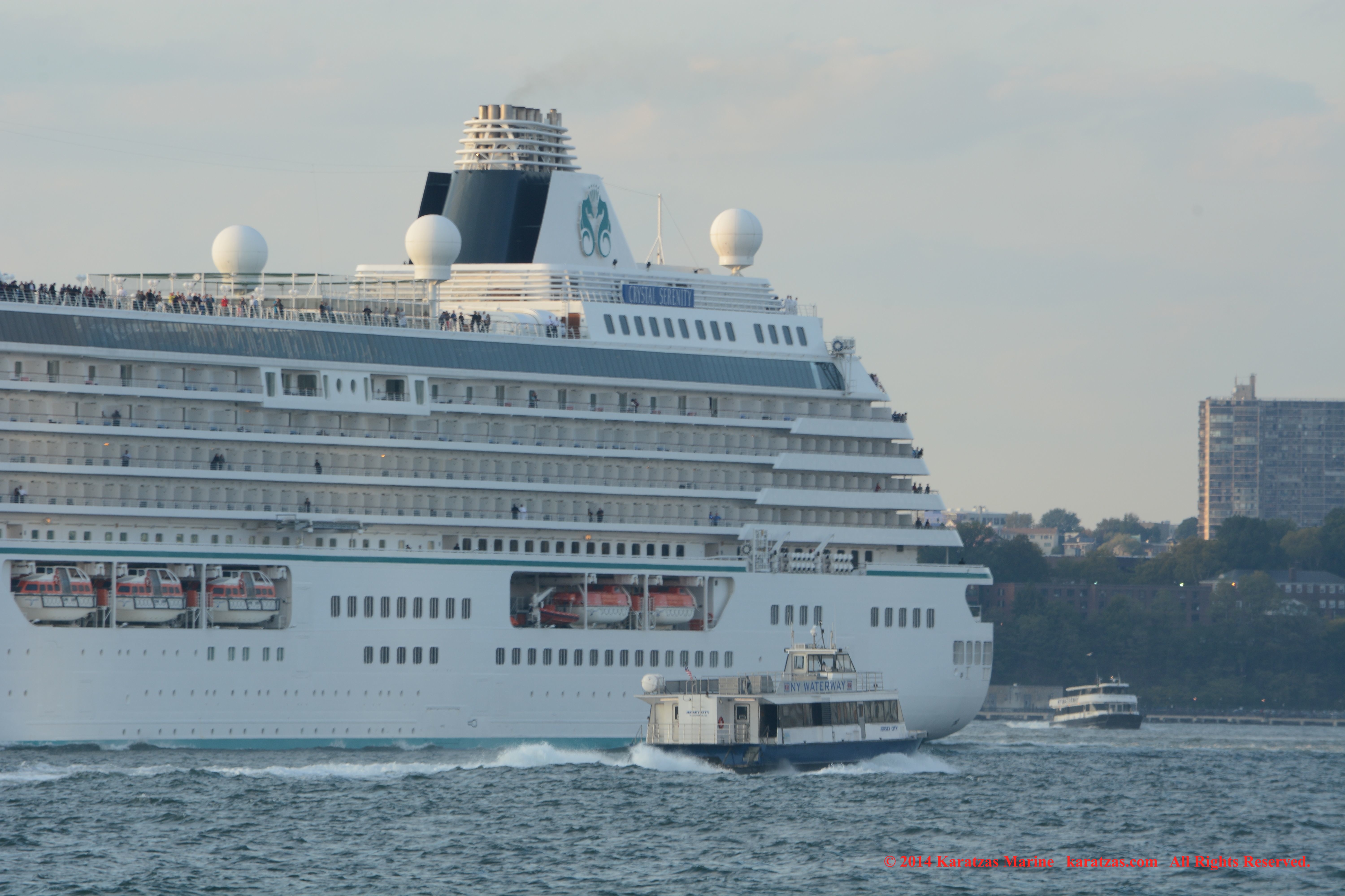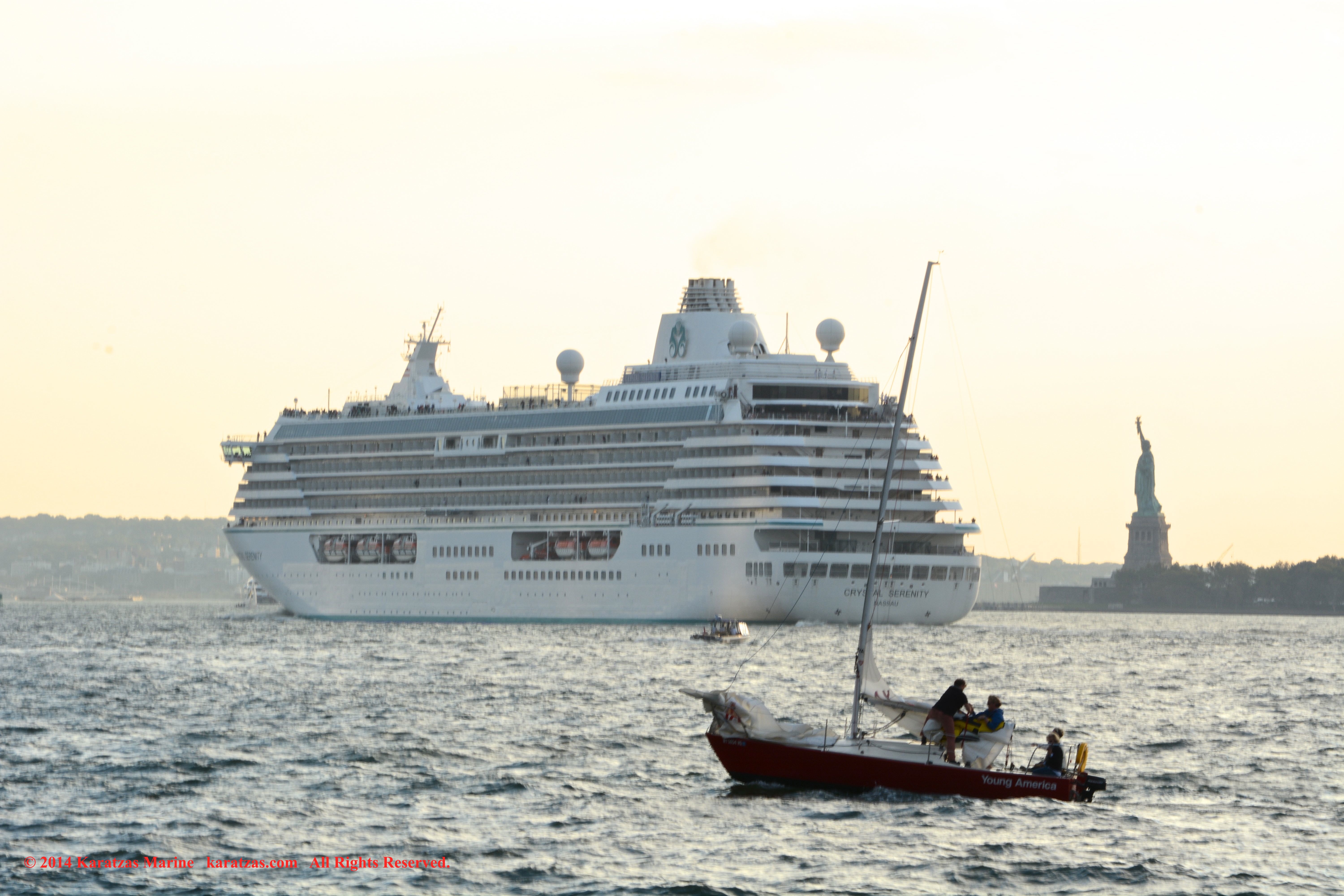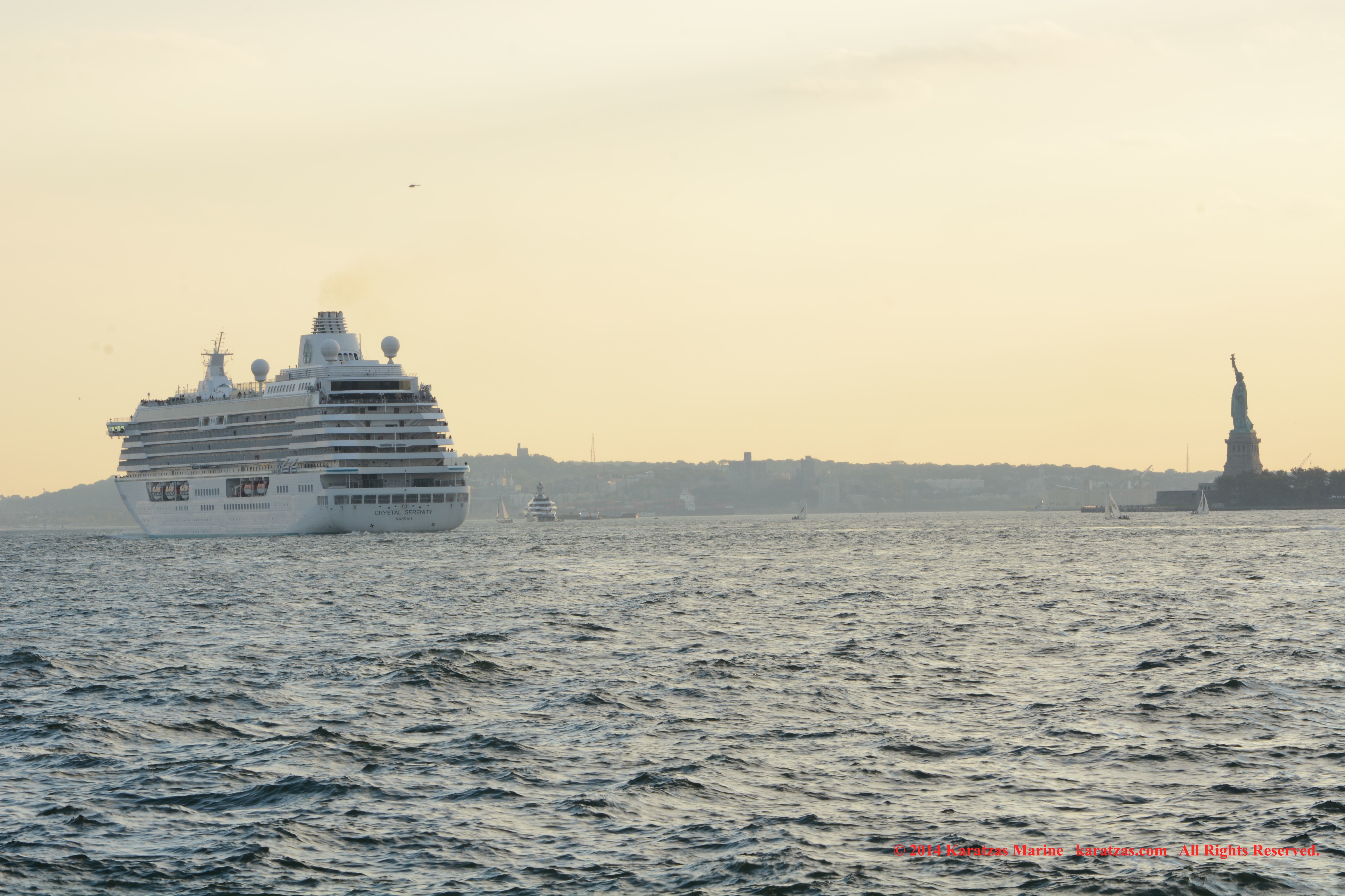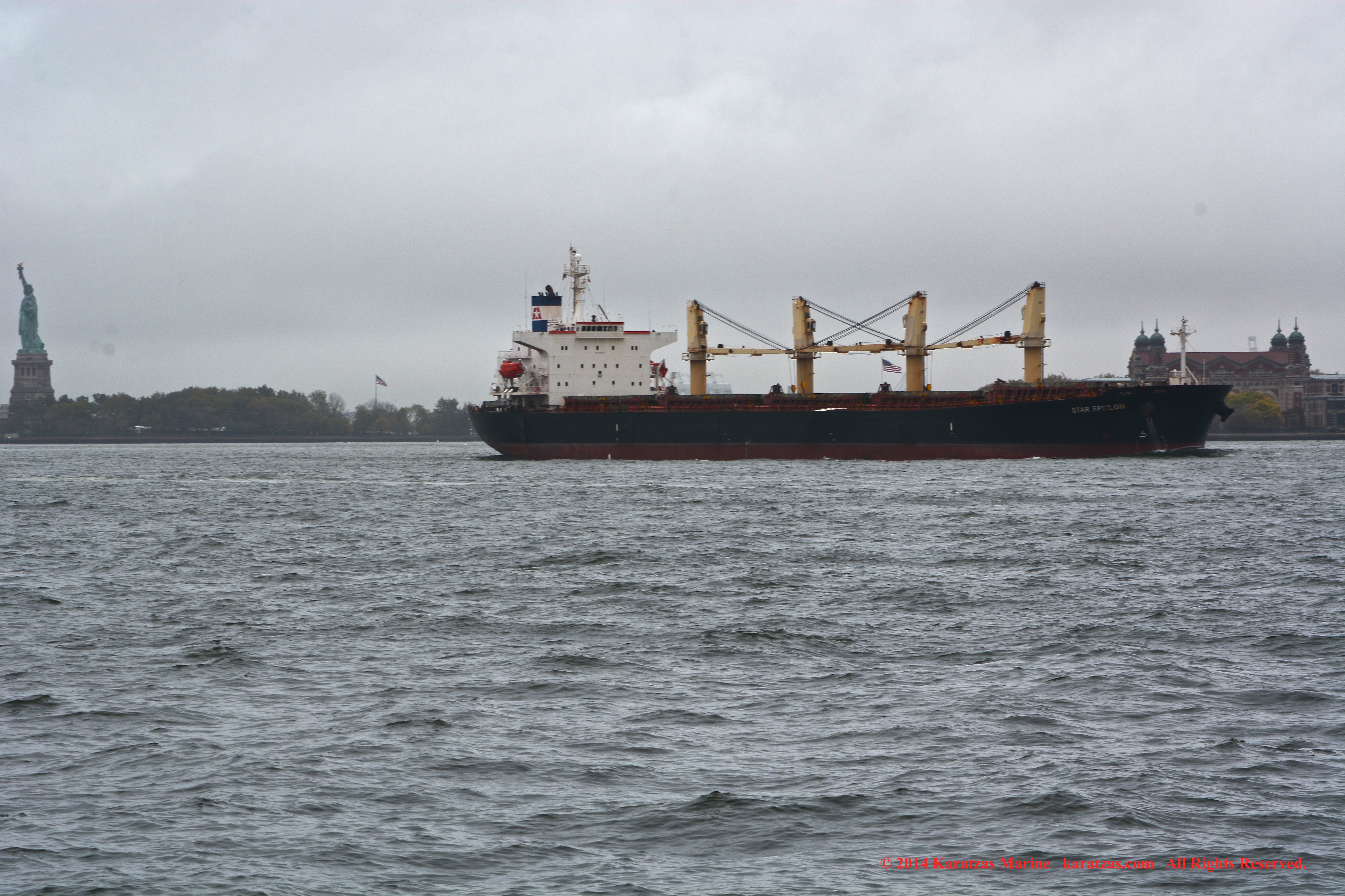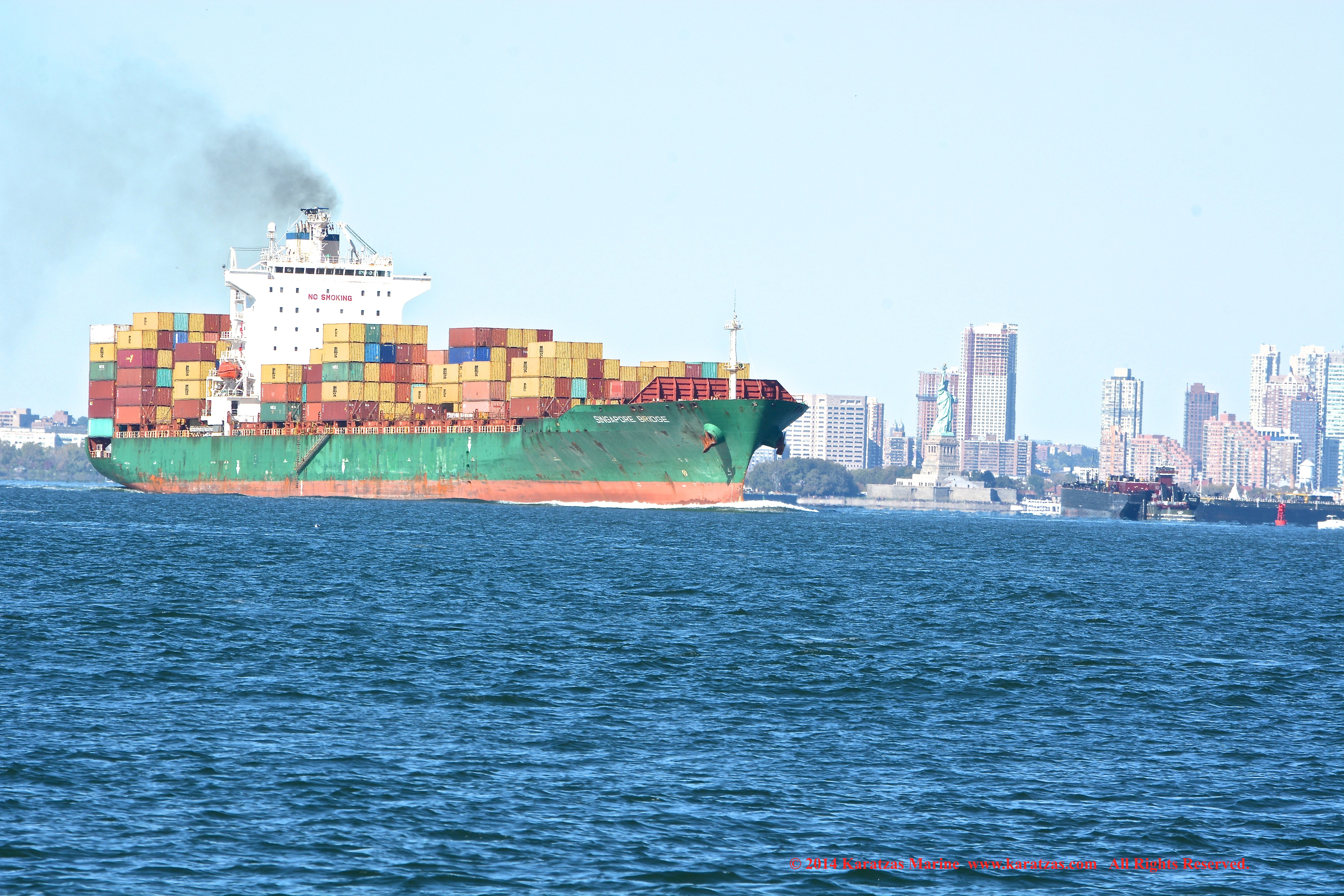 Gearless, sub-panamax containership ‘Singapore Bridge’ (4,200-teu, built in 2002 at Samsung Heavy) departing New York Harbor; passing Statue of Liberty. http://www.karatzas.com