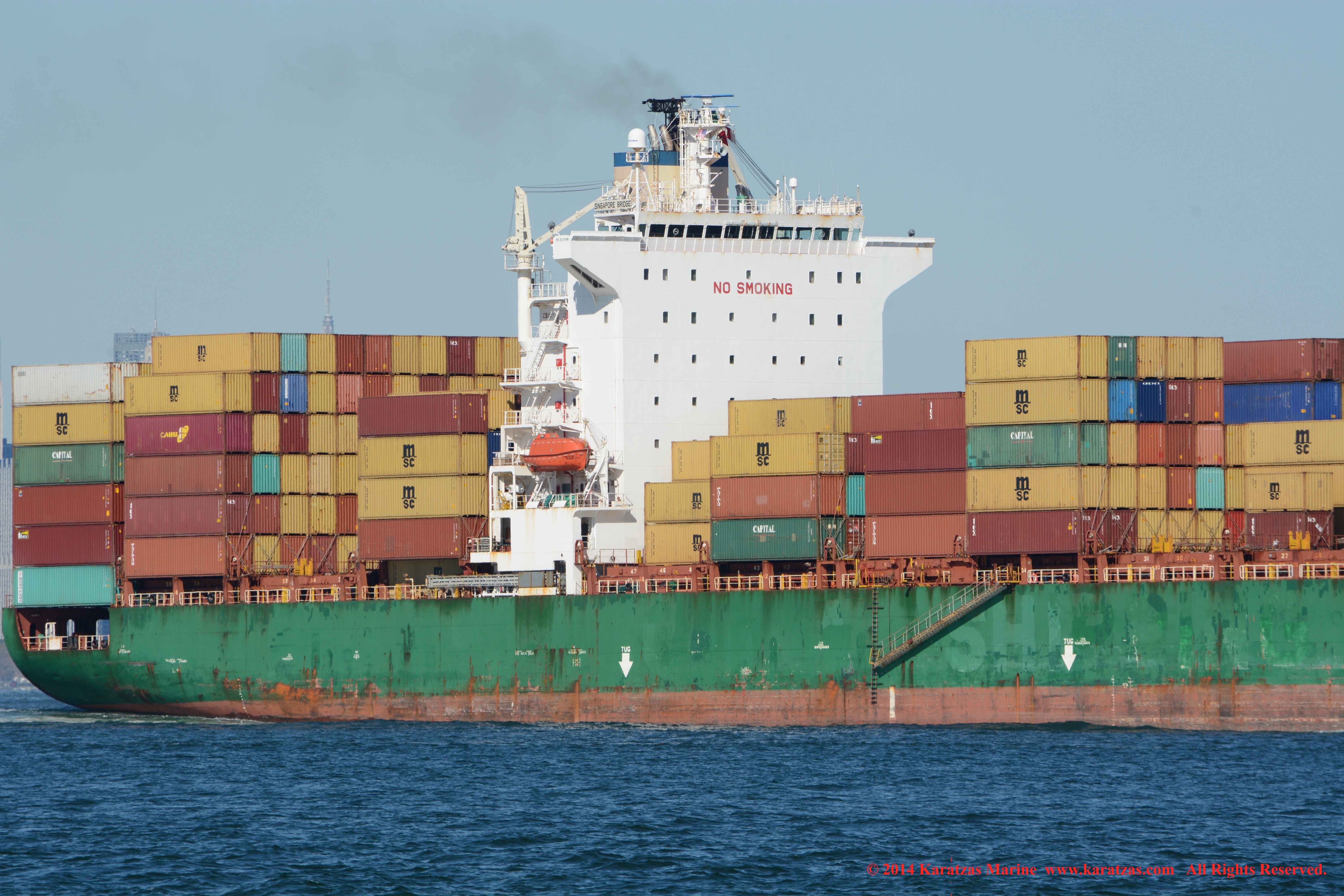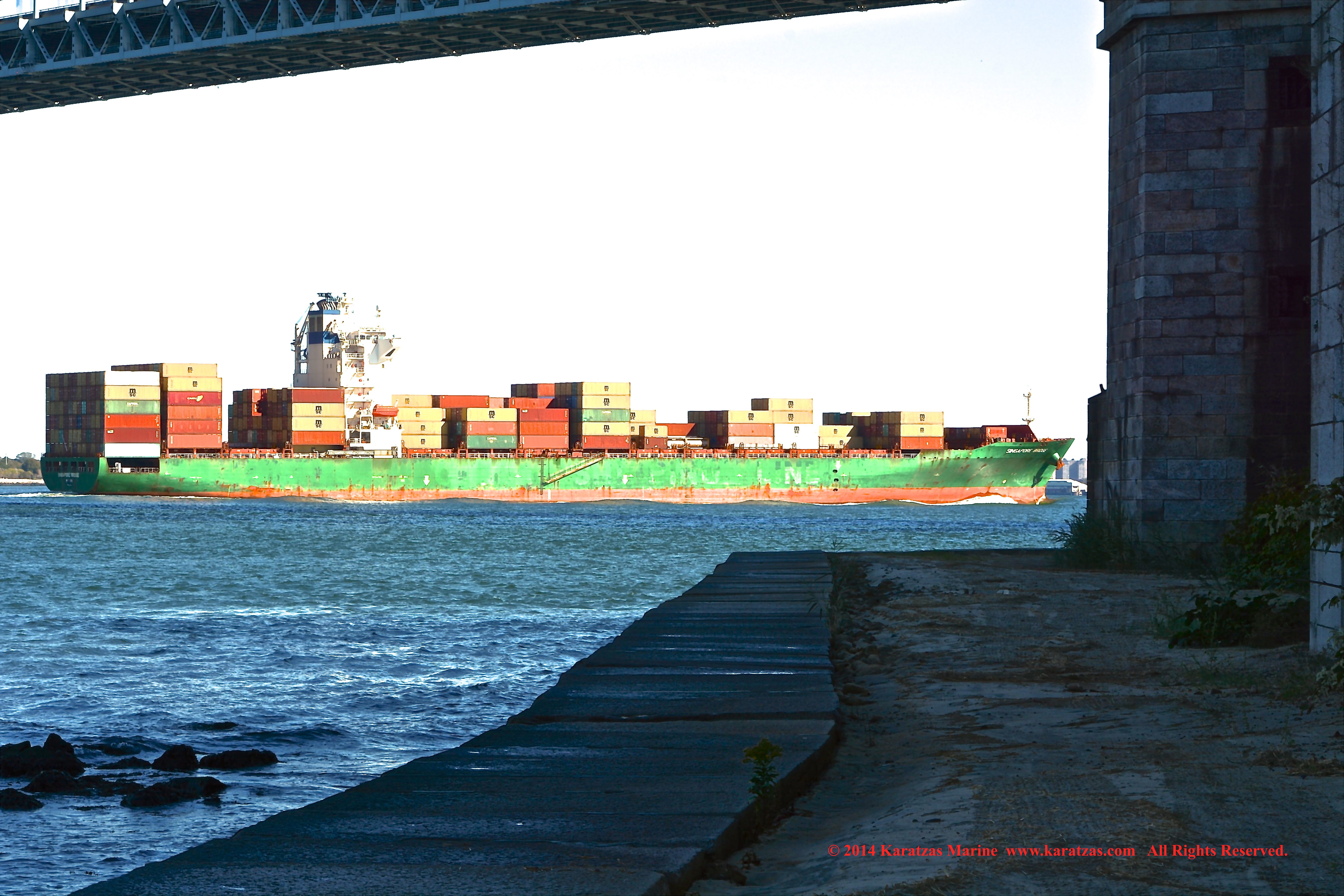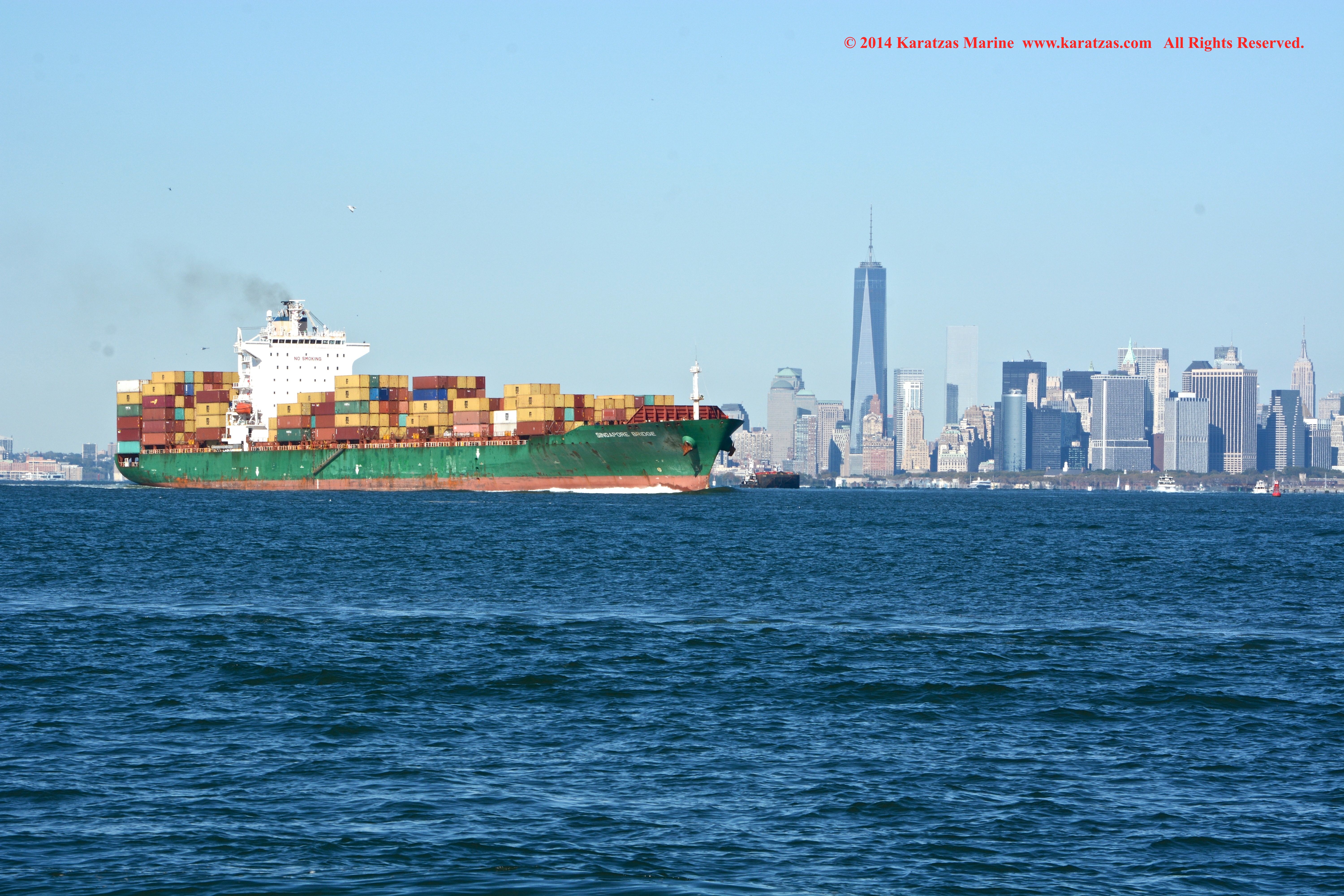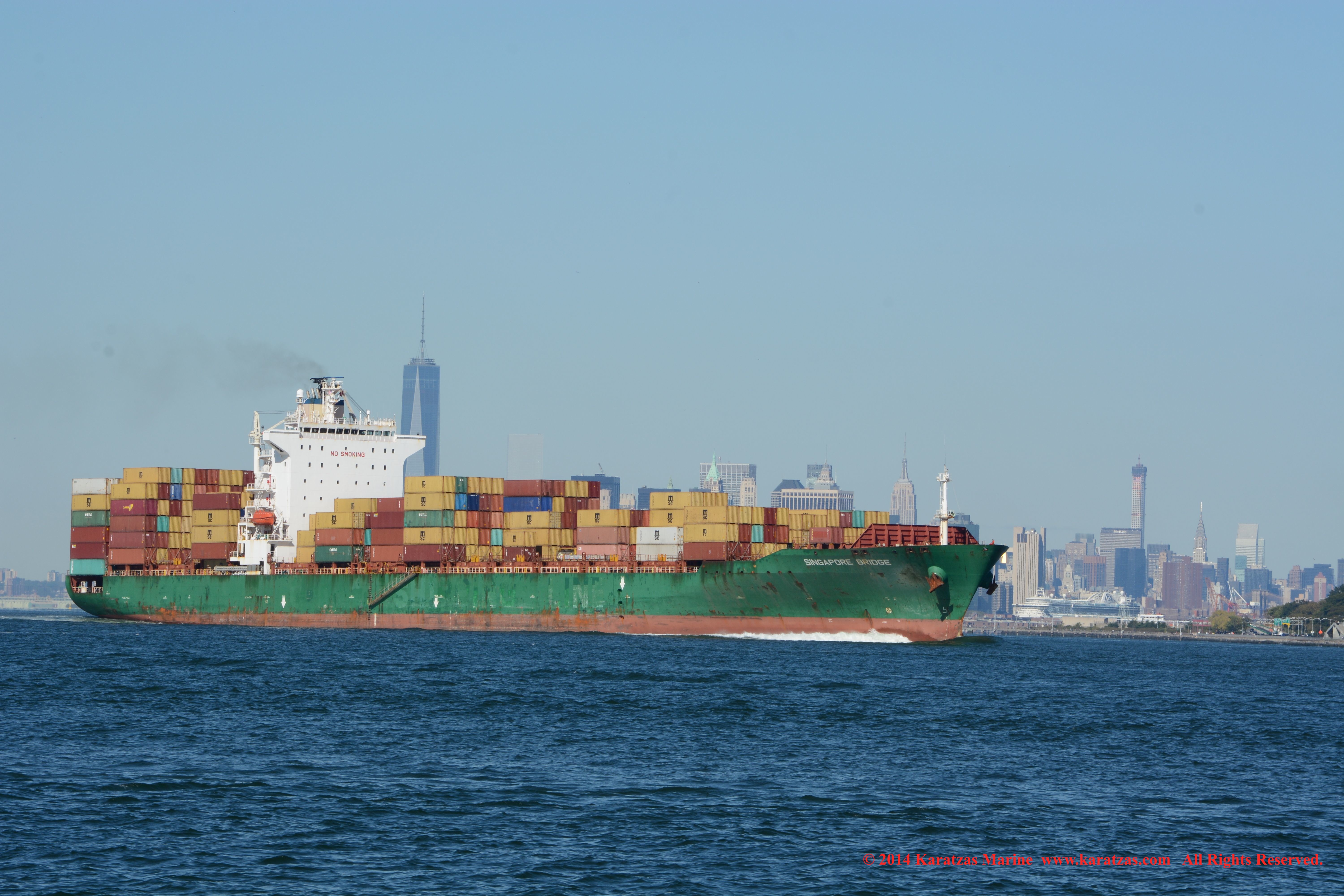 Gearless, sub-panamax containership ‘Singapore Bridge’ (4,200-teu, built in 2002 at Samsung Heavy) departing New York Harbor. http://www.karatzas.com