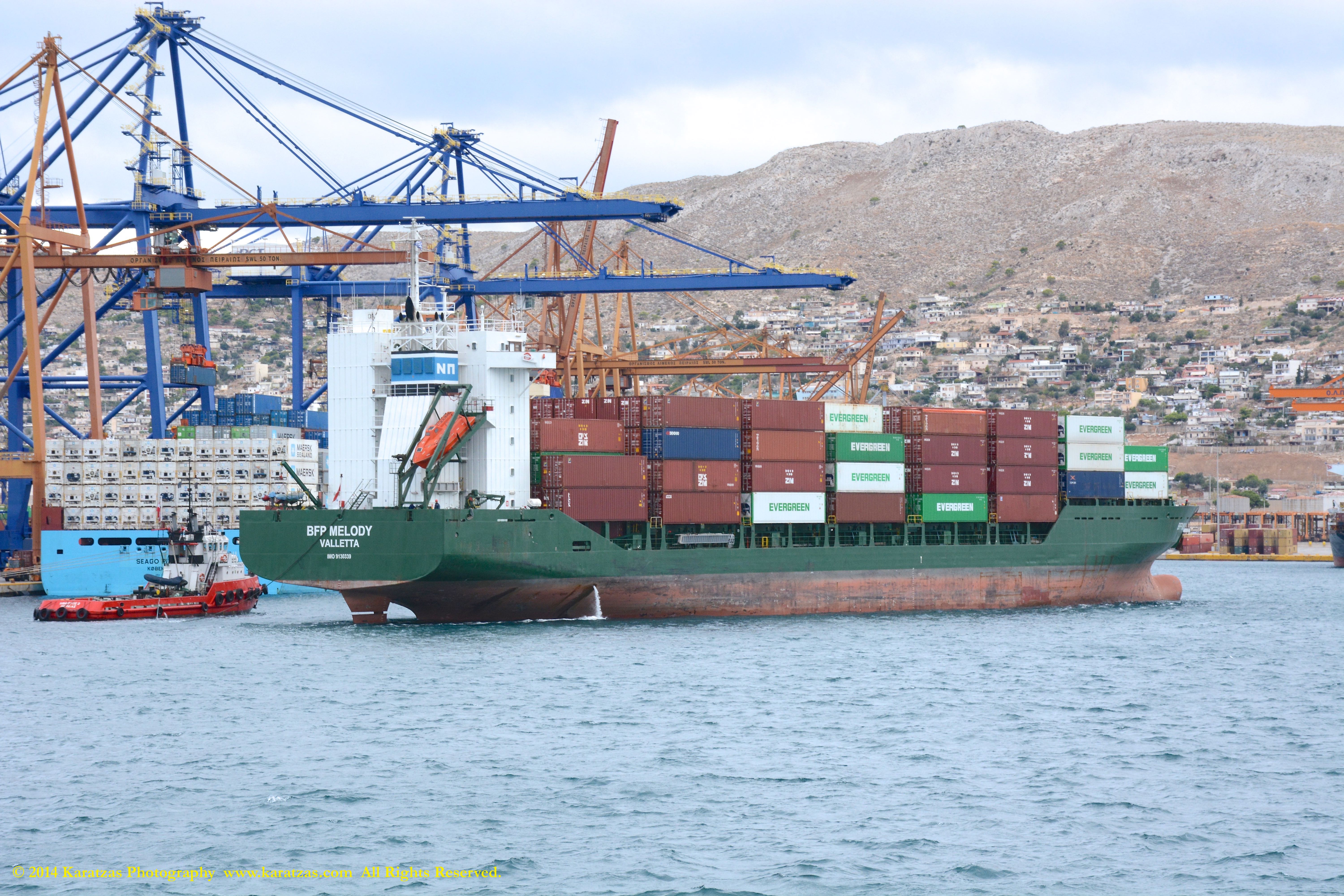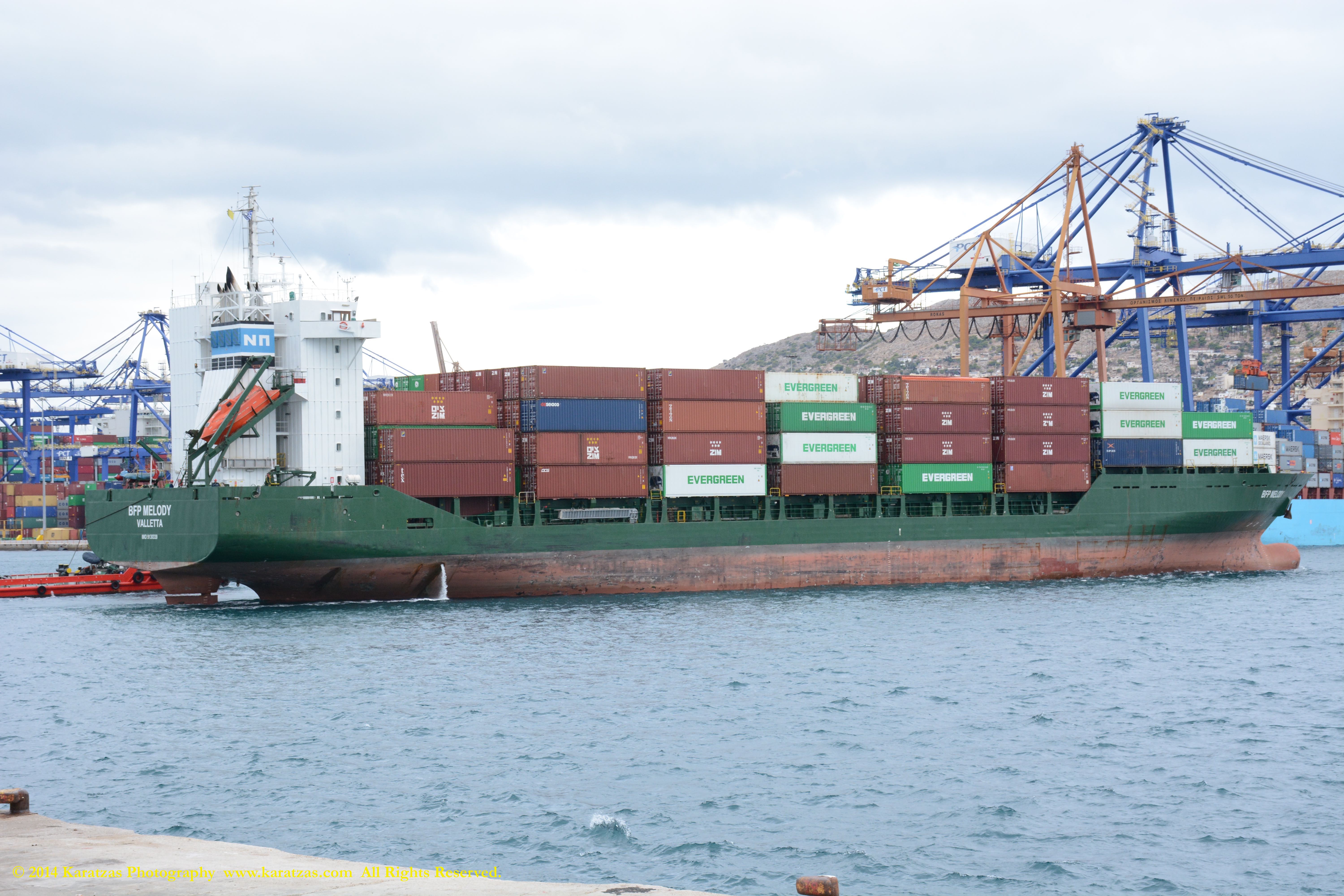 Feedermax Containership ‘BFP Melody’ (980-TEU, built in 1998 at Astillero Barreras, Spain) maneuvering into position in Port of Piraeus. http://www.karatzas.com