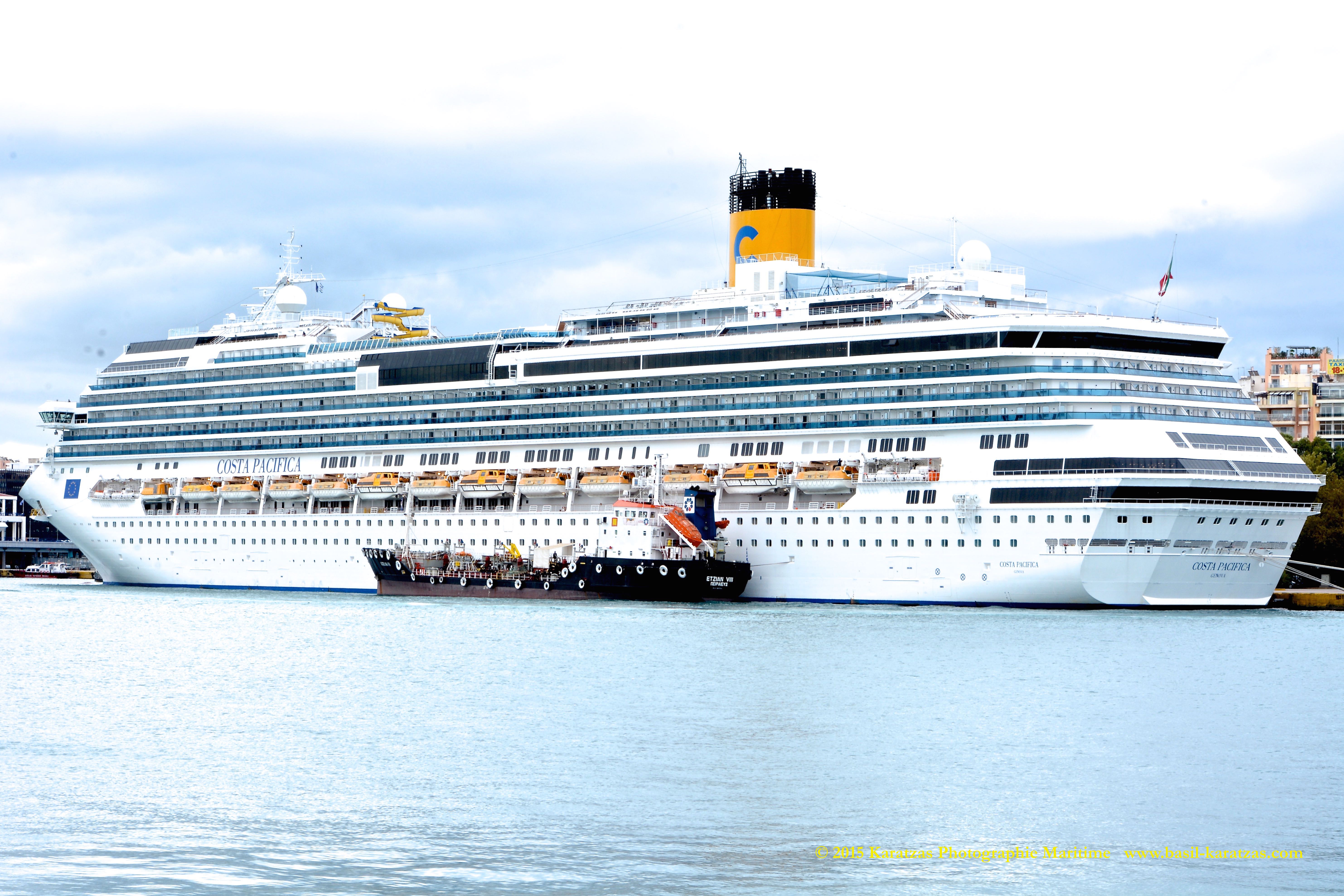 IDENTIFICATION: Launch Name was Costa Pacifica. Call Sign ICJA, IMO Number 9378498. Built at Fincantieri Sestri, Italy Flagged, RINA Classed, Length Overall of 290.00 m., Length Between Perpendiculars of 247.40 m., Draught of 8.00 m., Beam of 42.00 m., Gross Tonnage of 114,141, Moulded Depth of 14.18 m., Tonnage of 87,300 International Net and 9,842 Dwt (long). ENGINE DETAILS: Engine Description 4 S.A. 12-cyl., Engine Model 12V46C, Wartsila Engine, Speed of 21.50 kts, Heavy Fuel Oil. 4 Bow Thruster(s), 2 Stern Thruster(s).