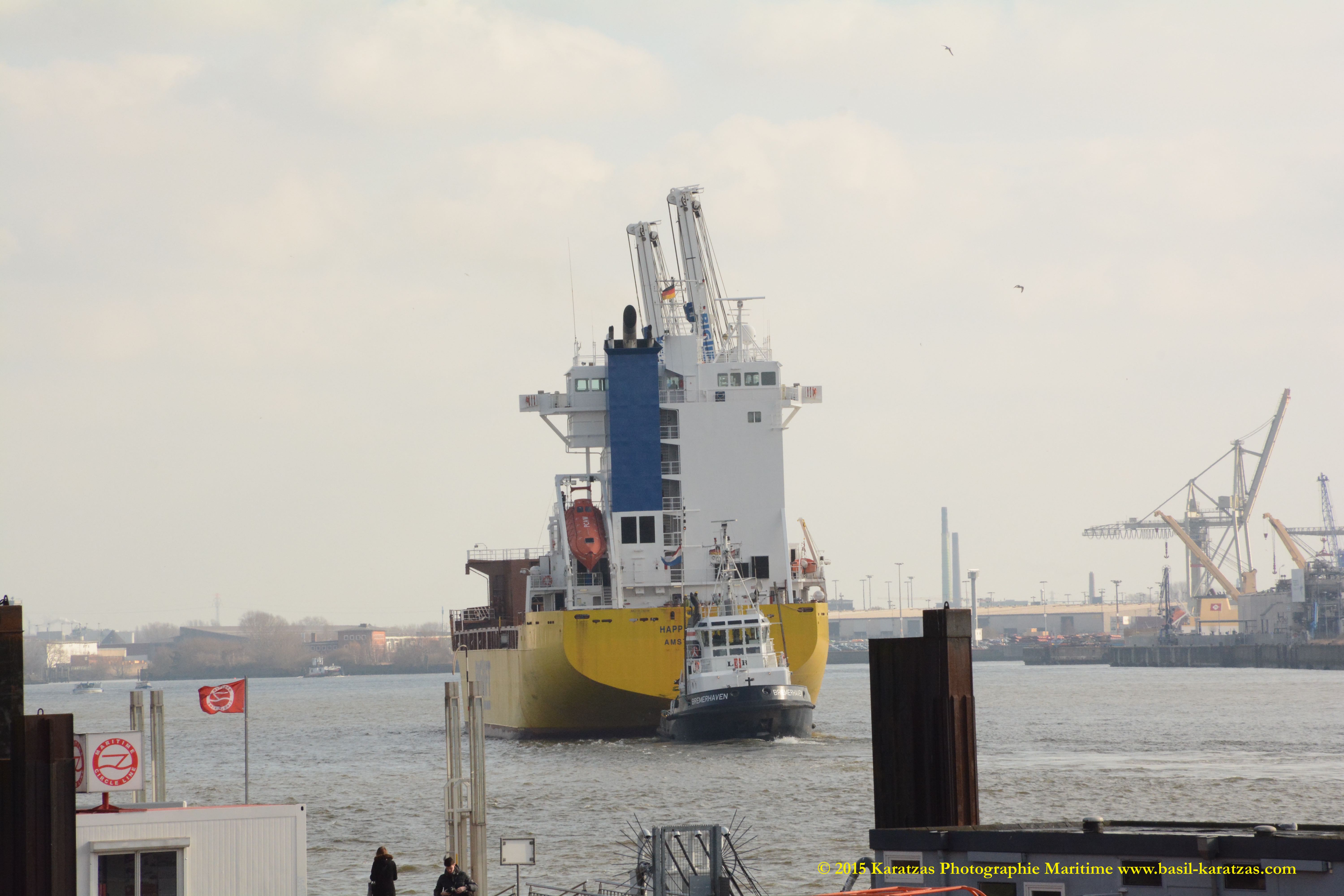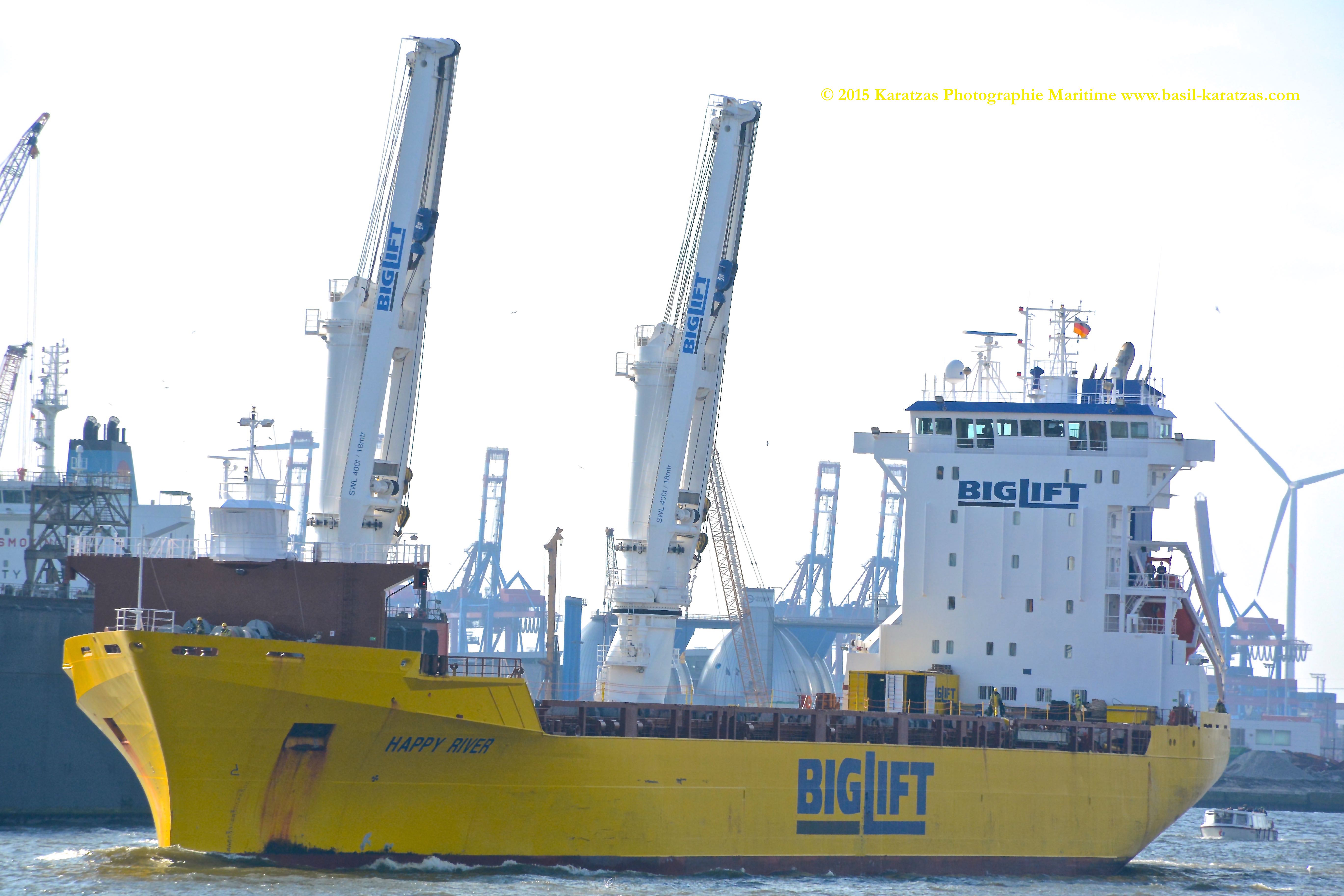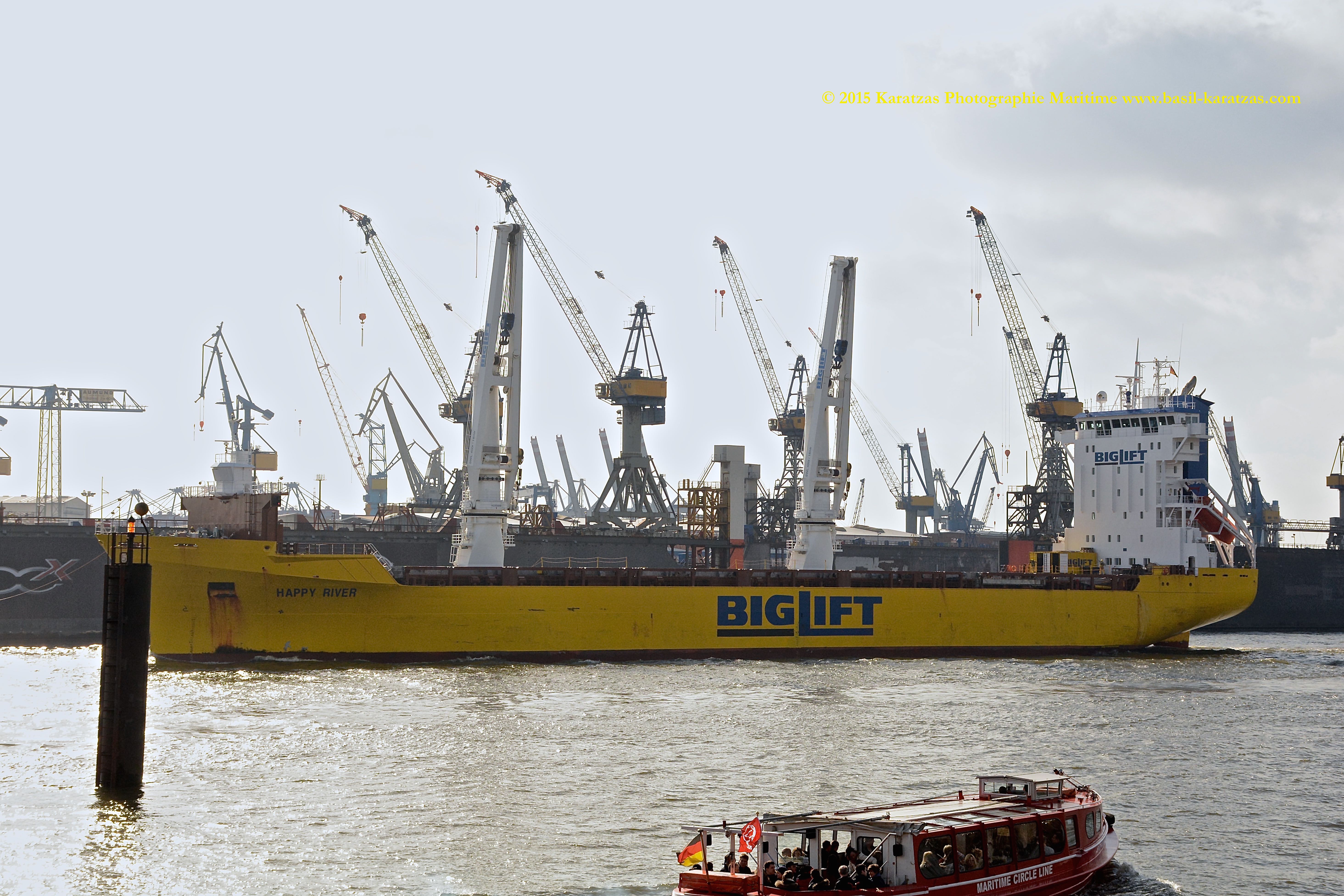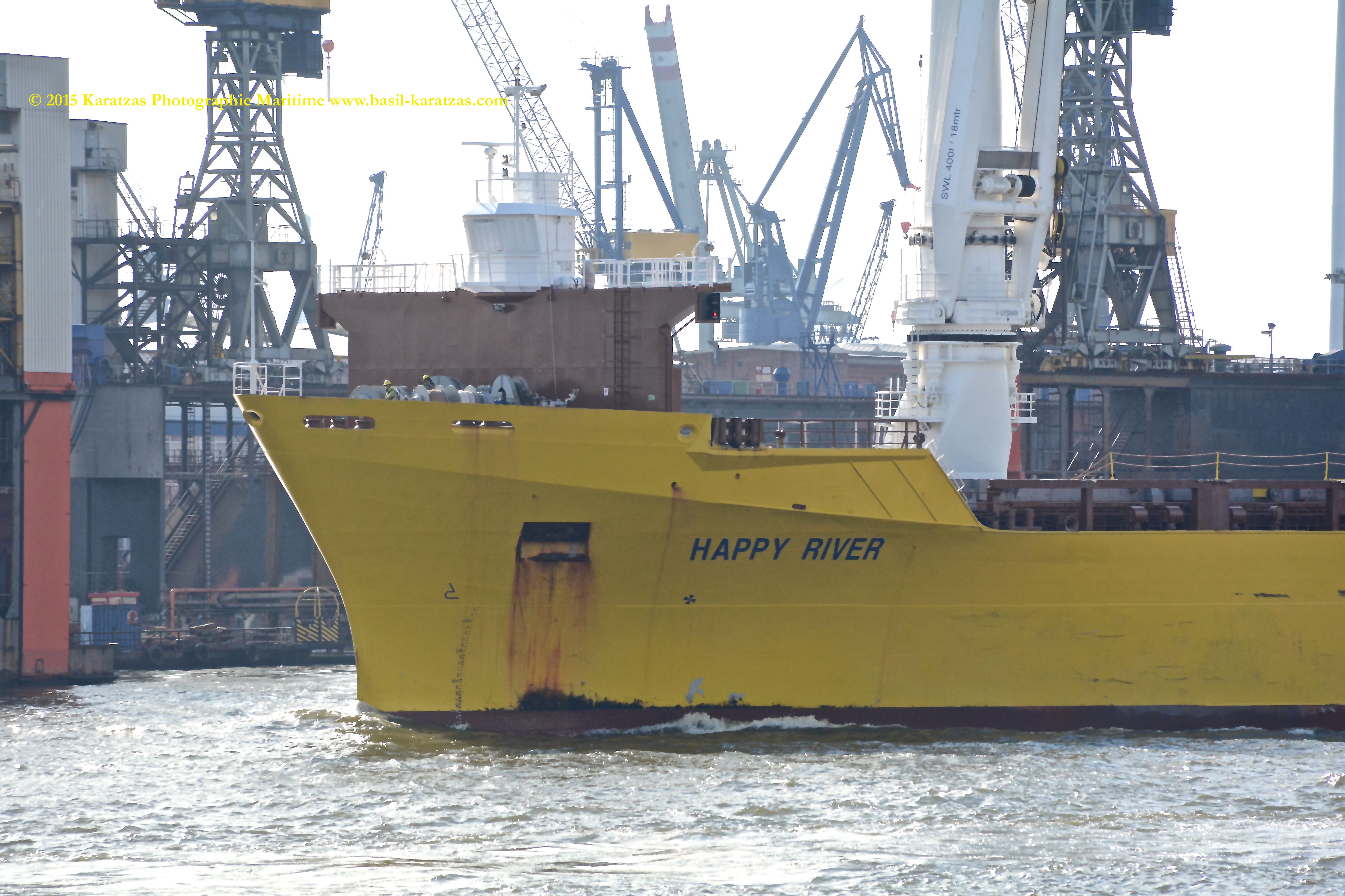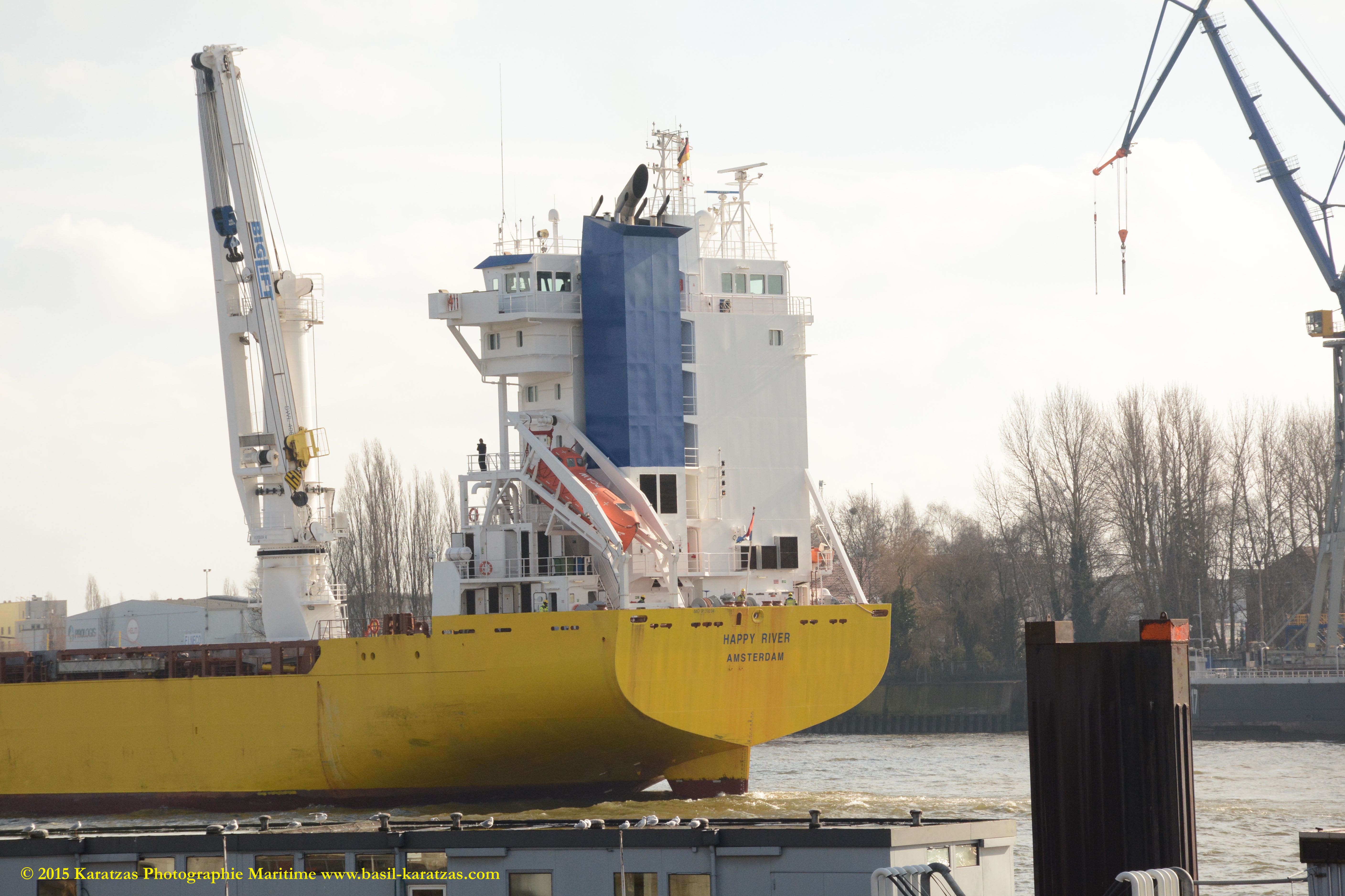 Brightly painted heavylift vessel MV ‘Happy River’ (16,000 dwt, 2x400T cranes, 1997, built at De Merwede, The Netherlands) calling the Port of Hamburg in March 2015. http://www.karatzas.com