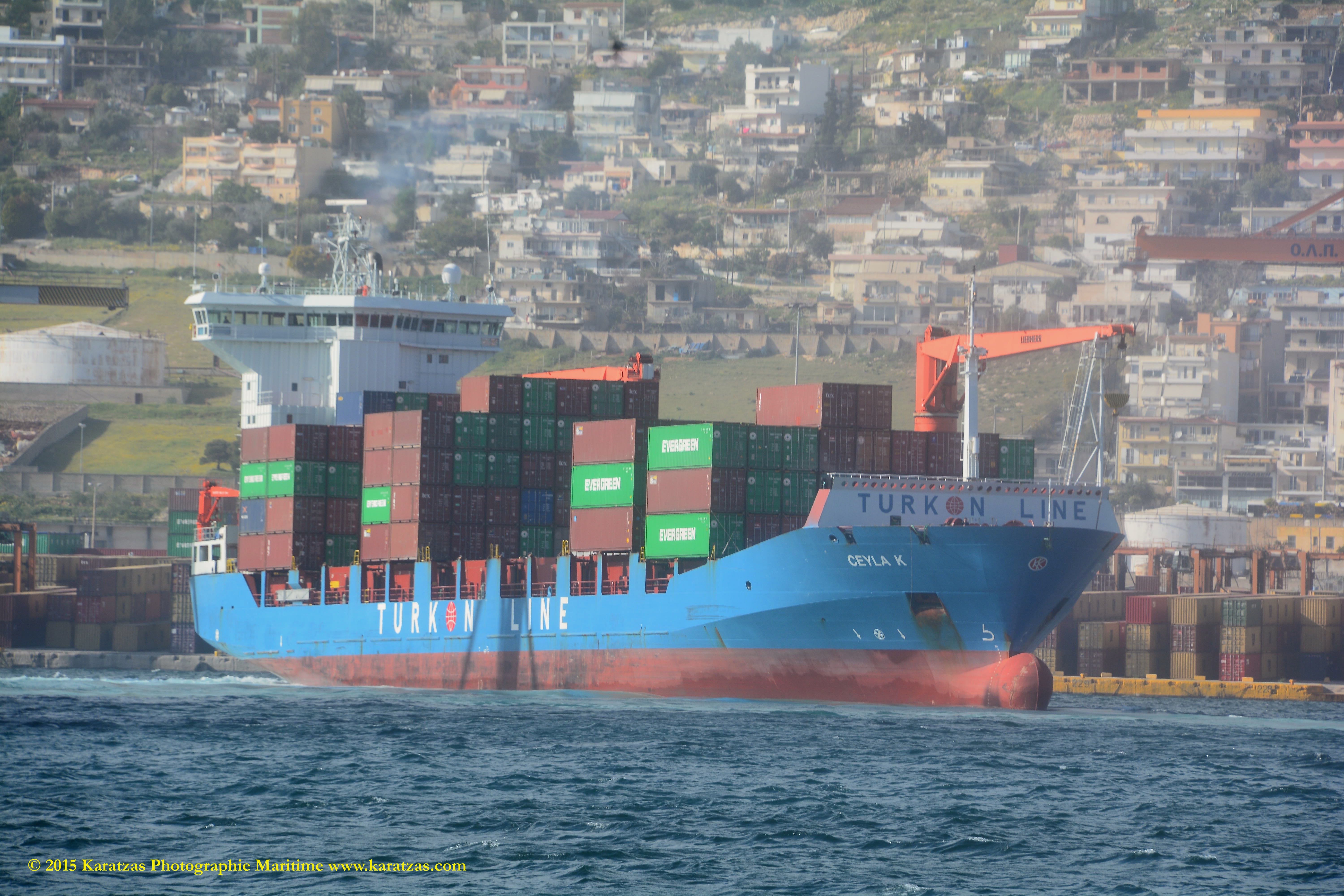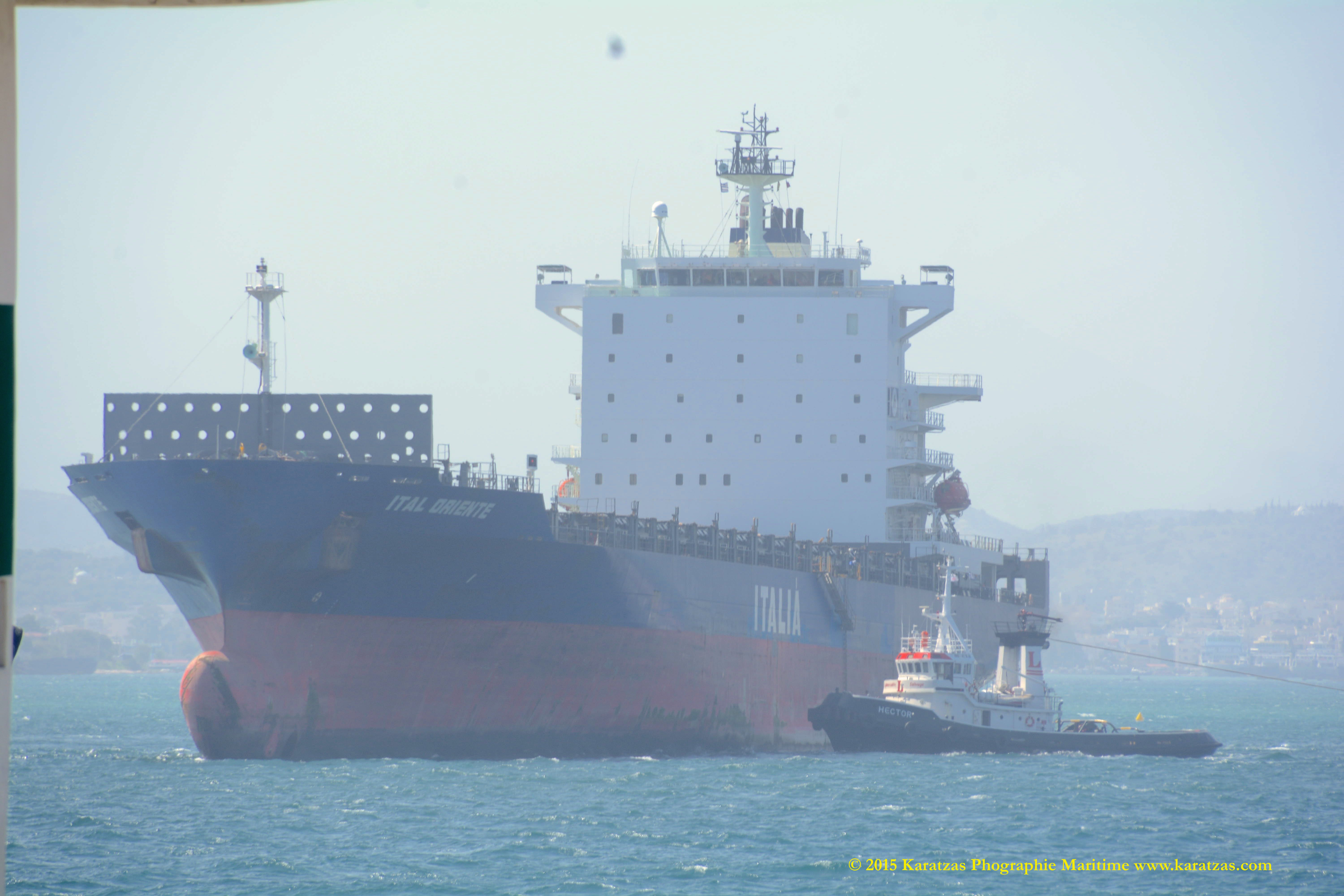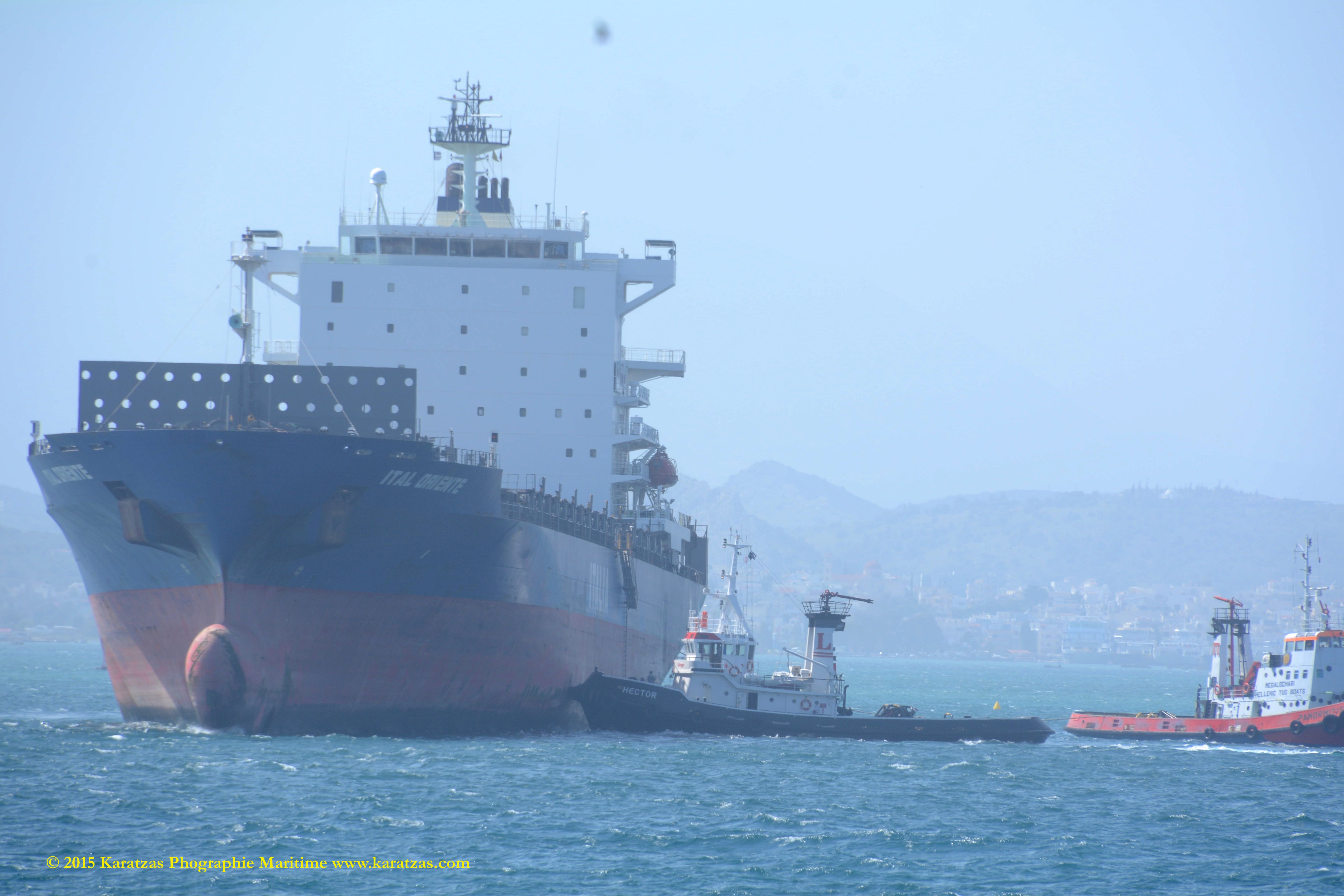 Built at Hyundai Mipo in 2007, ca 2,800-teu gearless containership MV ‘ITAL ORIENTE’ (owned by Hartmann Schiffahrts G.m.b.H. & Co. K.G., and operated by Italia Marittima SpA.) departing Port of Piraeus in April 2015. Karatzas Photographie Maritime.
