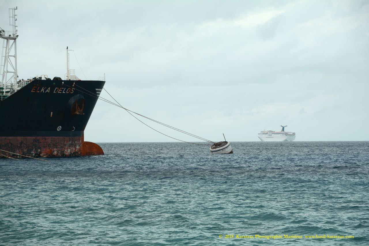 Built in 2005 at Brodosplit, Croatia, Products / Chemical Tanker MT ‘Elka Delos’ discharging jet fuel at George Town, Grand Cayman, in May 2015. Cruiseship ‘Carnival Paradise’ (background) departing Grand Cayman. Karatzas Photographie Maritime