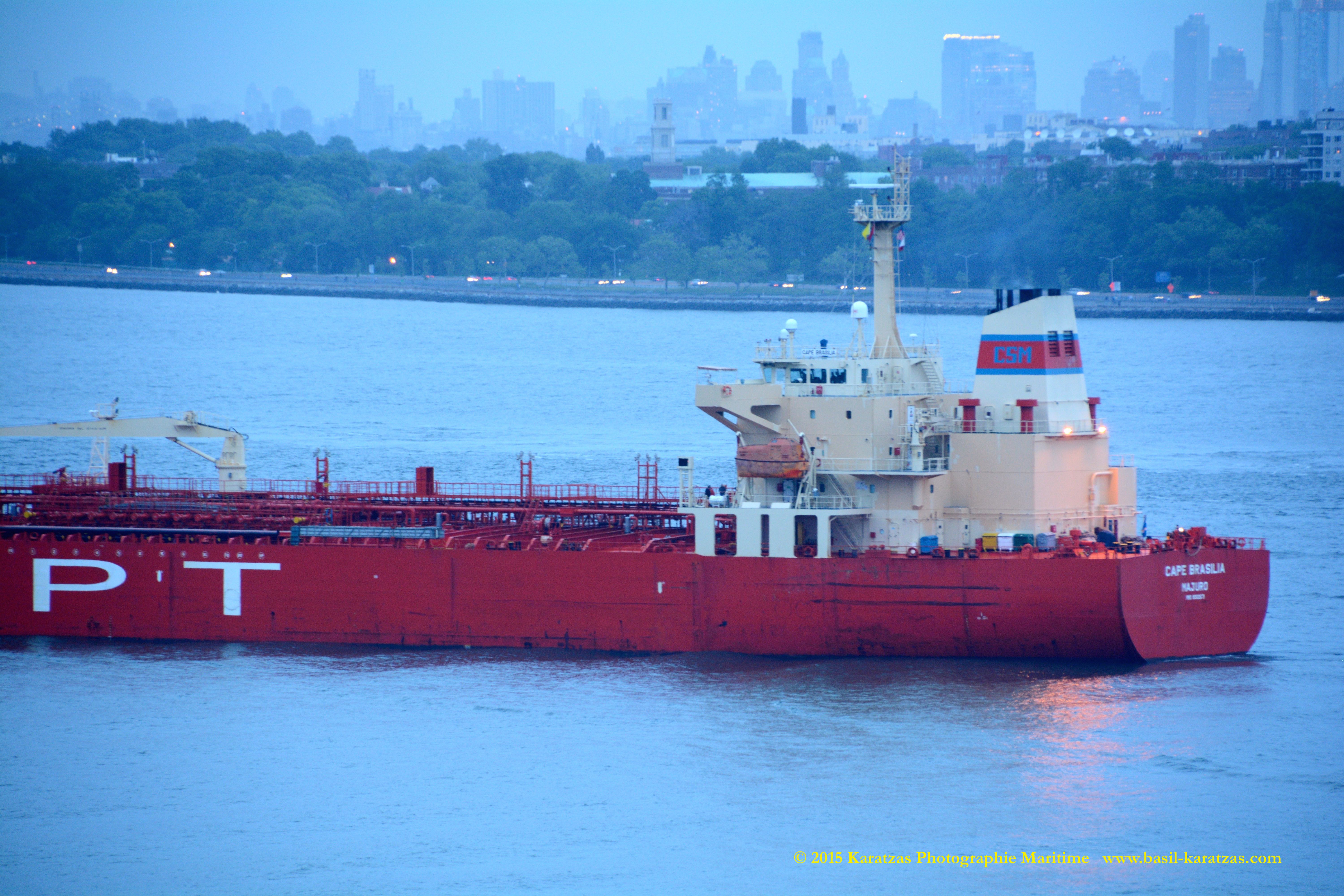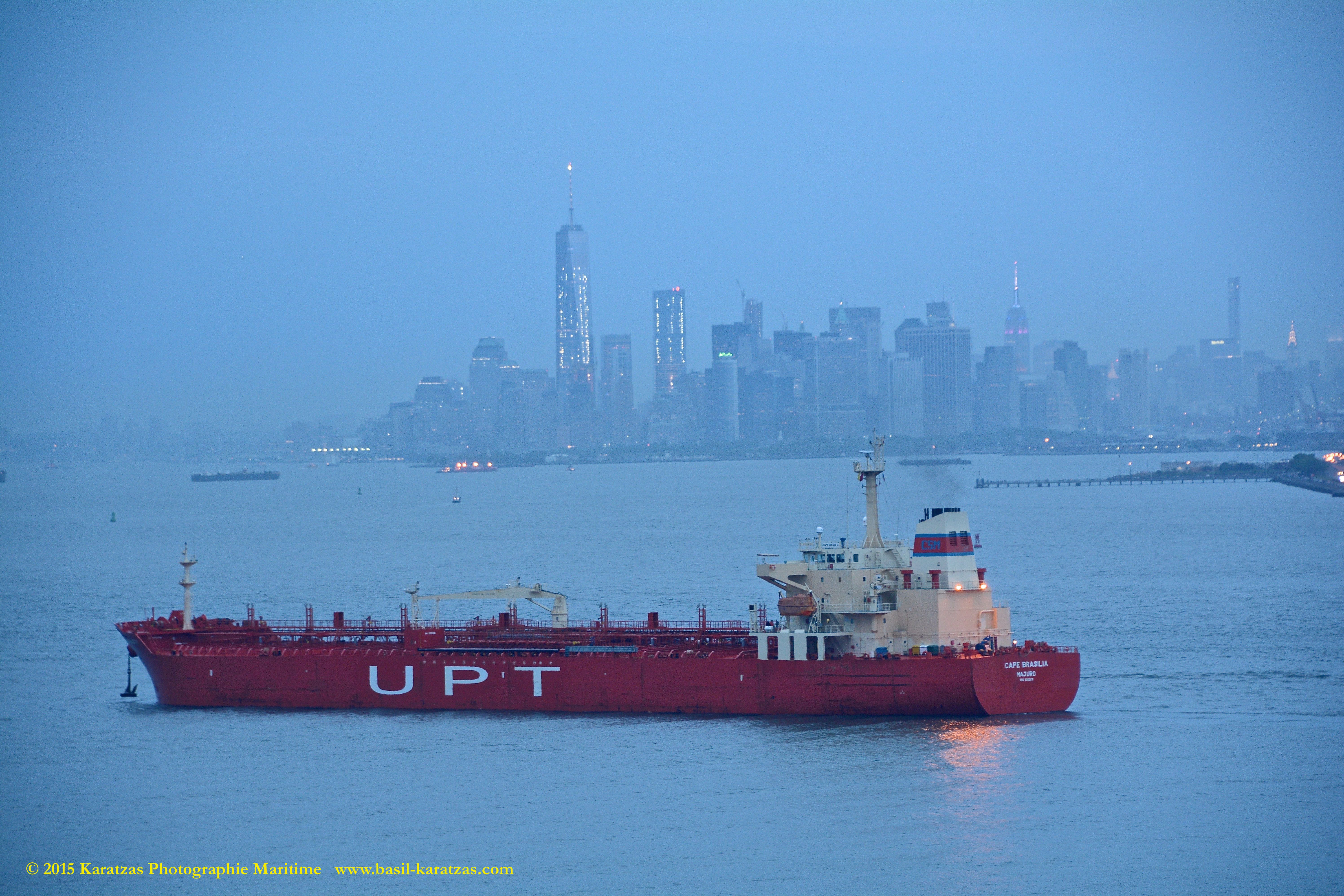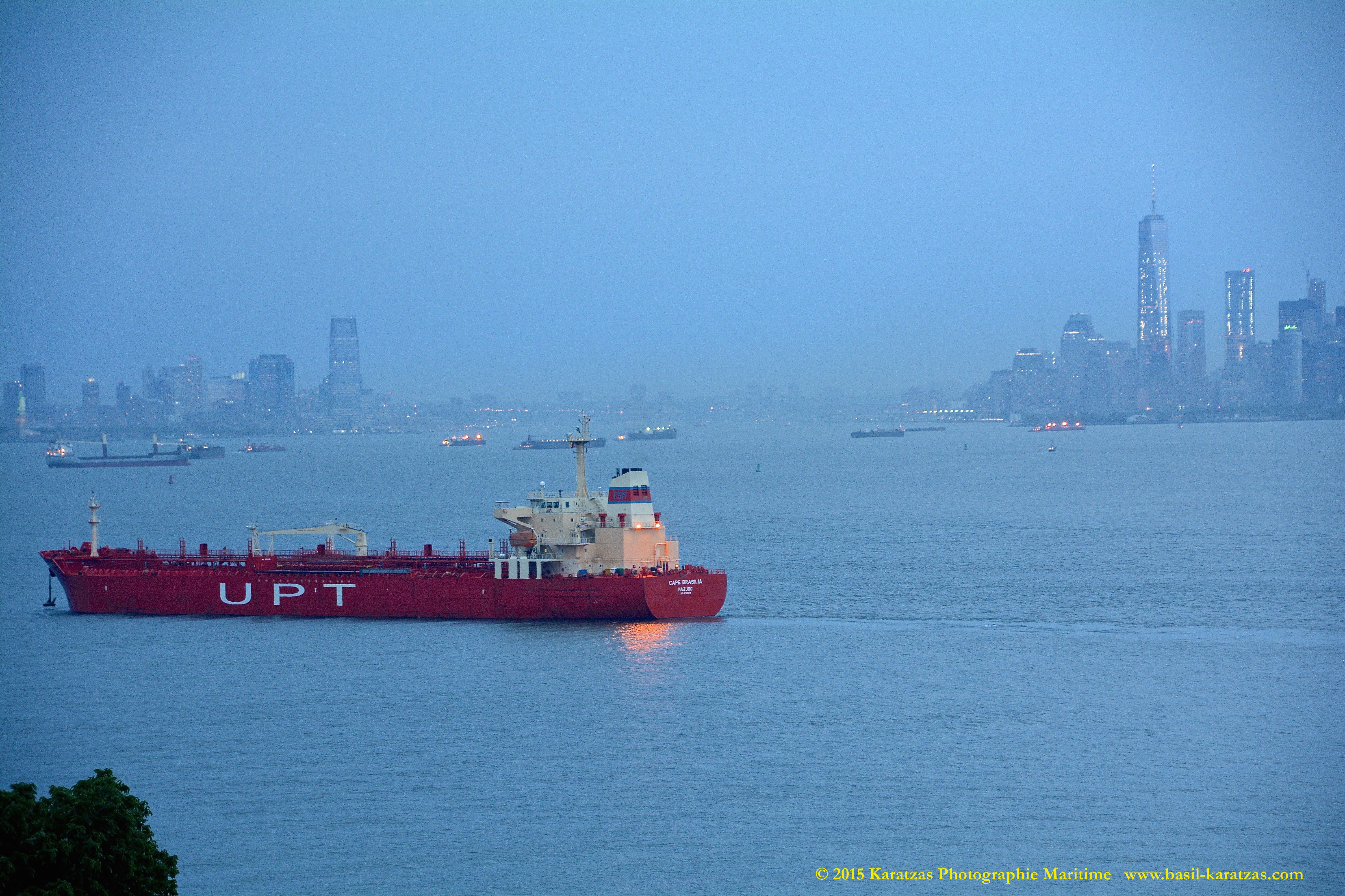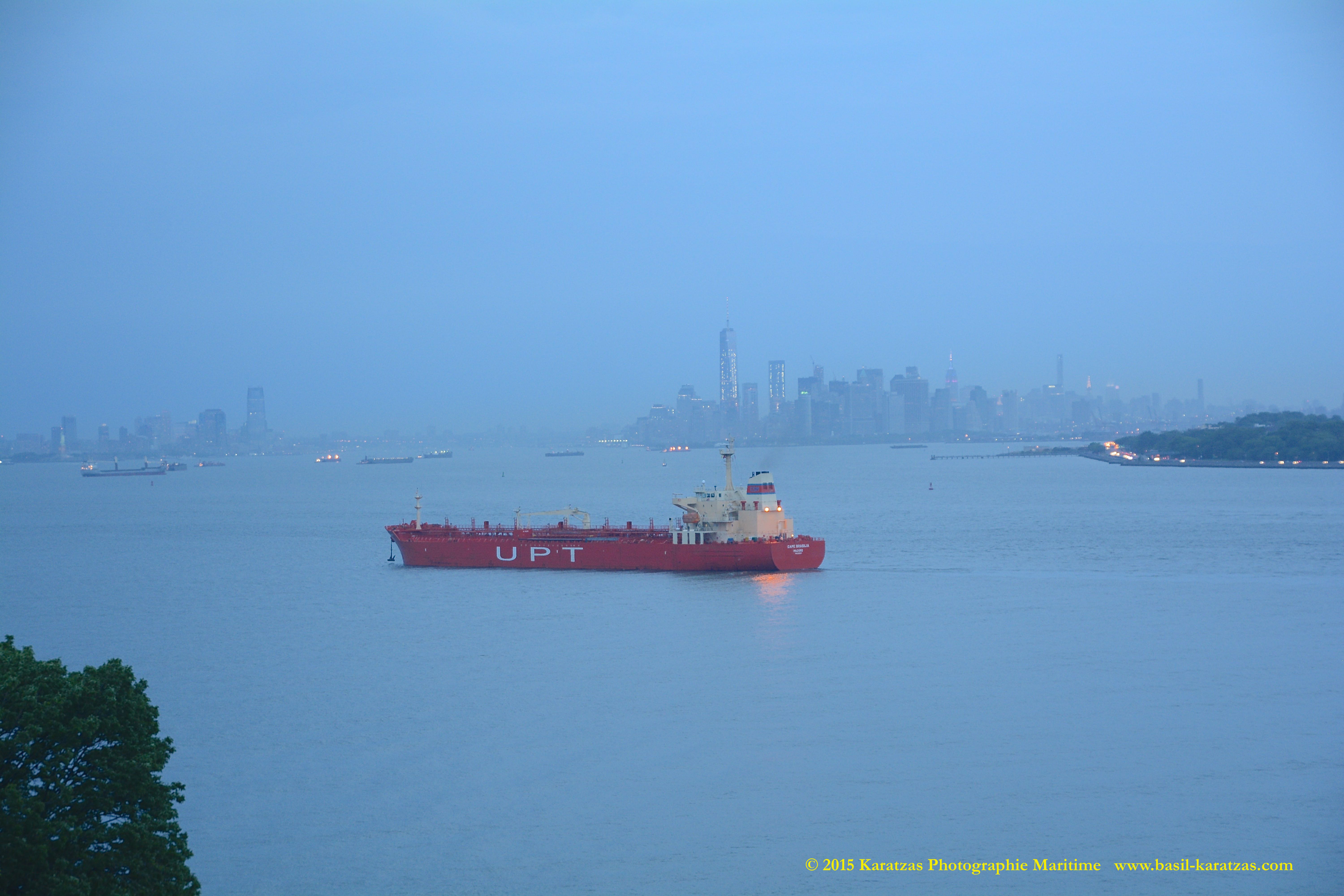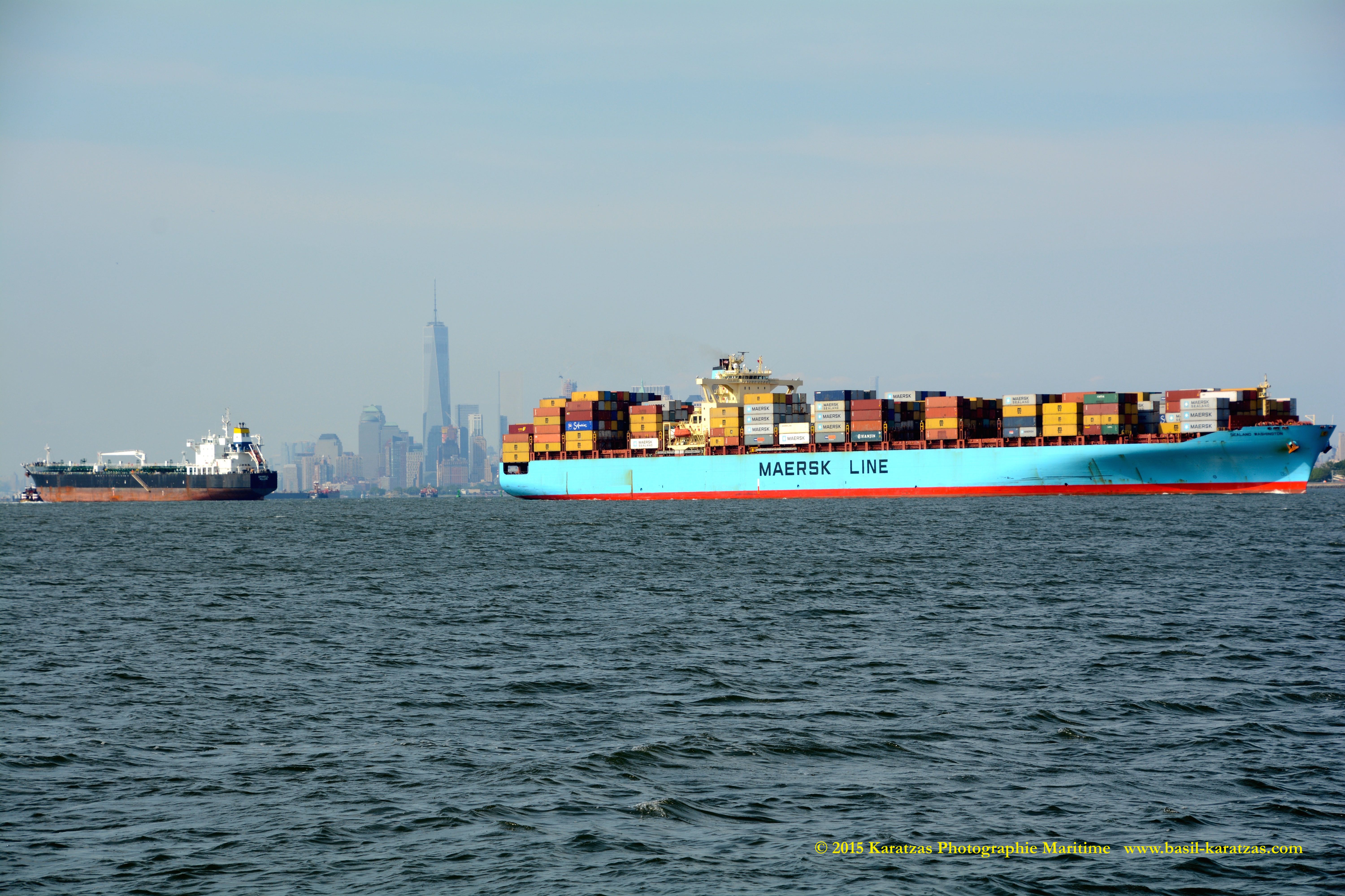 Post-panamax Containership ‘Sealand Washington’ (owned by Costamare in Greece and operated by Maersk Line) departing New York Harbor; crossing paths with inbound Products tanker ‘Orwell’. World Trade Center visible in the background. Karatzas Photographie Maritime