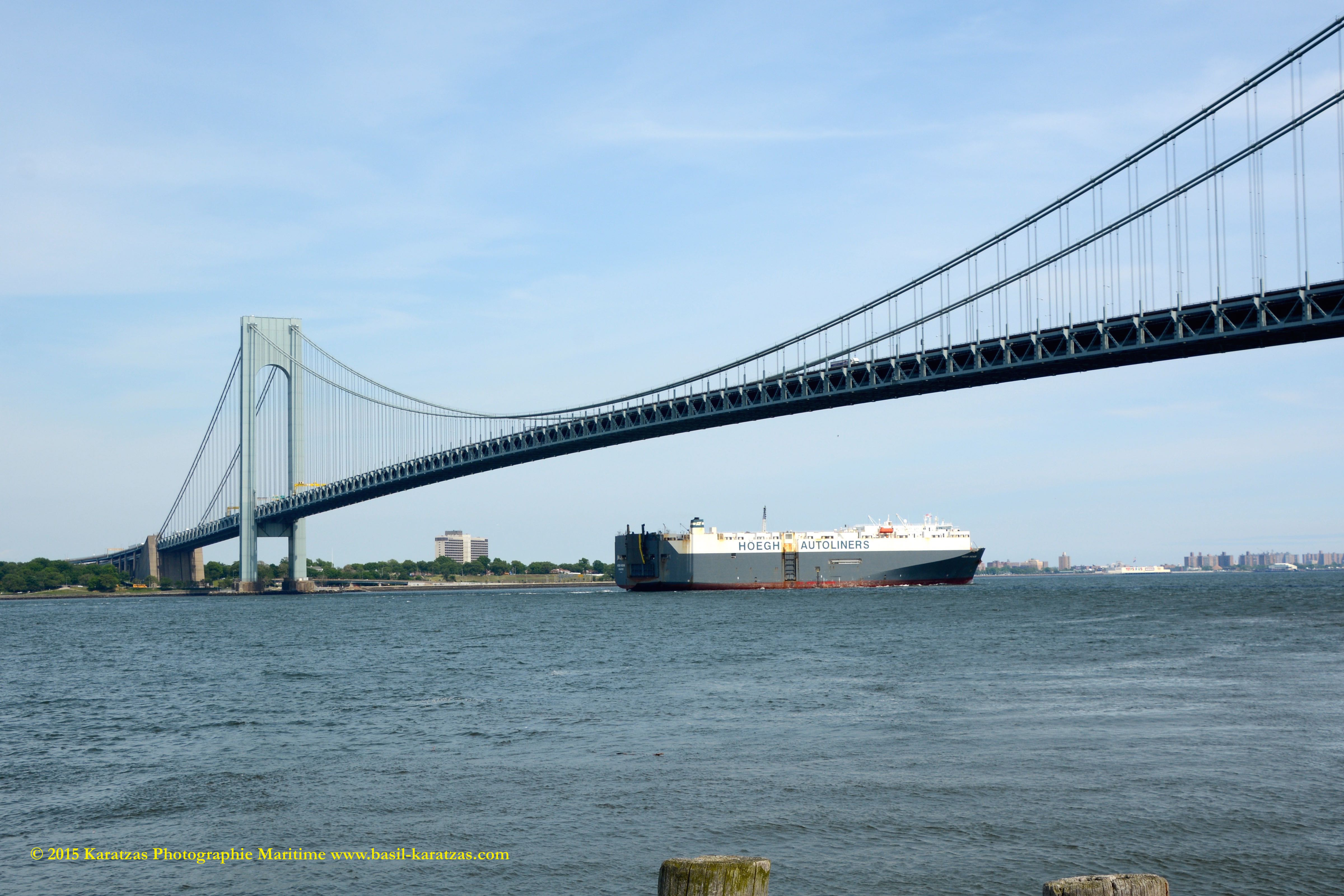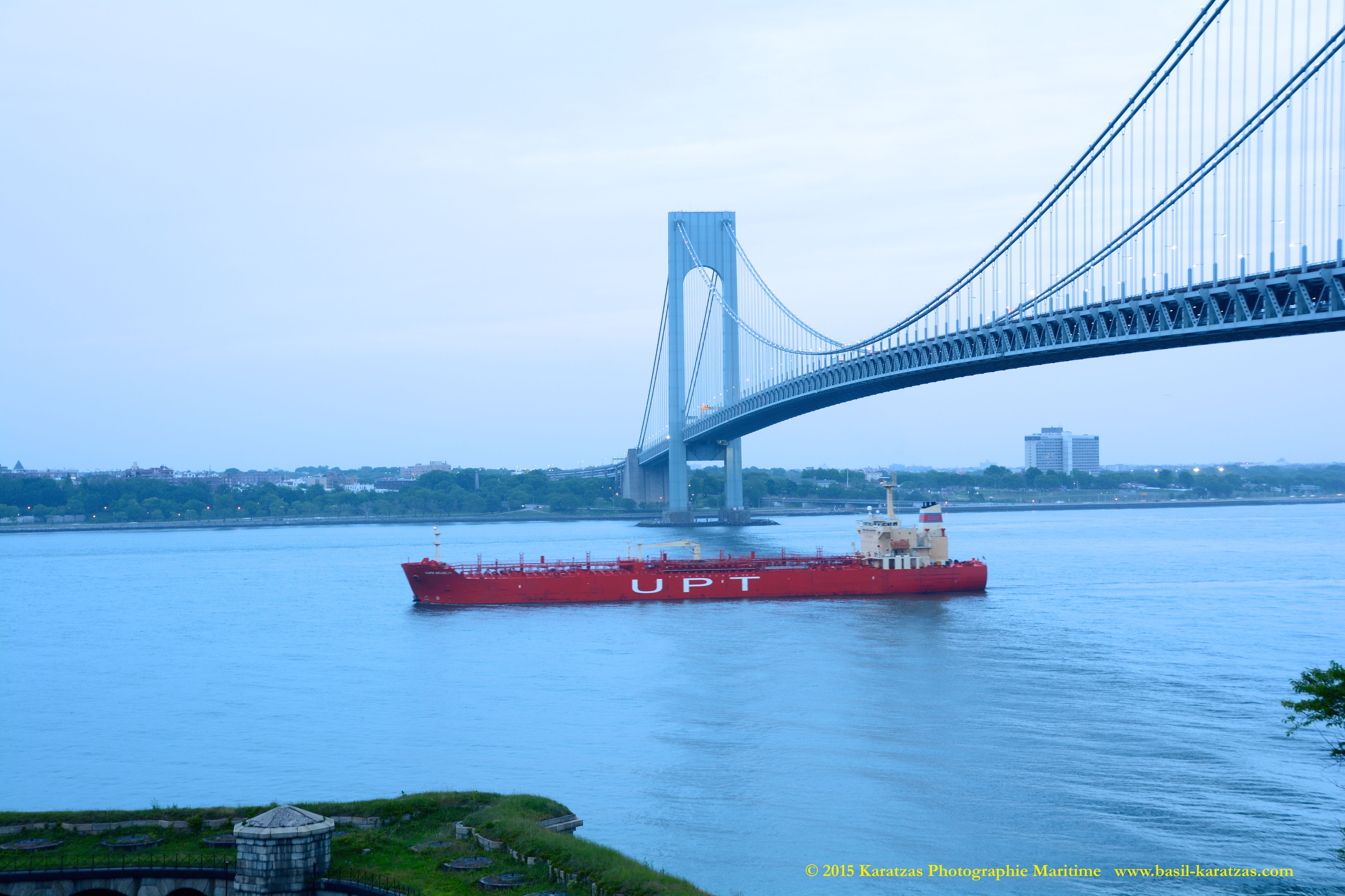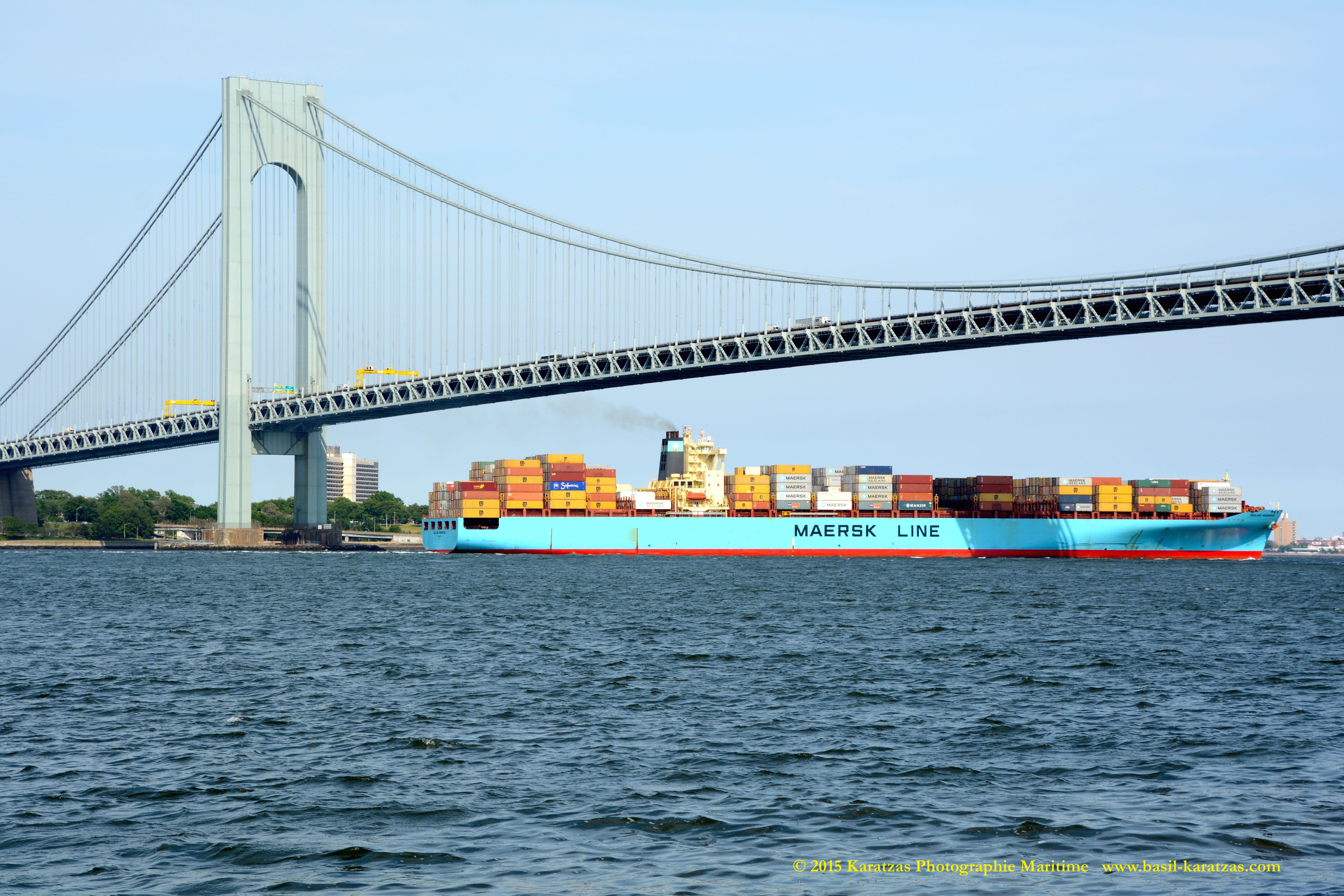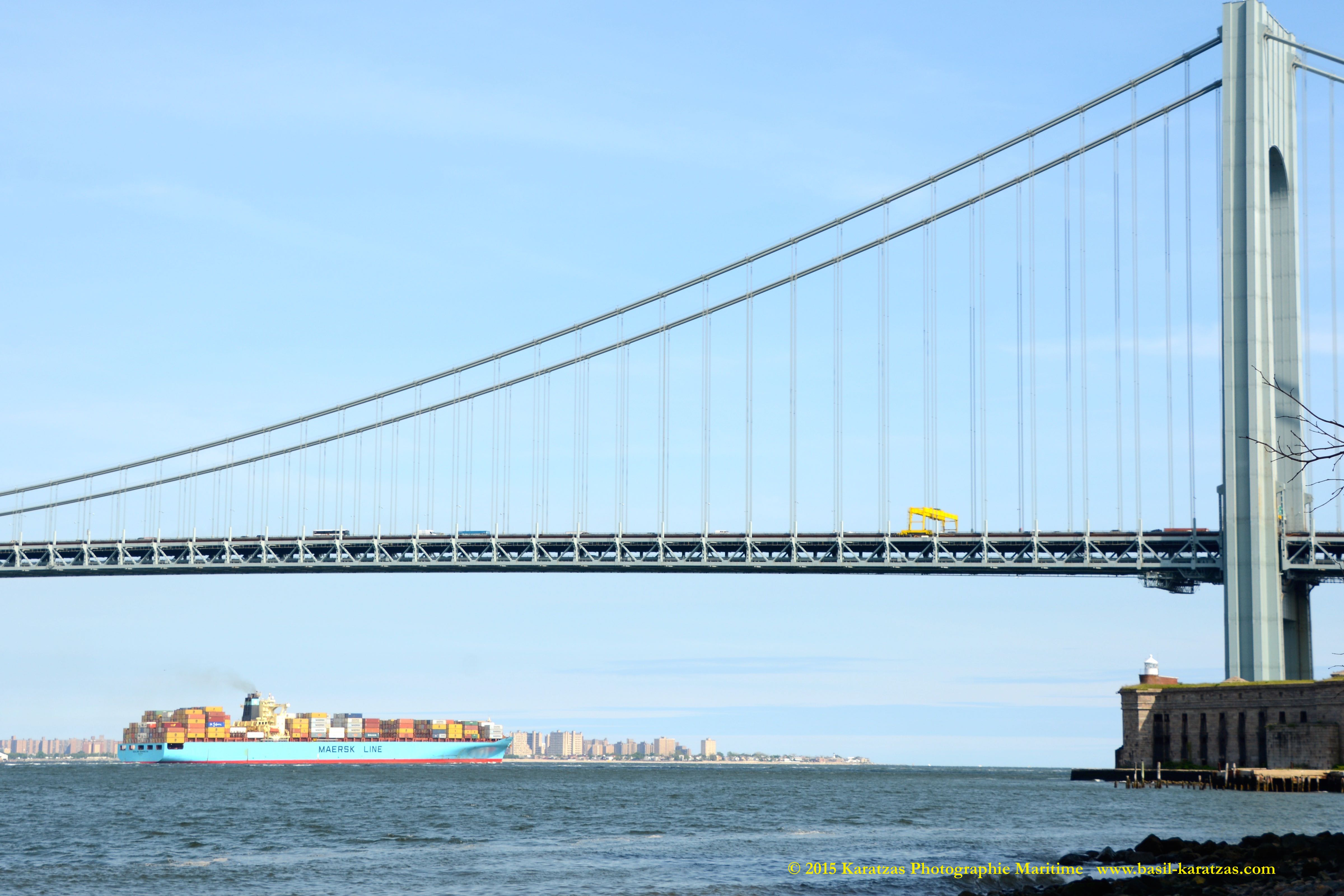 Post-panamax Containership ‘Sealand Washington’ (owned by Costamare in Greece and operated by Maersk Line) departing New York Harbor; crossing paths with inbound Products tanker ‘Orwell’. Passing under the Verrazano-Narrows Bridge. Karatzas Photographie Maritime