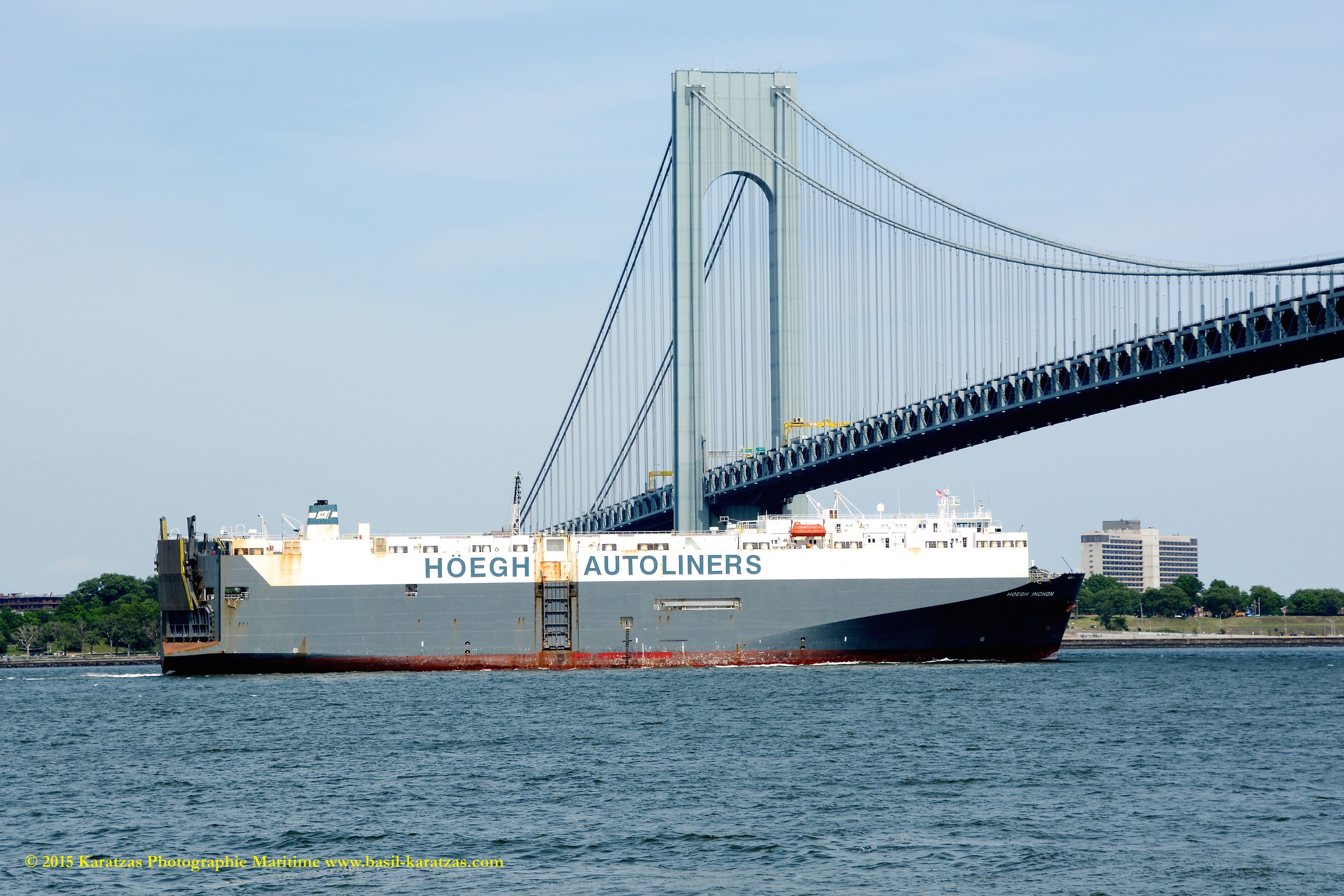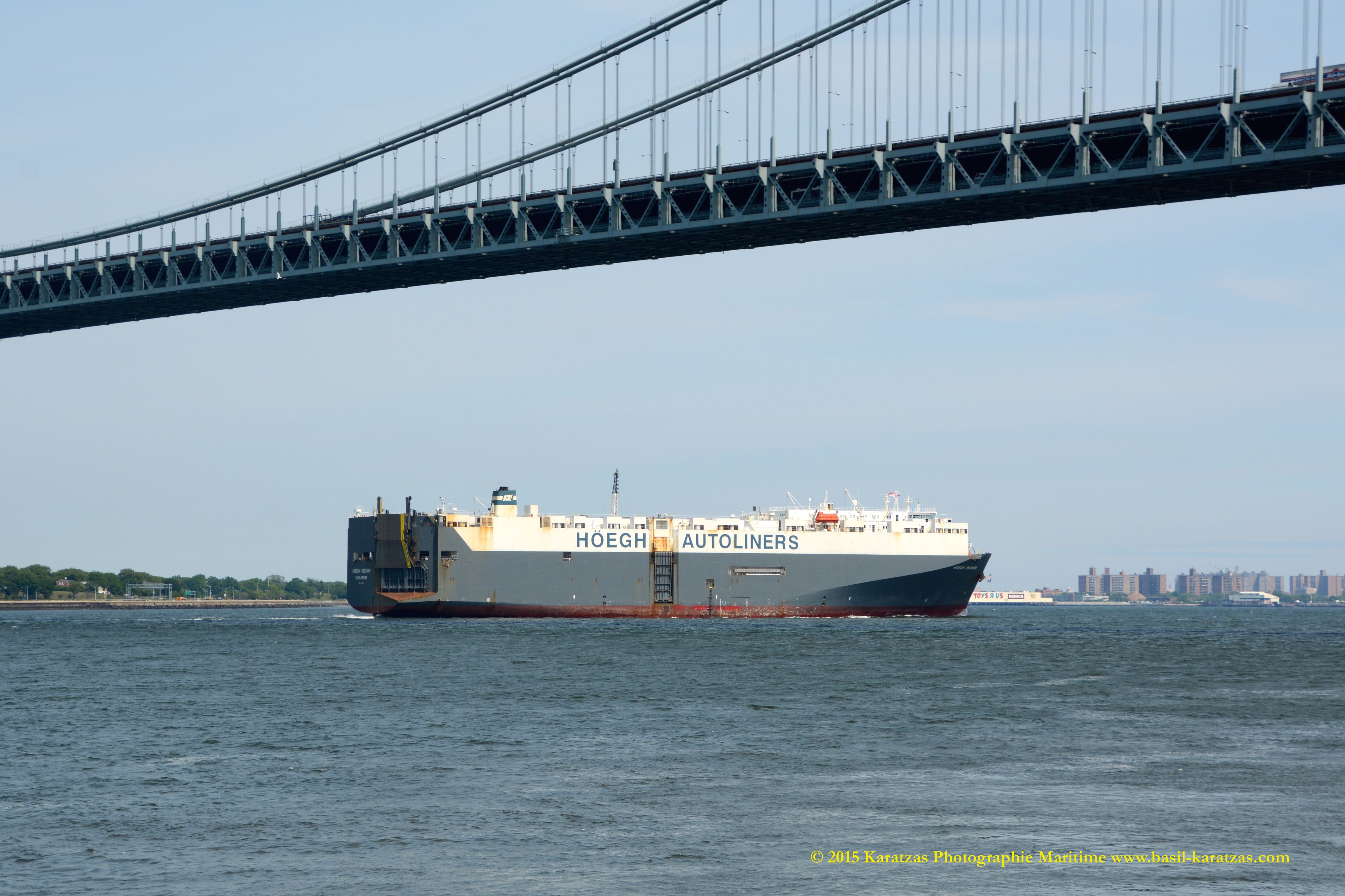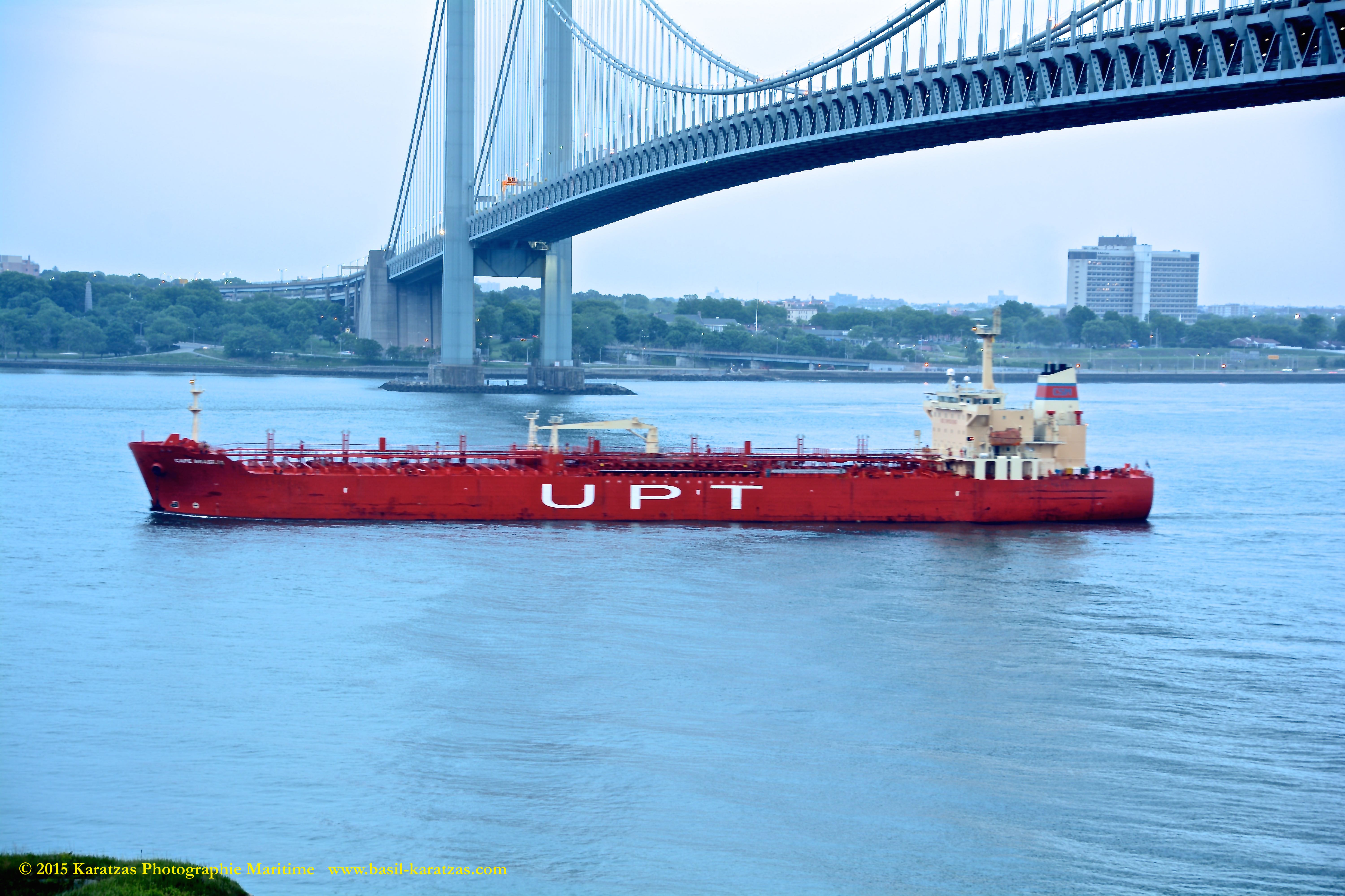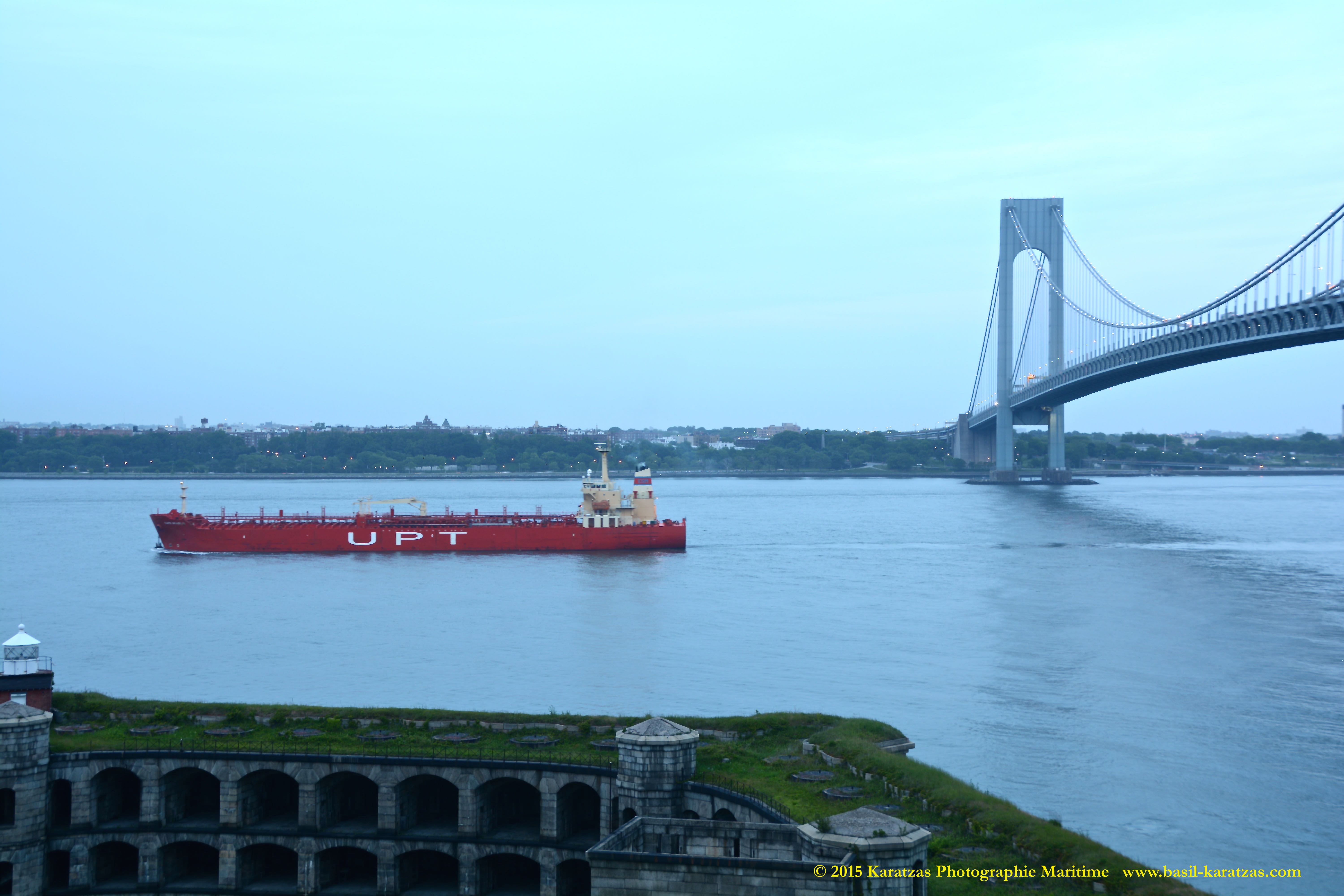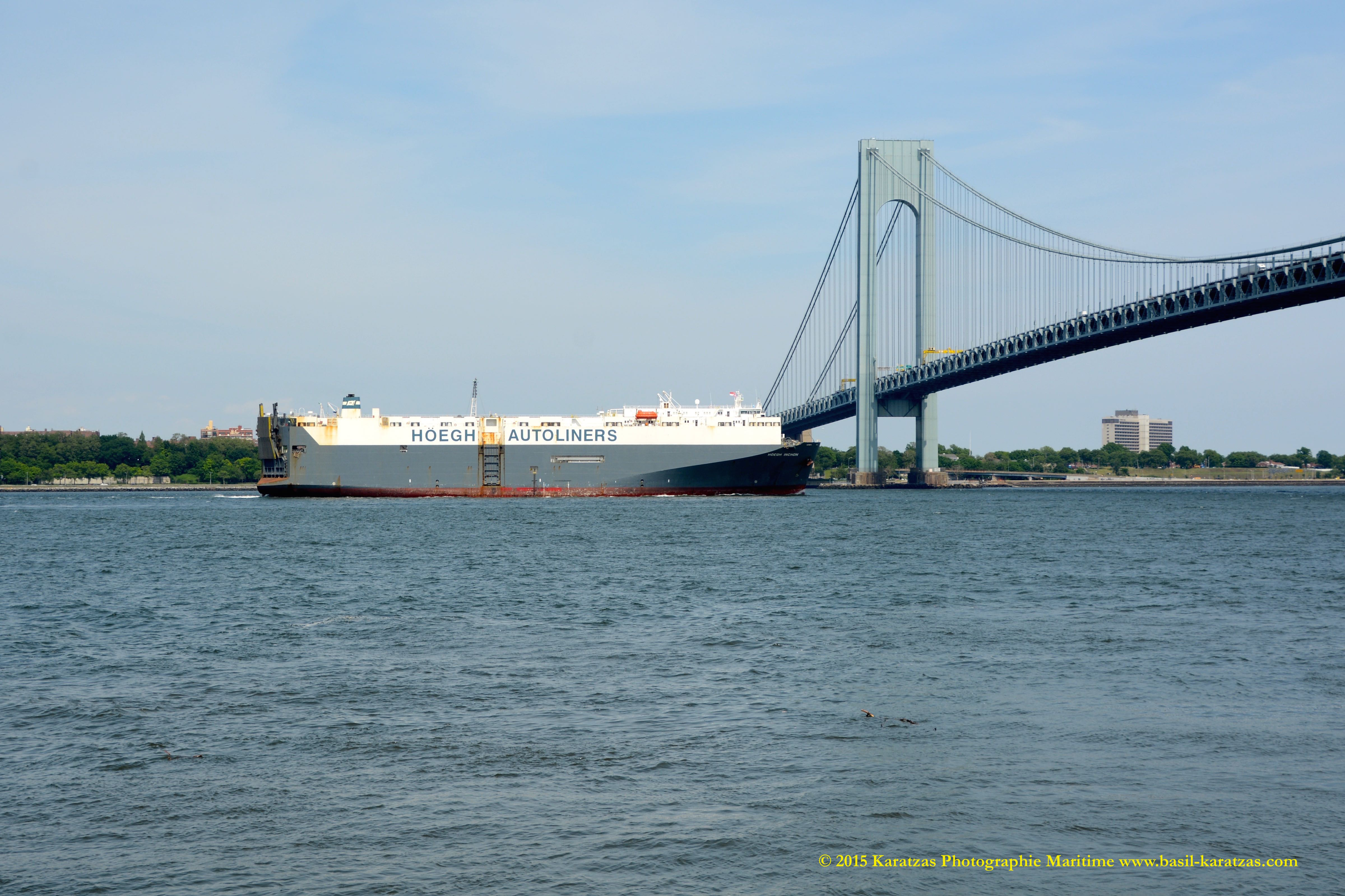 Post-panamax Containership ‘Sealand Washington’ (owned by Costamare in Greece and operated by Maersk Line) departing New York Harbor; crossing paths with inbound Products tanker ‘Orwell’. Passing under the Verrazano-Narrows Bridge. Karatzas Photographie Maritime
