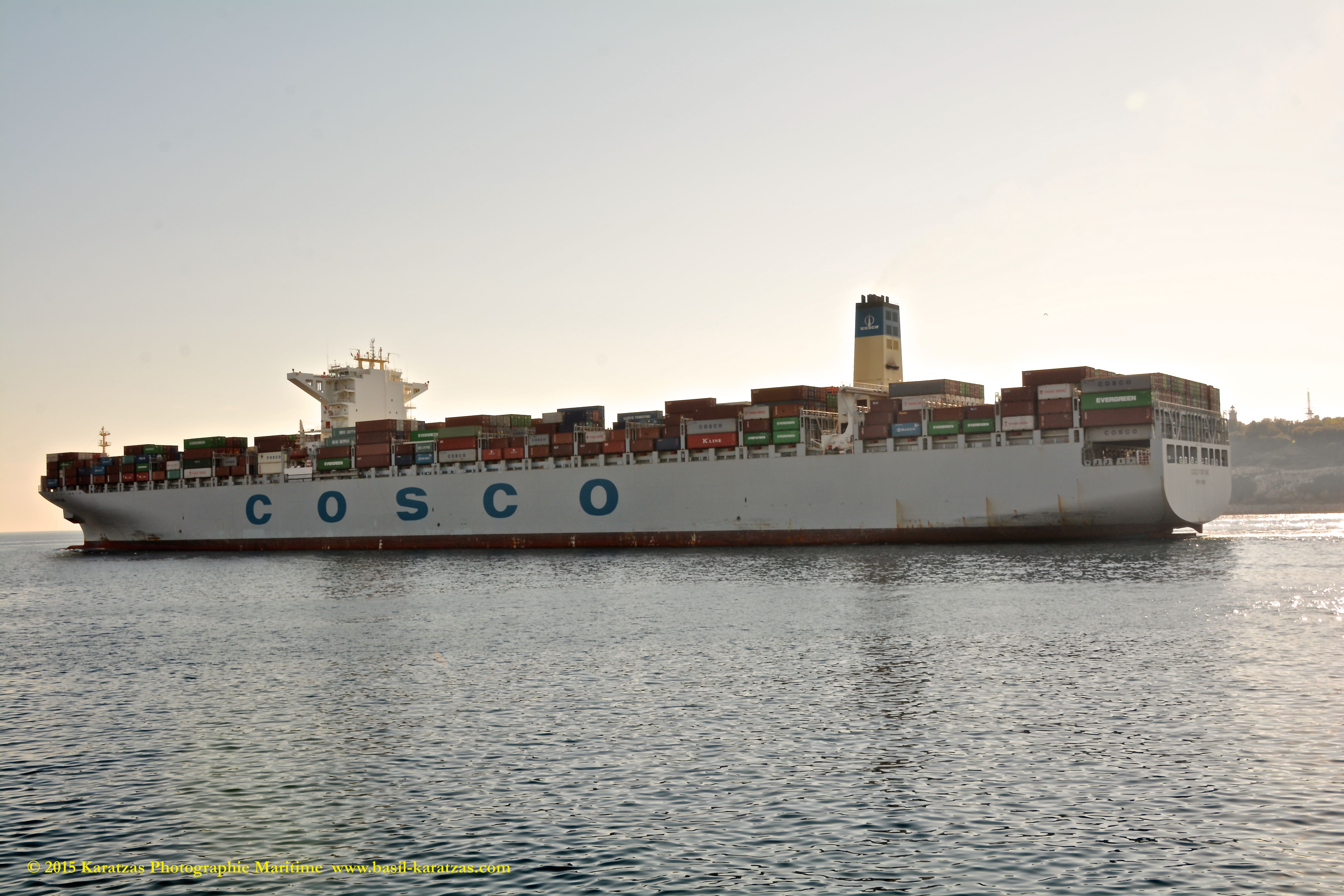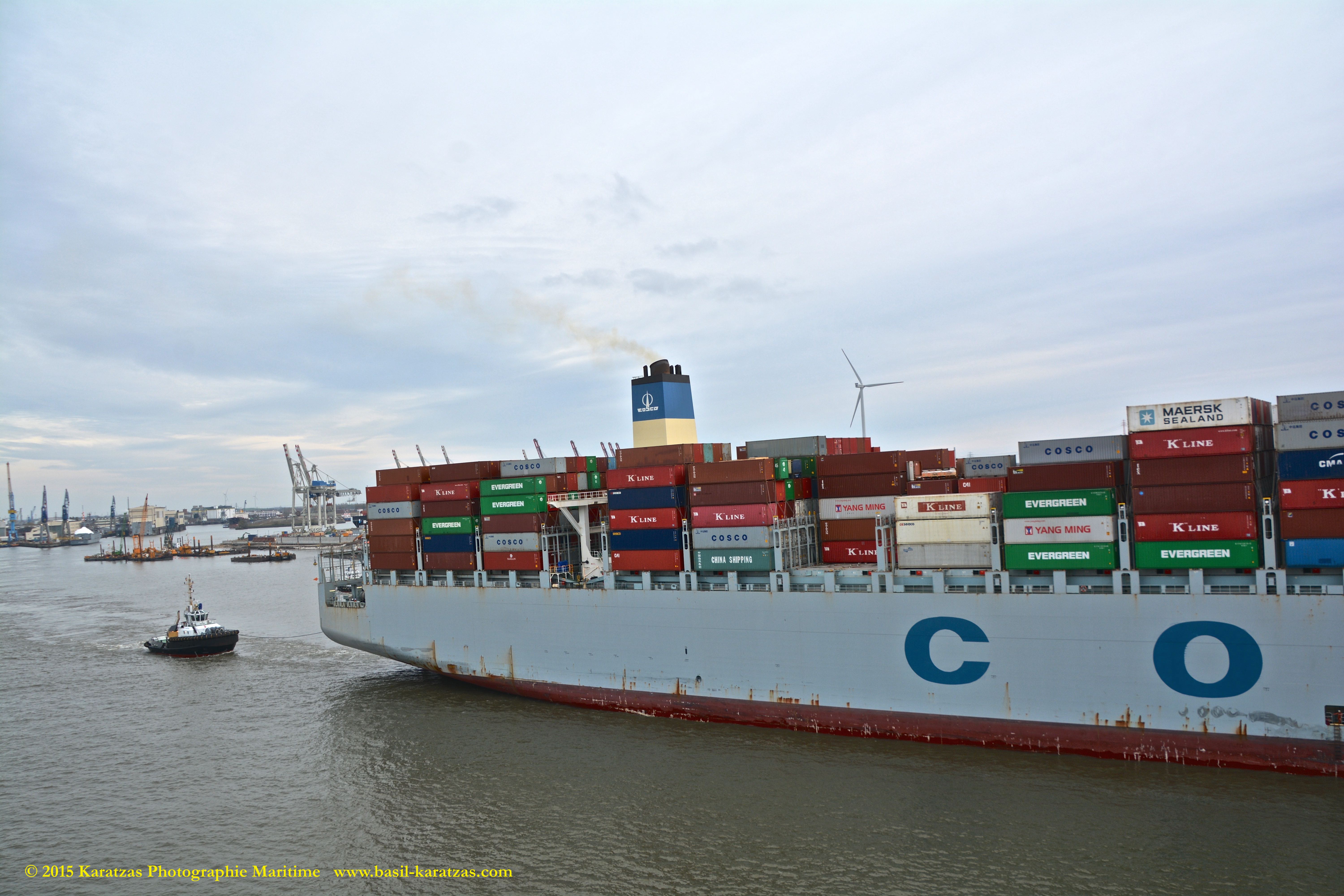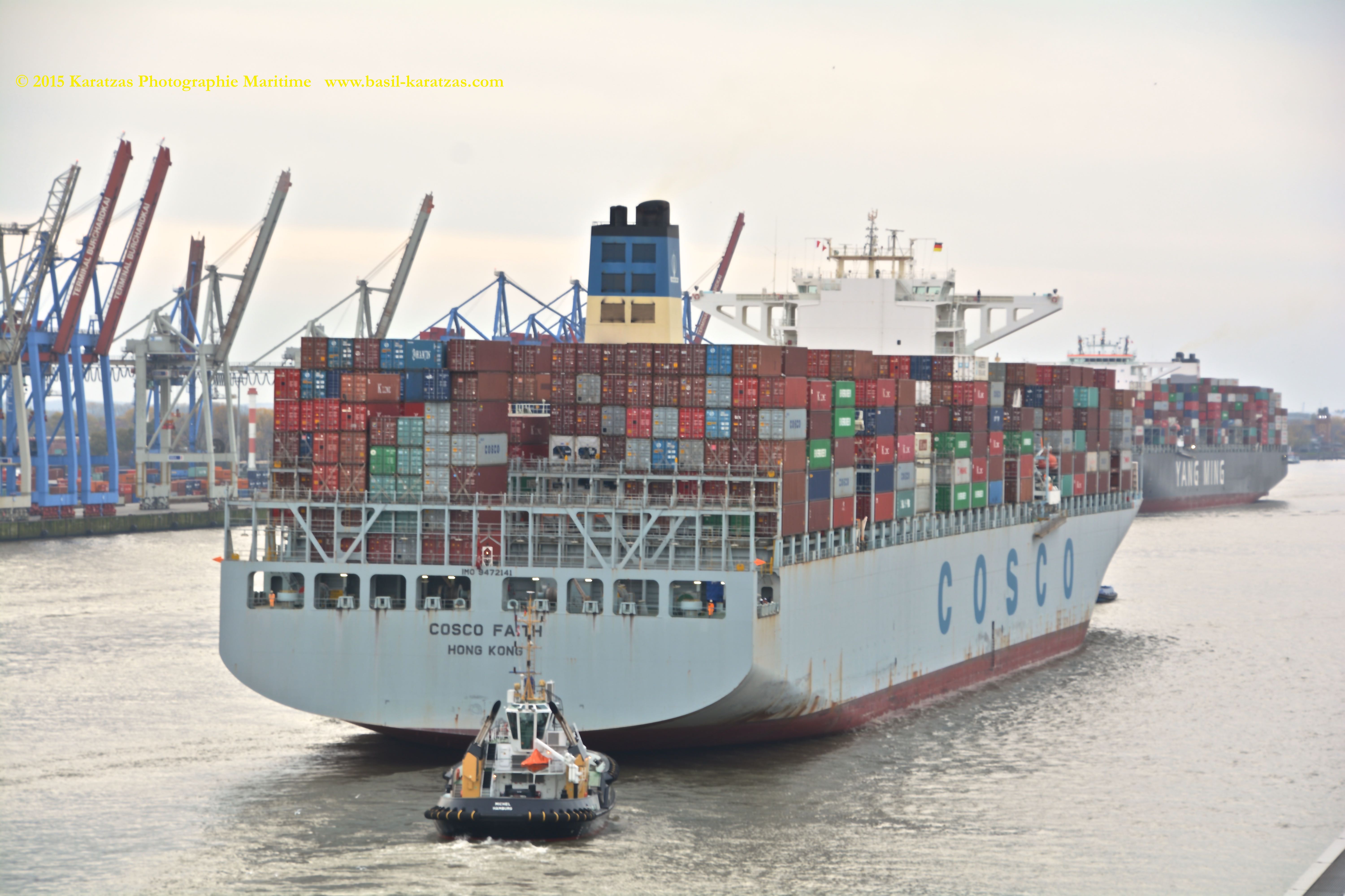 Post-panamax containership MV ‘Cosco Faith’ (13,100 teu, Hyundai Heavy, 2012) departing from the Port of Hamburg in mid-November 2015. The COSCO insignia on the chimney-stack. Image credit: Karatzas Photographie Maritime