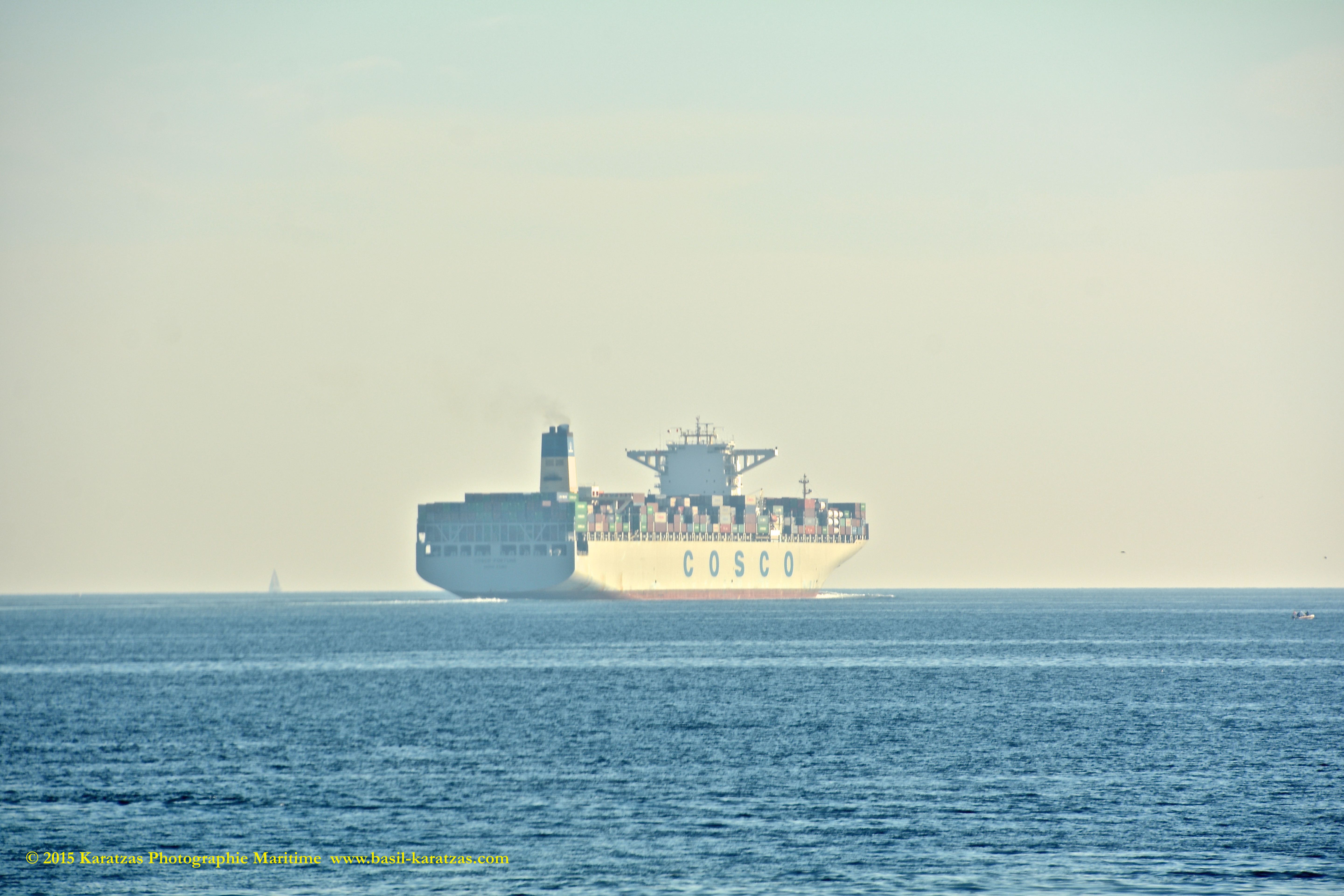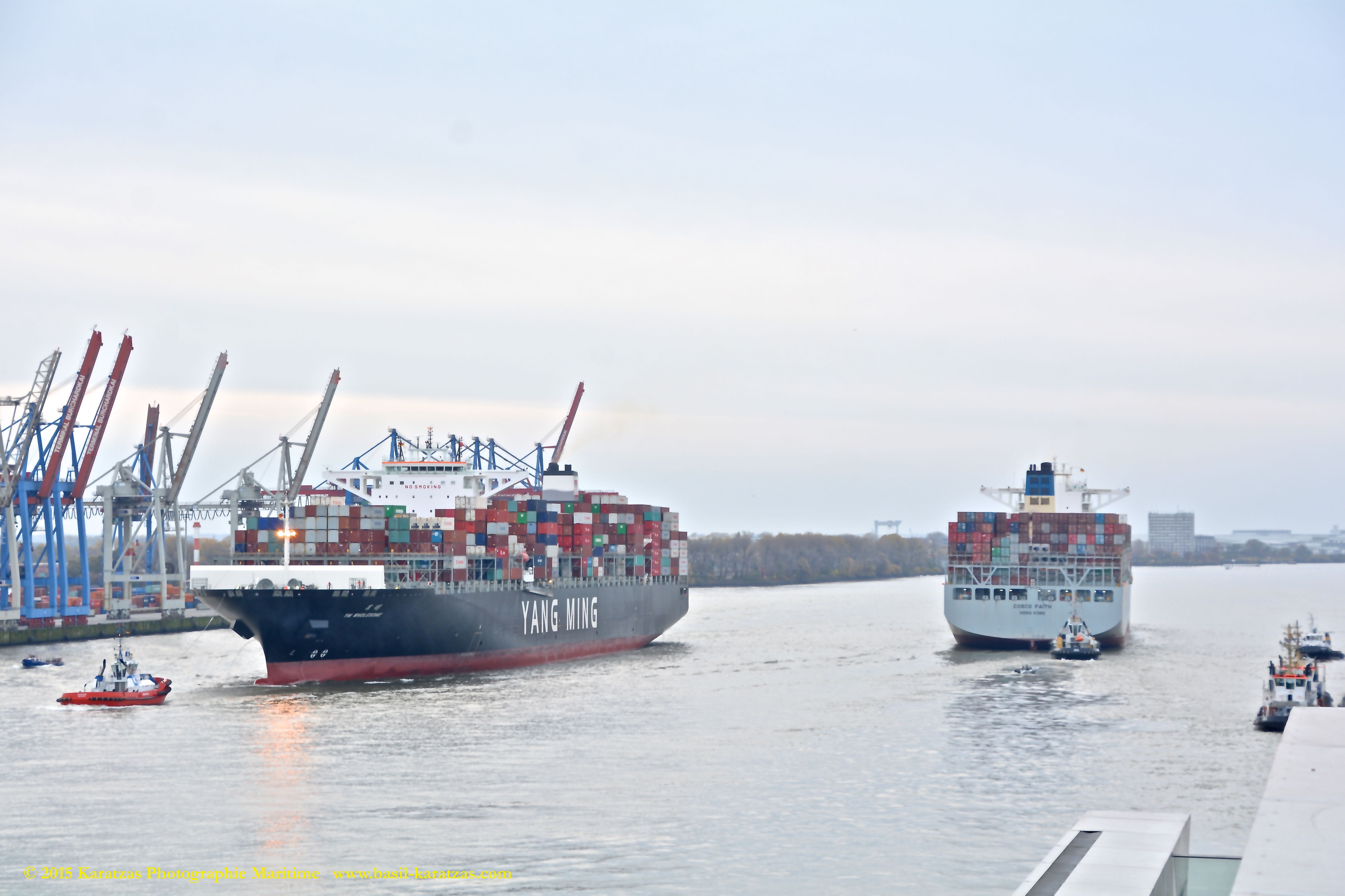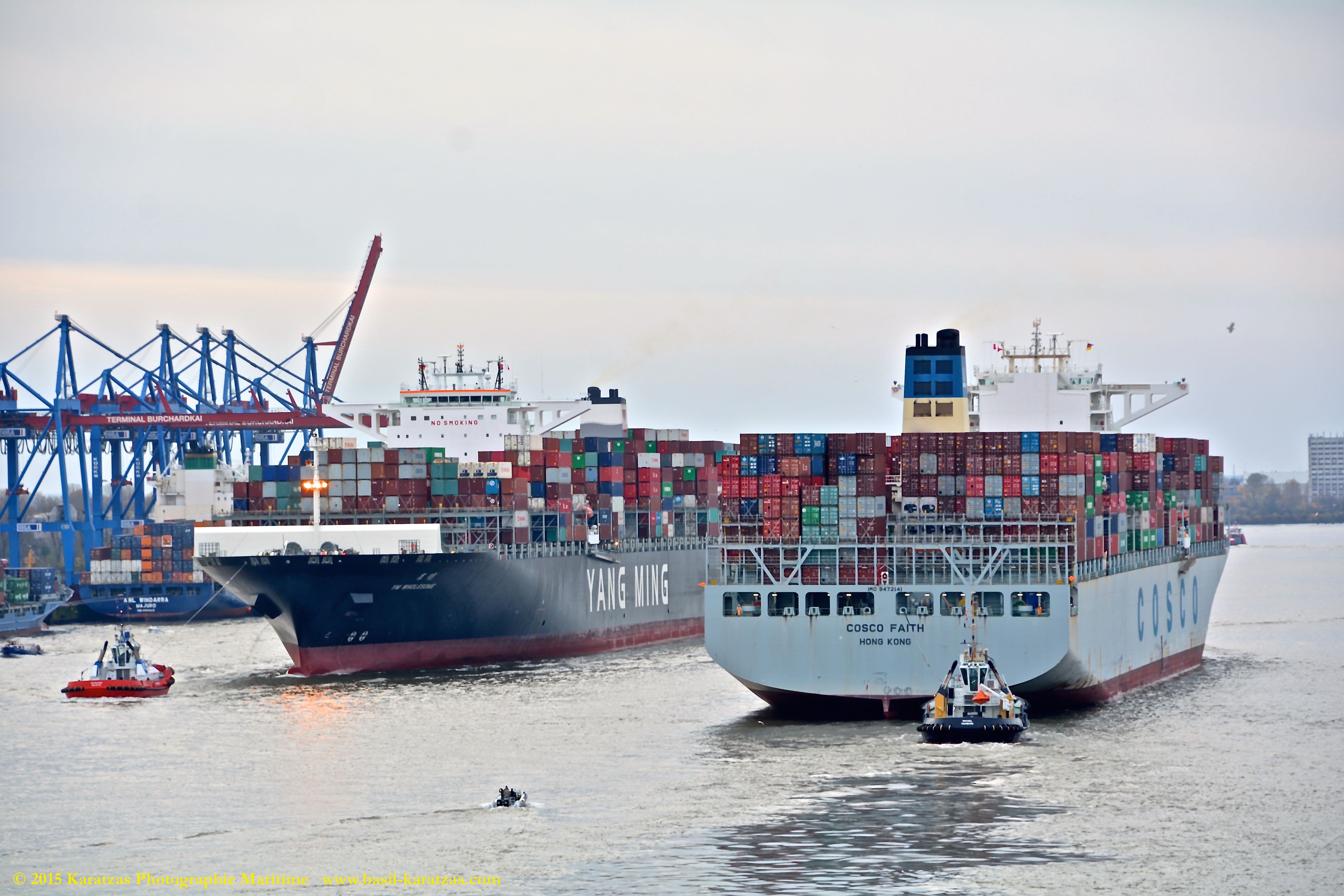 Post-panamax containership MV ‘Cosco Faith’ (13,100 teu, Hyundai Heavy, 2012) departing from the Port of Hamburg in mid-November 2015. CKYHE containership ‘YM Wholesome’ inbound. Image credit: Karatzas Photographie Maritime