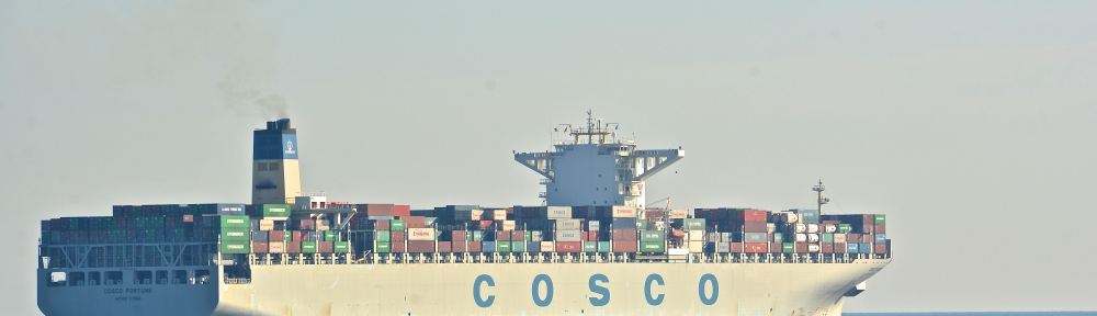 Post-panamax containership MV ‘COSCO Fortune’ (13,000-teu, built at Hyundai Heavy in 2012)departing Port of Piraeus in November 2015. Pulled back from Cosco’s terminal. Image credit: Karatzas Photographie Maritime