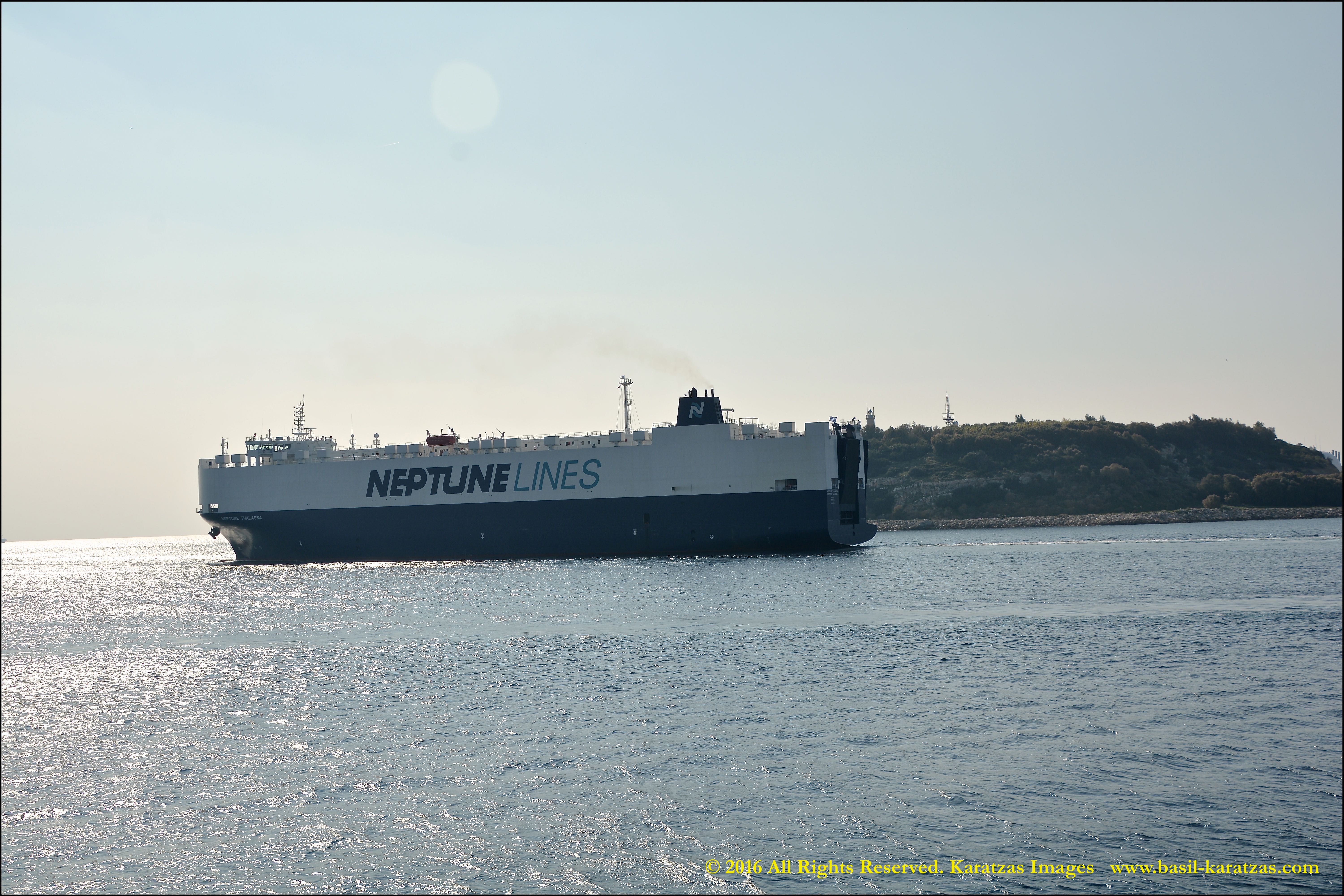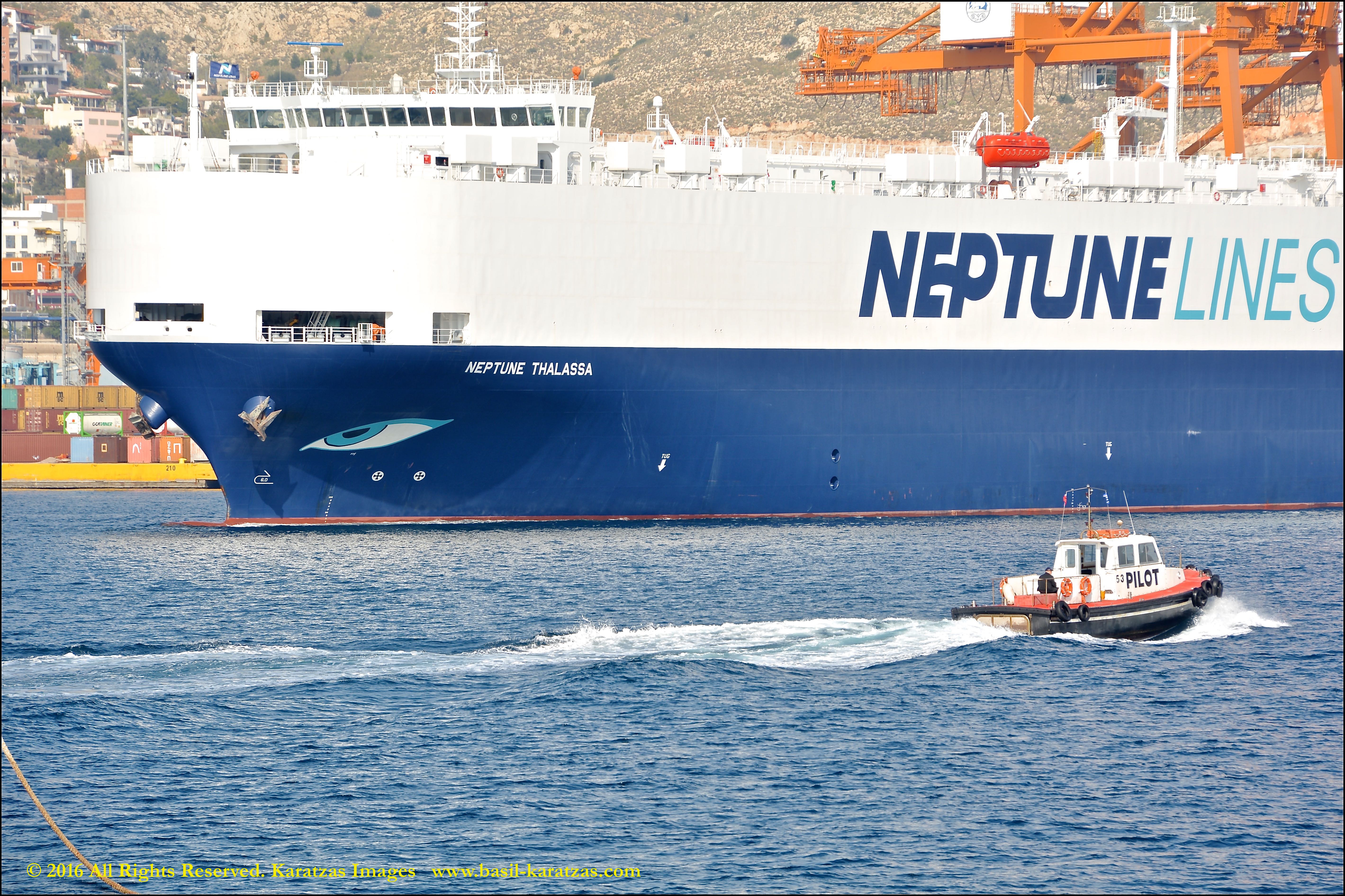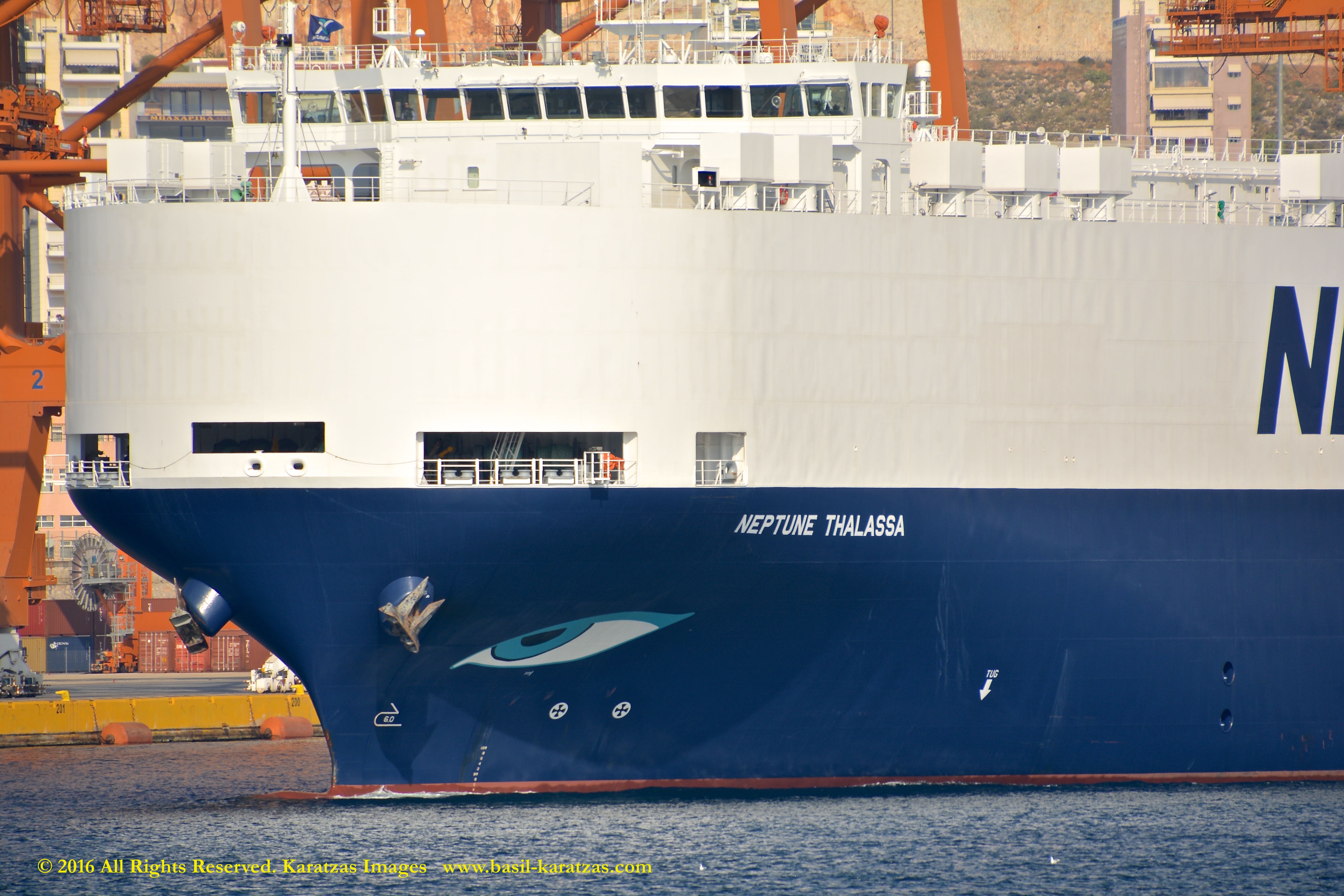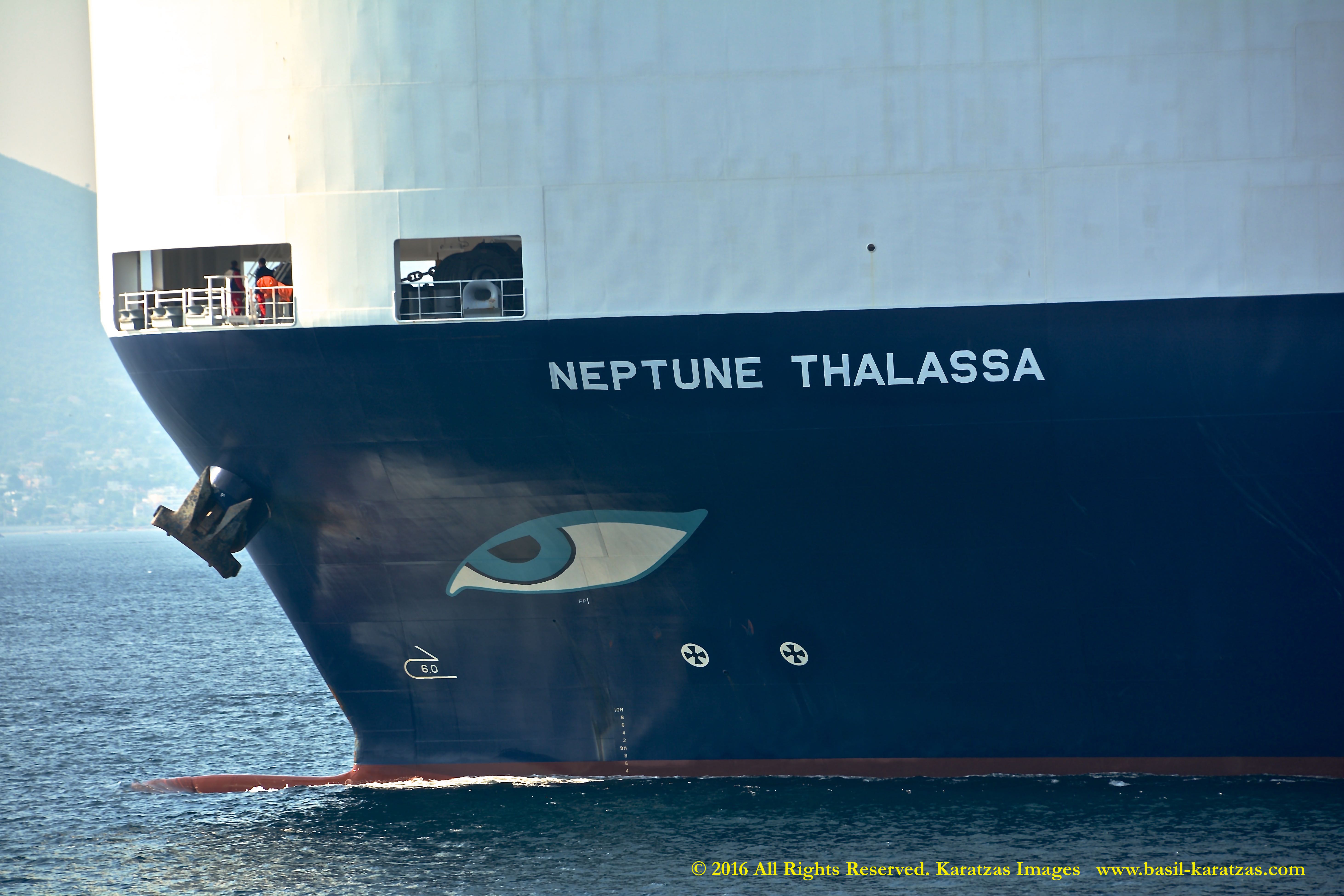 Anthropomorphic bow bearing a blue-eye, the ‘Eye of the Sea’ possibly – as ‘Thalassa’ means ‘Sea’ in Greek. Built in 2014 at Hyundai Mipo, 3000-ceu car carrier MV ‘Neptune Thalassa’ departs Port of Piraeus in November 2015. Image credit: Karatzas Images