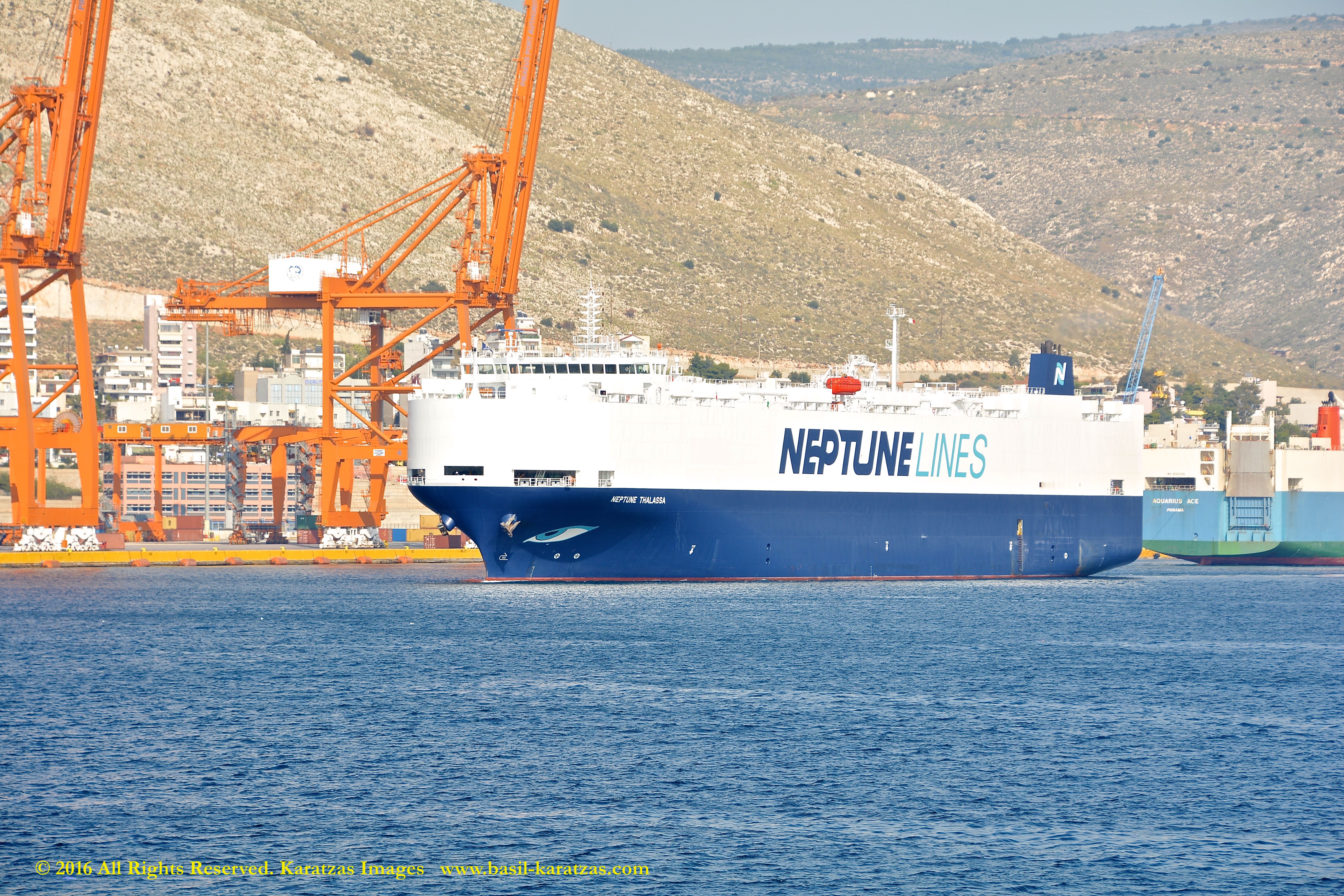 Car Carrier MV ‘Neptune Thalassa’, built in 2014 at Hyundai Mipo, 3000-ceu car carrier MV ‘Neptune Thalassa’ departs Port of Piraeus in November 2015. Image credit: Karatzas Images