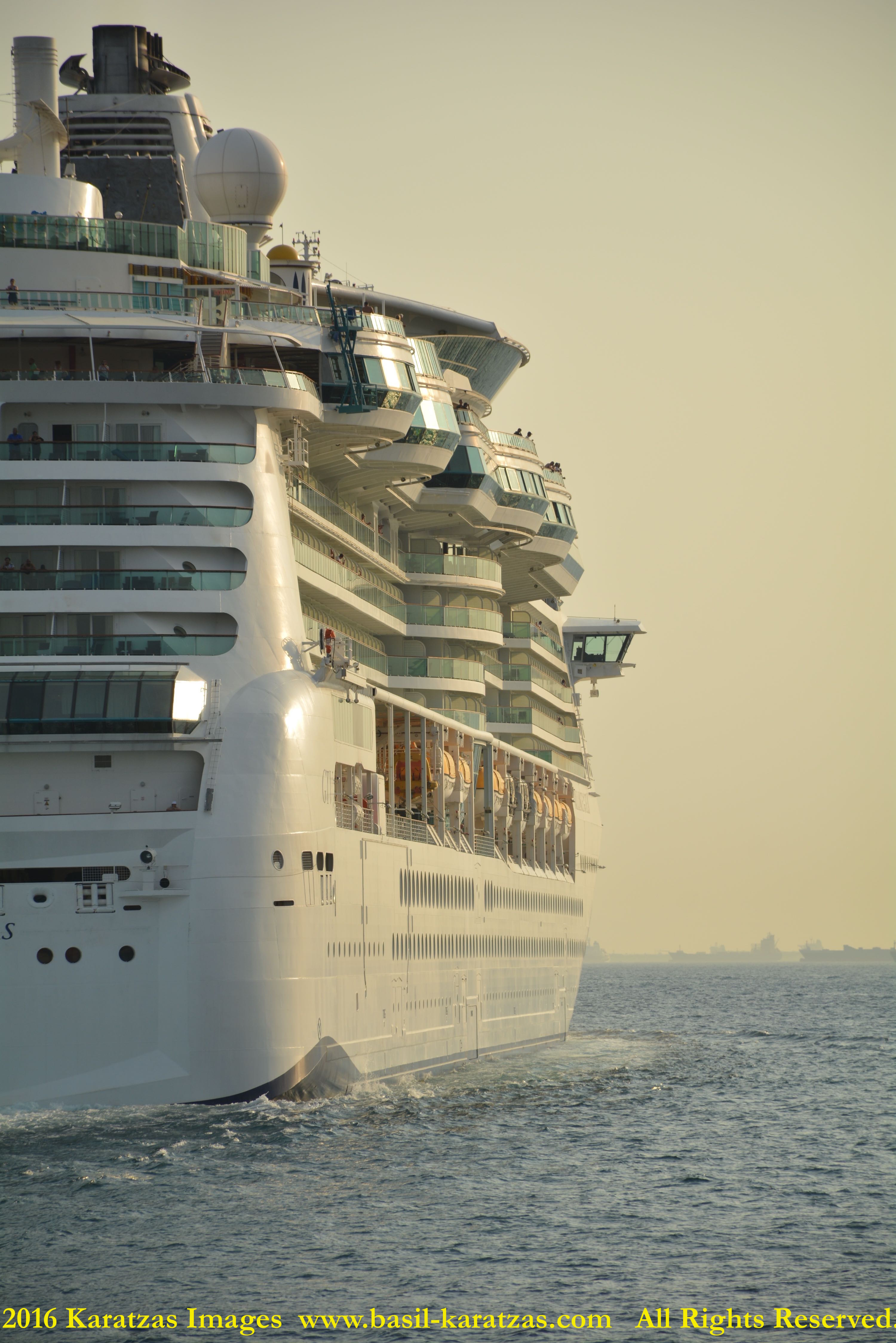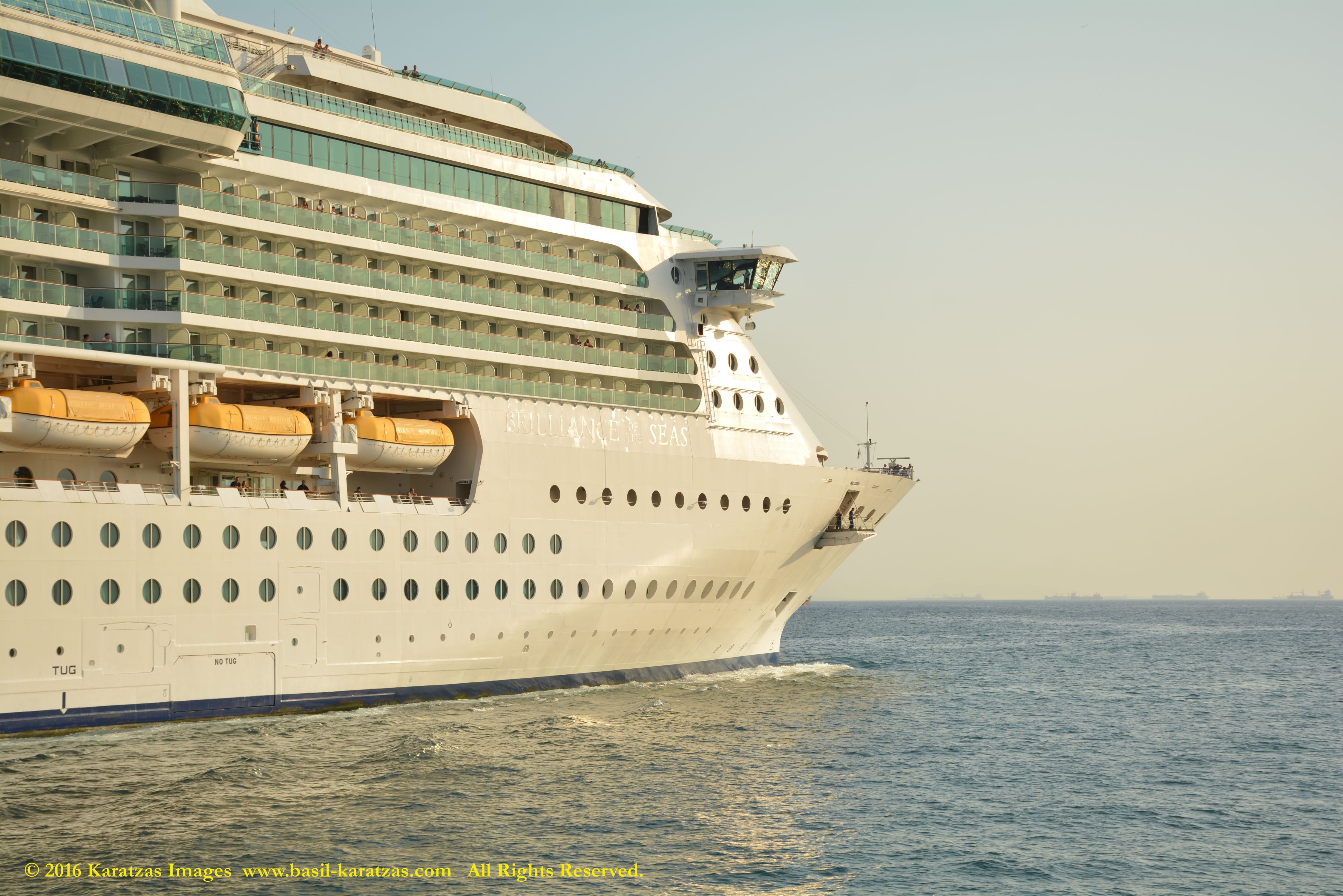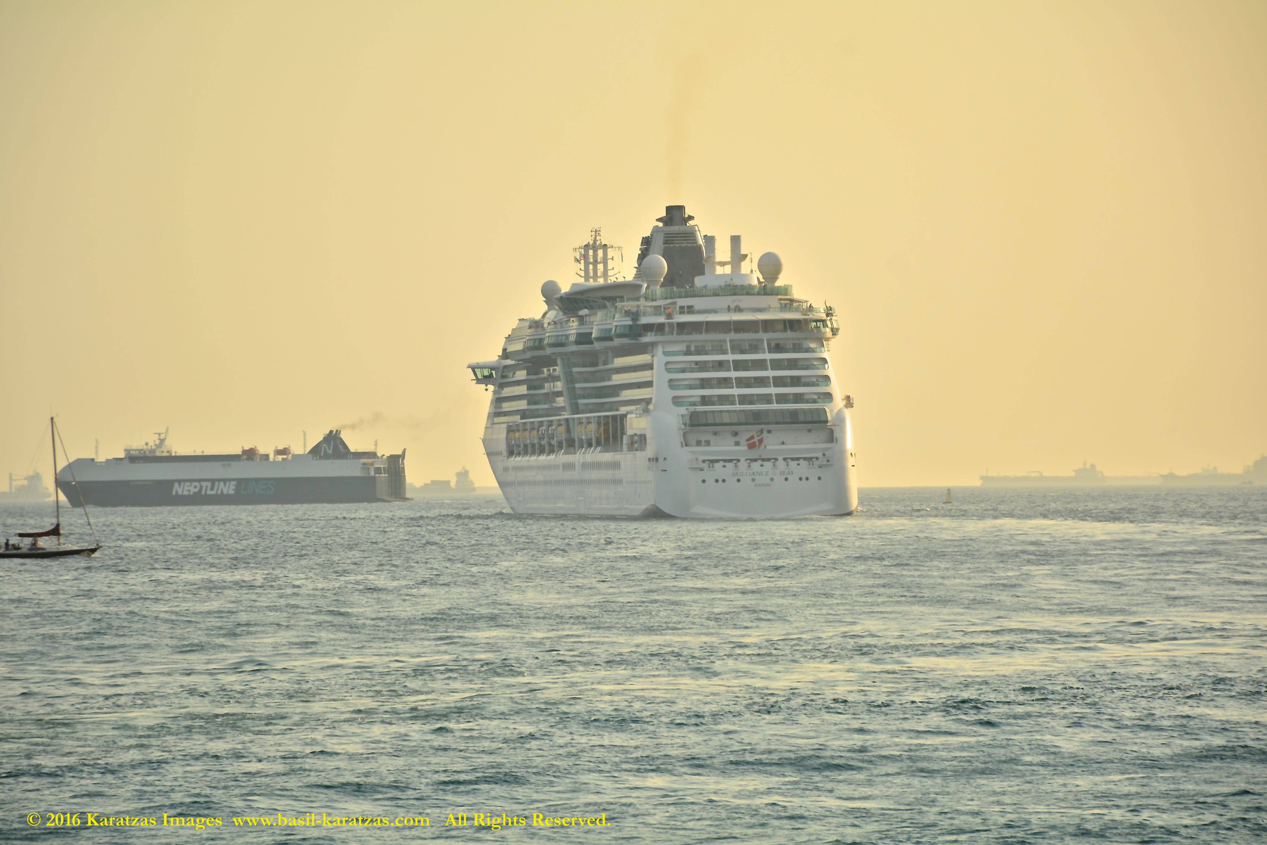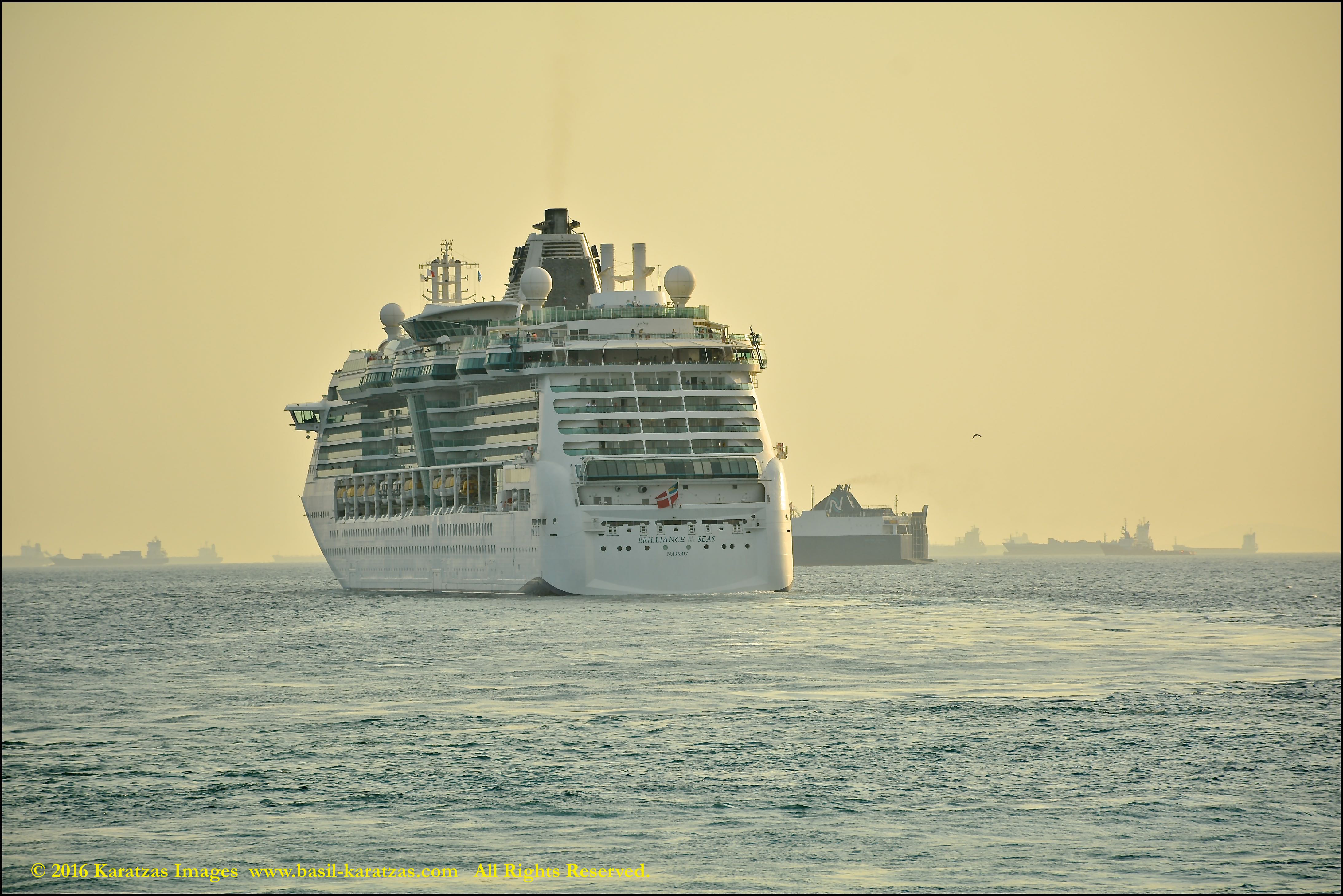 Medium size cruiseship, built 14 year ago at Meyer Werft at a price of US$350 mil for RCL, ‘Brilliance of the Seas’ departs the Port of the Piraeus on a sunny August afternoon. Image credit: Karatzas Images.
