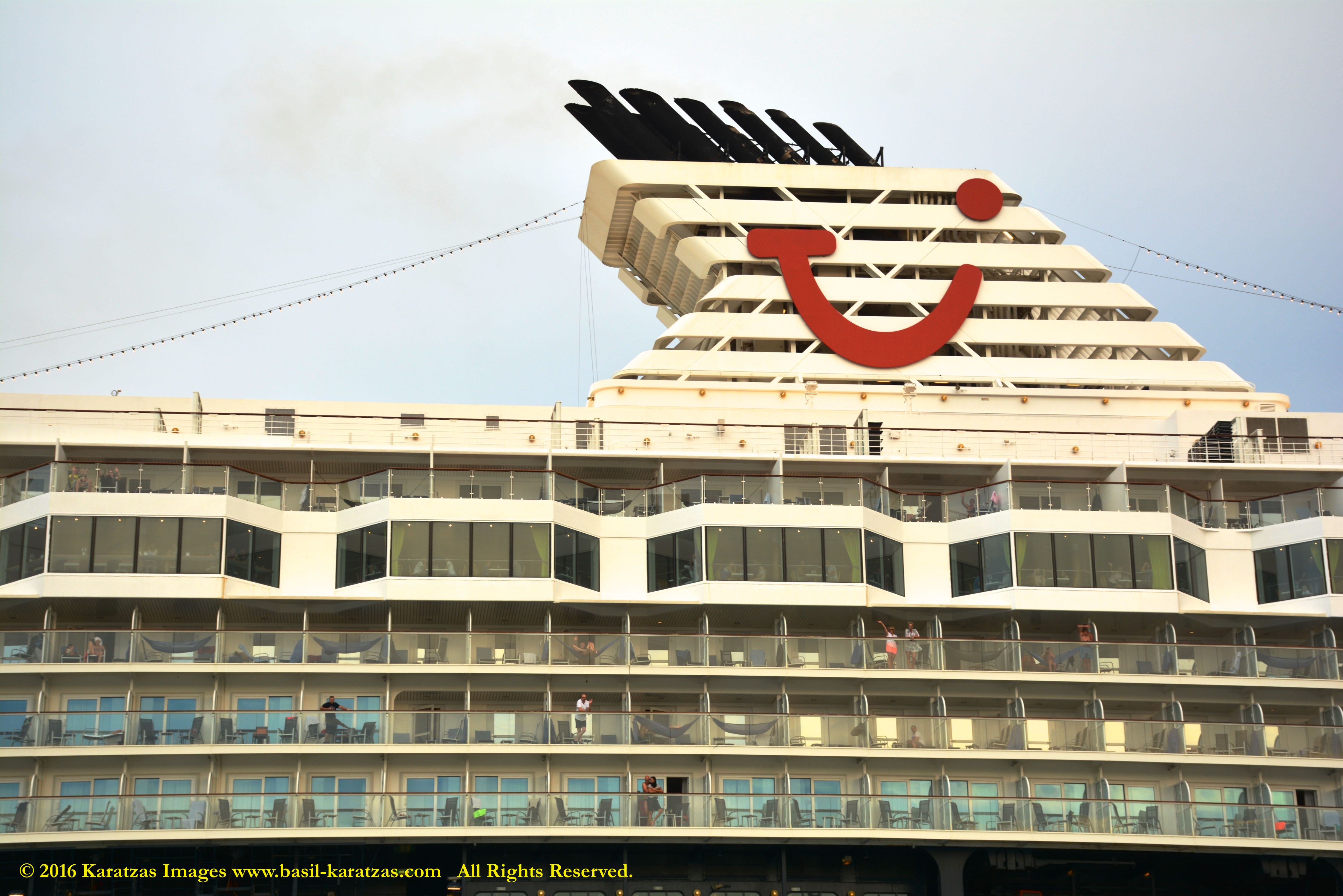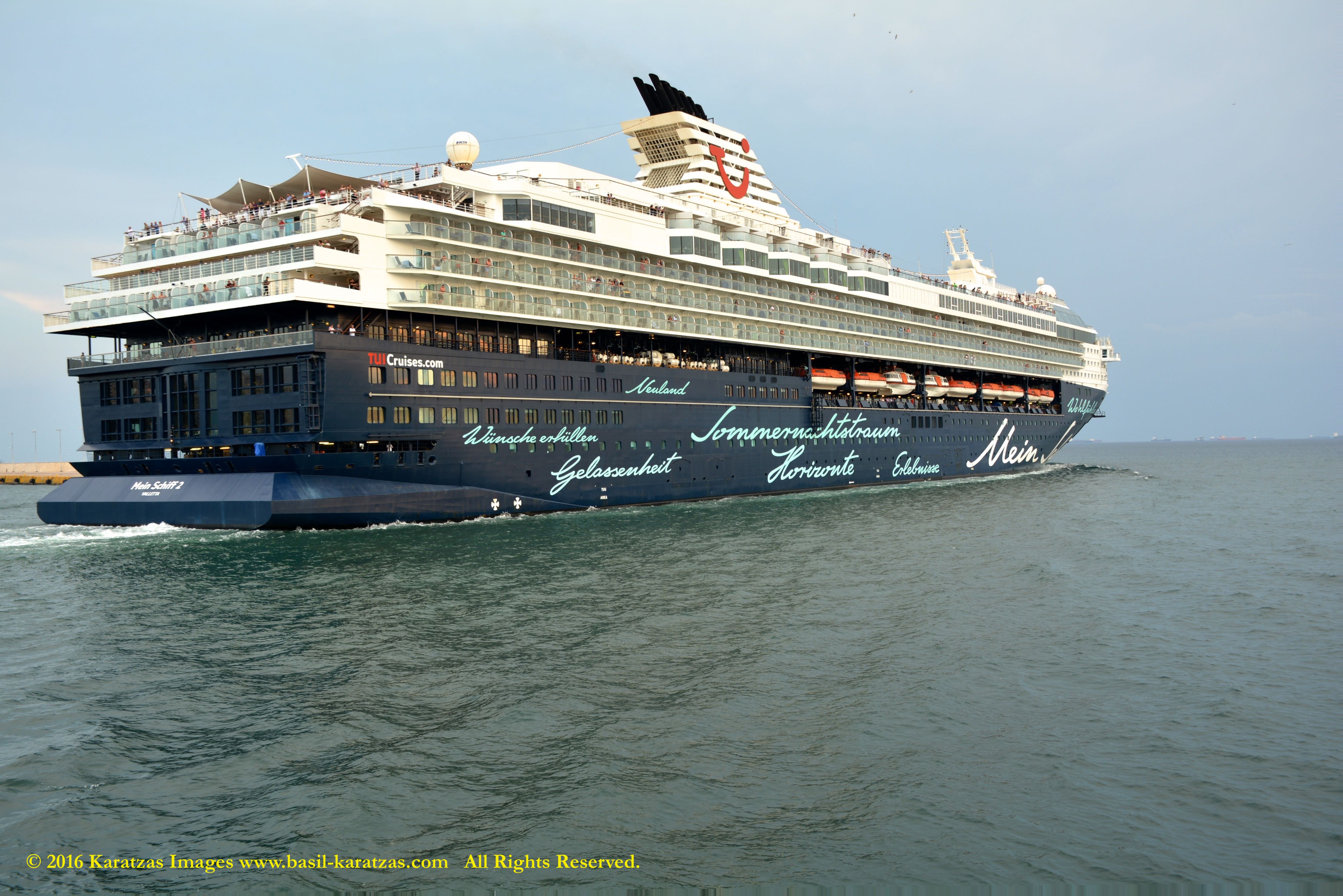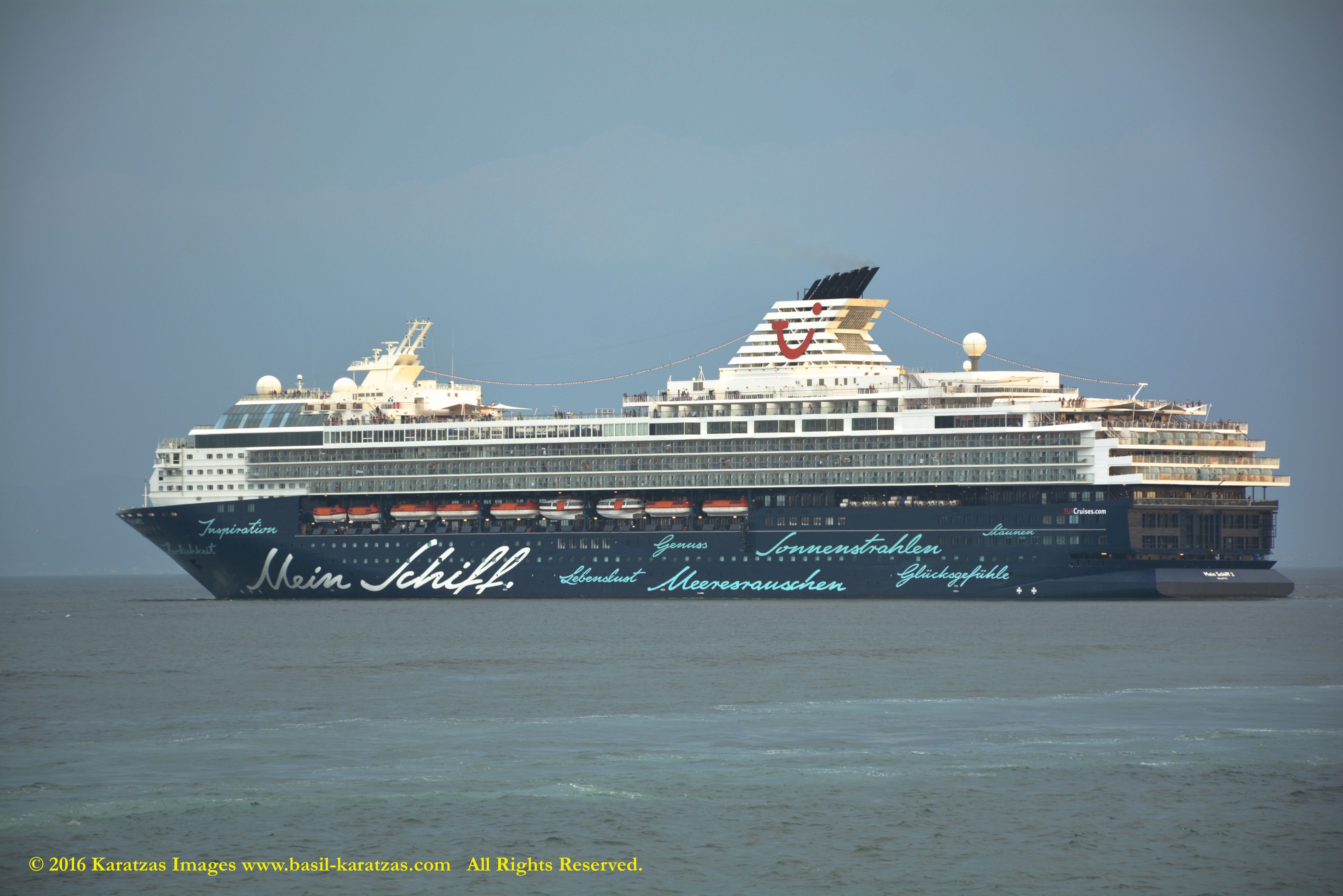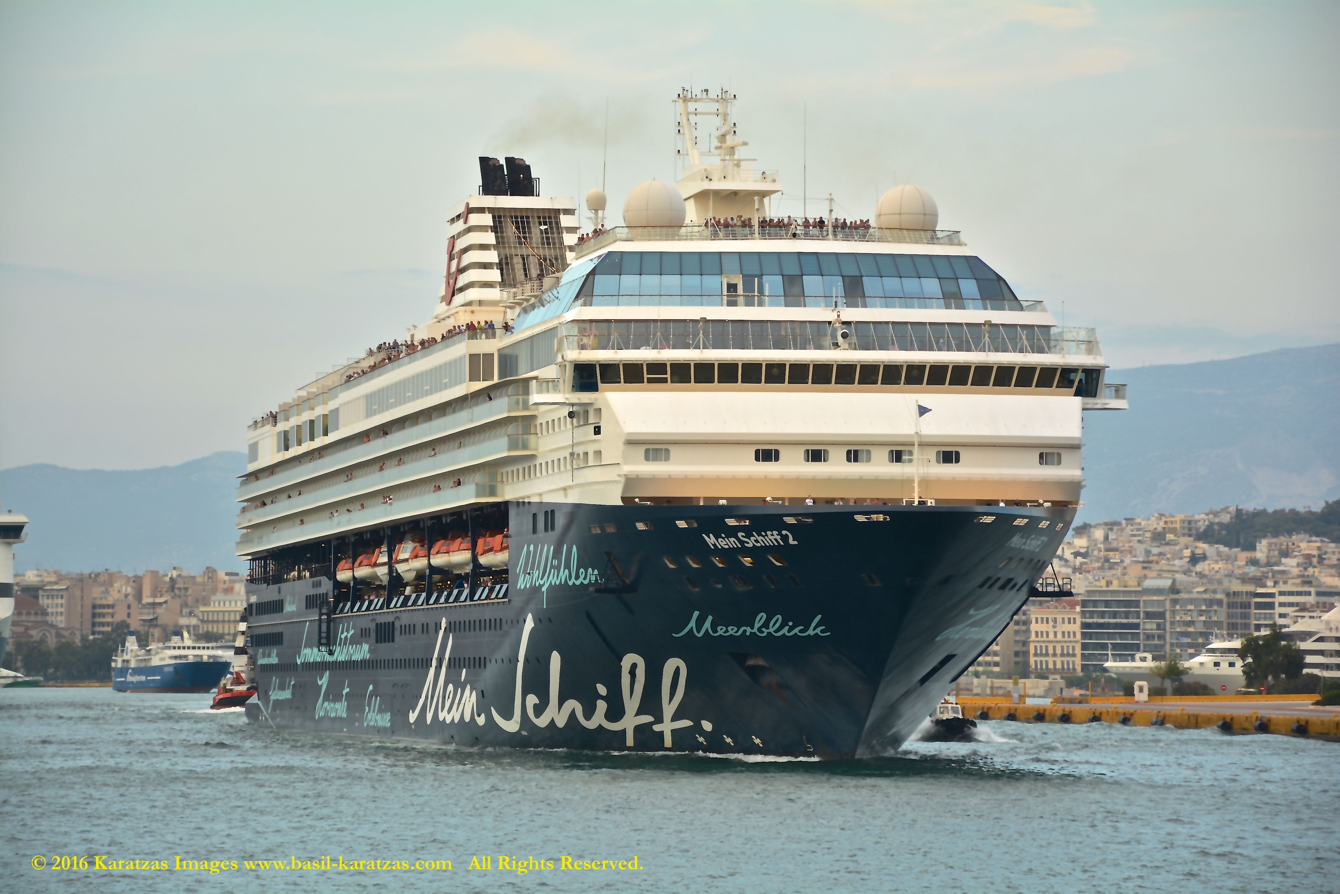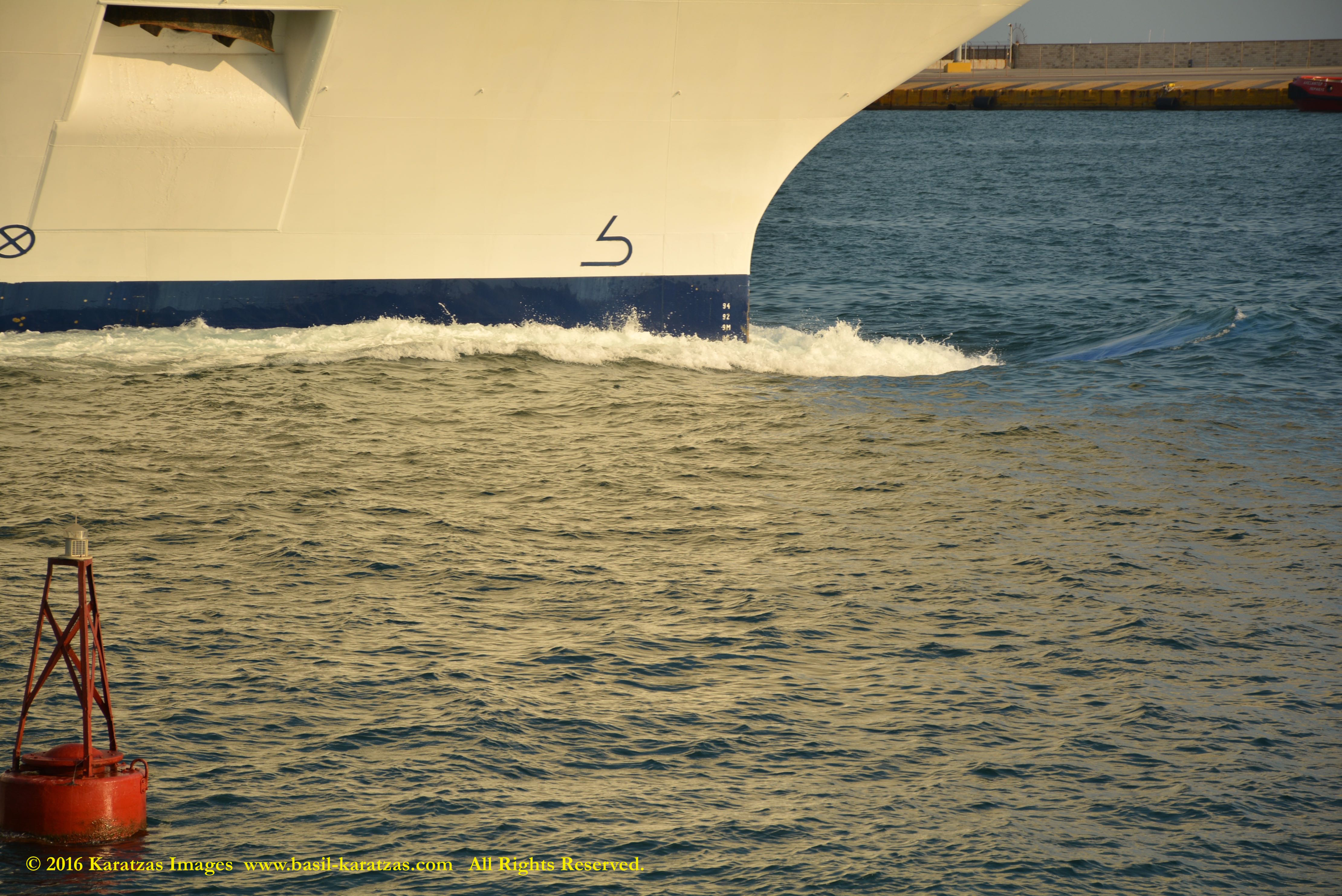 Medium size cruiseship, built 14 year ago at Meyer Werft at a price of US$350 mil for RCL, ‘Brilliance of the Seas’ departs the Port of the Piraeus on a sunny August afternoon. Image credit: Karatzas Images.