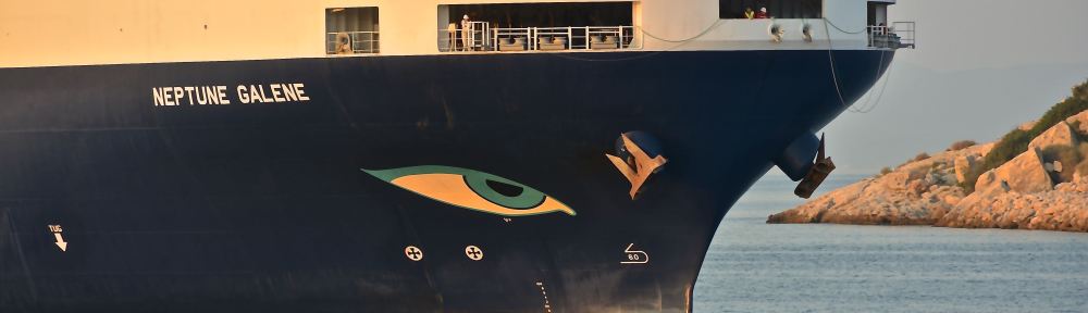 Built in 2014 at Hyundai Mipo, Korea, small car carrier MV ‘Neptune Galene’, with anthropomorphically decorated bow, entering the Port of Piraeus under a summer’s sunset. Image credit: Karatzas Images.