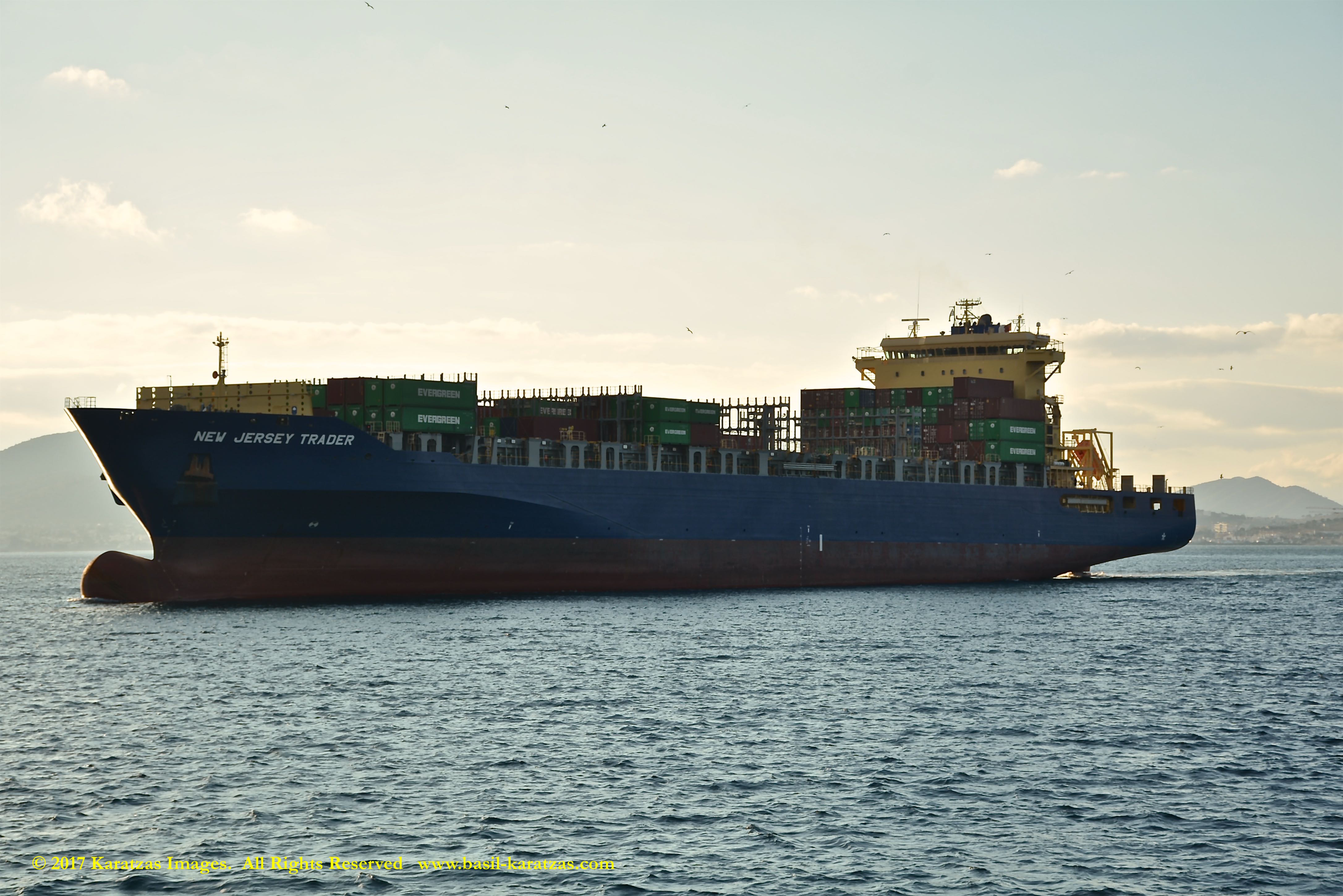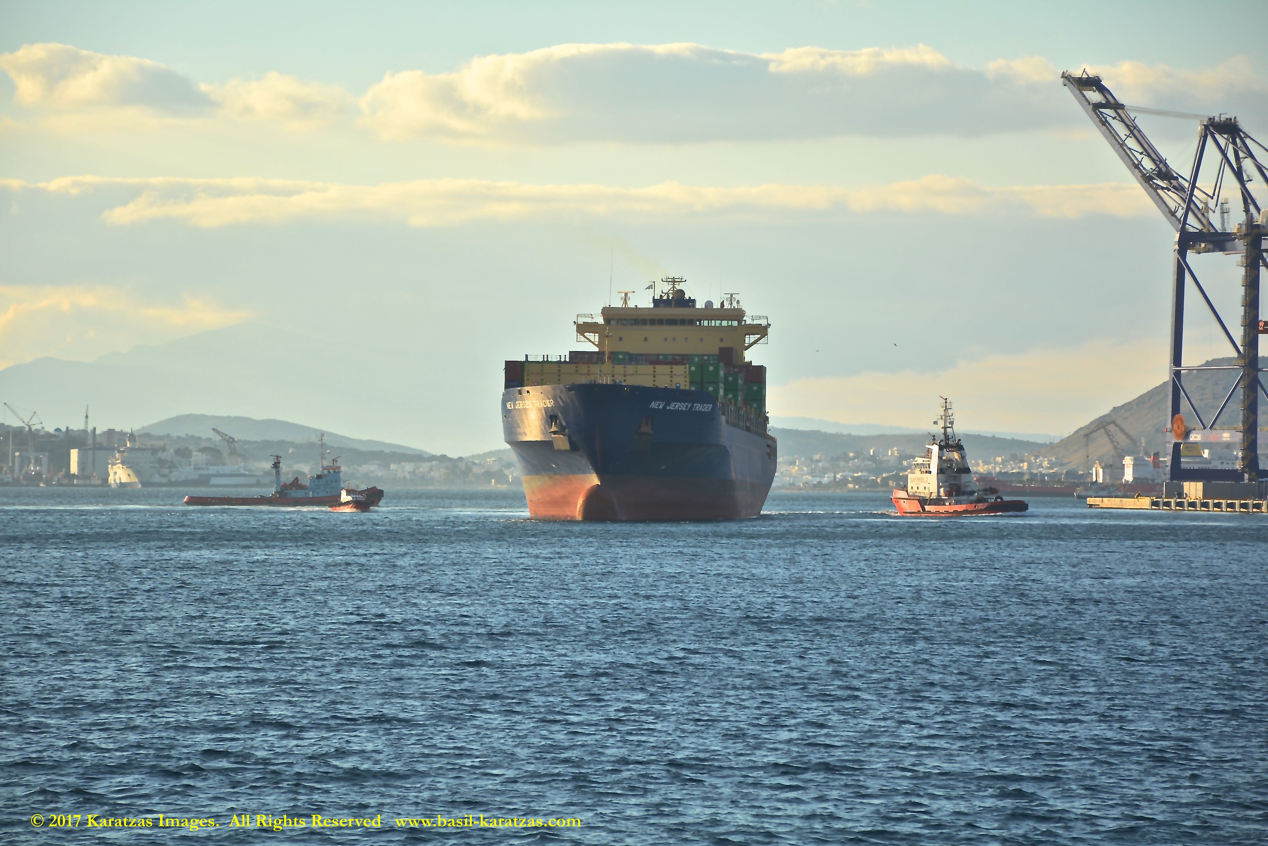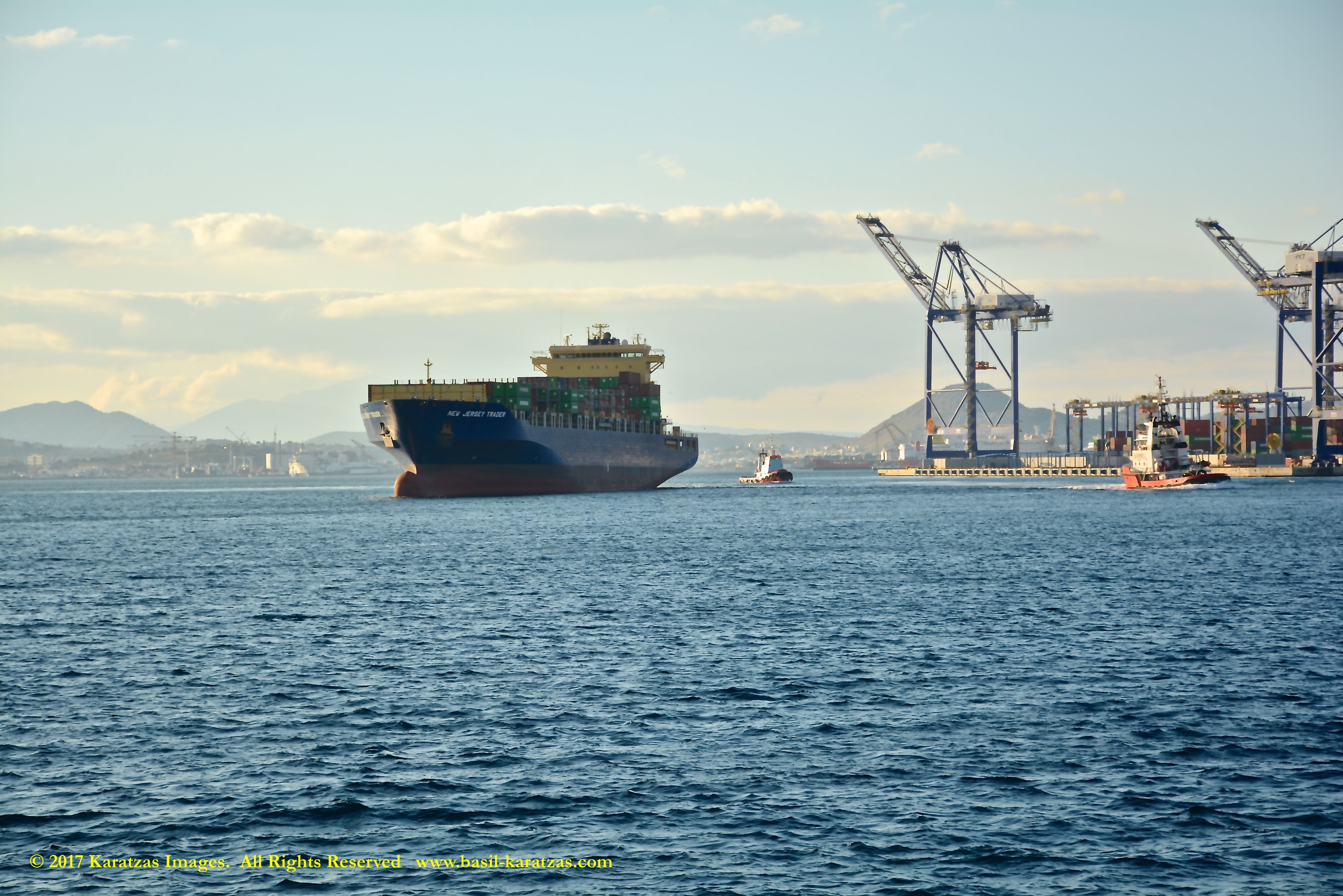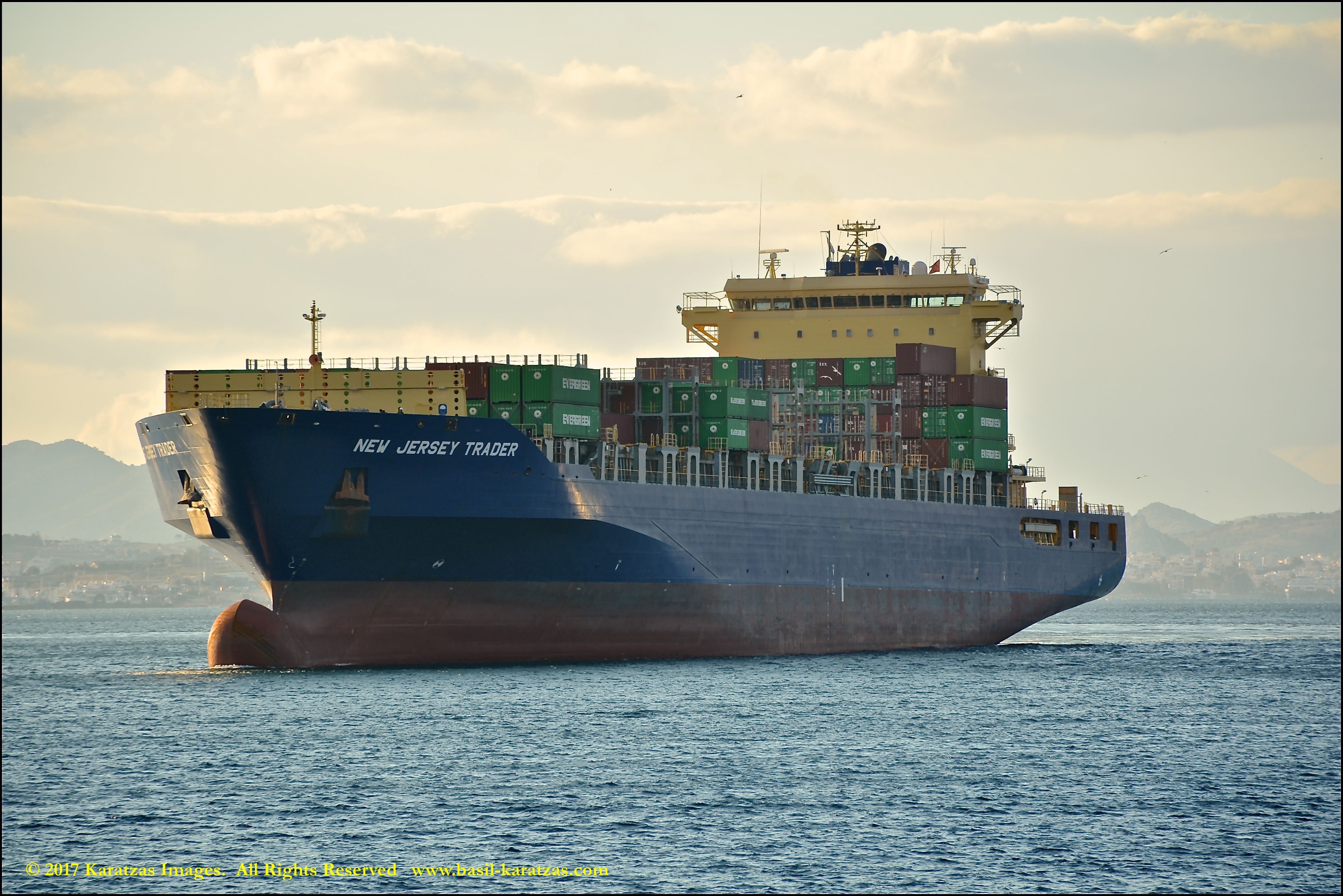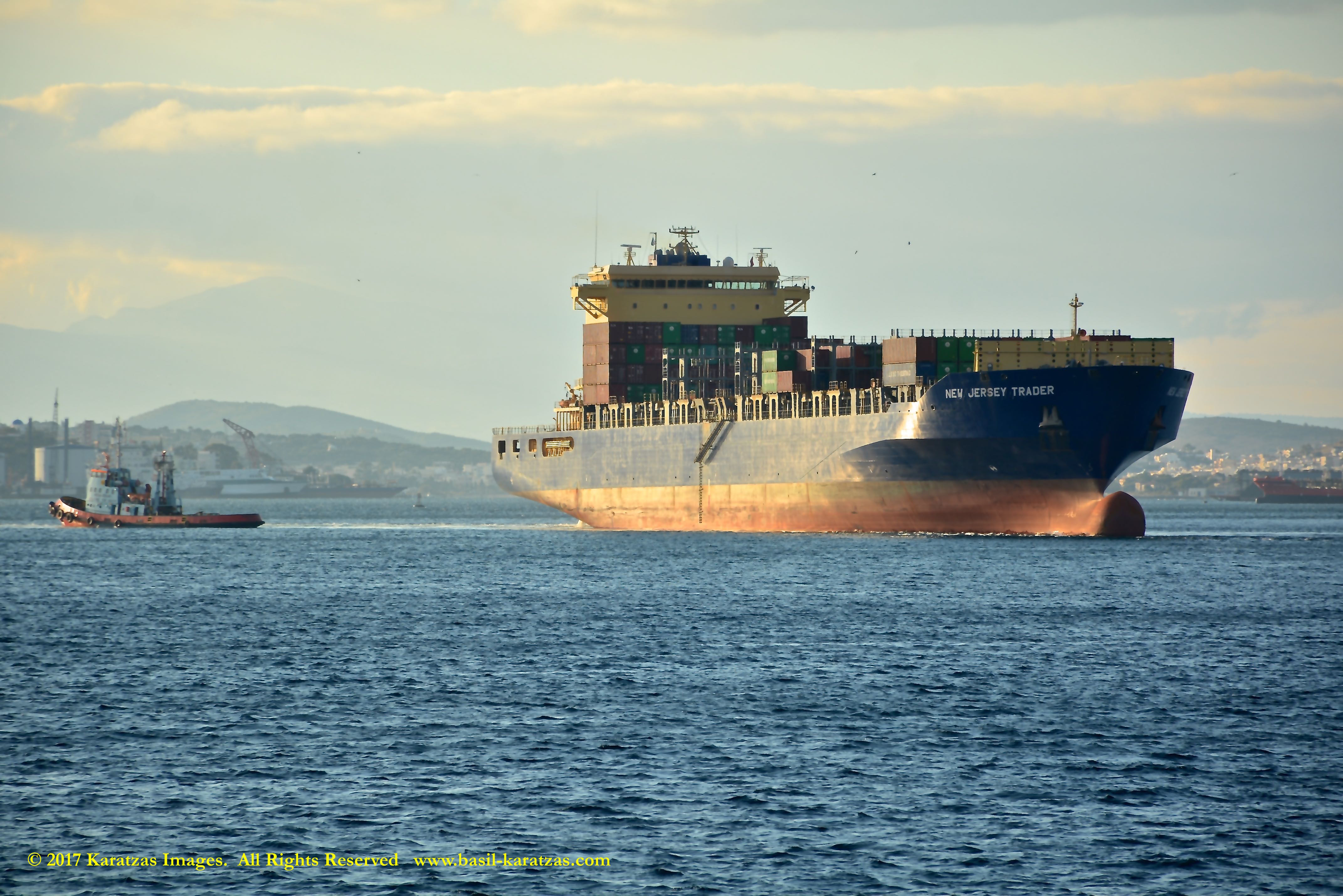 Sitting high in the water feeder containership MV ‘New Jersey Trader’ (2,750-teu, Guangzhou Wenchong, 2011) departing the Port of Piraeus under the Aegean sun on a winter day. Image credit: Karatzas Images.