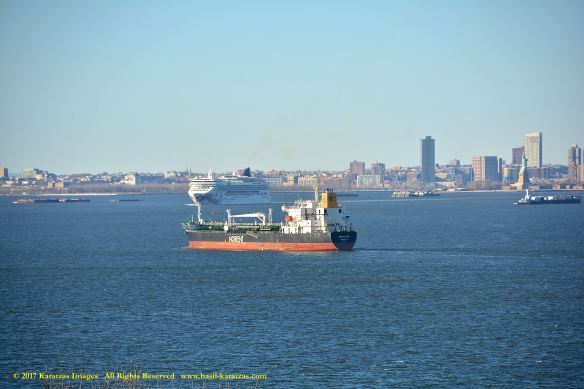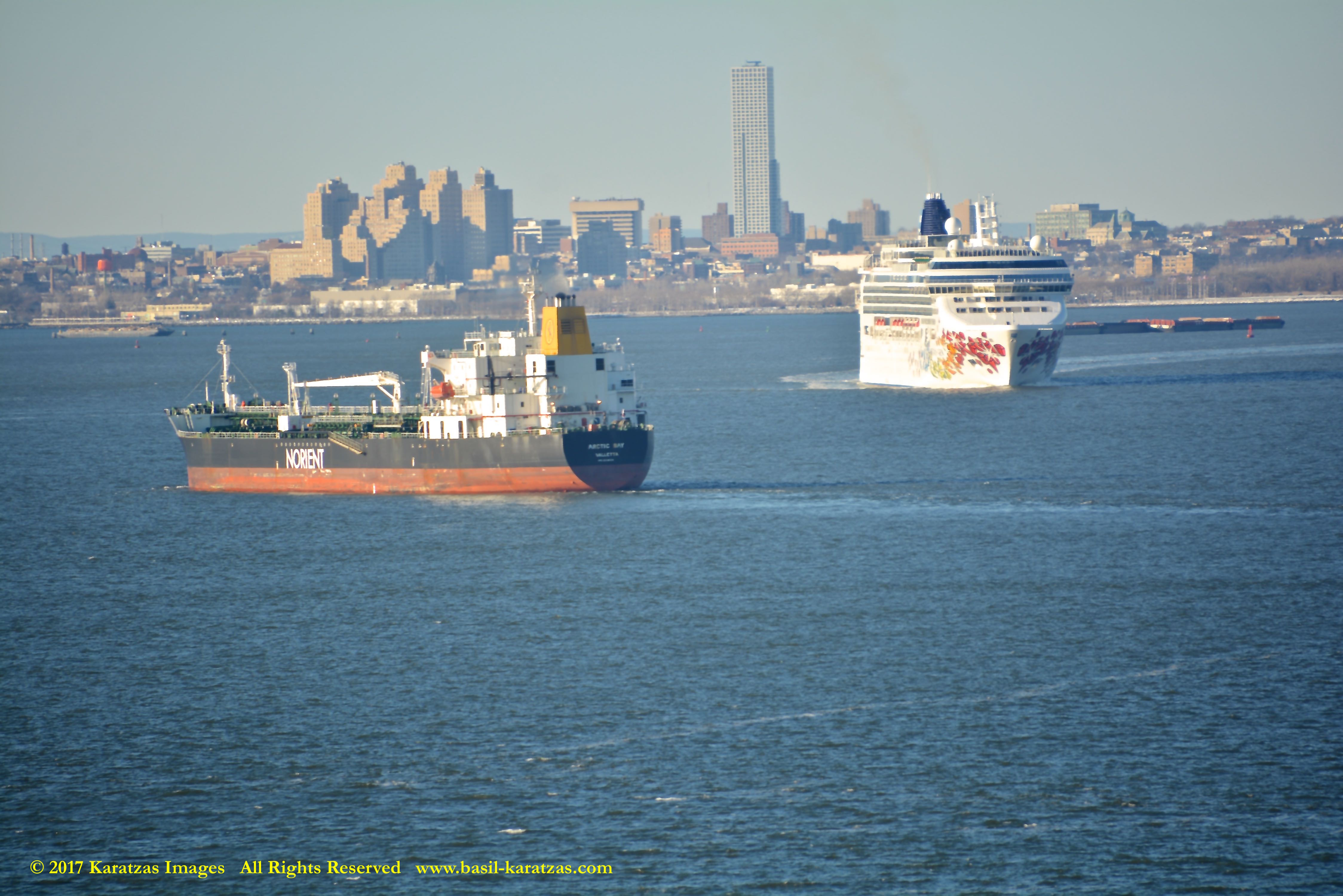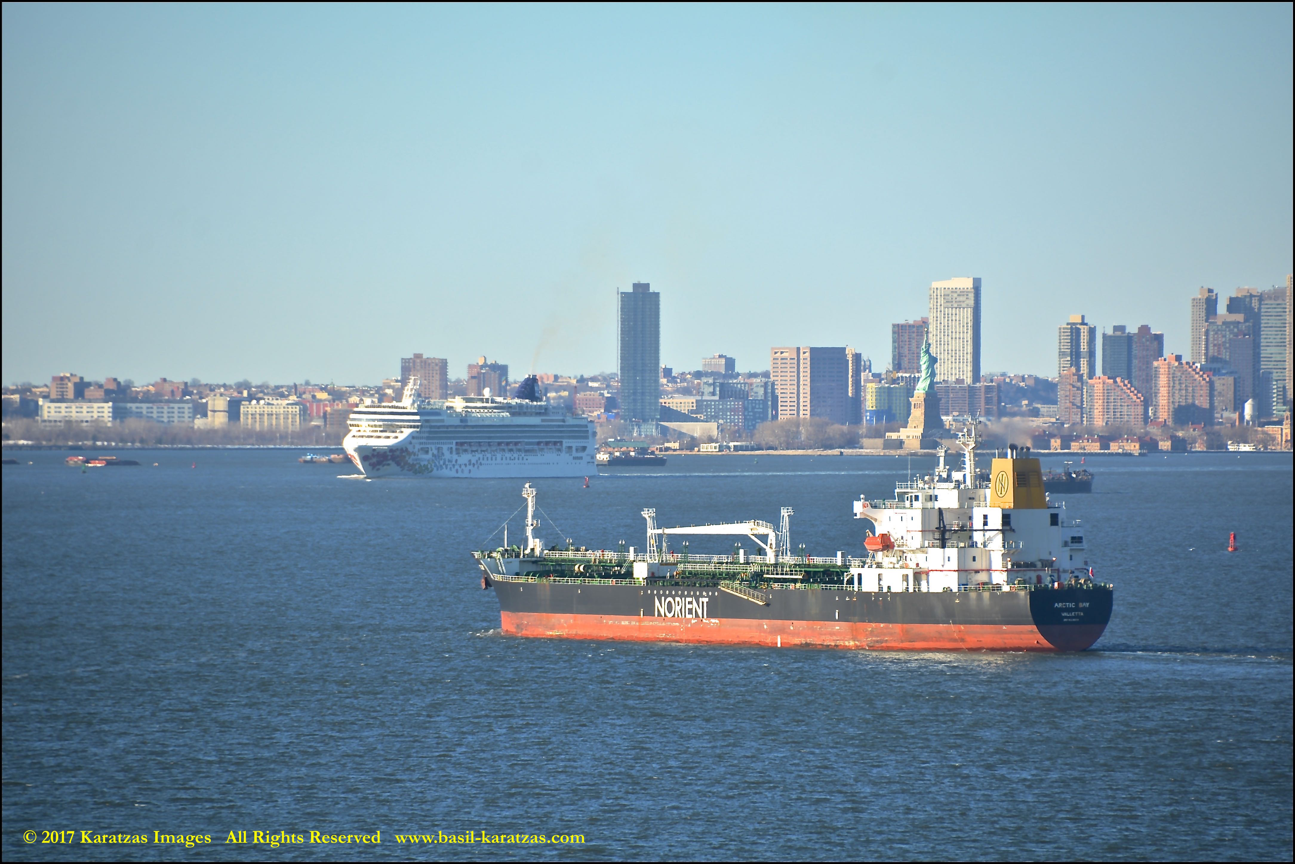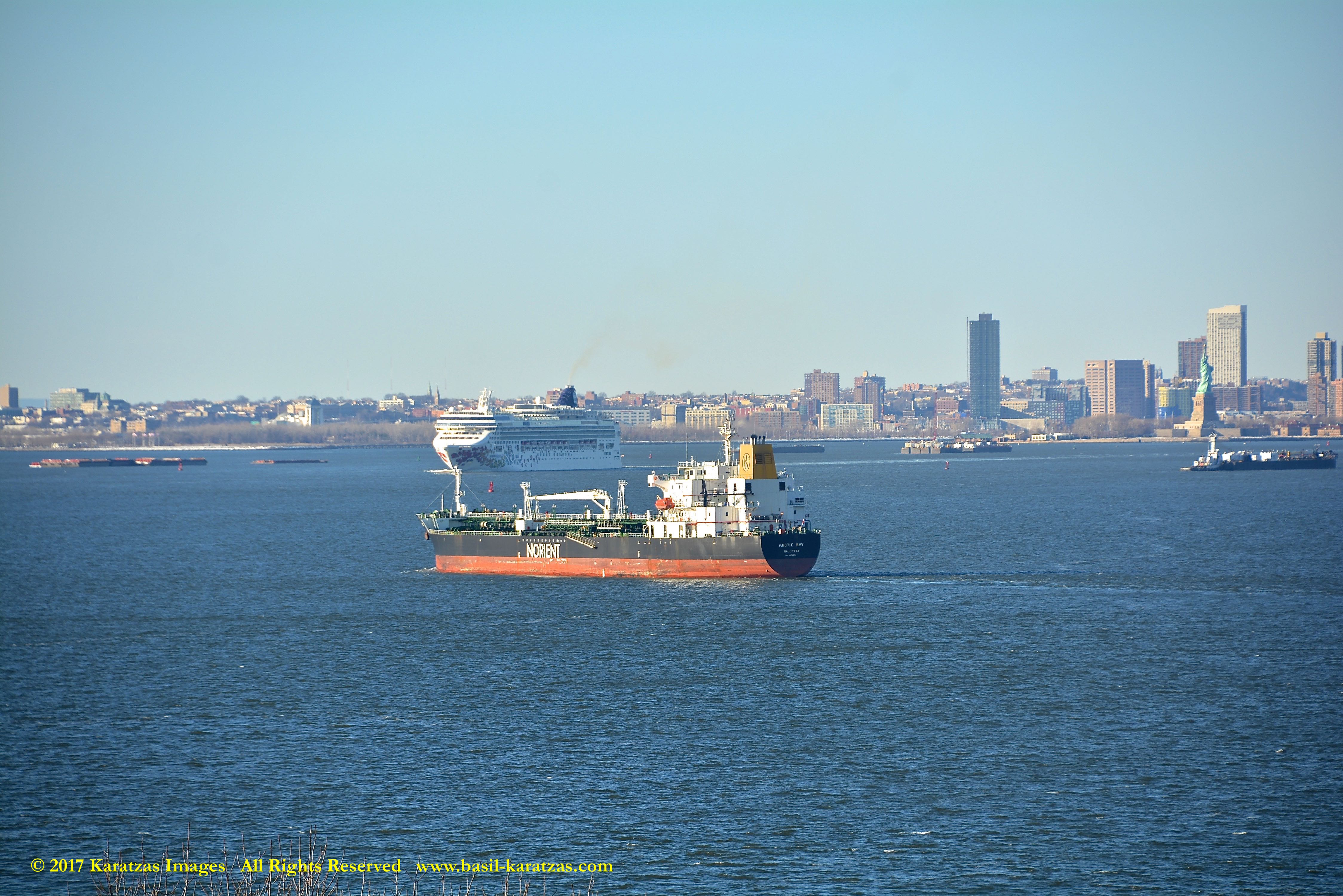 Built in 2006 at STX SB (Jinhae), products tanker MT ‘Arctic Bay’, entering the Upper New York Harbor, passing several landmarks on the way. Here, seen against the Statue of Liberty; cruiseship MV ‘Norwegian Gem’ is outbound. Image credit: Karatzas Images.