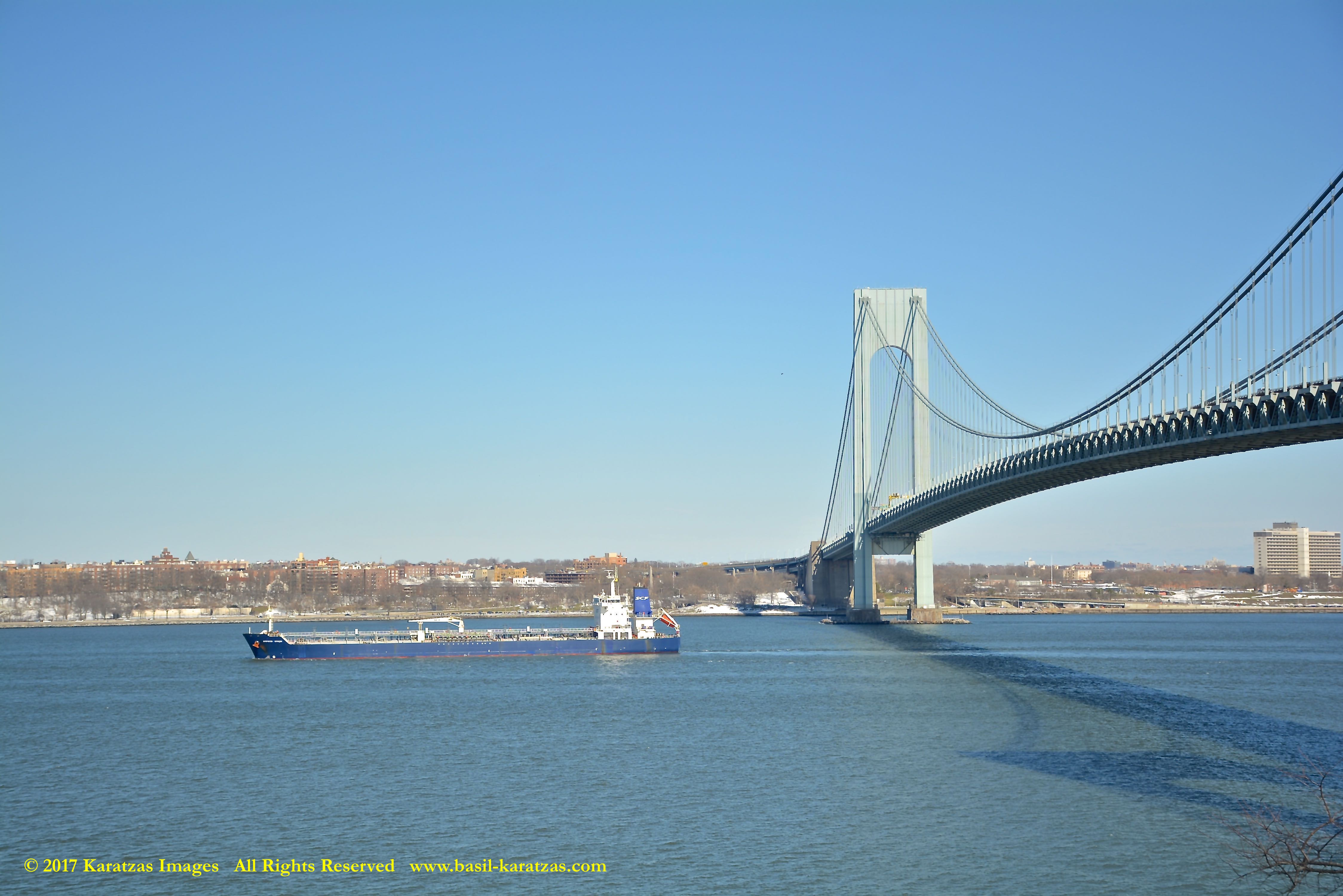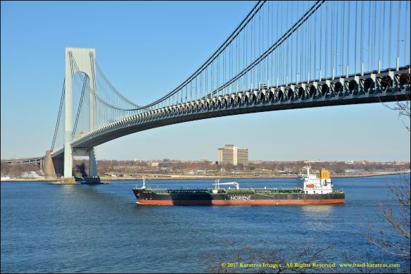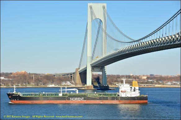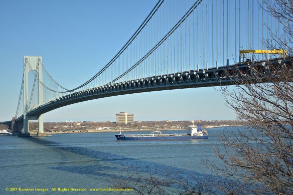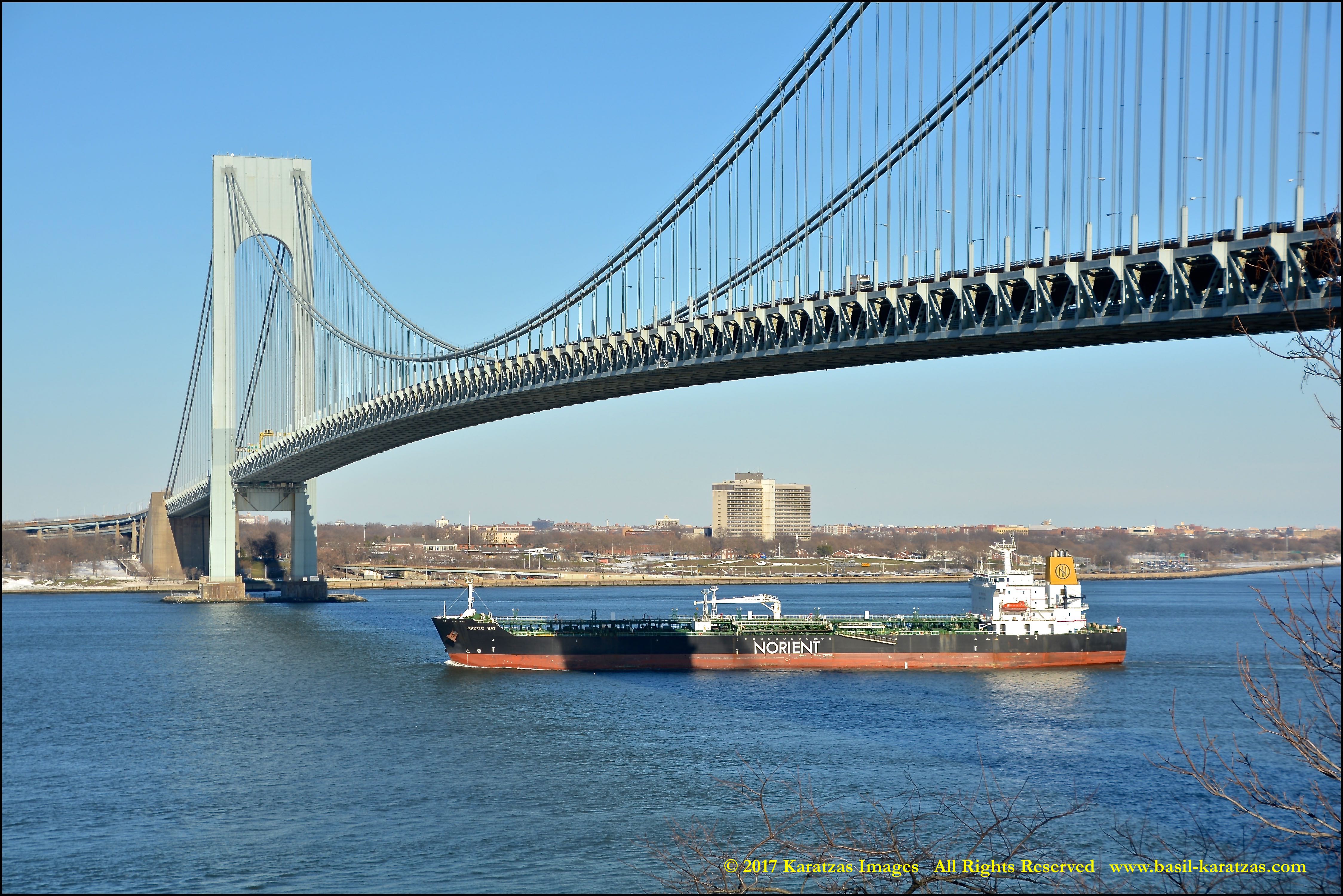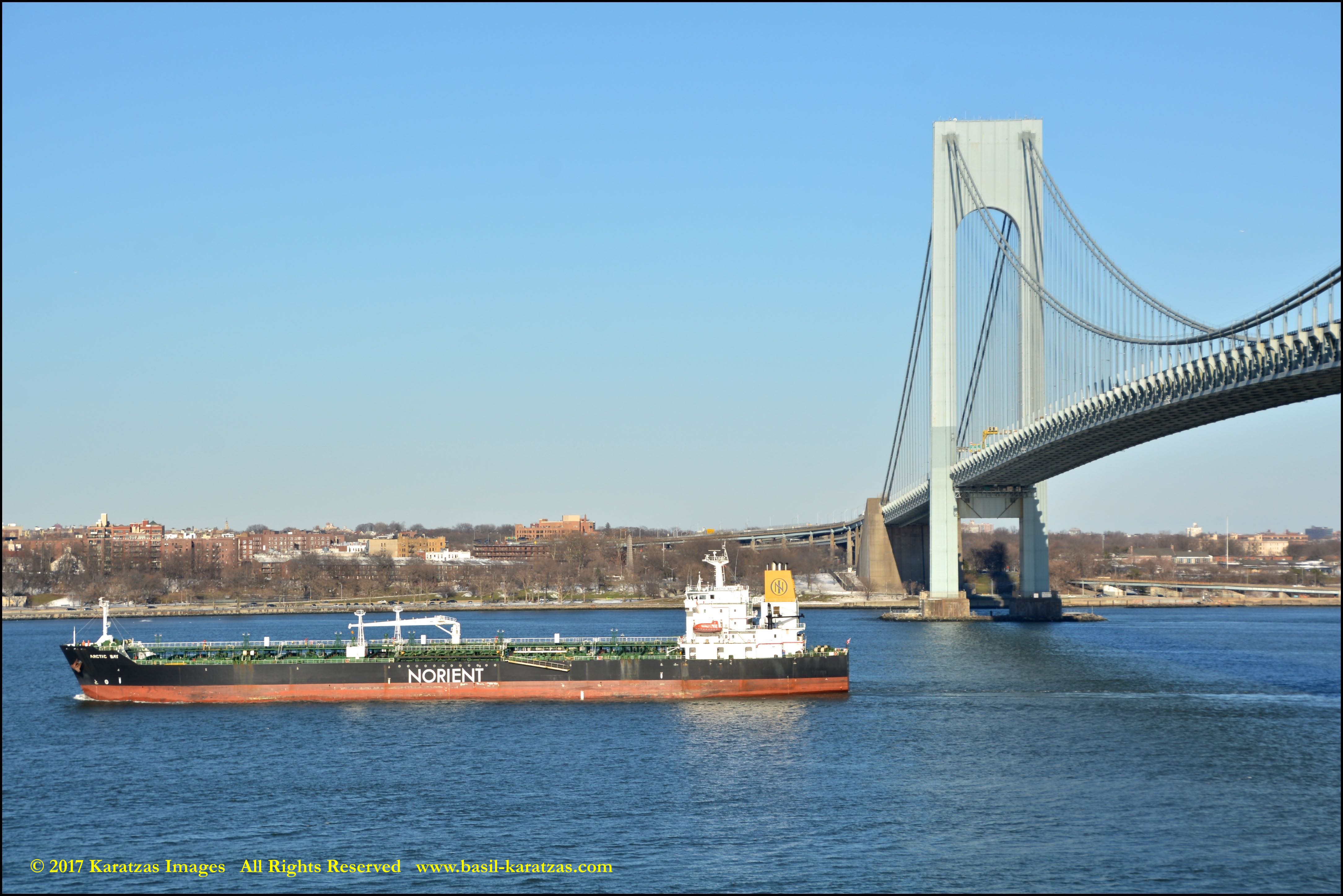Built in 2006 at STX SB (Jinhae), products tanker MT ‘Arctic Bay’, entering the Upper New York Harbor, passing several landmarks on the way. Here, passing under the Verrazzano Narrows Bridge. Image credit: Karatzas Images.