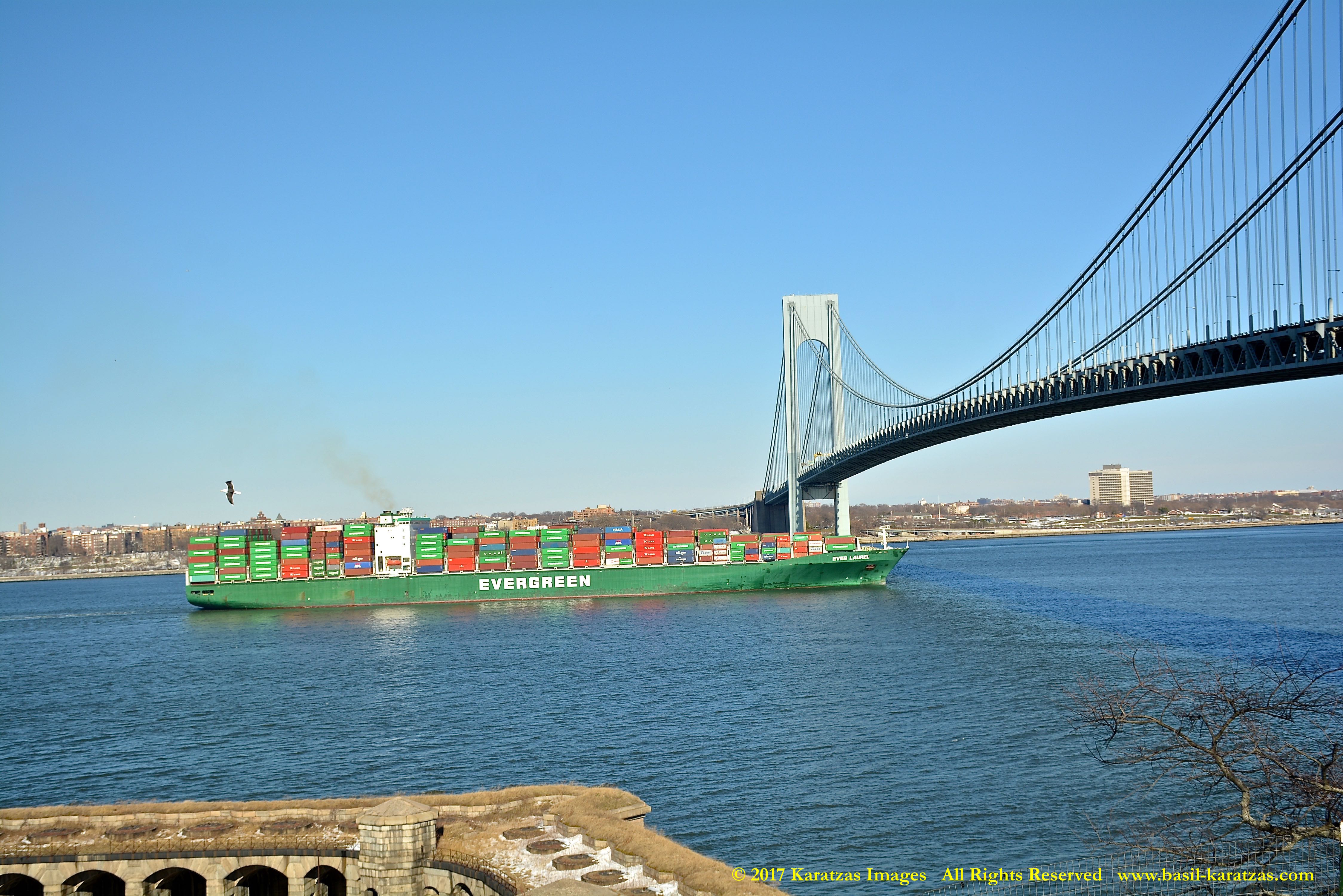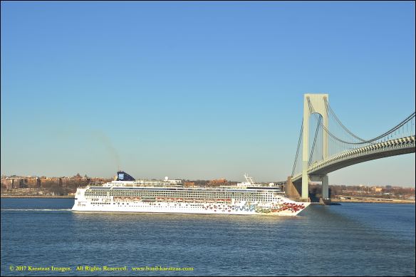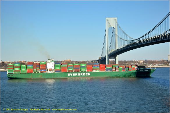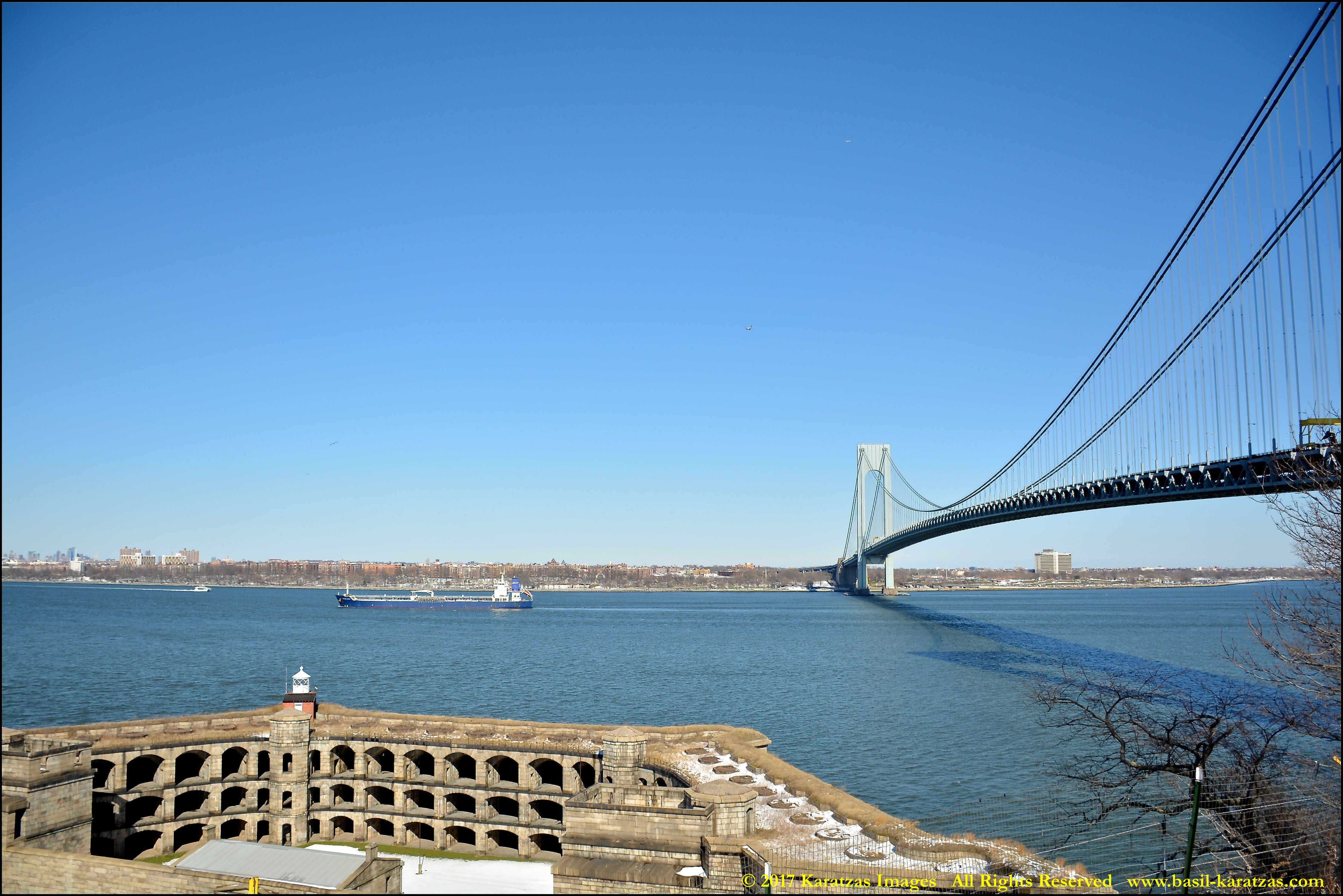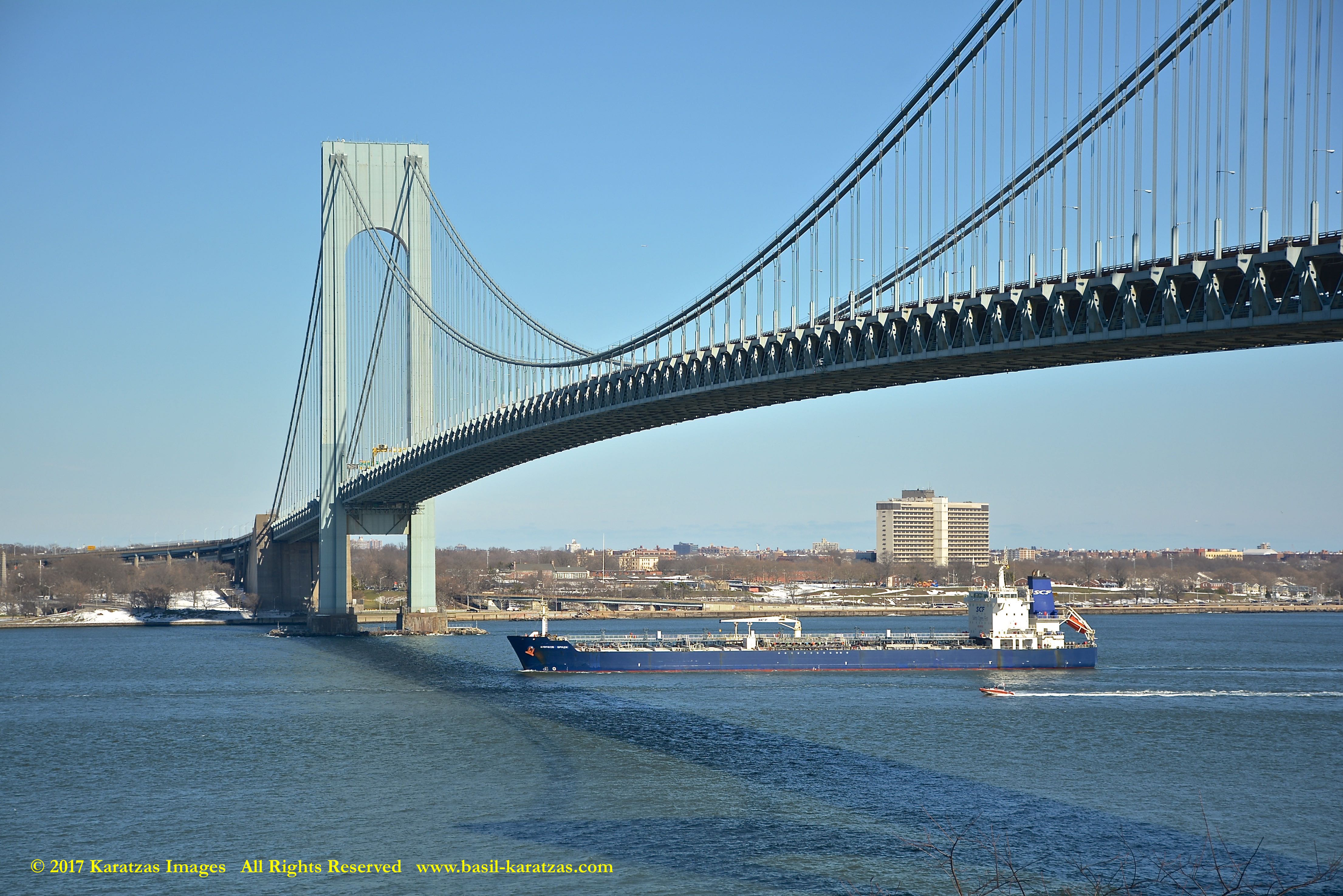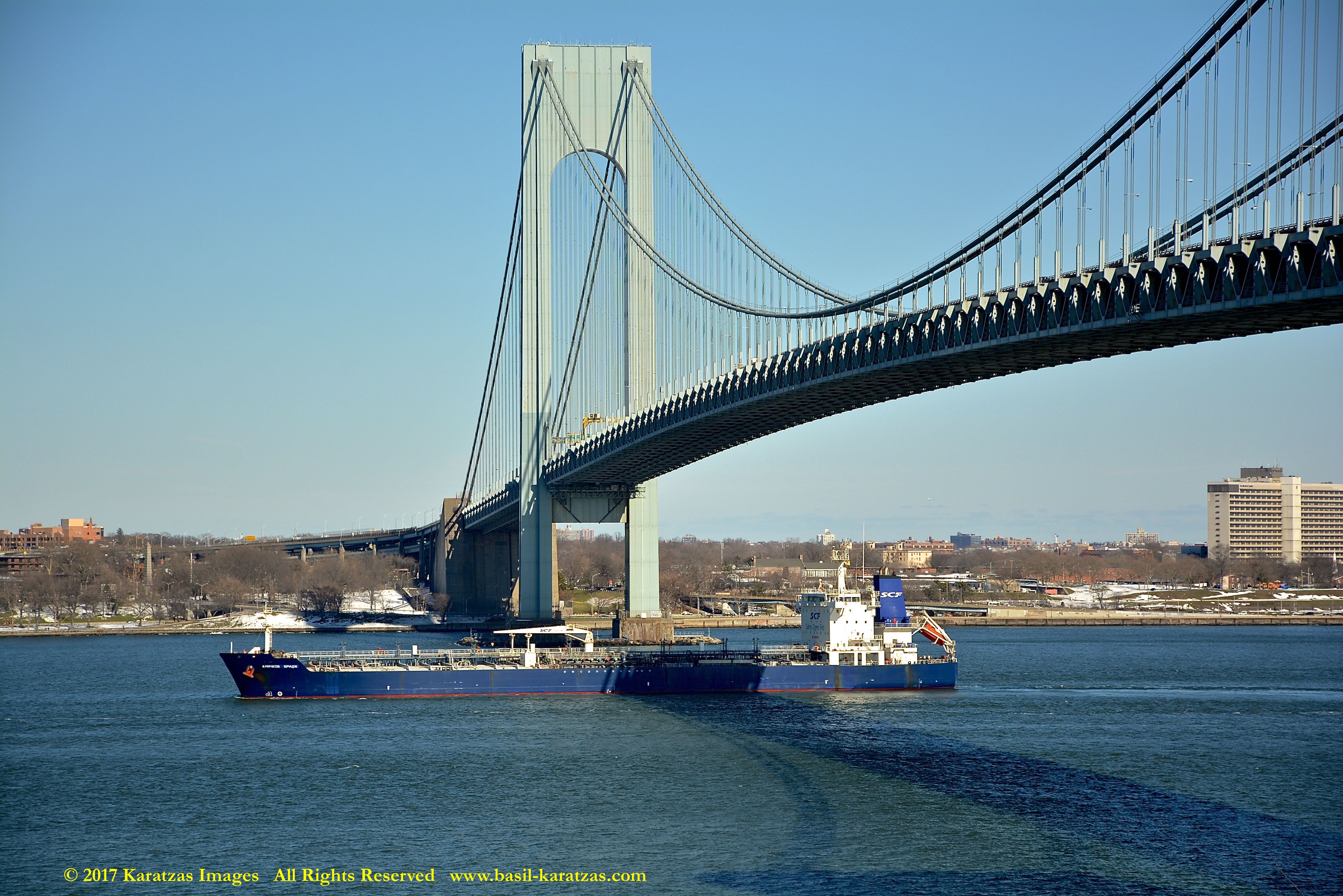 Built in 2006 at STX SB (Jinhae), products tanker MT ‘Arctic Bay’, entering the Upper New York Harbor, passing several landmarks on the way. Here, passing under the Verrazzano Narrows Bridge. Image credit: Karatzas Images.