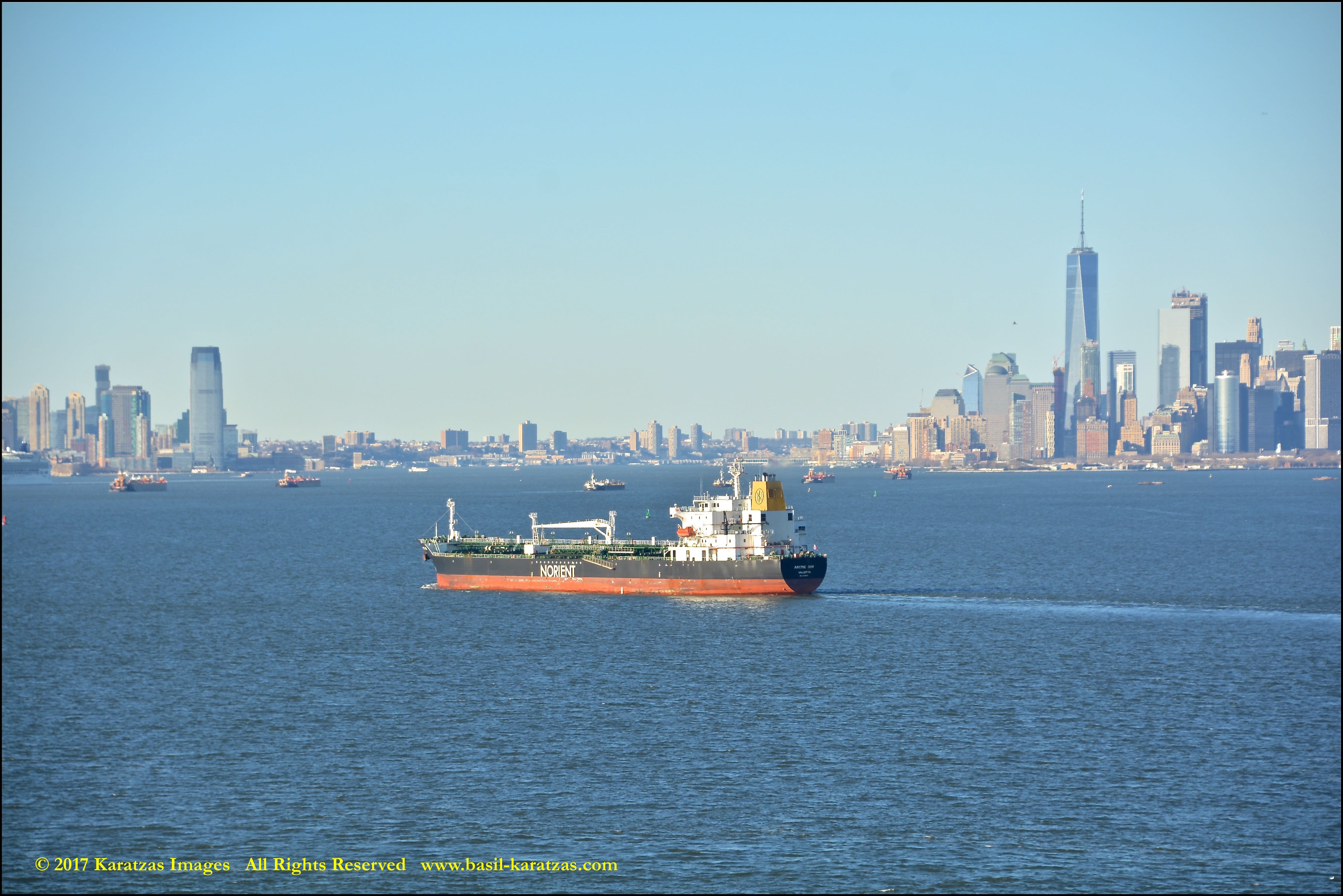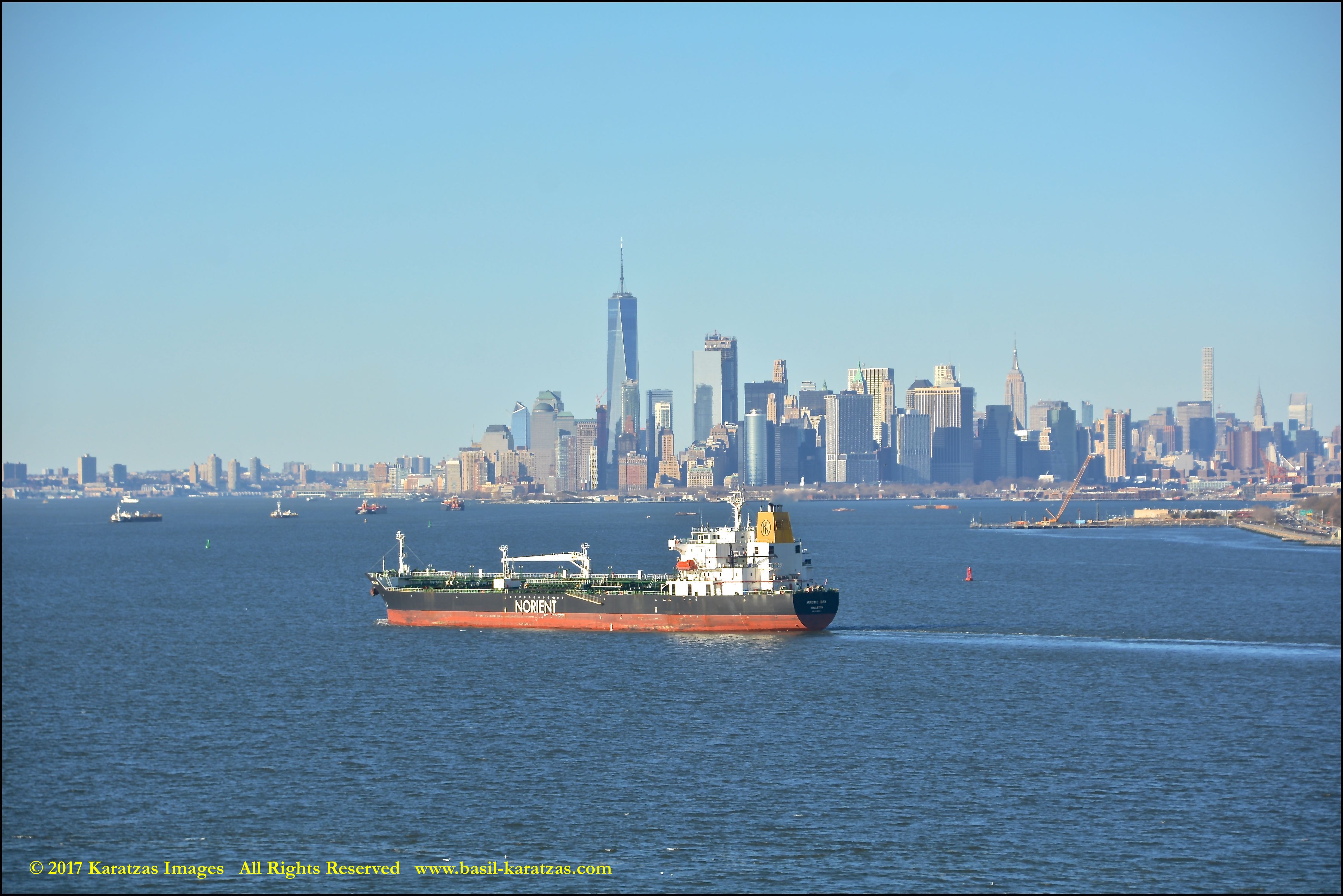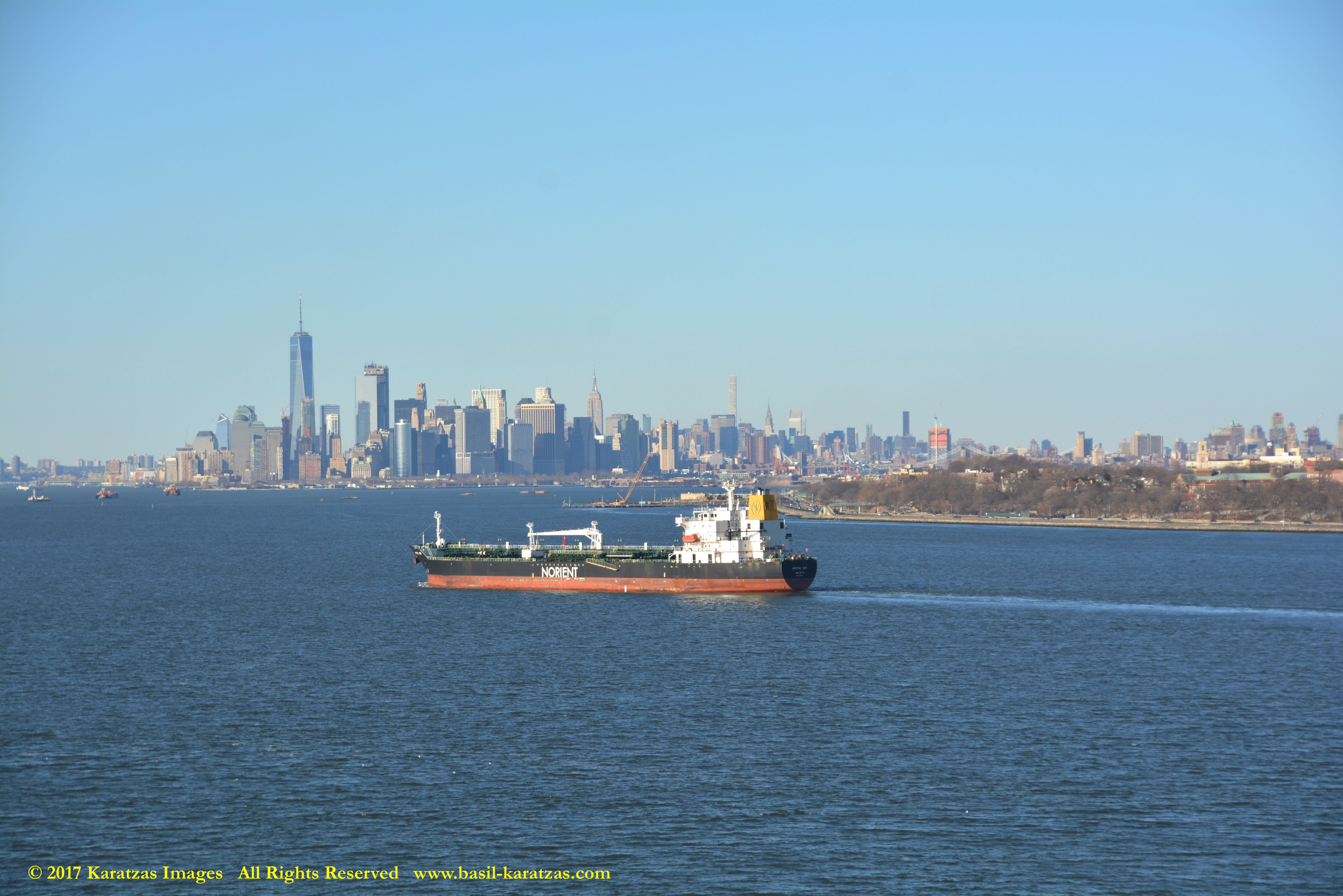 Built in 2006 at STX SB (Jinhae), products tanker MT ‘Arctic Bay’, entering the Upper New York Harbor, passing several landmarks on the way. Image credit: Karatzas Images.