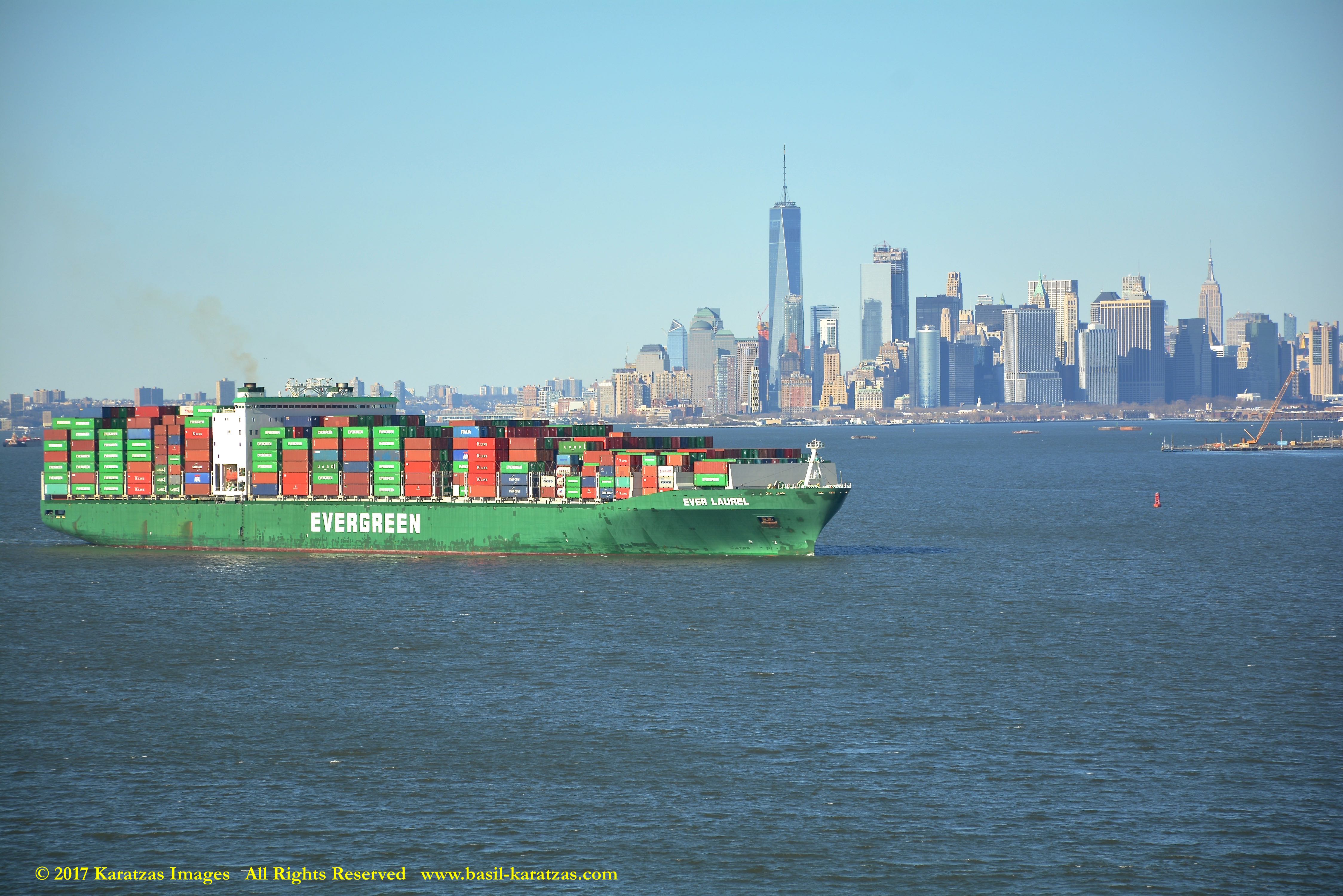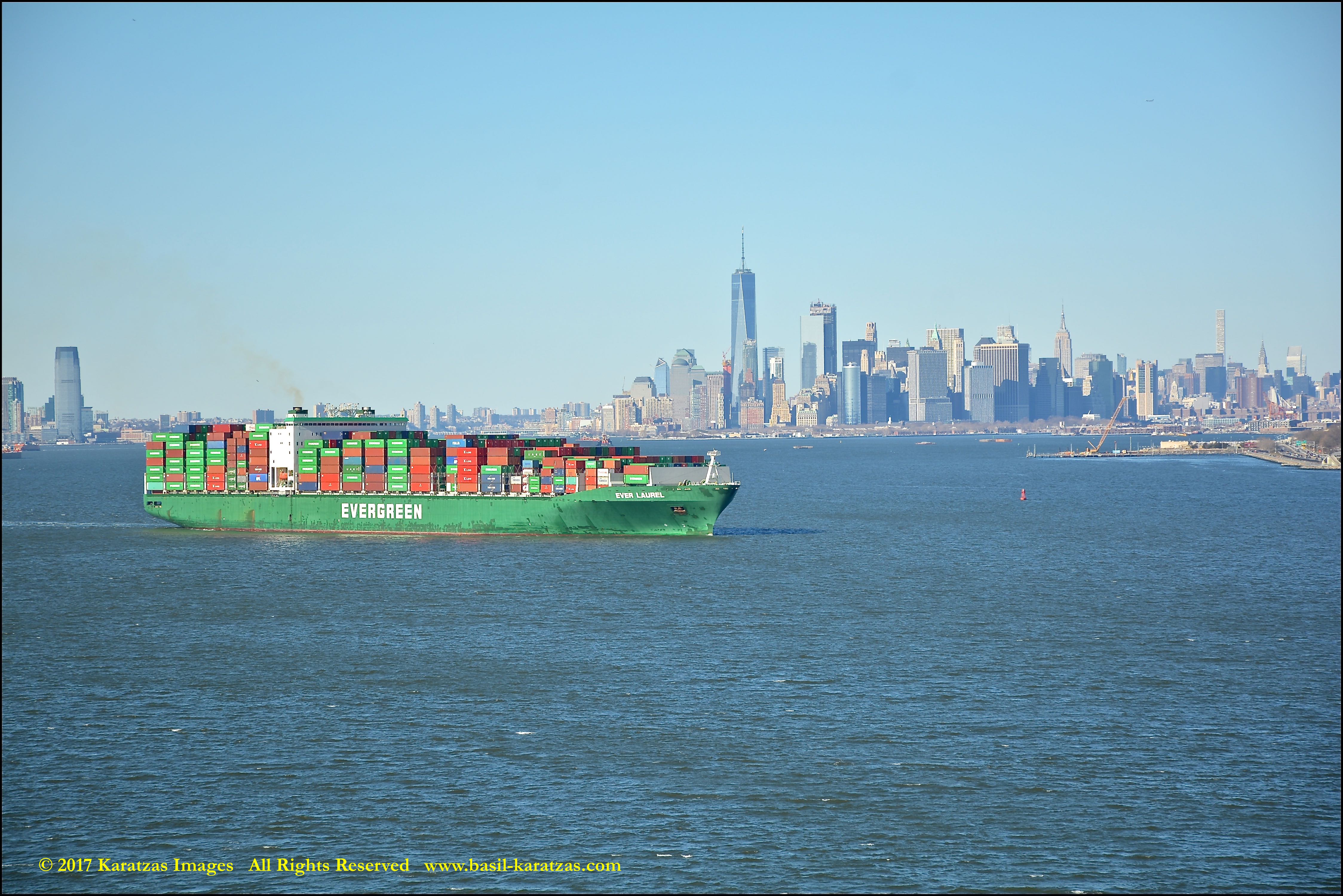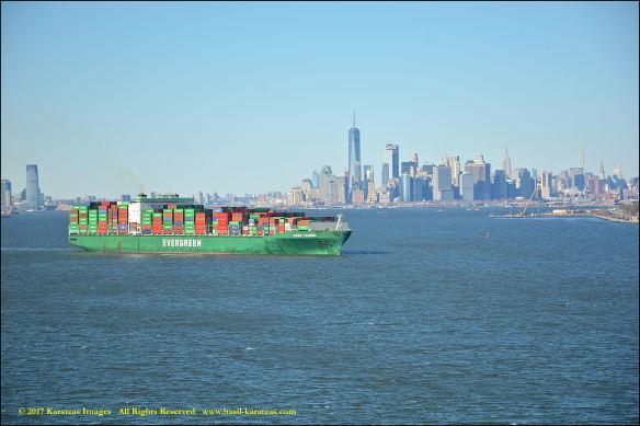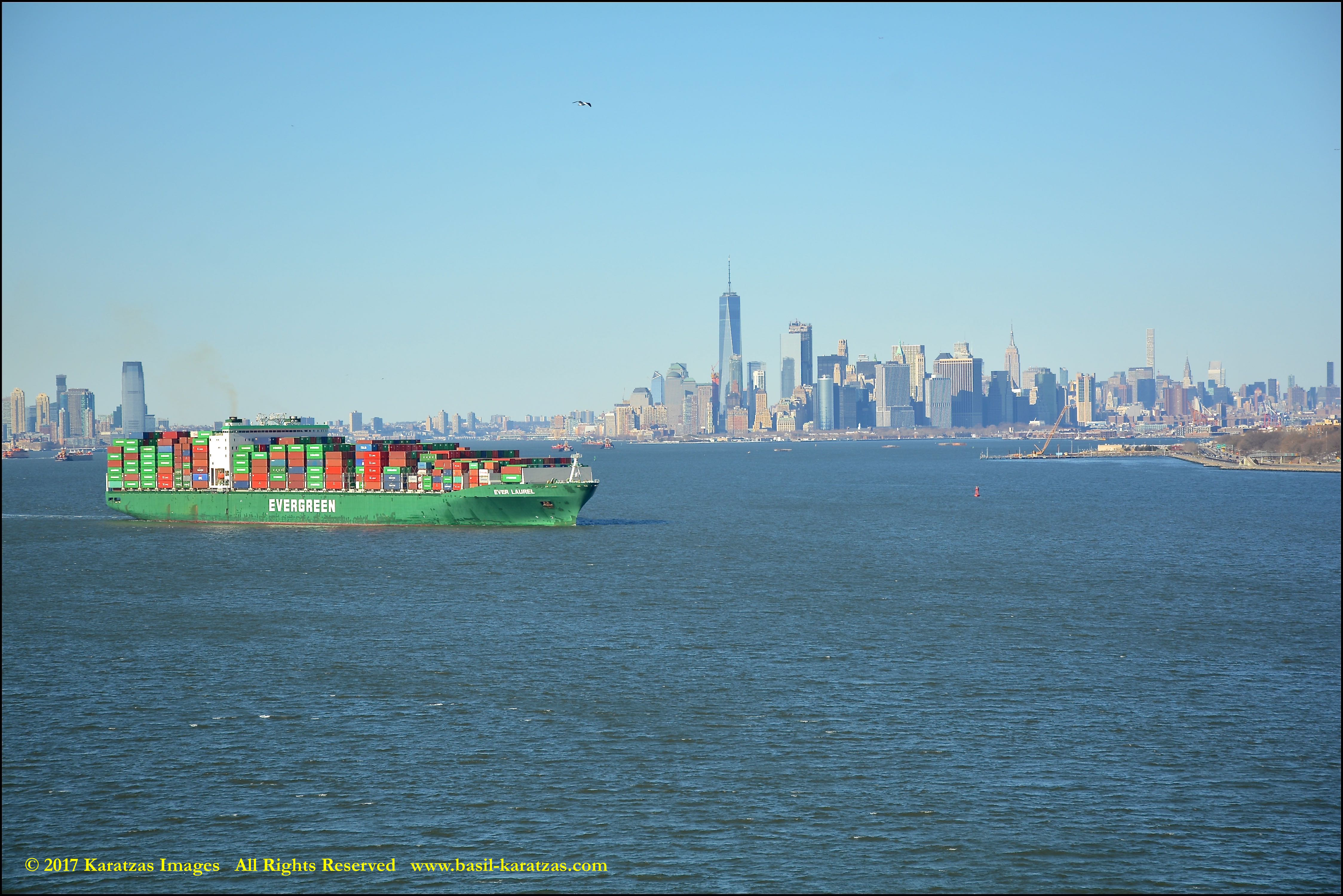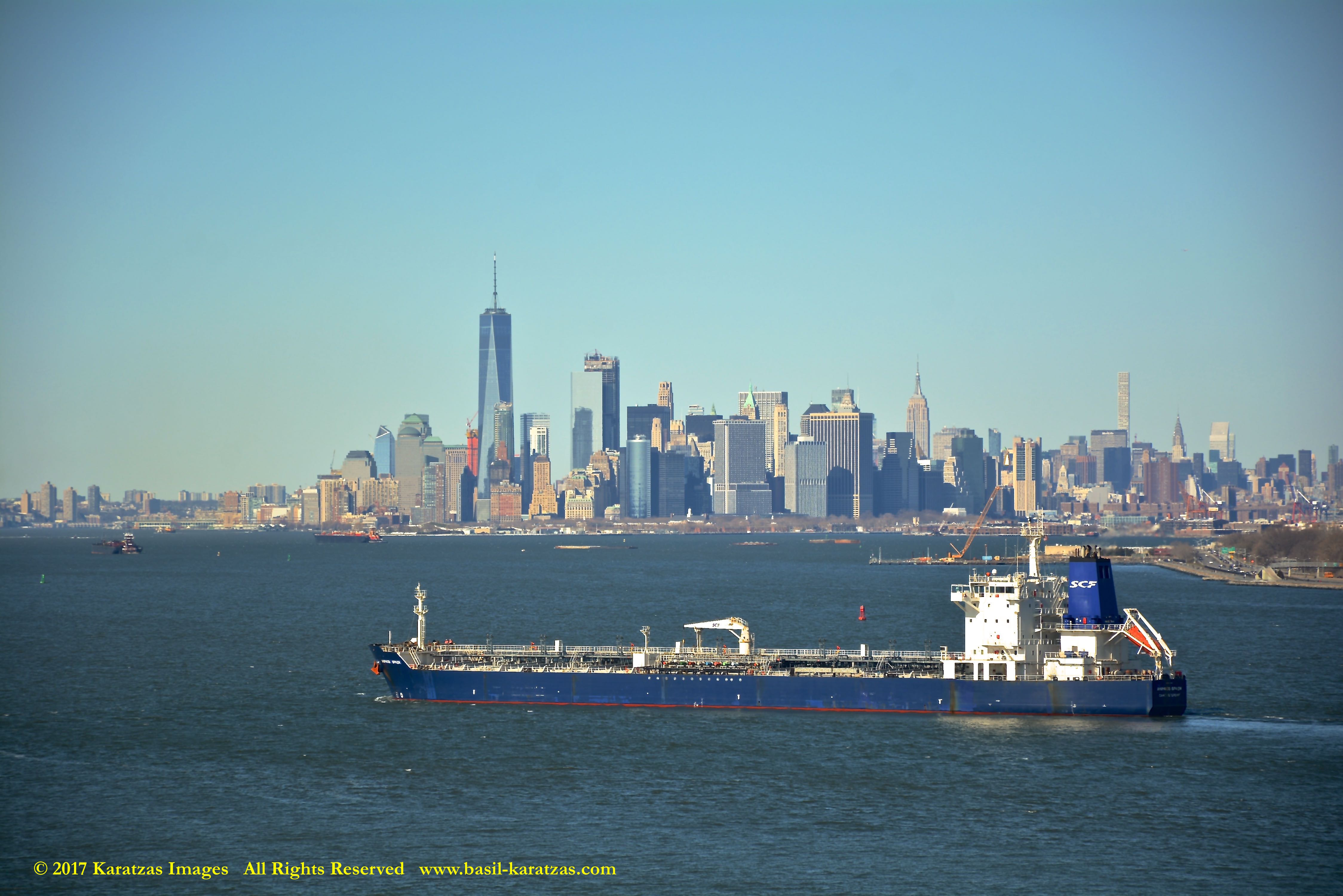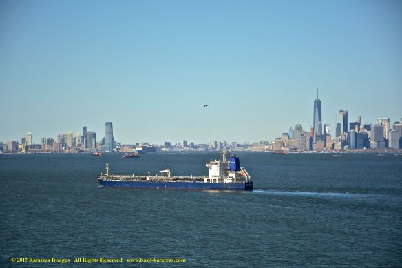 Built in 2006 at STX SB (Jinhae), products tanker MT ‘Arctic Bay’, entering the Upper New York Harbor, passing several landmarks on the way. Here, seen against the Lower Manhattan skyline and the World Trade Center tower. Image credit: Karatzas Images.