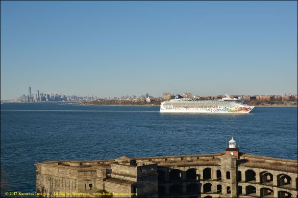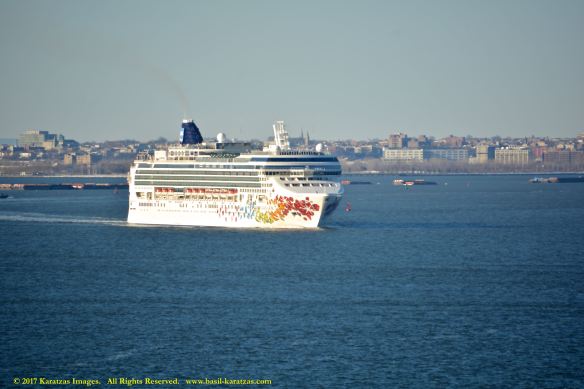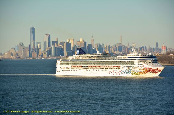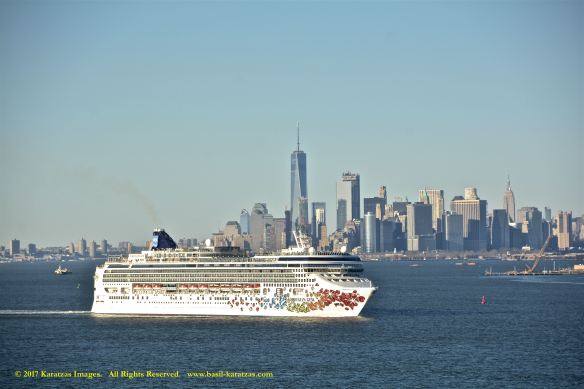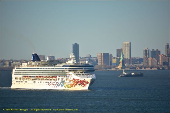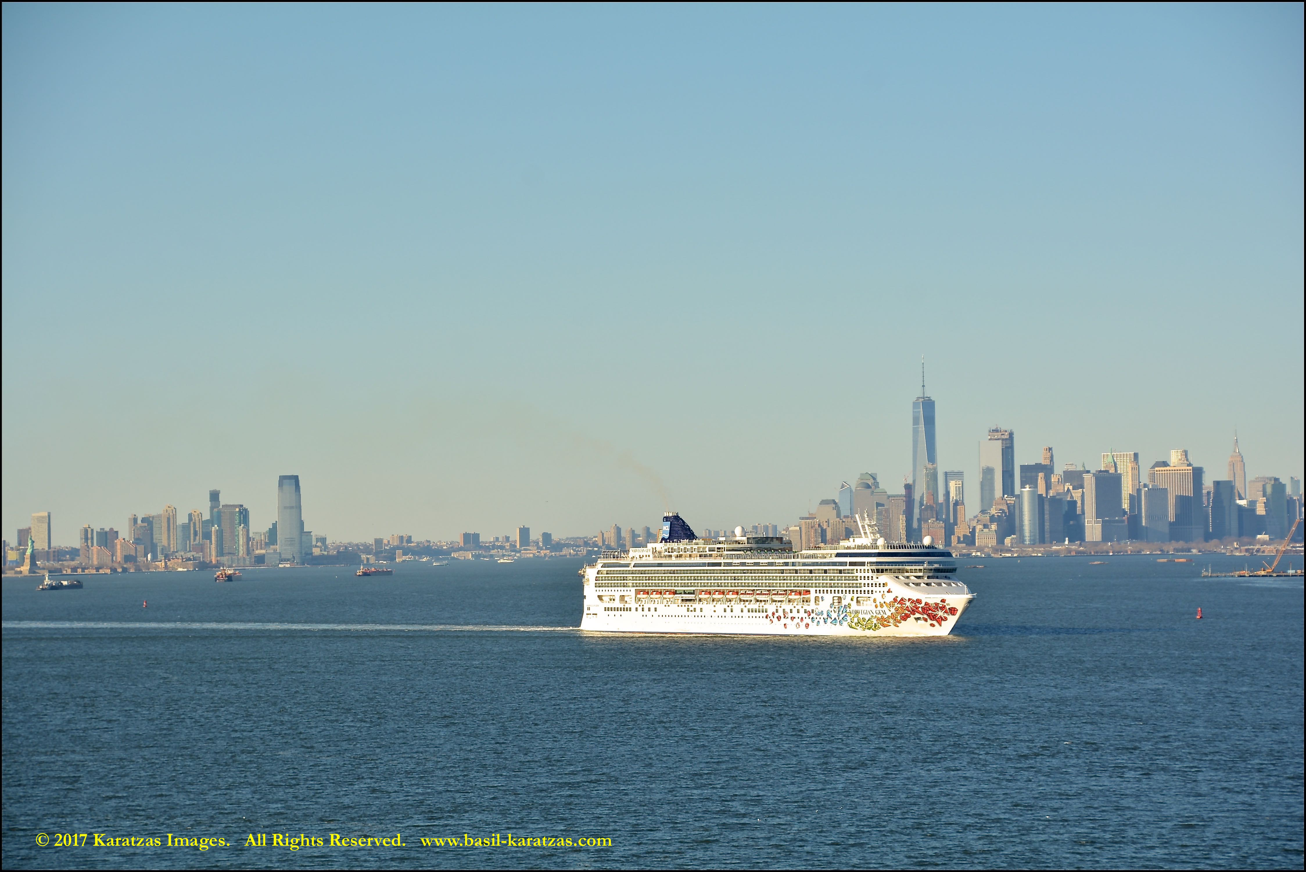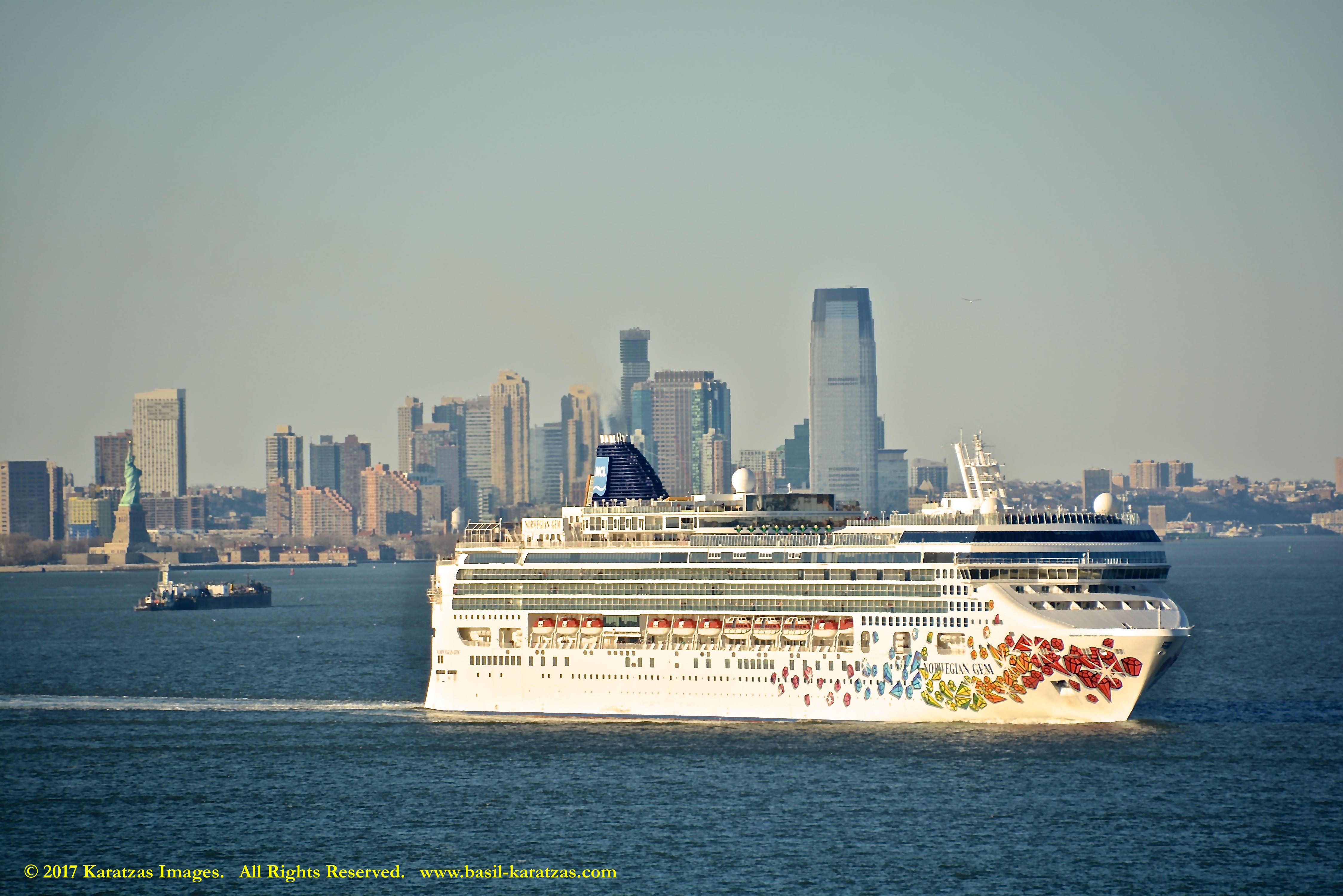 Built in 2006 at STX SB (Jinhae), products tanker MT ‘Arctic Bay’, entering the Upper New York Harbor, passing several landmarks on the way. Here, cruiseship MV ‘Norwegian Gem’ is outbound. Image credit: Karatzas Images.