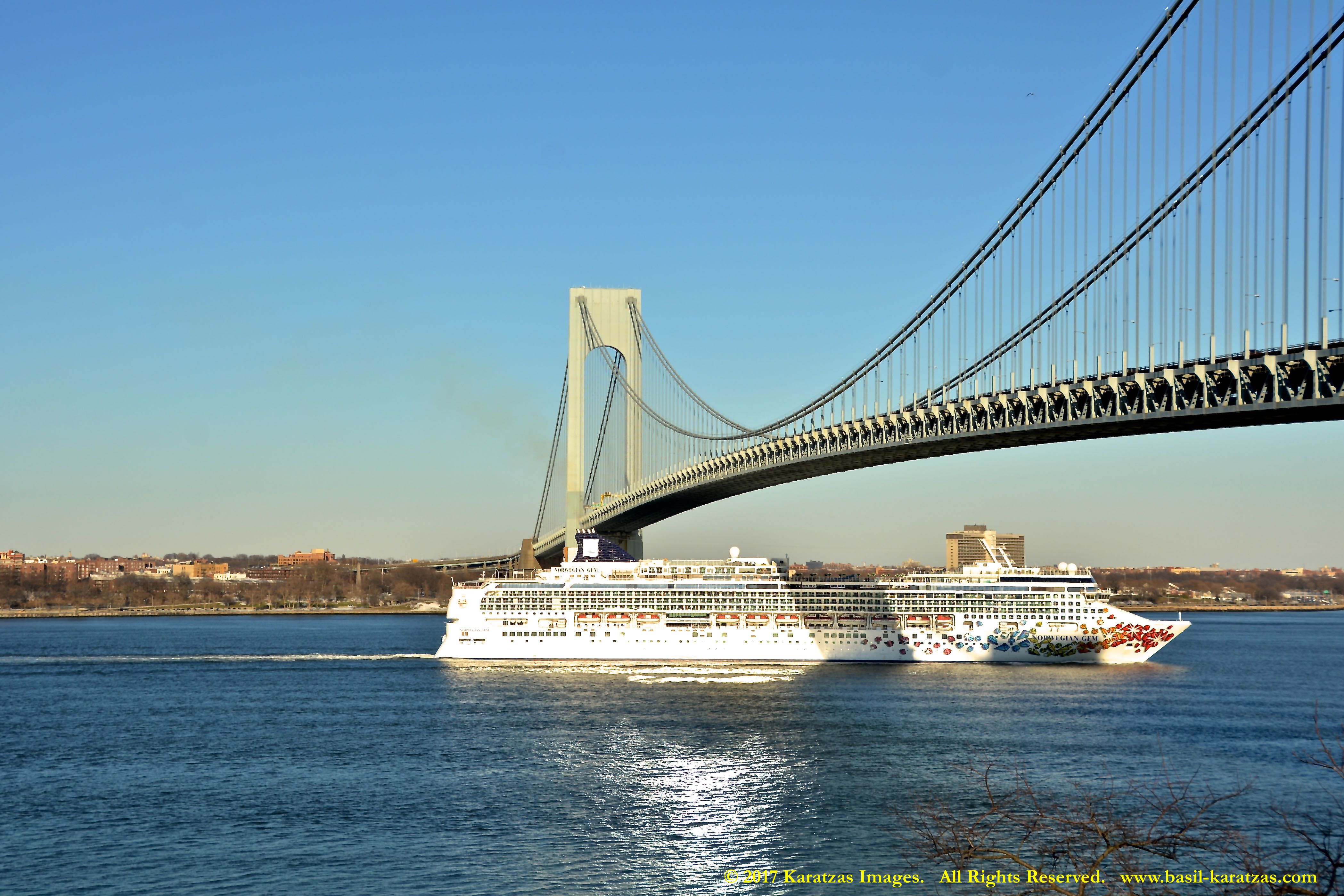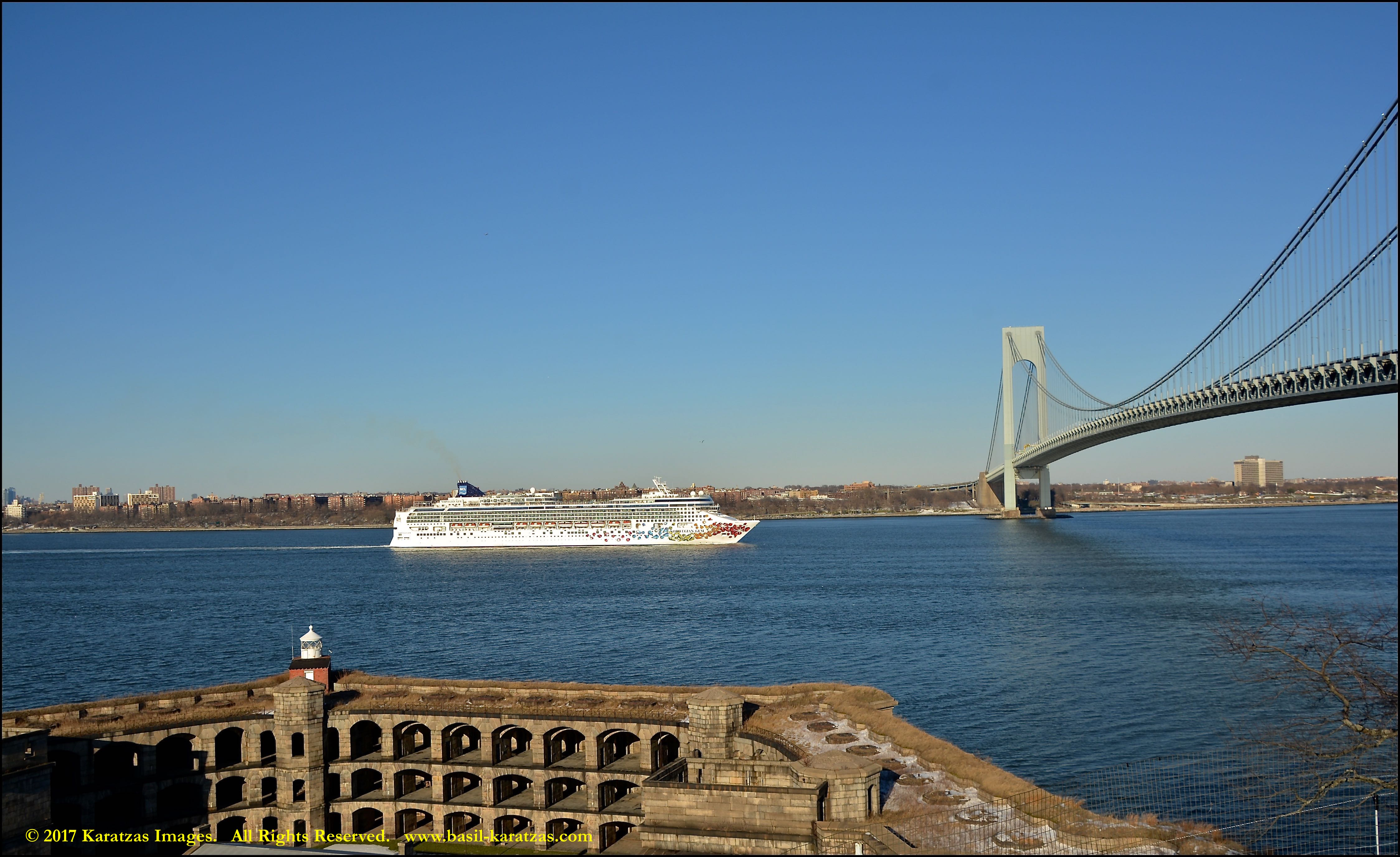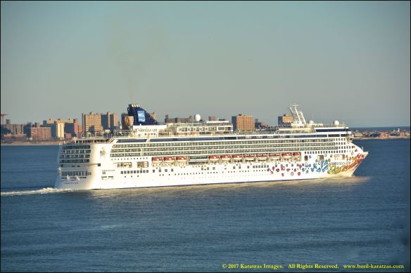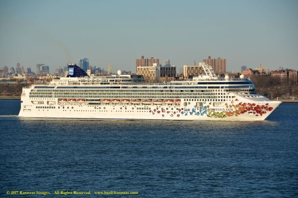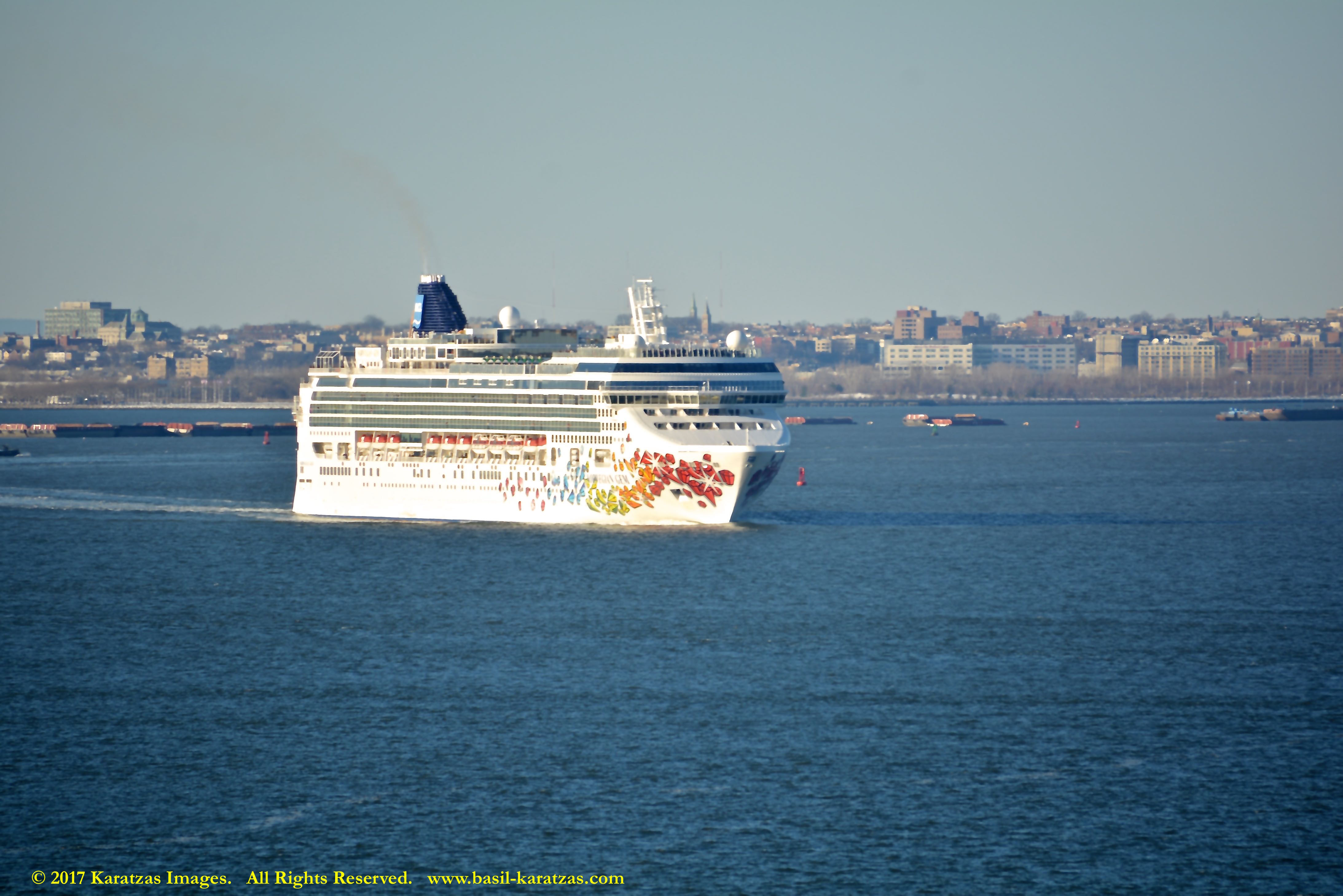 Built in 2006 at STX SB (Jinhae), products tanker MT ‘Arctic Bay’, entering the Upper New York Harbor, passing several landmarks on the way. Here, cruiseship MV ‘Norwegian Gem’ is outbound. Image credit: Karatzas Images.