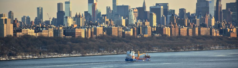 Only 7,700 in deadweight tonnage capacity but with 500 ton cranes (2x250T, combined), multi-purpose / heavy-lift bulker MV ‘BBC Germany’ sailing downstream the Hudson Riven against the Manhattan skyline and other landmarks. Here, crossing paths with an articulated tank-barge. Image credit: Karatzas Images