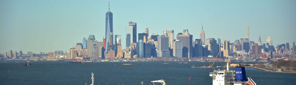 Sovcomflot’s Products Tanker MT ‘Anichkov Bridge’ entering the Upper New York Harbor. Manhattan skyline in the background. Image credit: Karatzas Images.