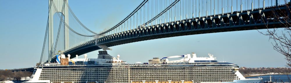 Fifth biggest cruiseship in the world with 4,900 berths and 347 m (1,139ft) length, built at a reported price of US$ 960 mil, ‘Anthem of the Seas’ departs New York. Fort Wadsworth in the foreground, Verrazzano-Narrows Bridge to the right. Image credit: Karatzas Images