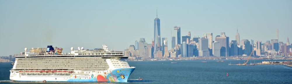 Cruiseship MV ‘Norwegian Breakaway’ majestically departing New York. Lower Manhattan skyline and One World Trade Center visible. Image credit: Karatzas Images.