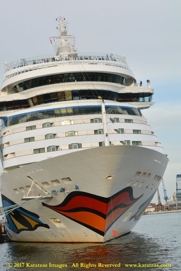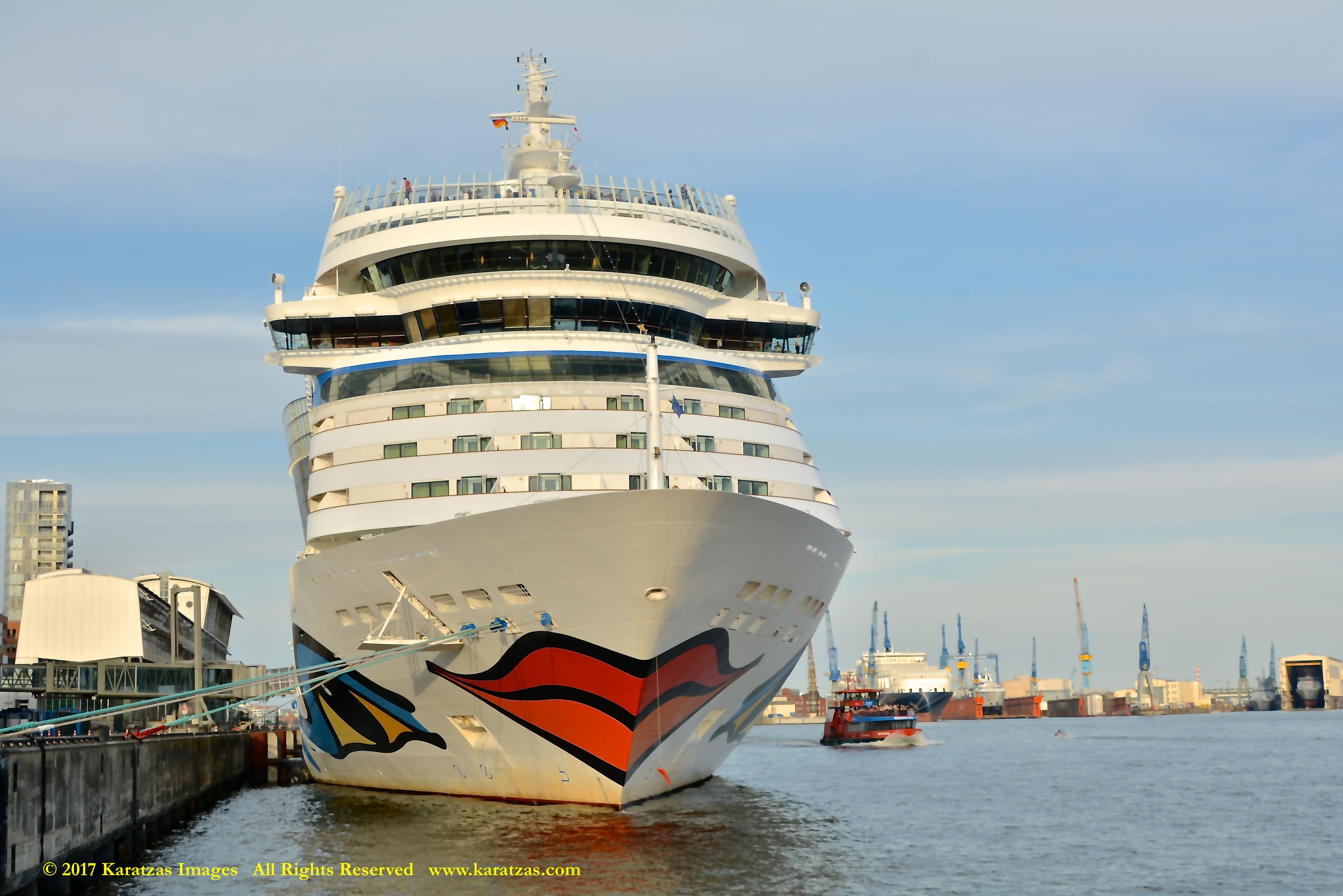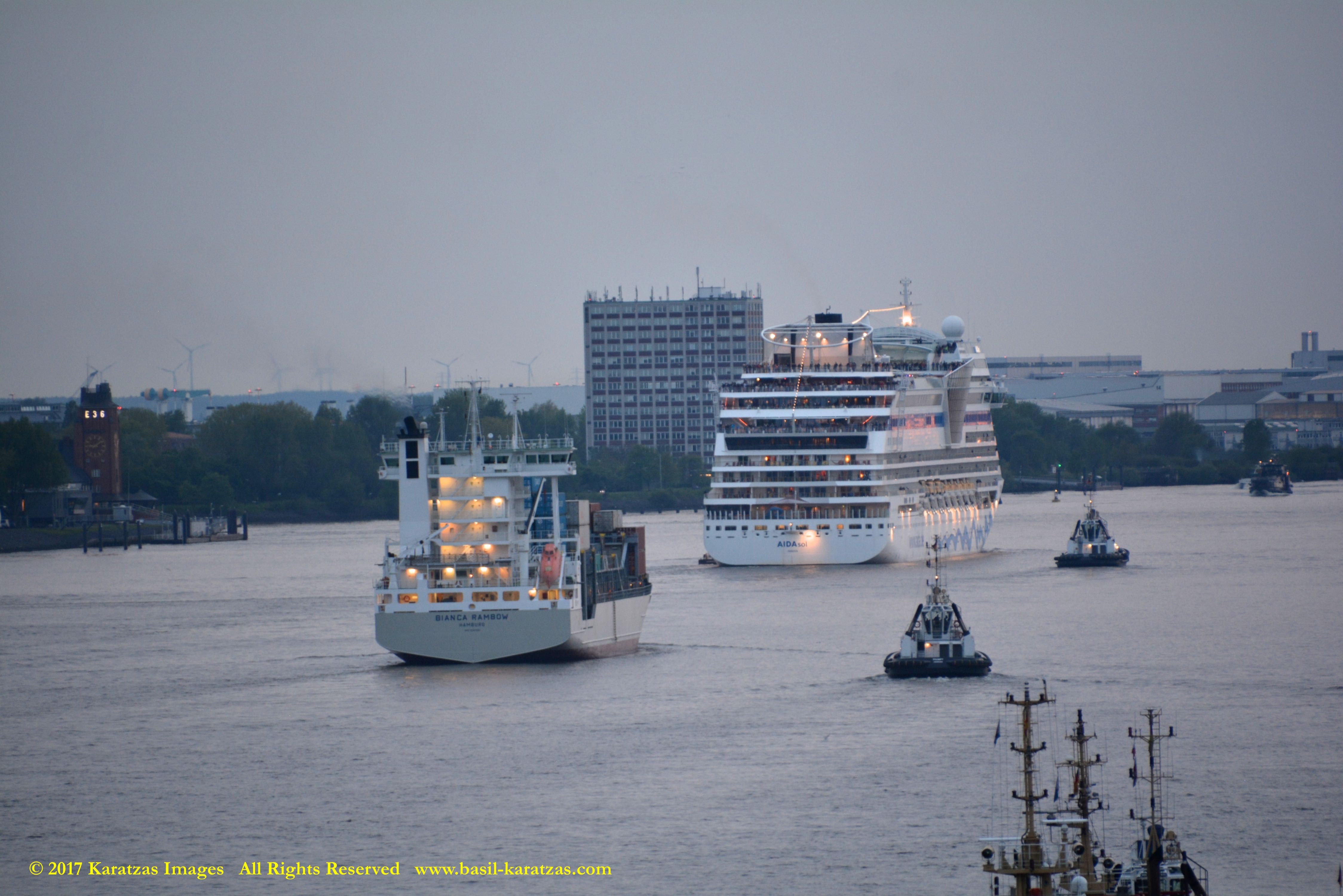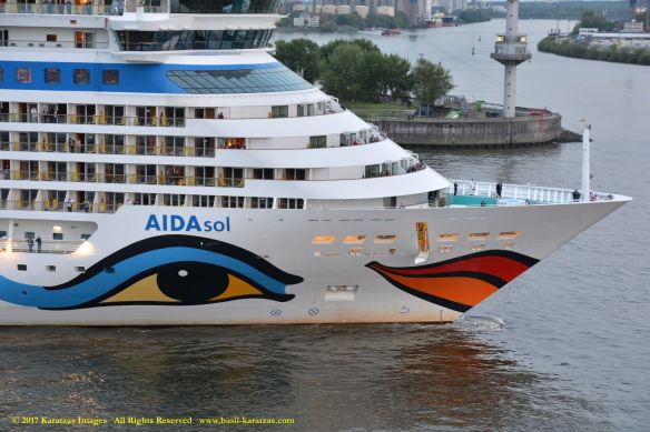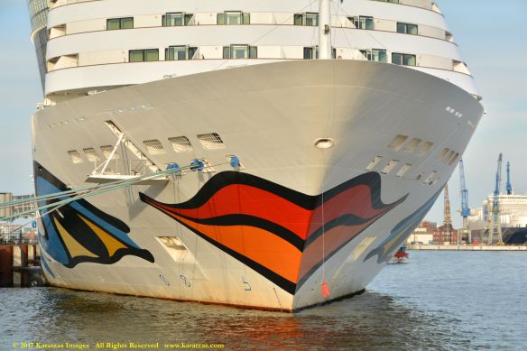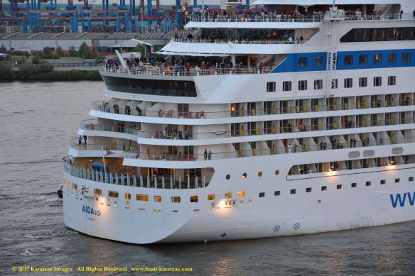 Close up picture of neo-panamax containership MV ‘MSC Francesca’ (almost 12,000-teu, built in 2009 at Hyundai Samho) departing the Port of Hamburg on a majestic, sunny early summer evening. Do have a safe voyage, you Big Ship! Auf wiedersehen! Image credit: Karatzas Images.